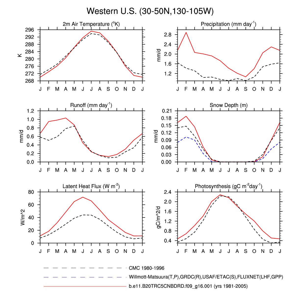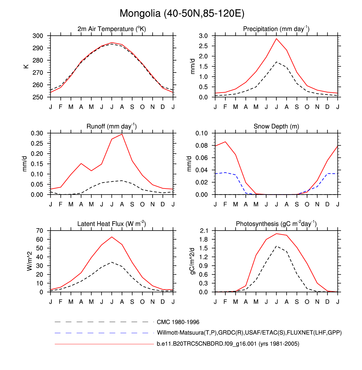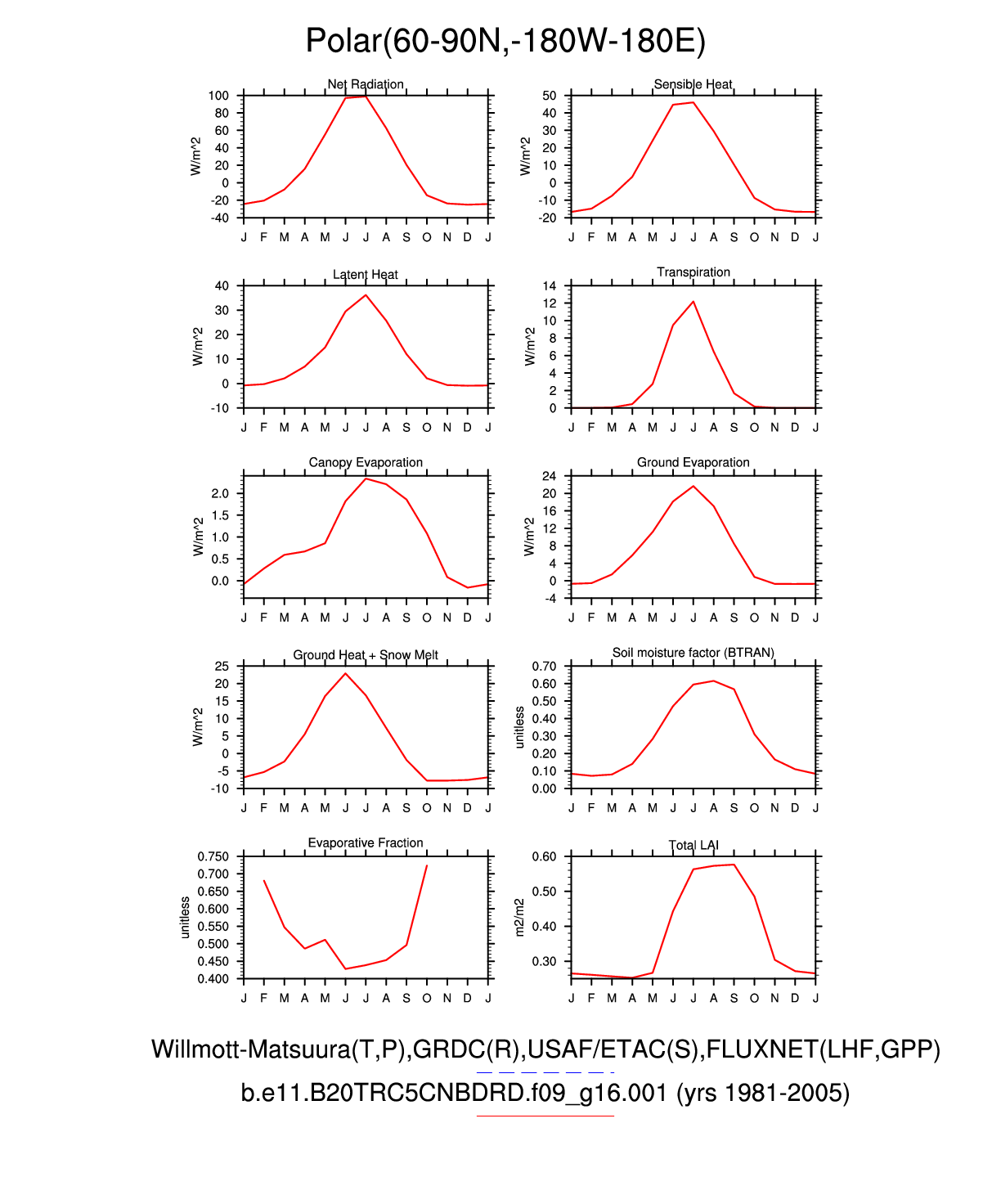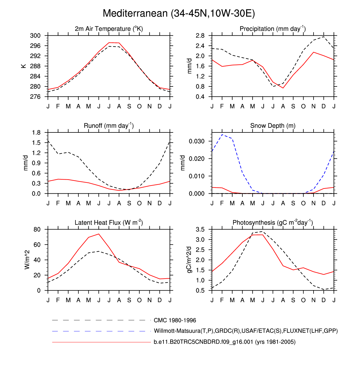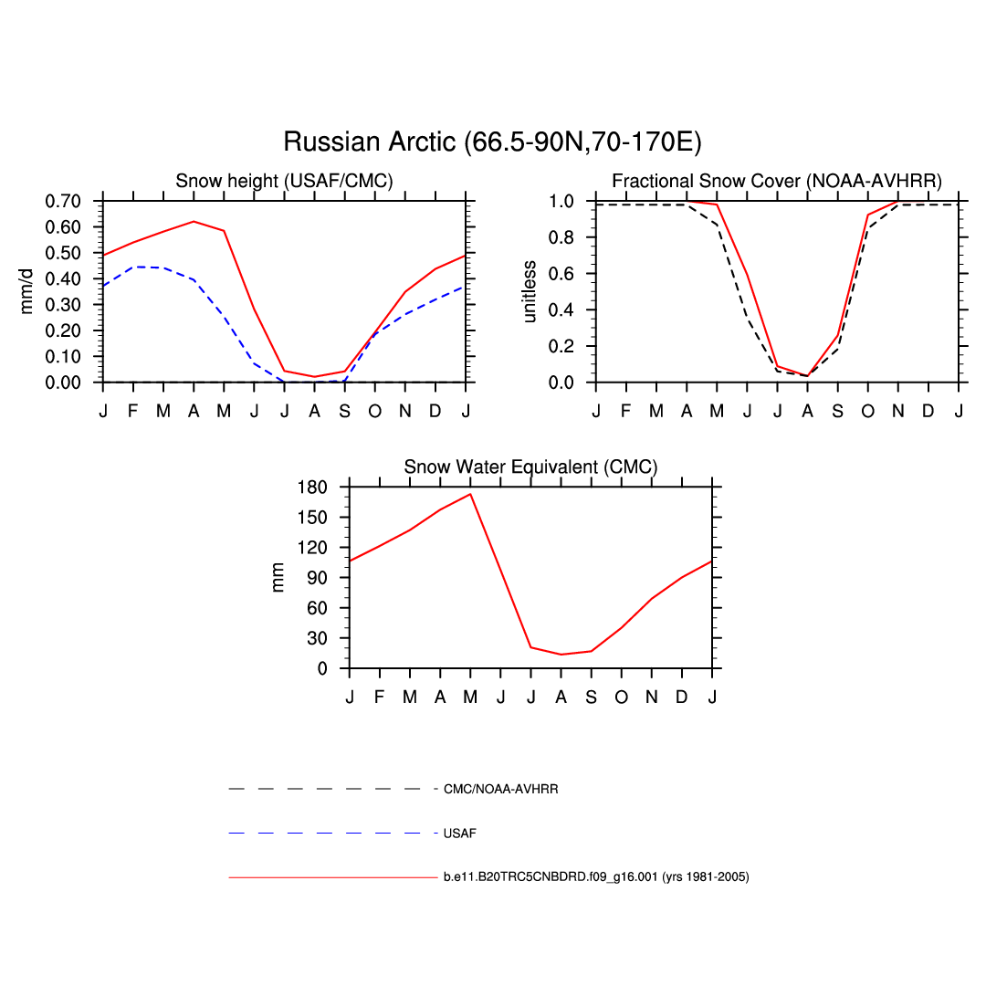 Set 3 Description: Line plots of monthly climatology: regional air temperature, precipitation, runoff, snow depth, radiative fluxes, and turbulent fluxes