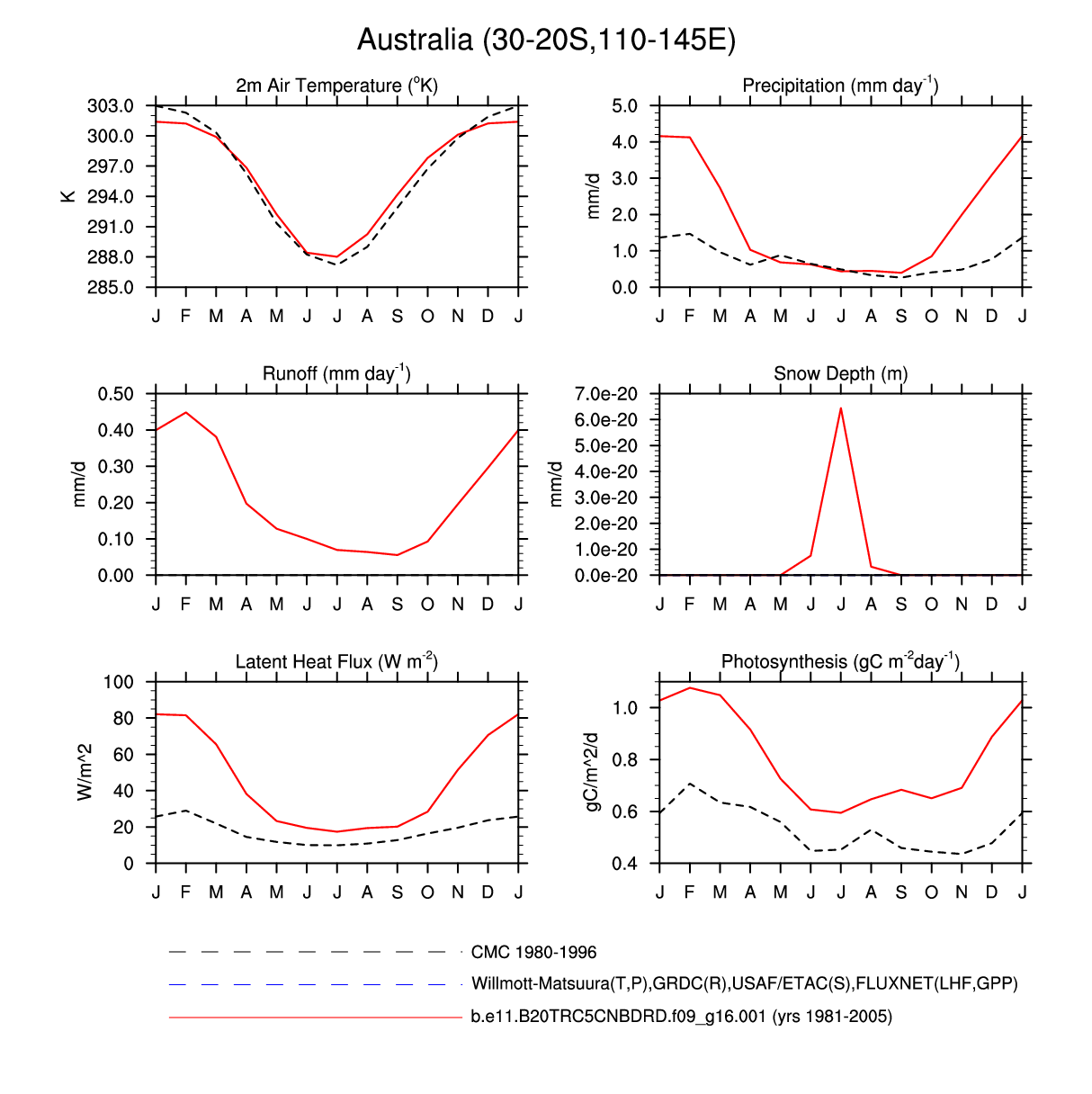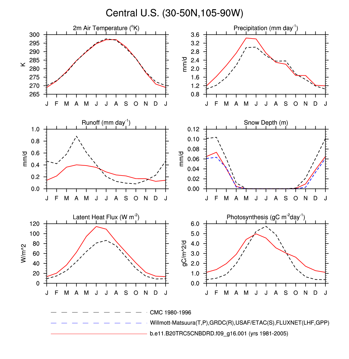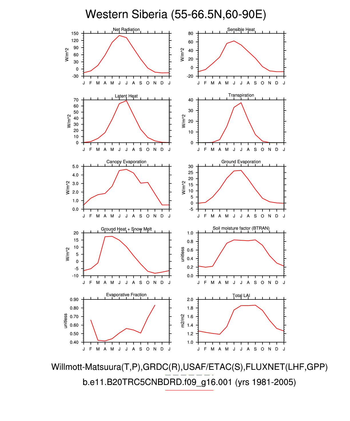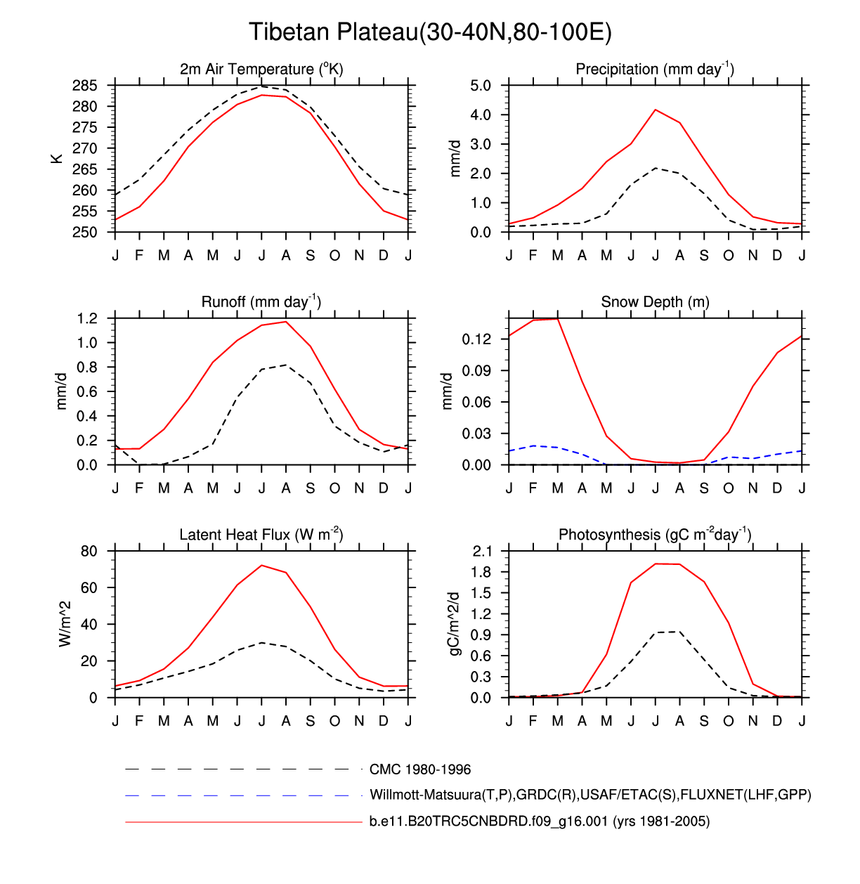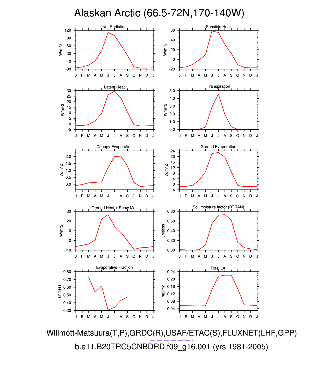Set 3 Description: Line plots of monthly climatology: regional air temperature, precipitation, runoff, snow depth, radiative fluxes, and turbulent fluxes