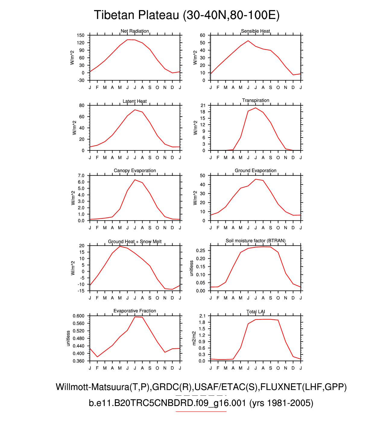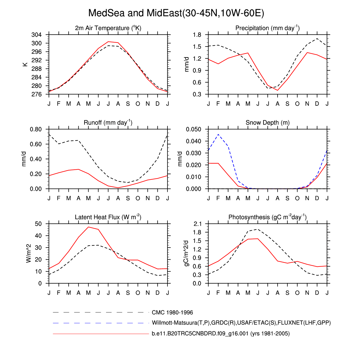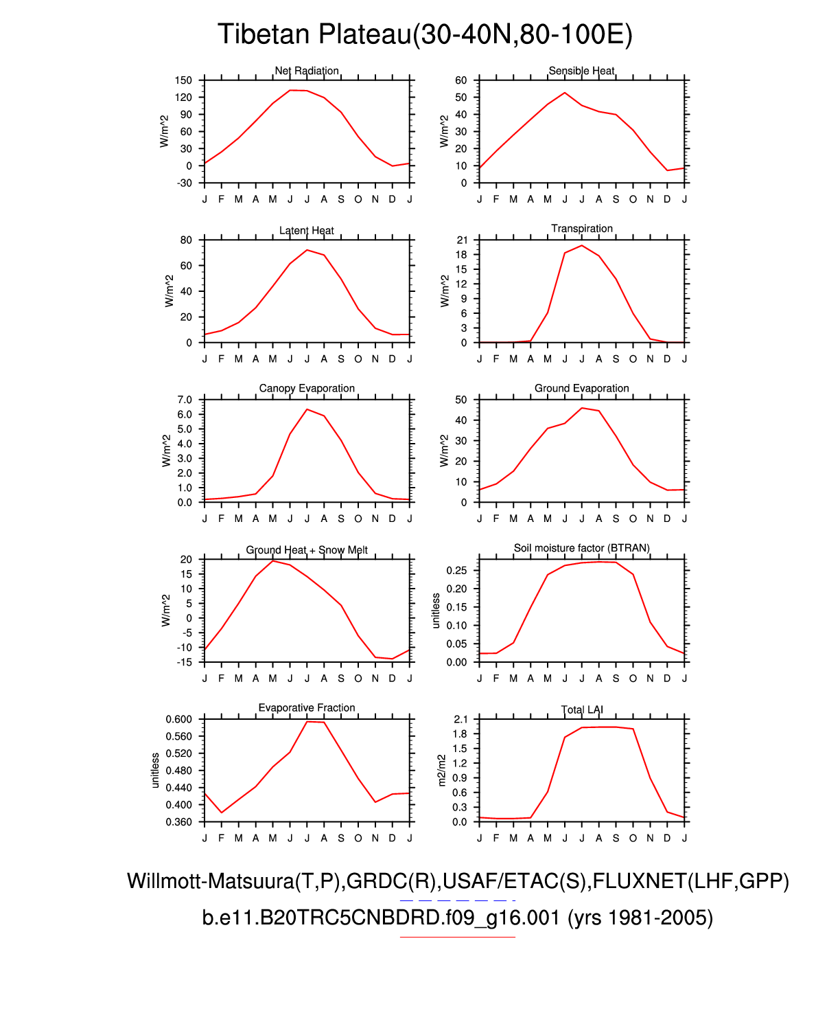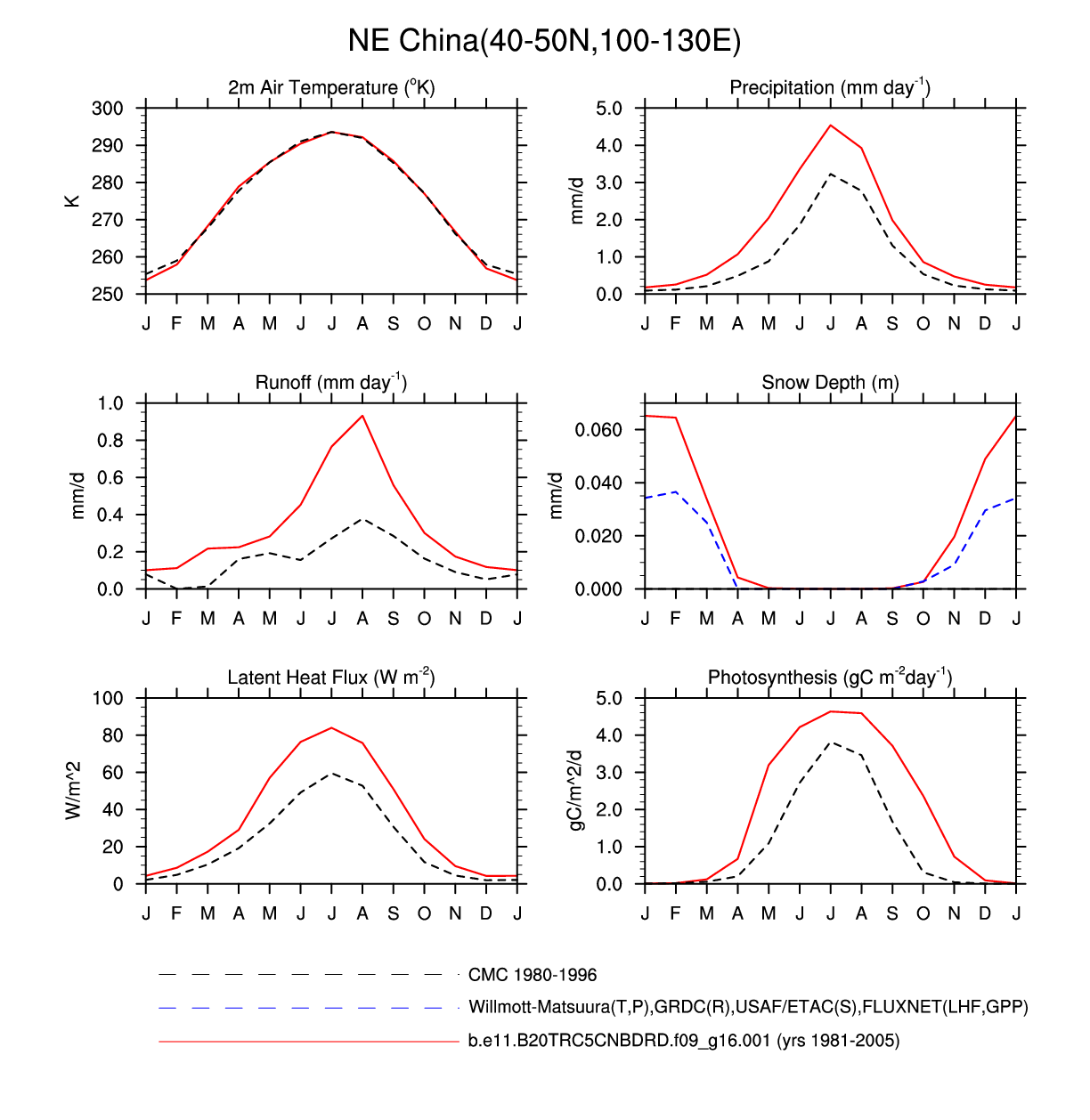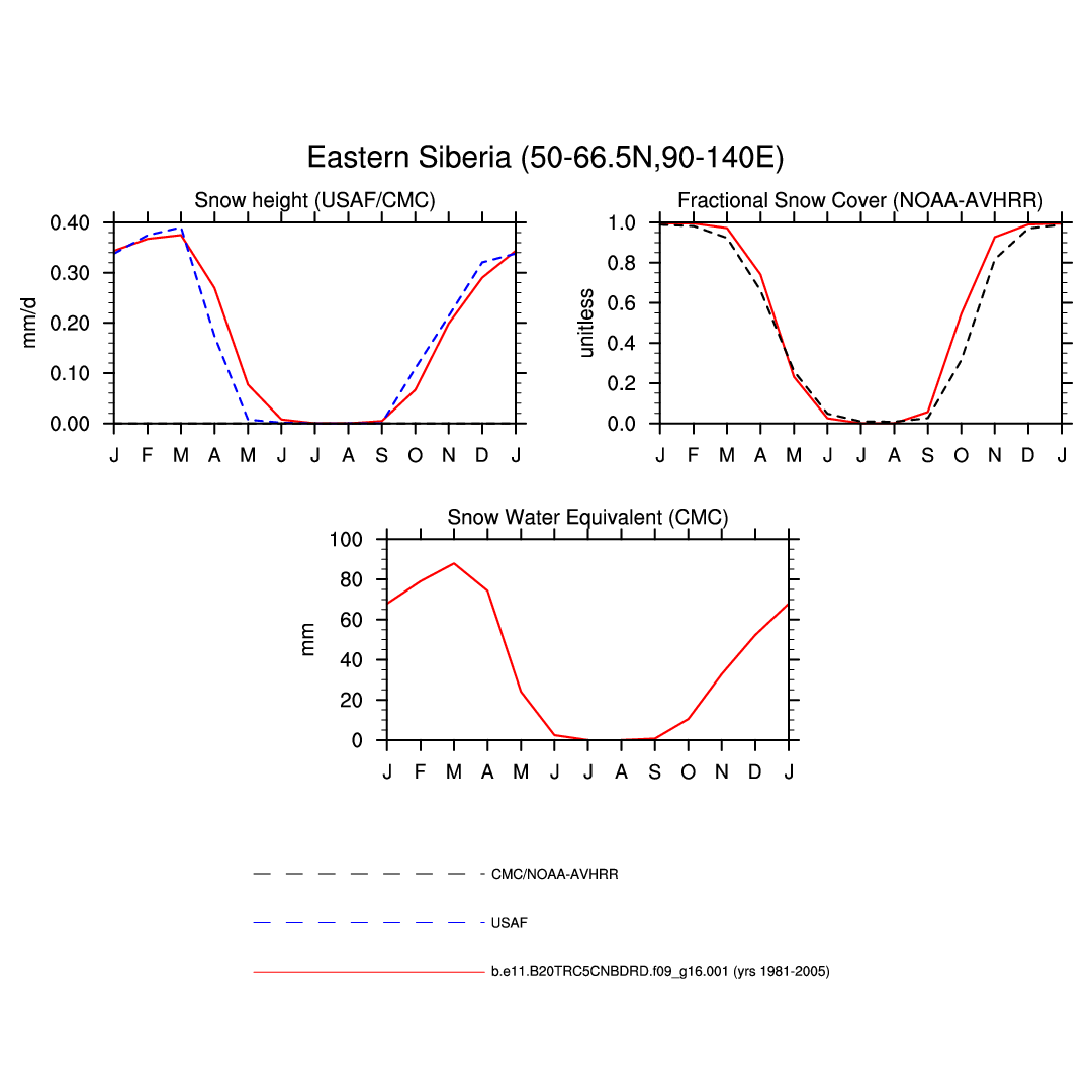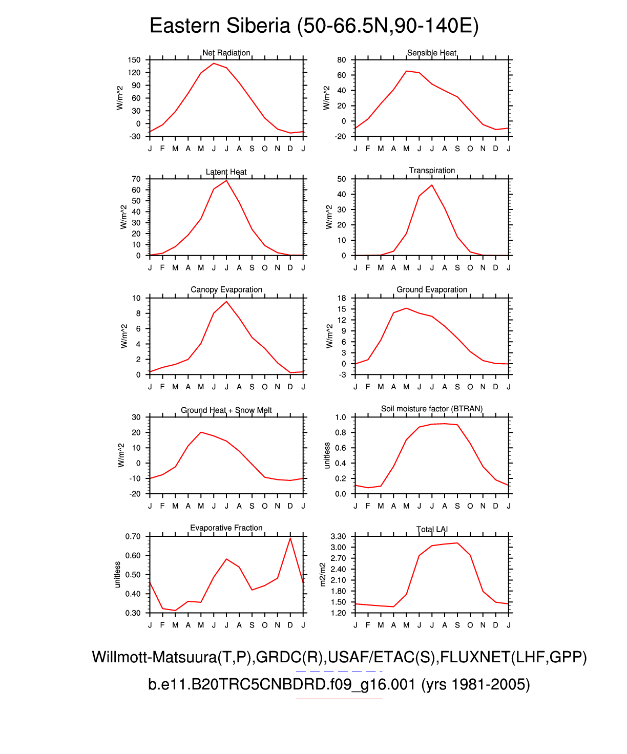 Set 3 Description: Line plots of monthly climatology: regional air temperature, precipitation, runoff, snow depth, radiative fluxes, and turbulent fluxes
