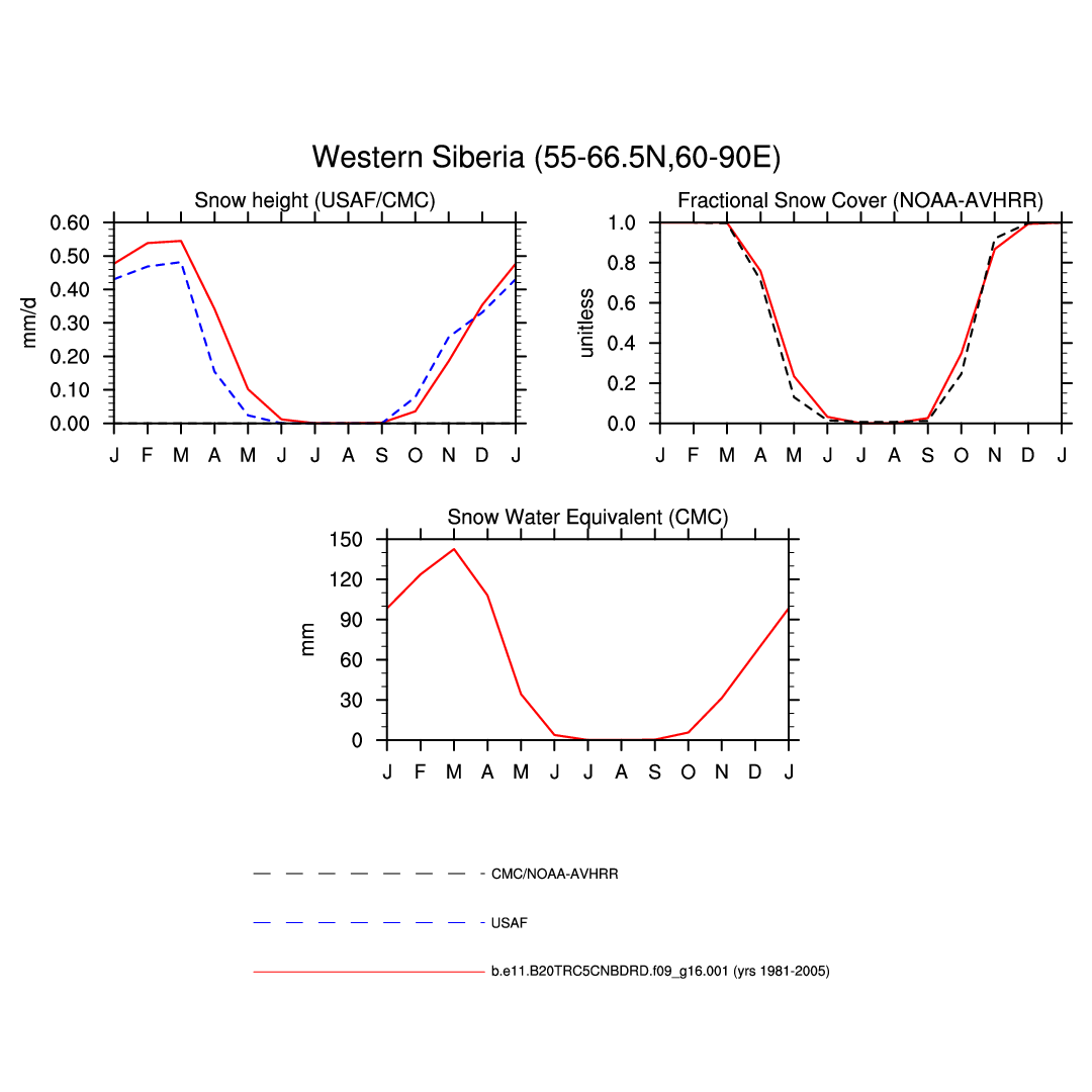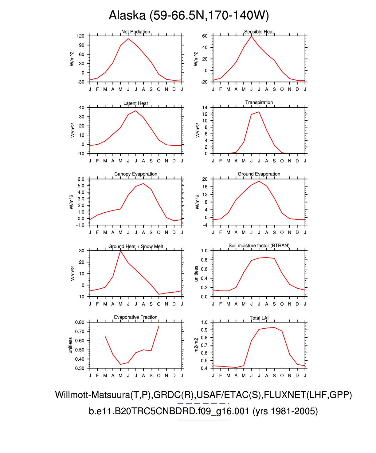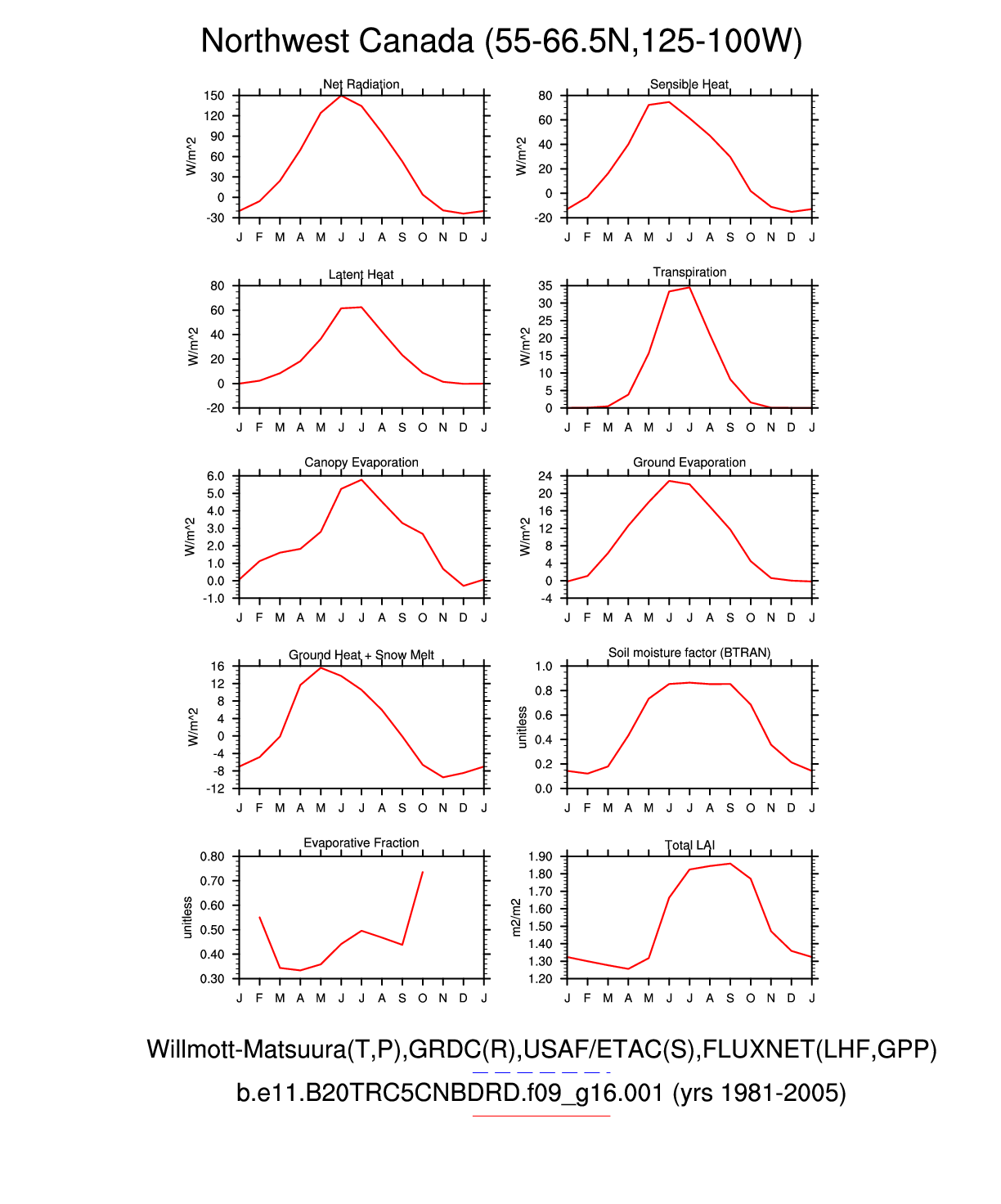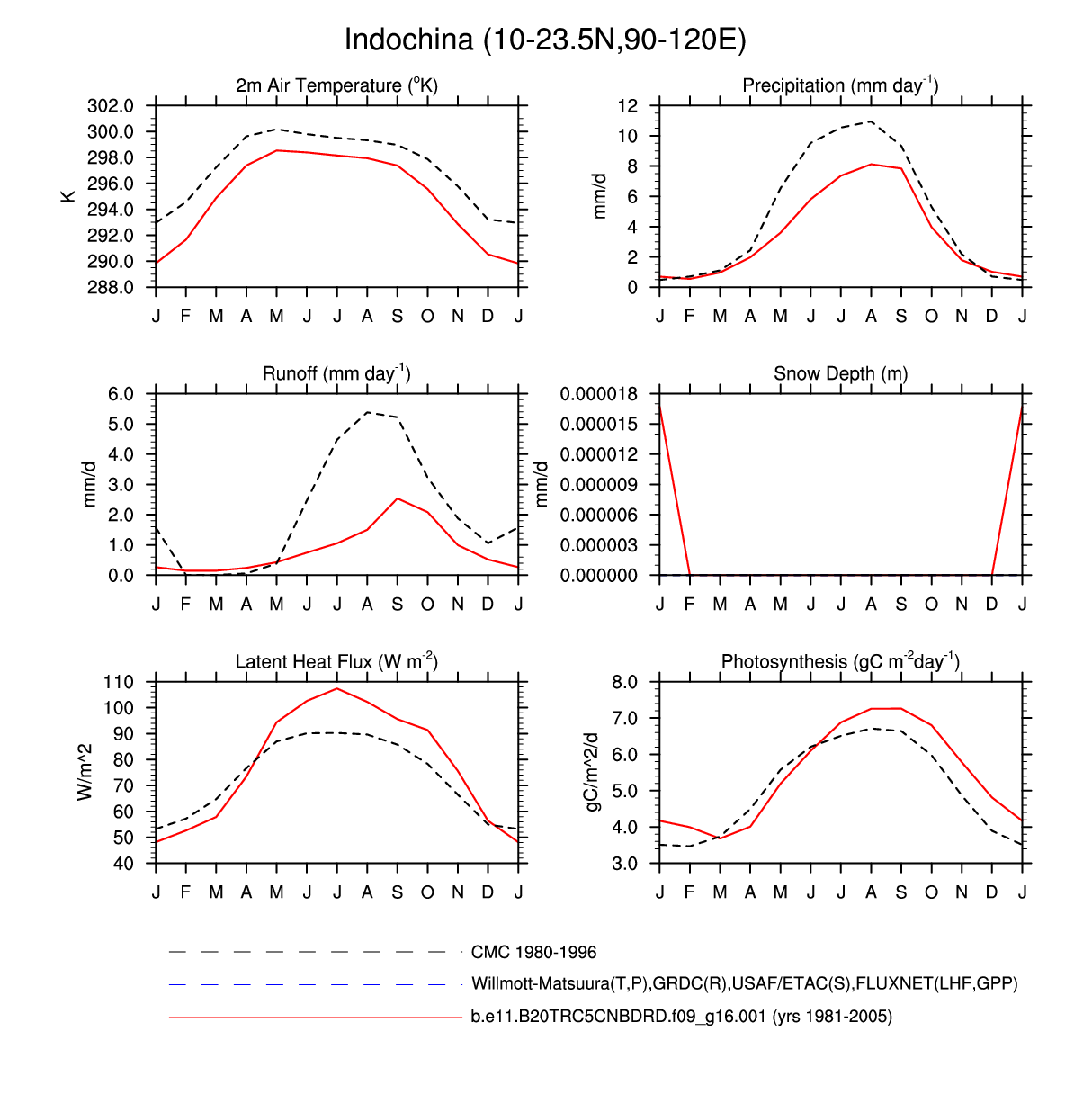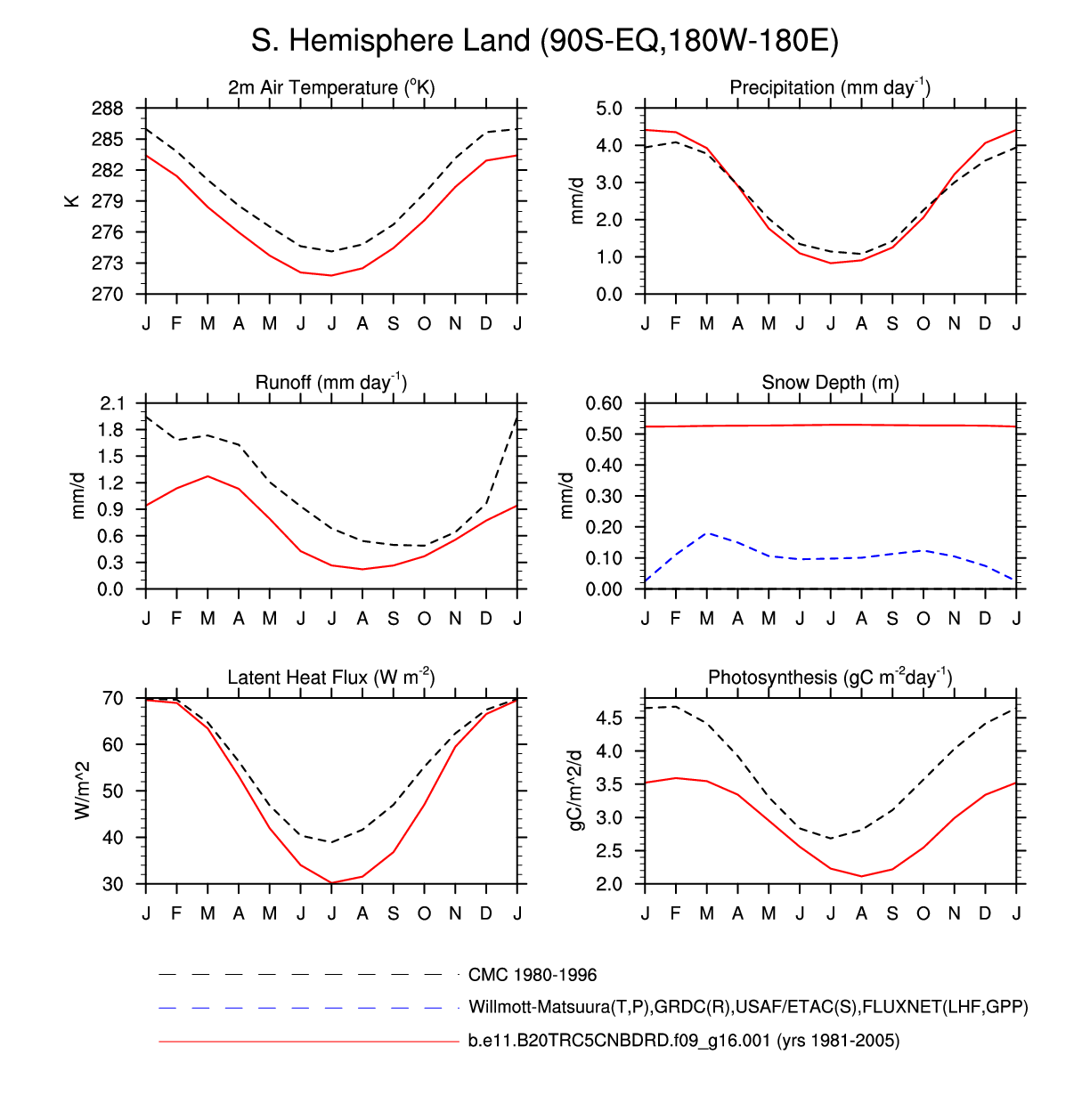 Set 3 Description: Line plots of monthly climatology: regional air temperature, precipitation, runoff, snow depth, radiative fluxes, and turbulent fluxes