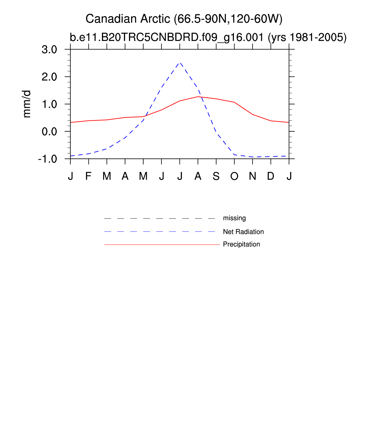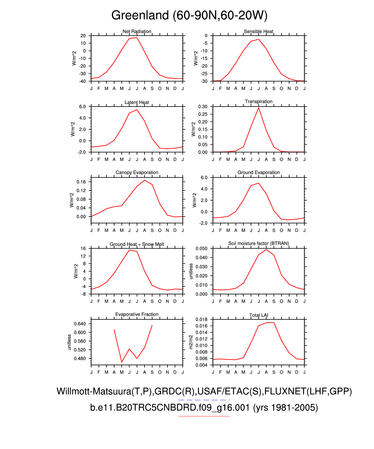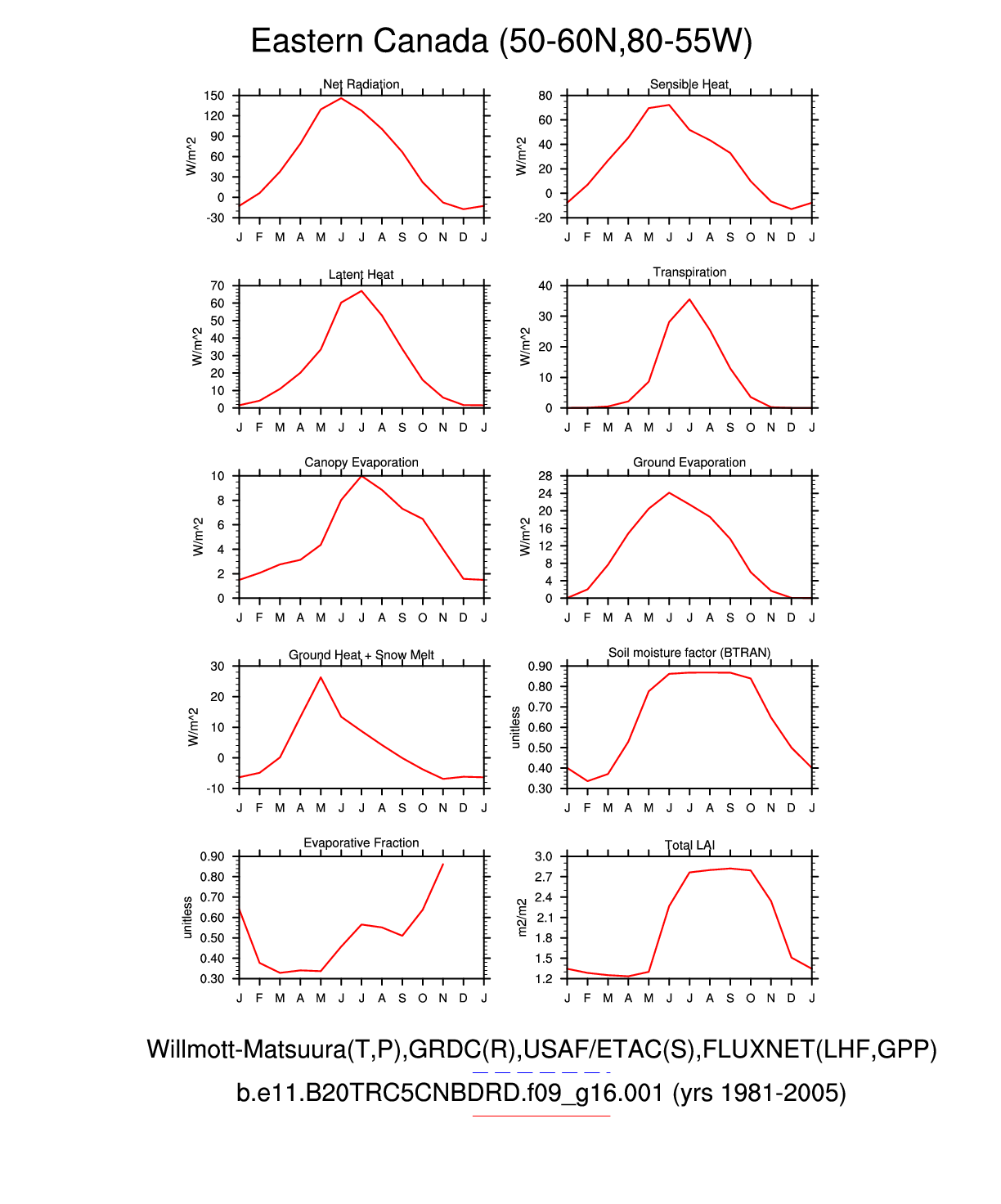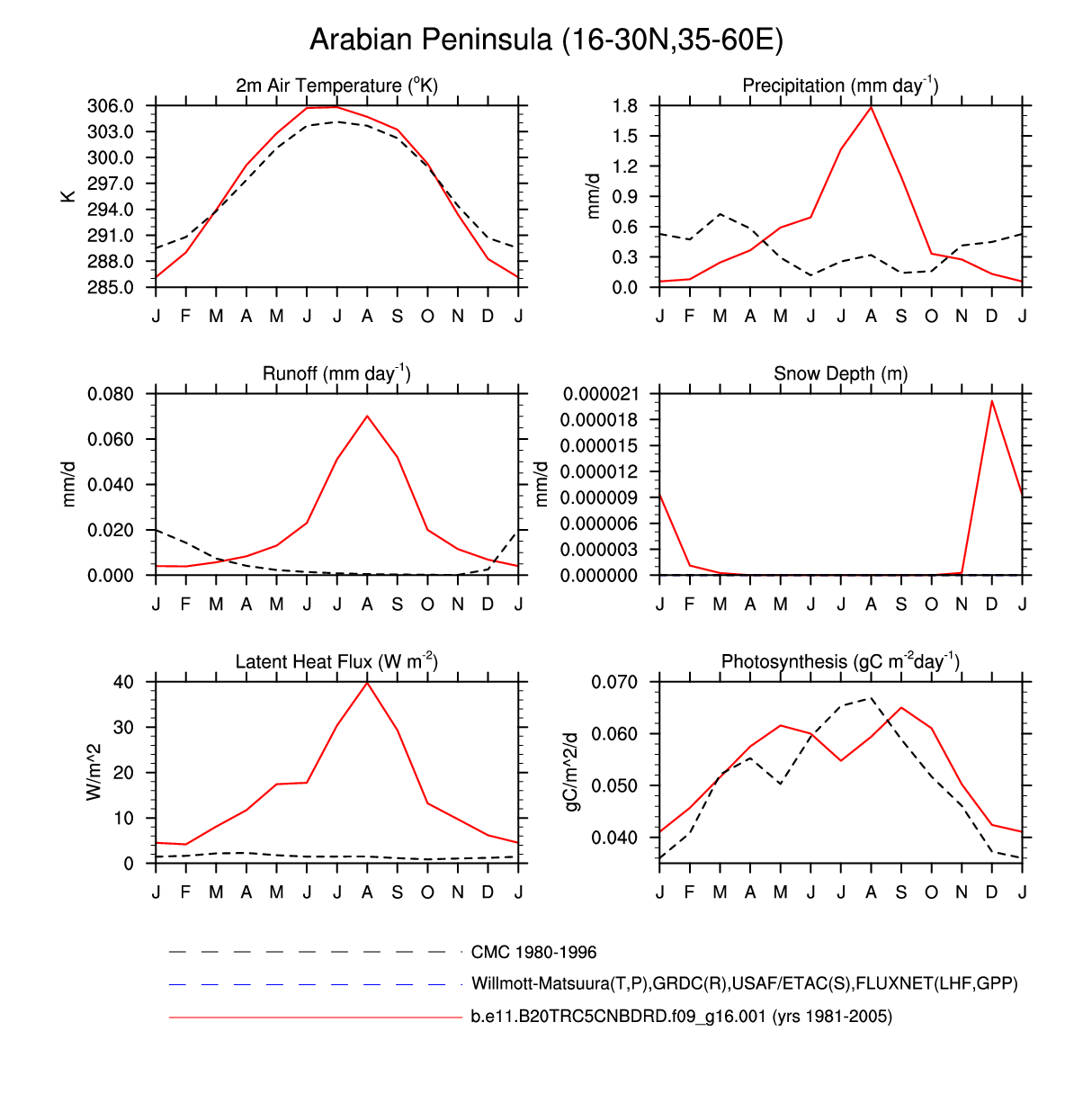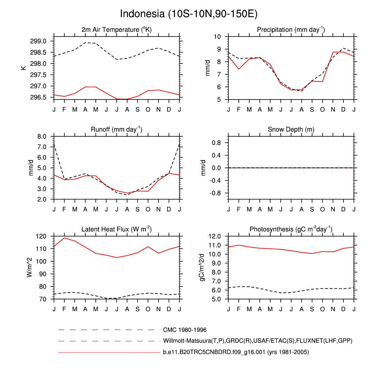 Set 3 Description: Line plots of monthly climatology: regional air temperature, precipitation, runoff, snow depth, radiative fluxes, and turbulent fluxes