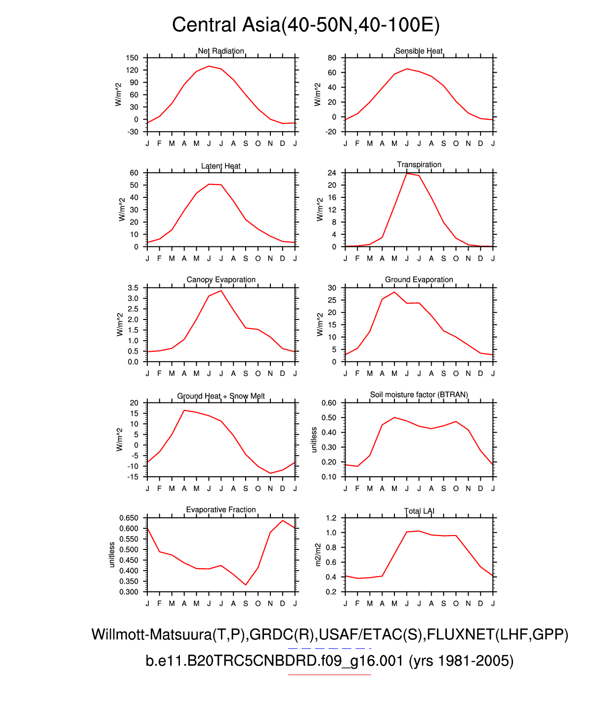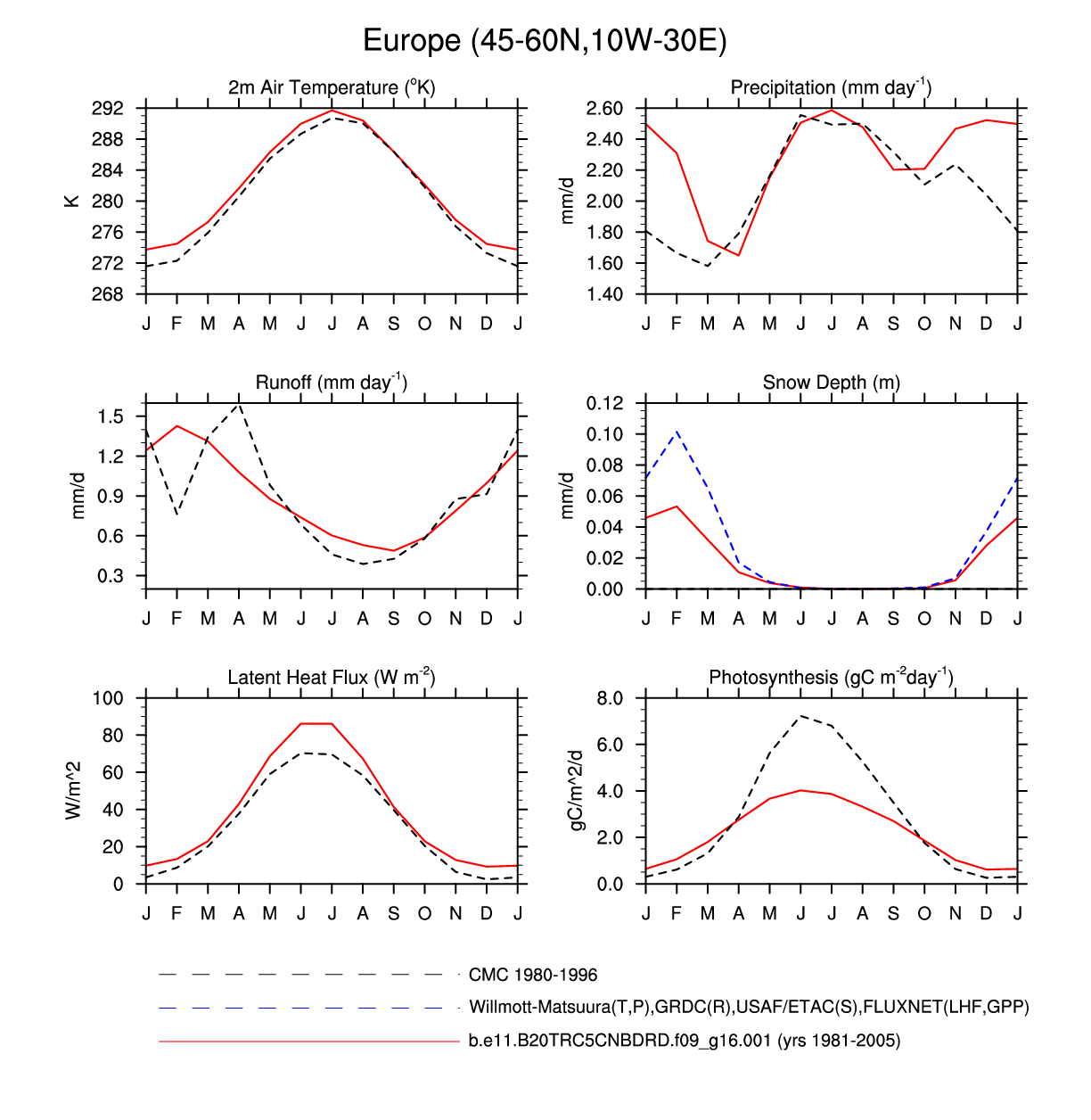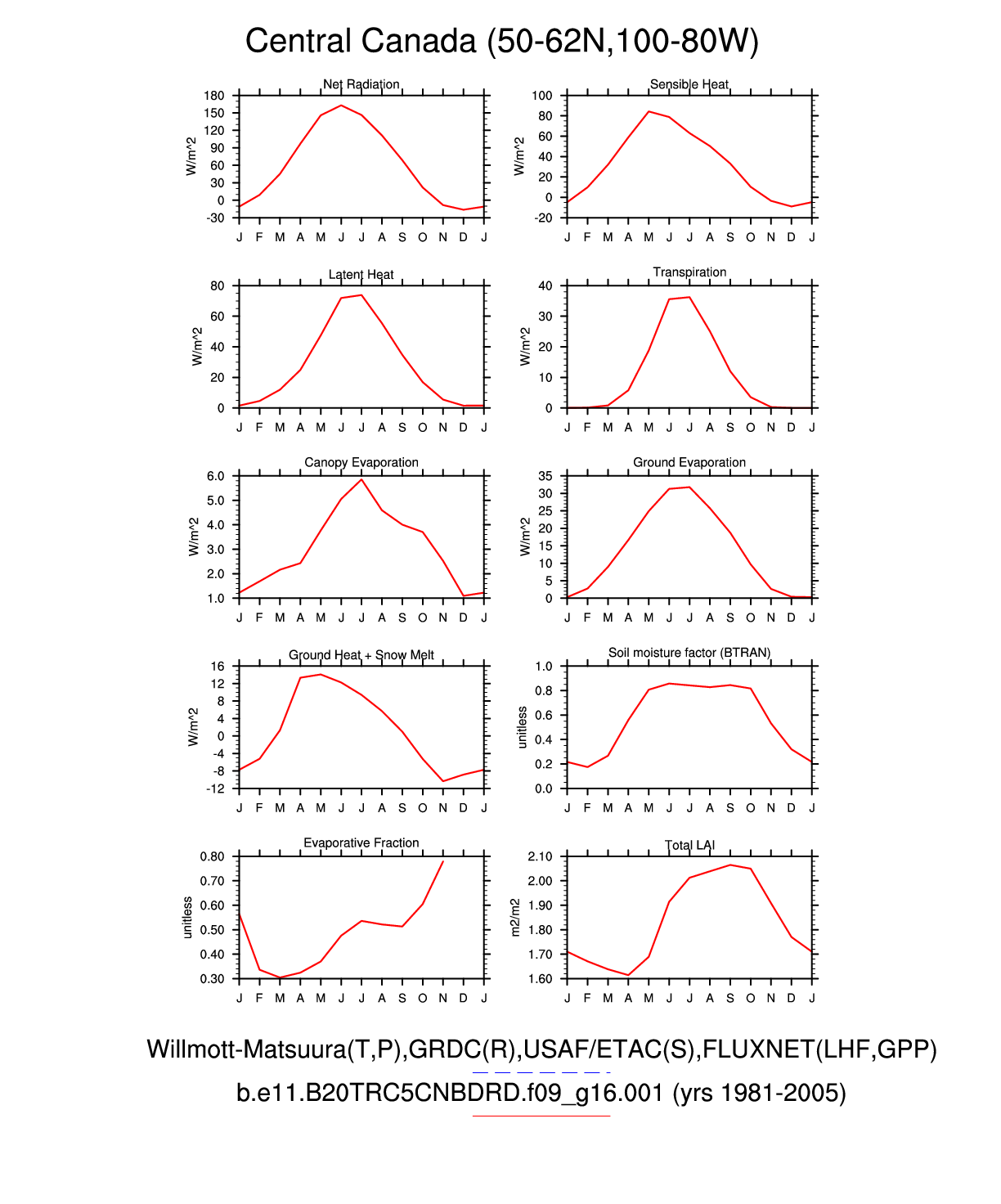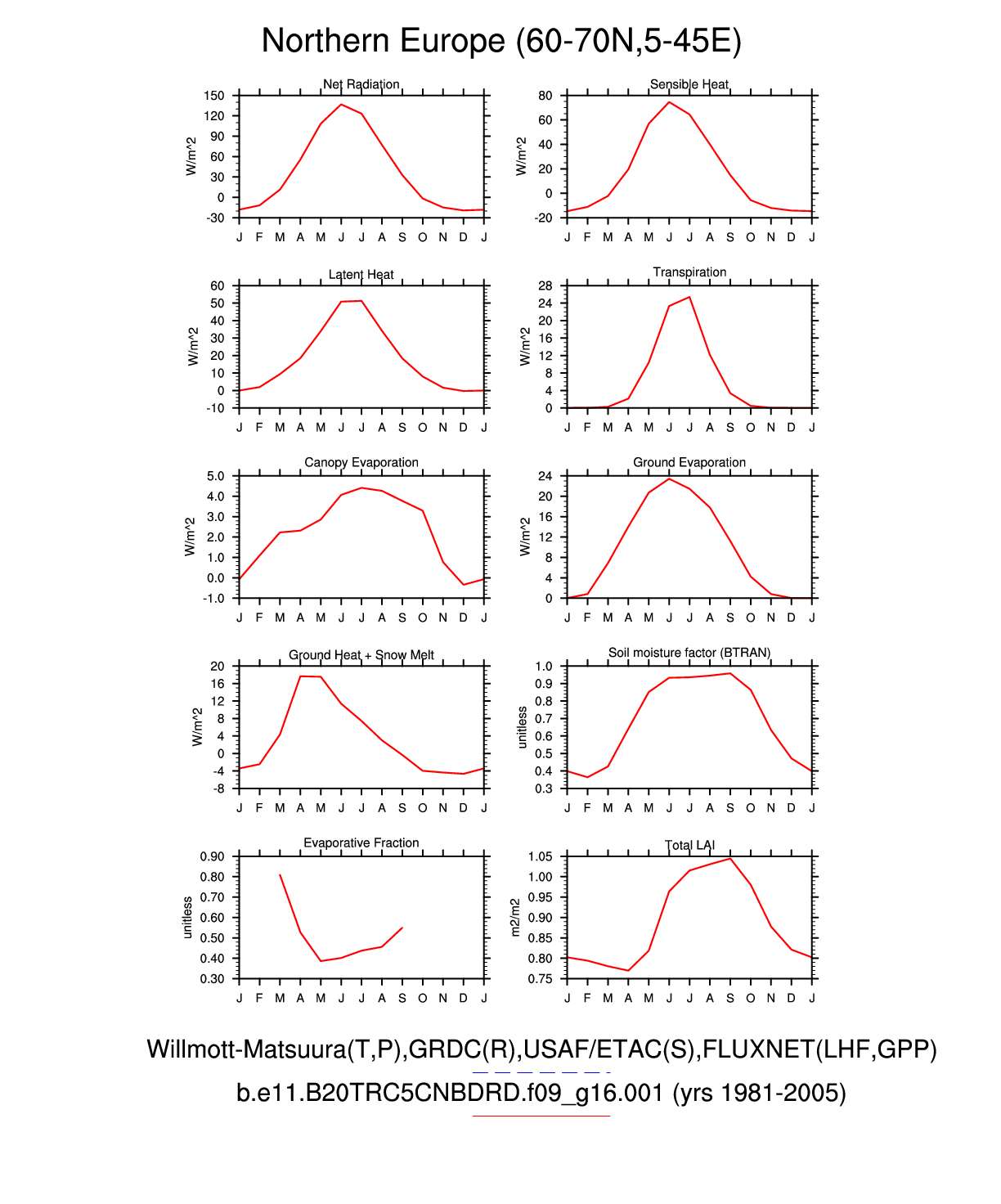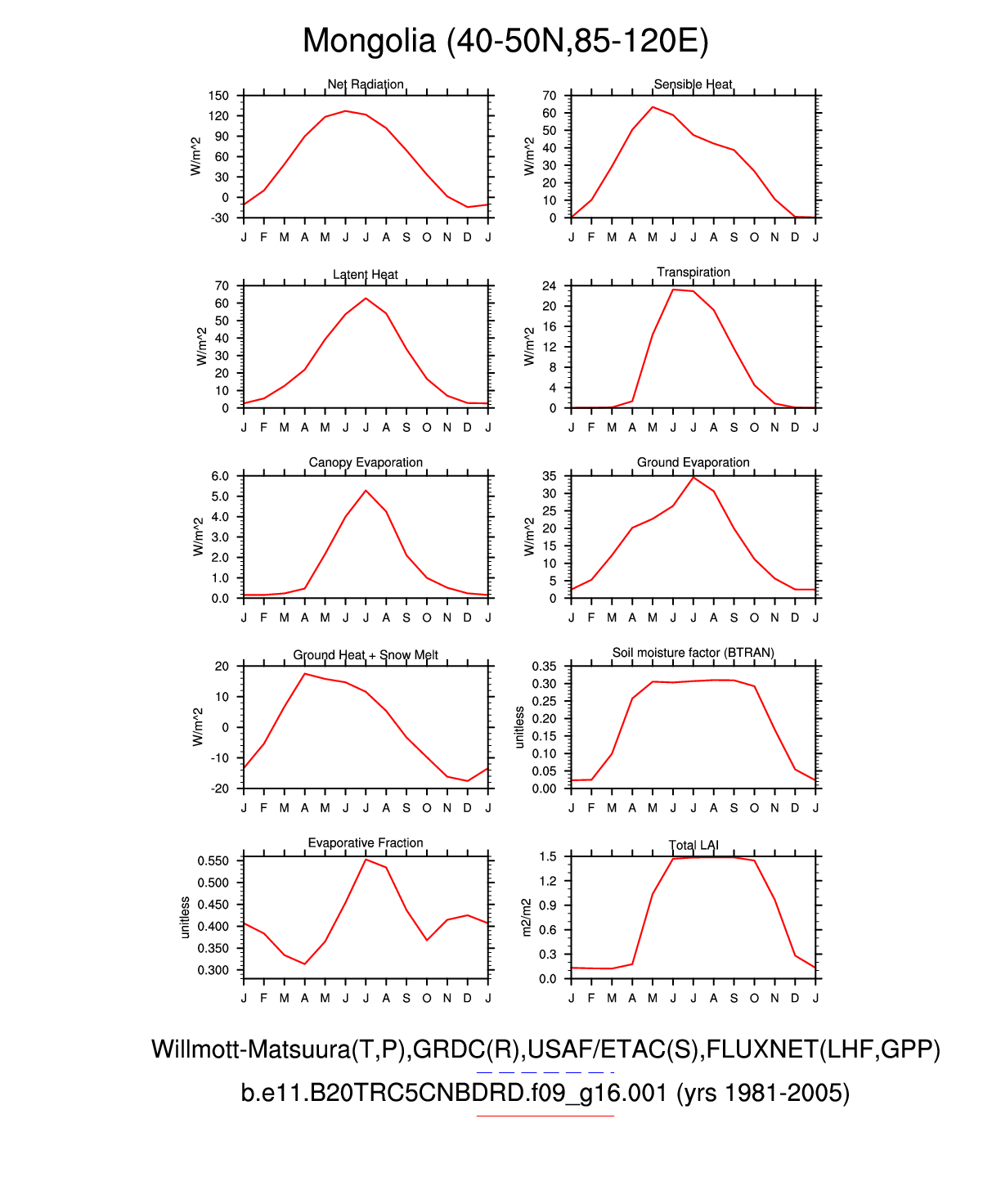 Set 3 Description: Line plots of monthly climatology: regional air temperature, precipitation, runoff, snow depth, radiative fluxes, and turbulent fluxes