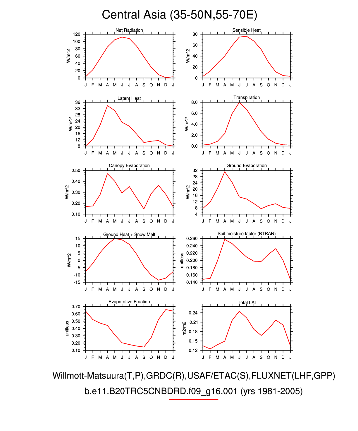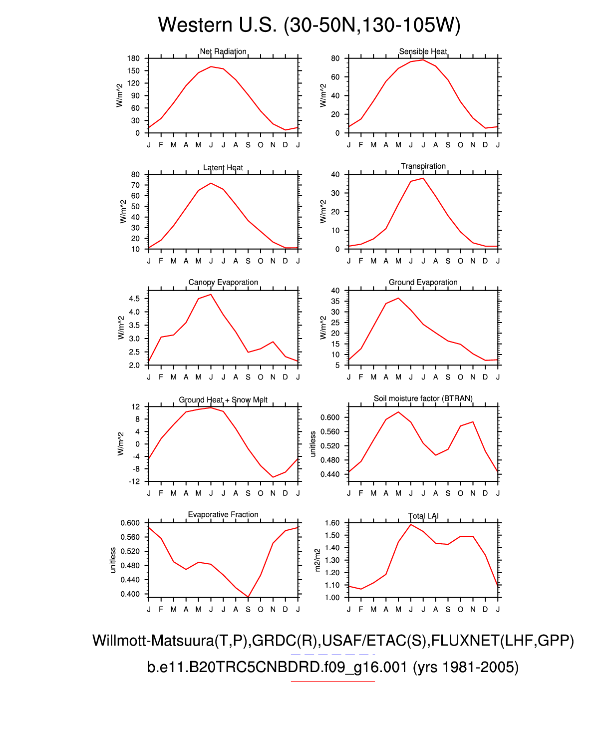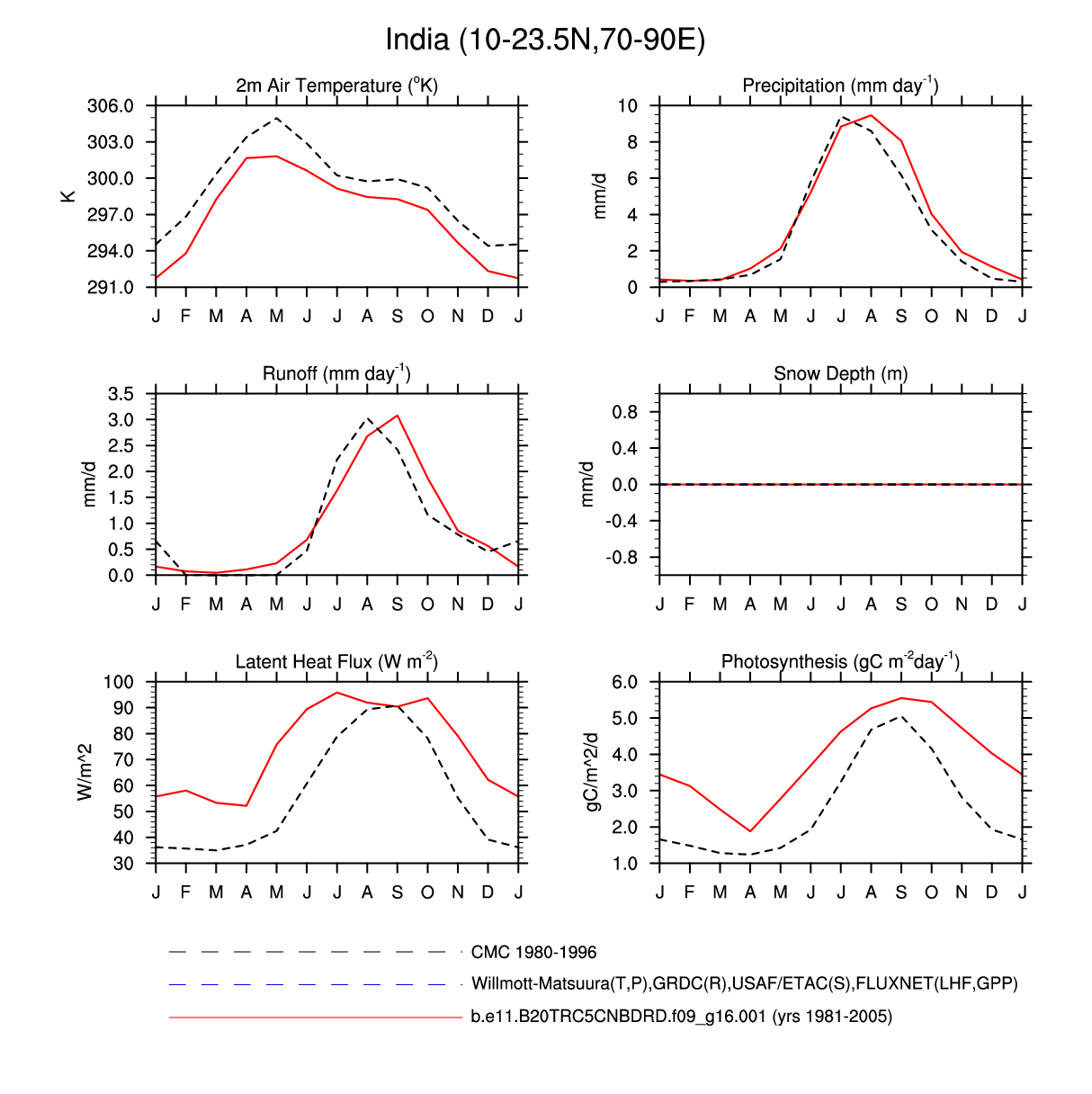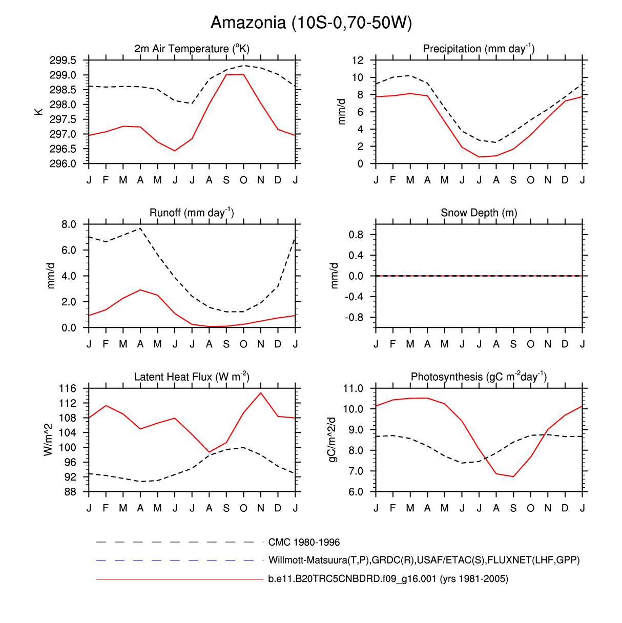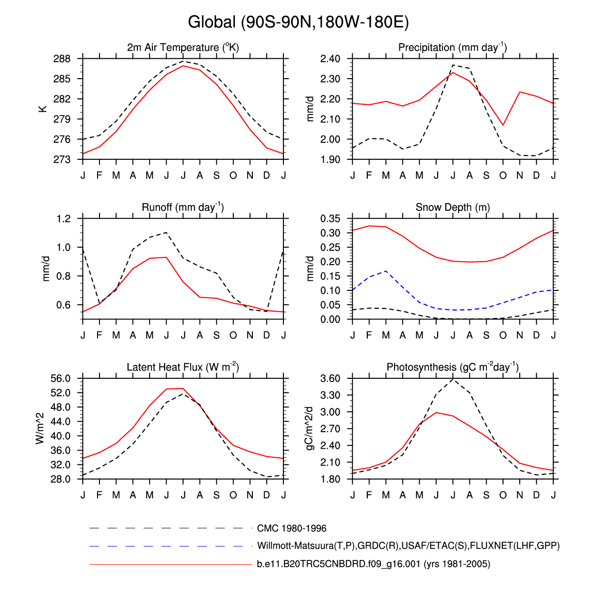 Set 3 Description: Line plots of monthly climatology: regional air temperature, precipitation, runoff, snow depth, radiative fluxes, and turbulent fluxes