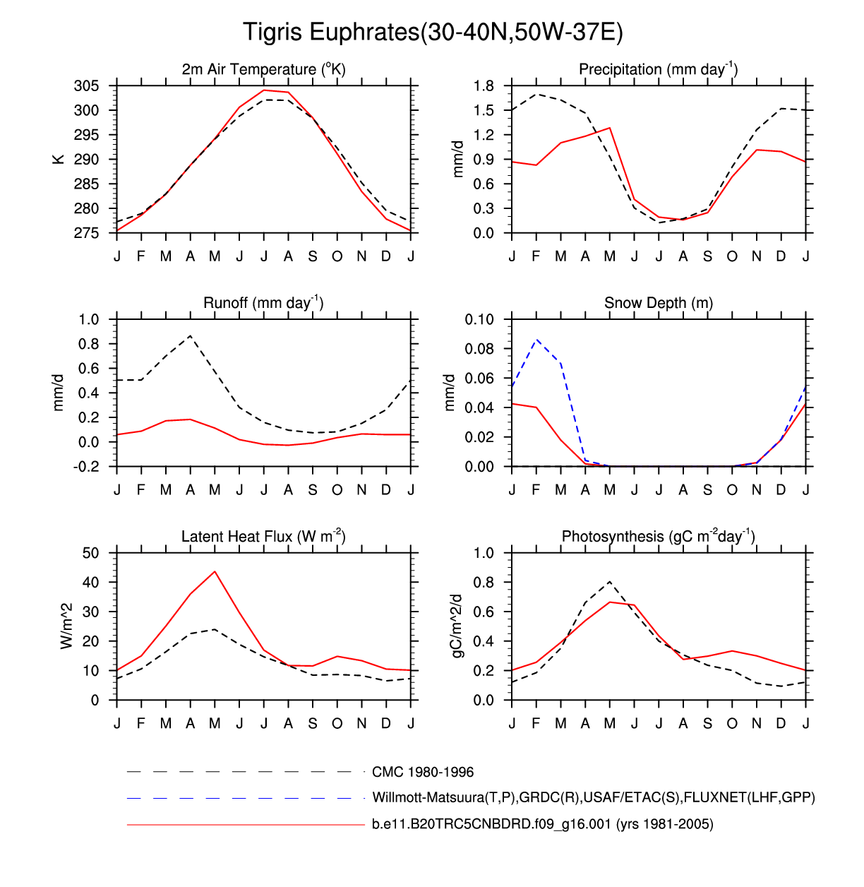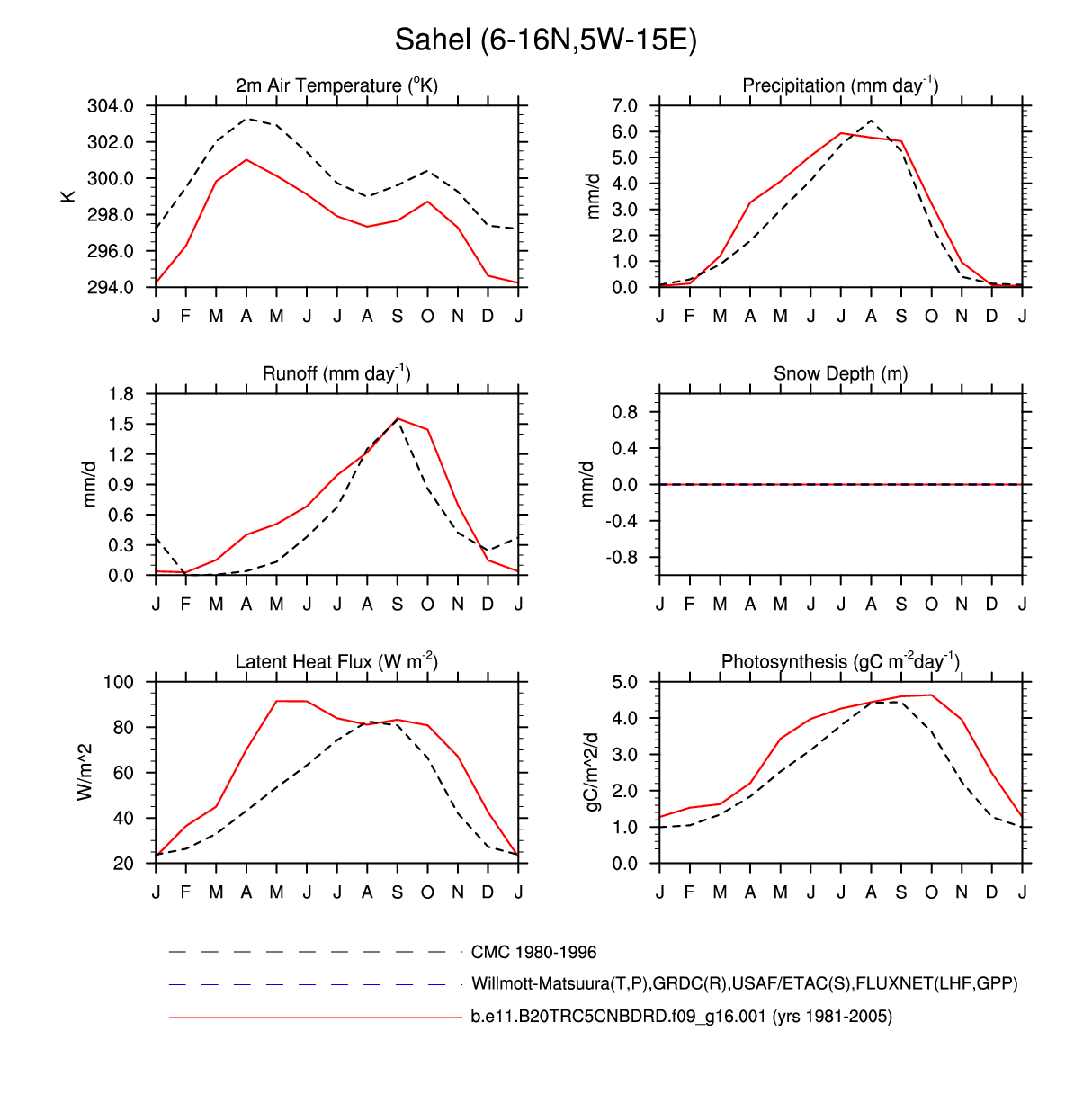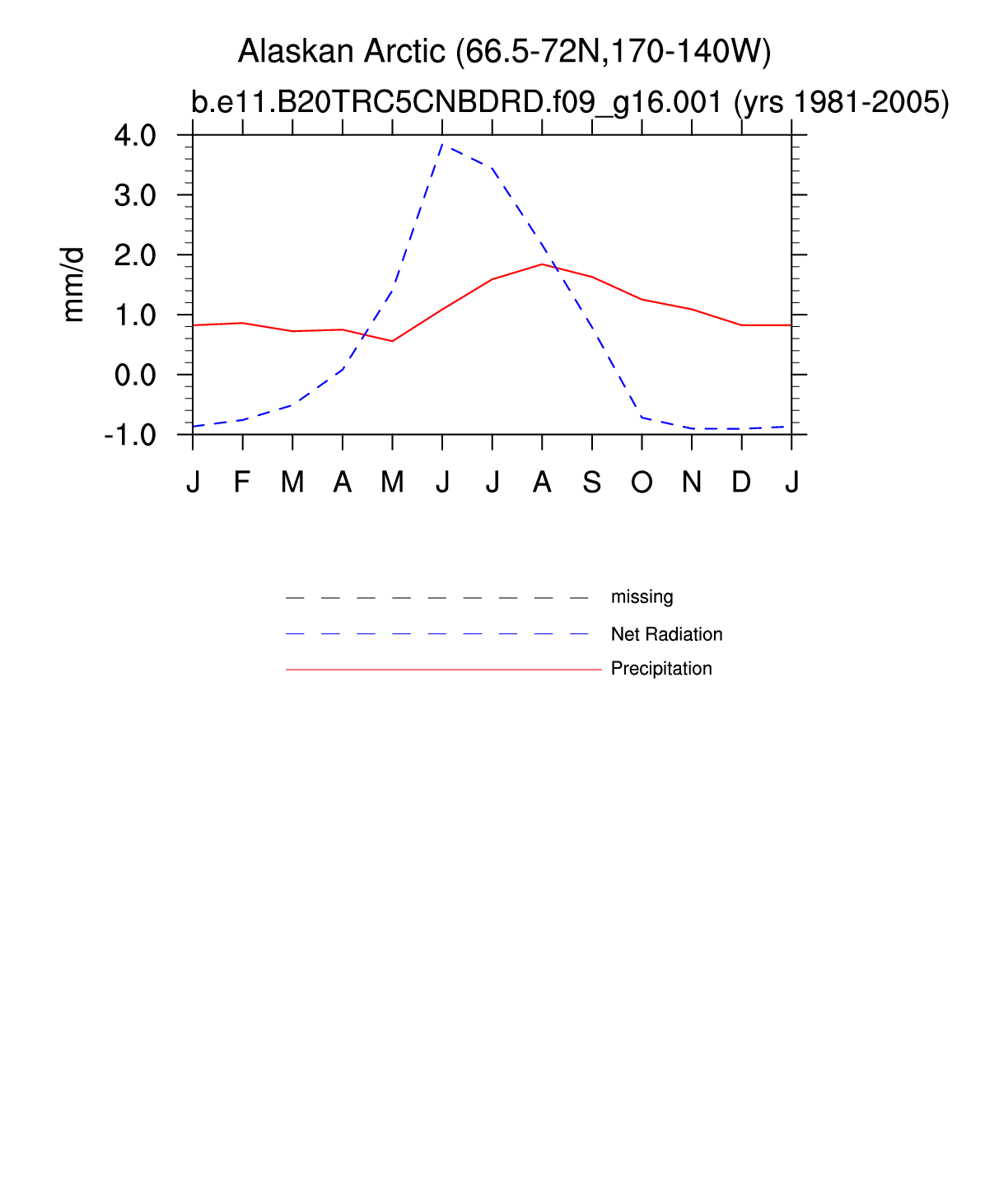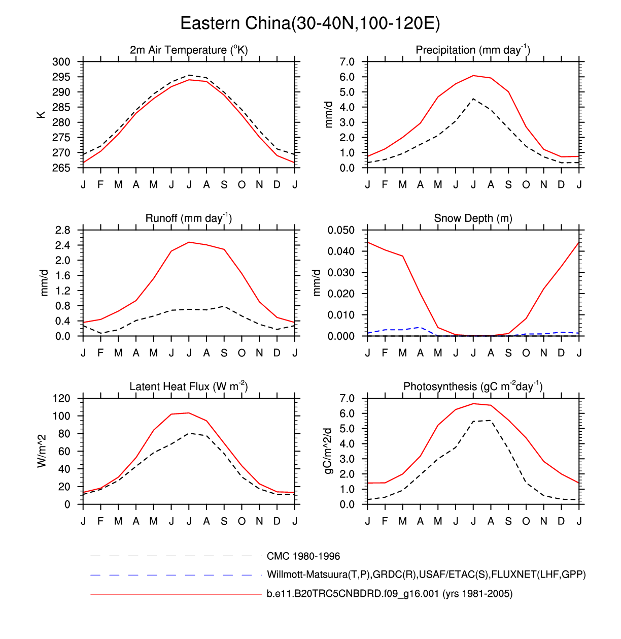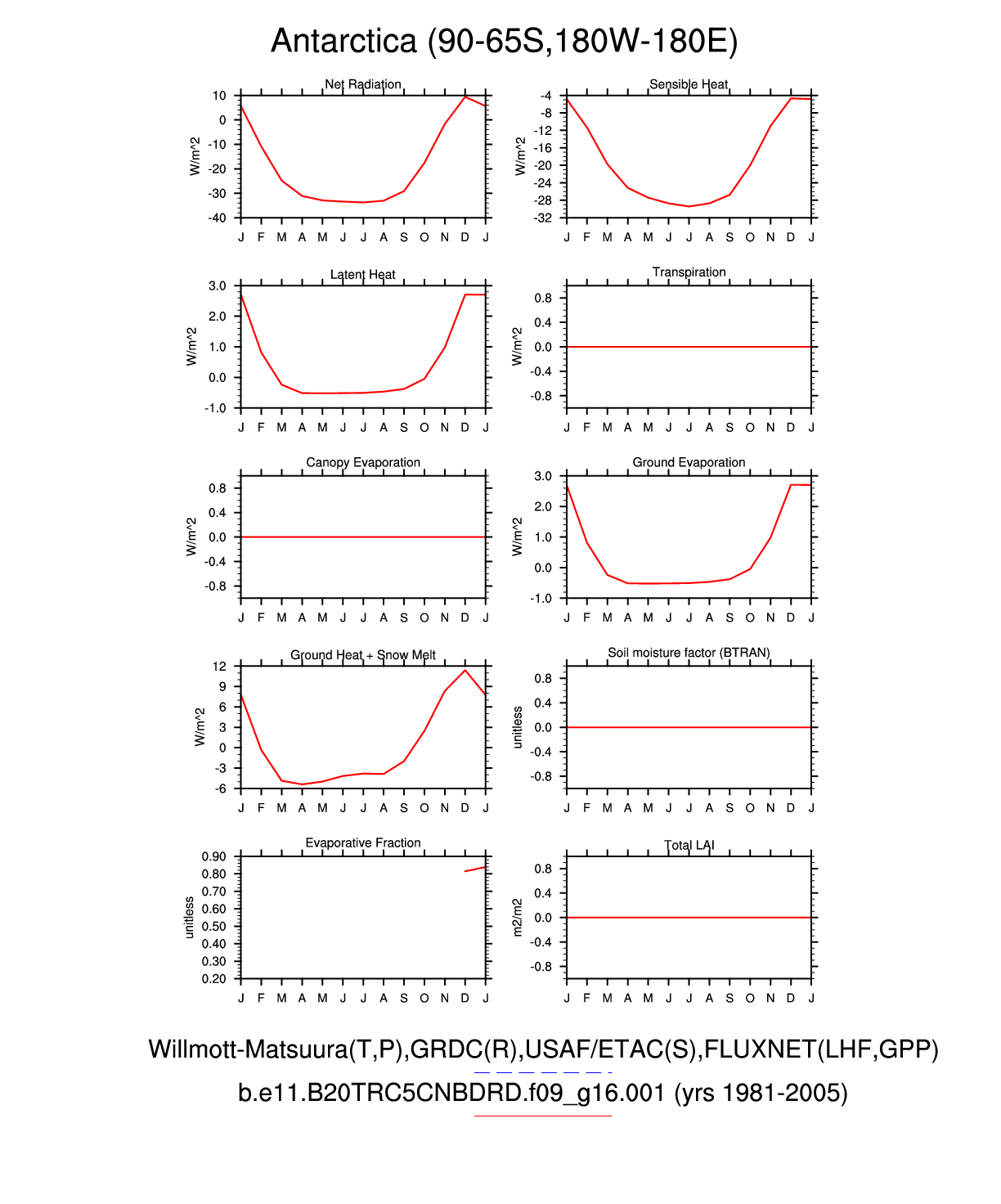 Set 3 Description: Line plots of monthly climatology: regional air temperature, precipitation, runoff, snow depth, radiative fluxes, and turbulent fluxes