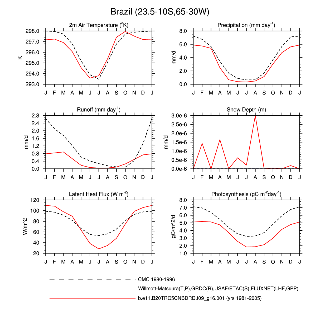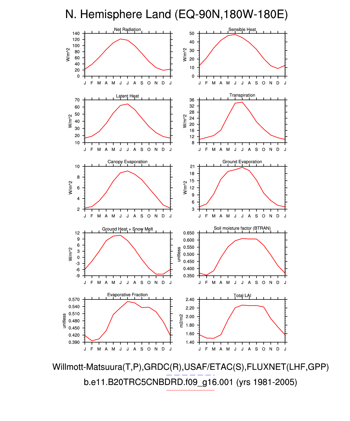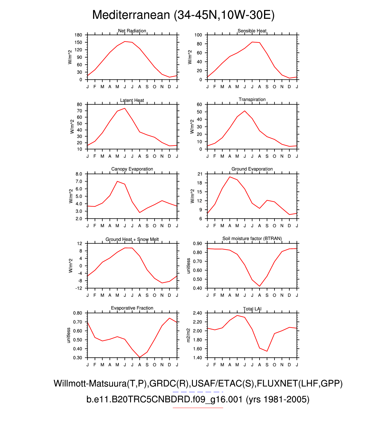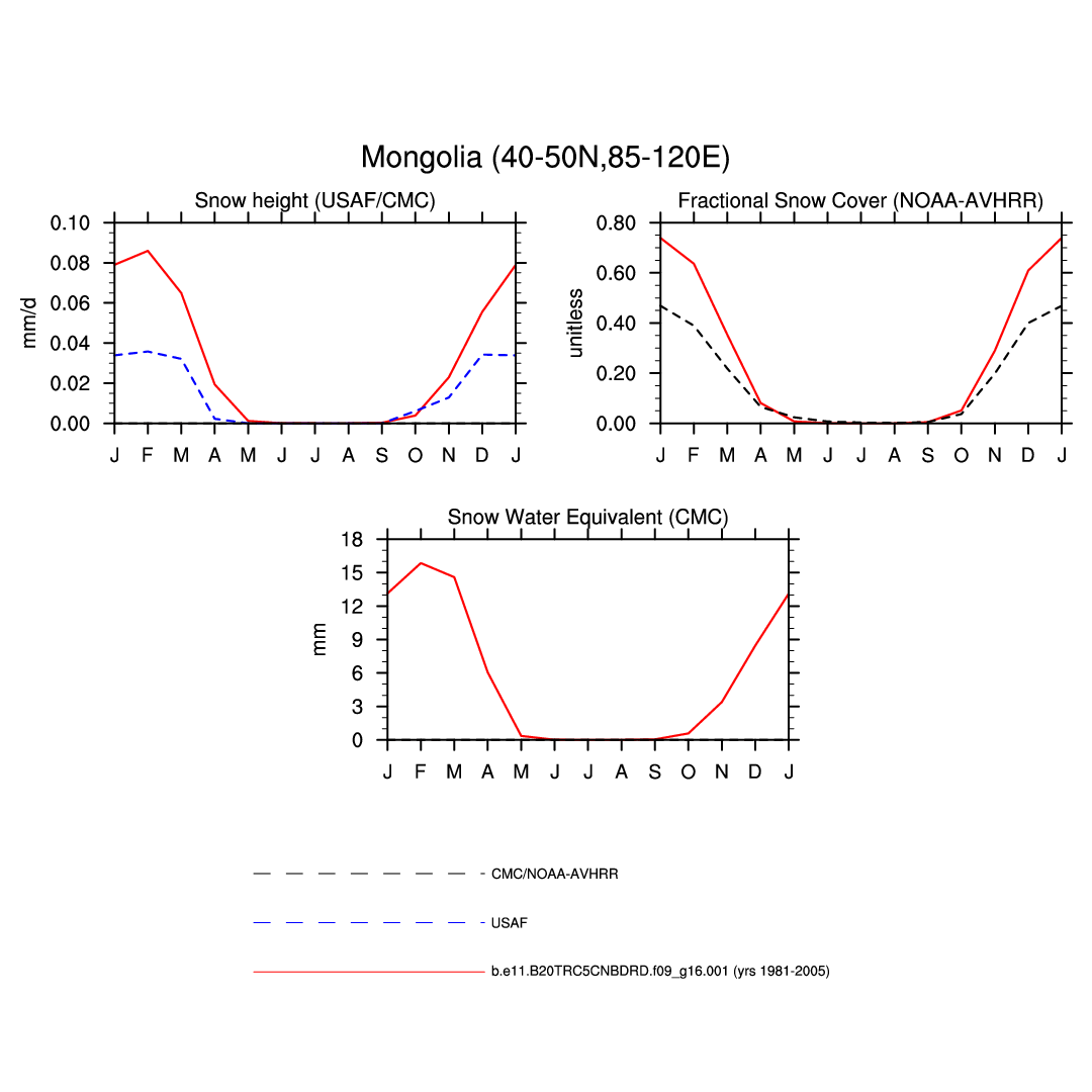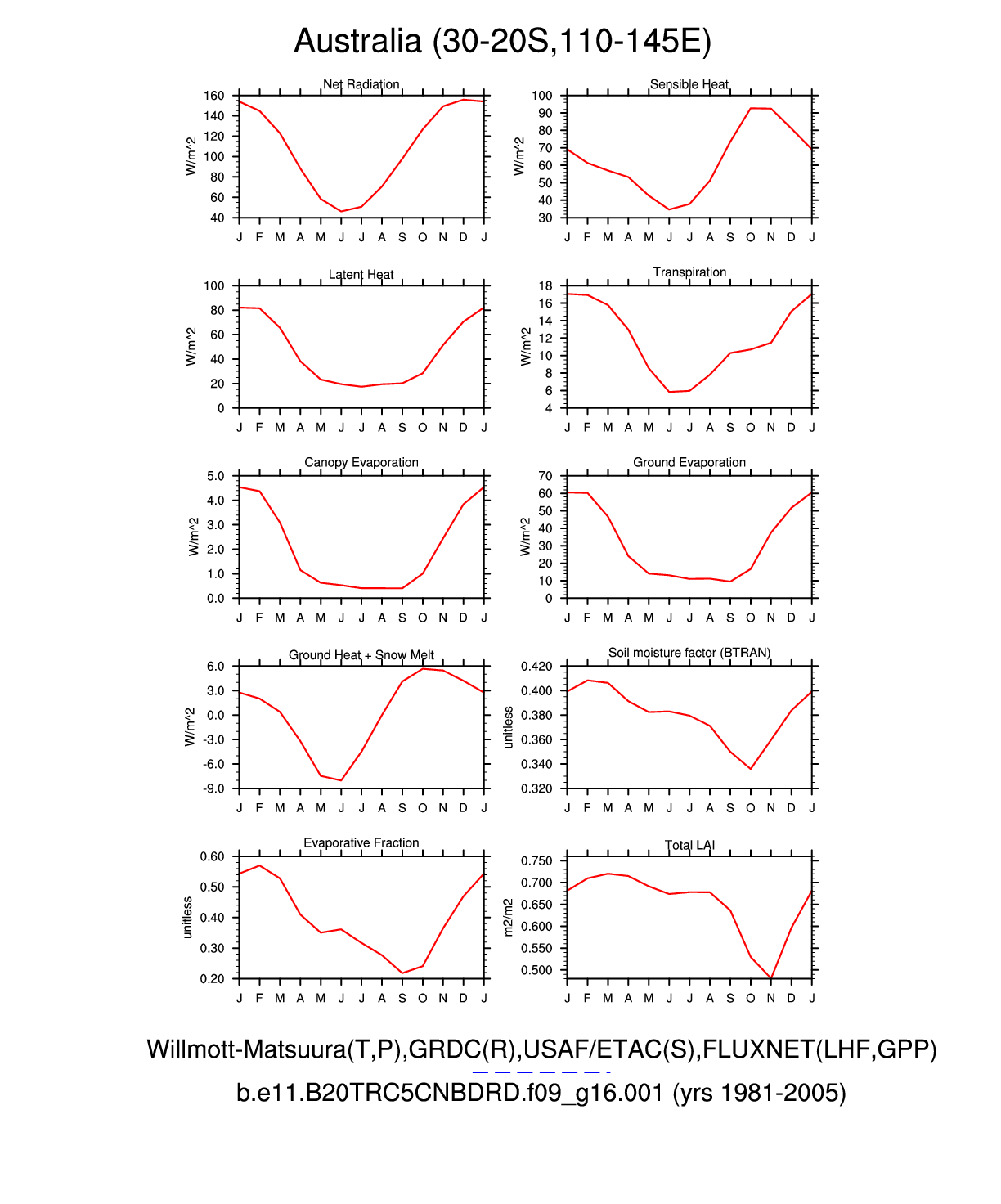 Set 3 Description: Line plots of monthly climatology: regional air temperature, precipitation, runoff, snow depth, radiative fluxes, and turbulent fluxes