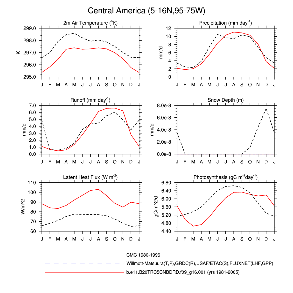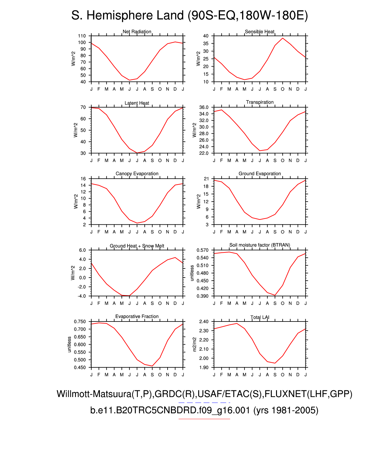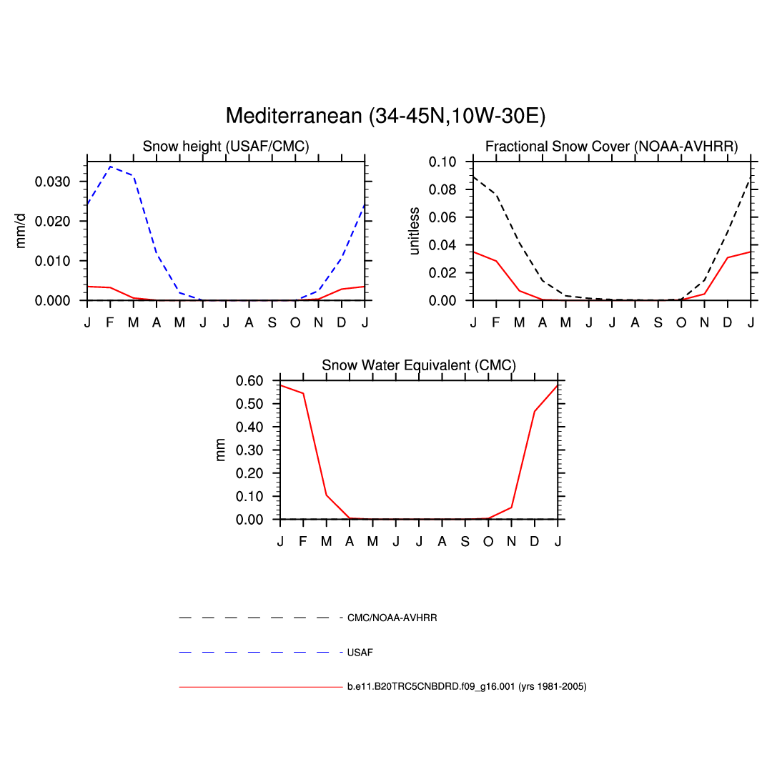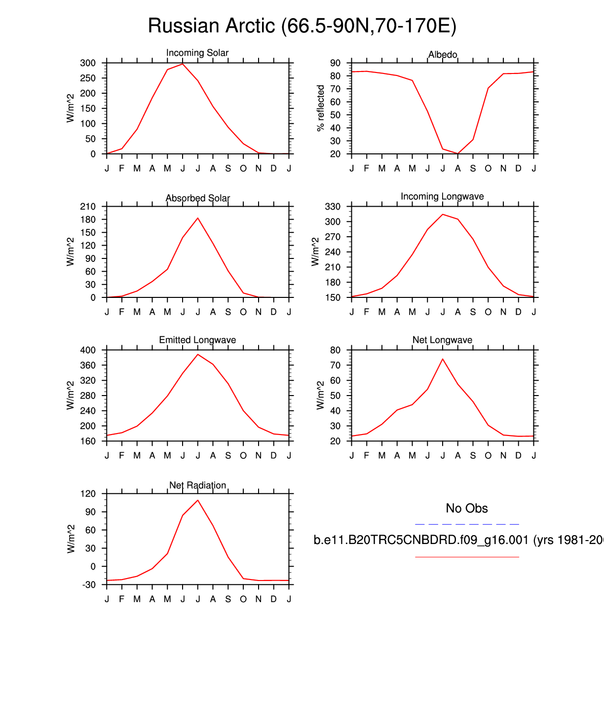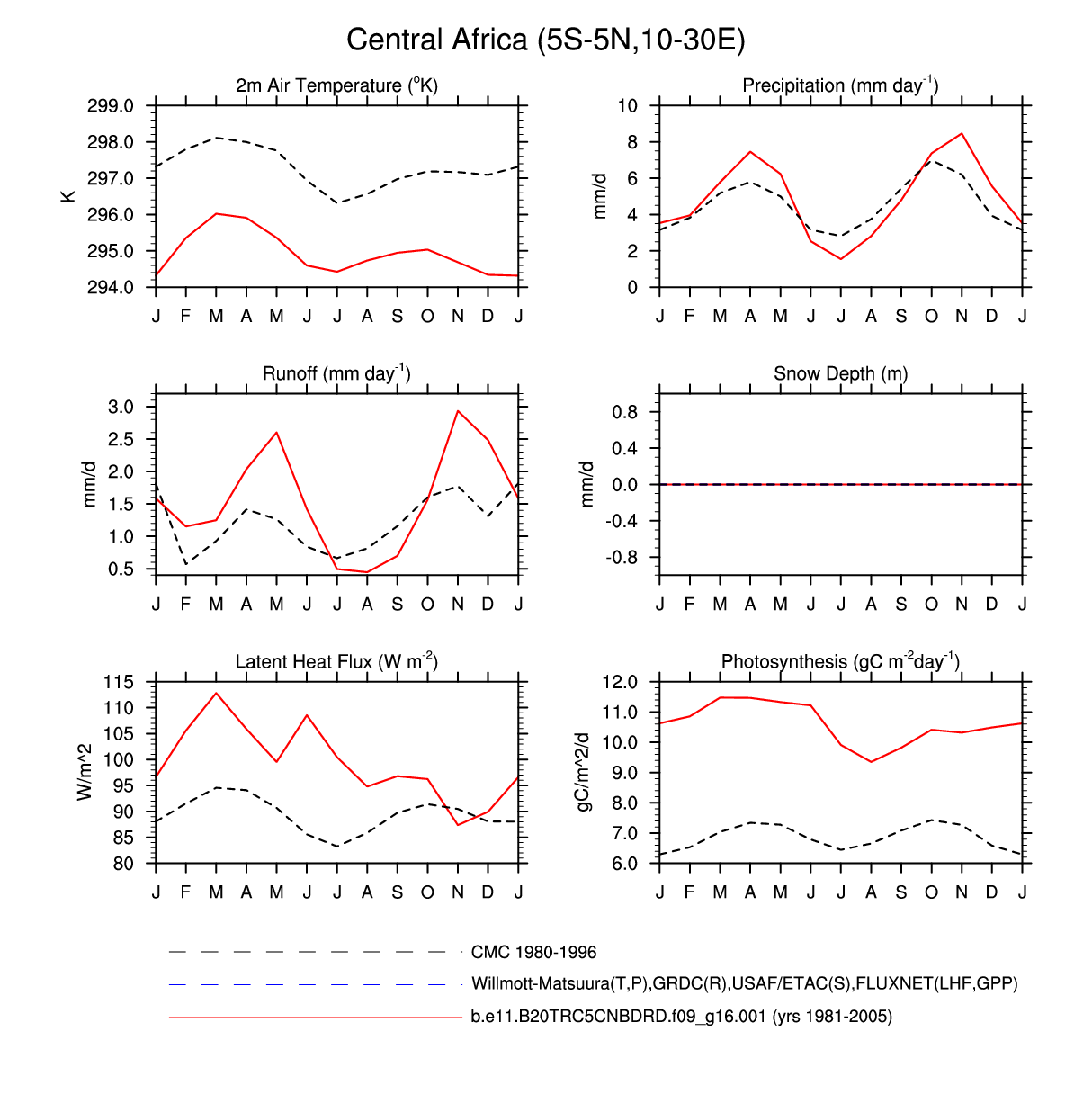 Set 3 Description: Line plots of monthly climatology: regional air temperature, precipitation, runoff, snow depth, radiative fluxes, and turbulent fluxes
