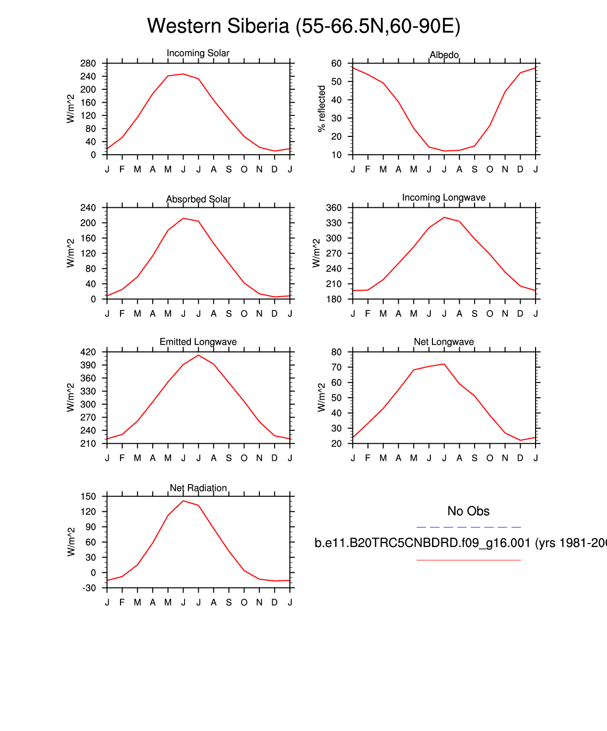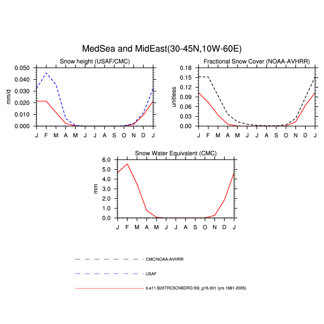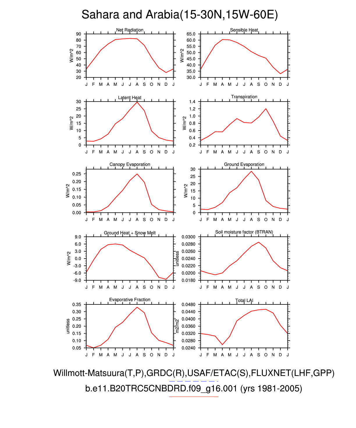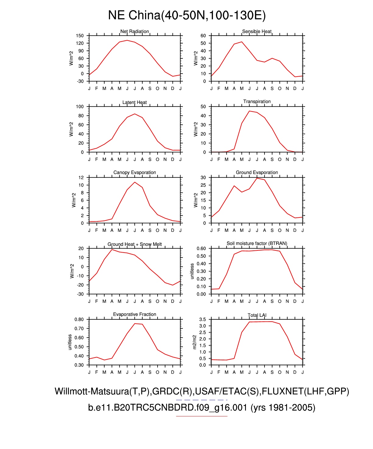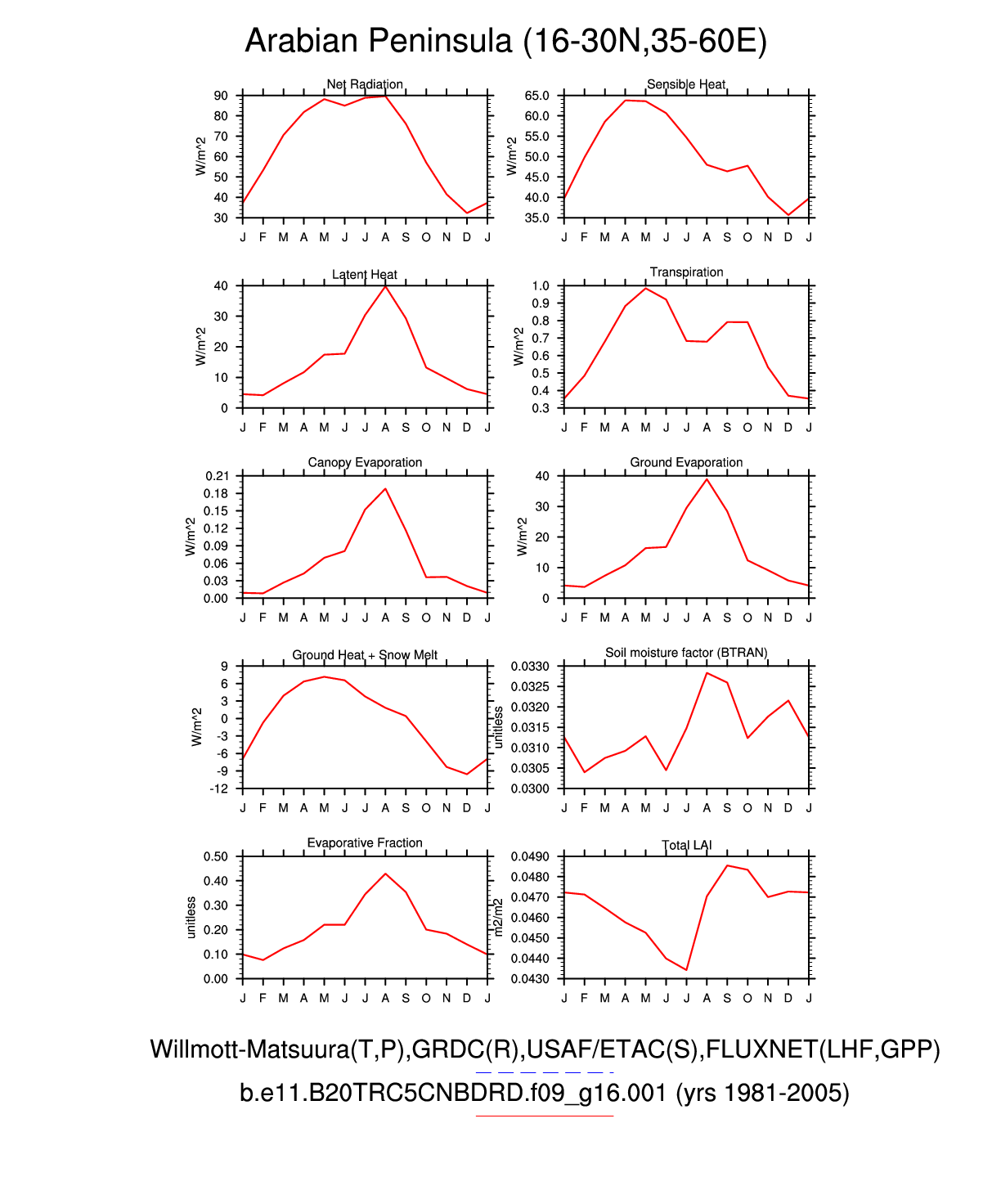 Set 3 Description: Line plots of monthly climatology: regional air temperature, precipitation, runoff, snow depth, radiative fluxes, and turbulent fluxes