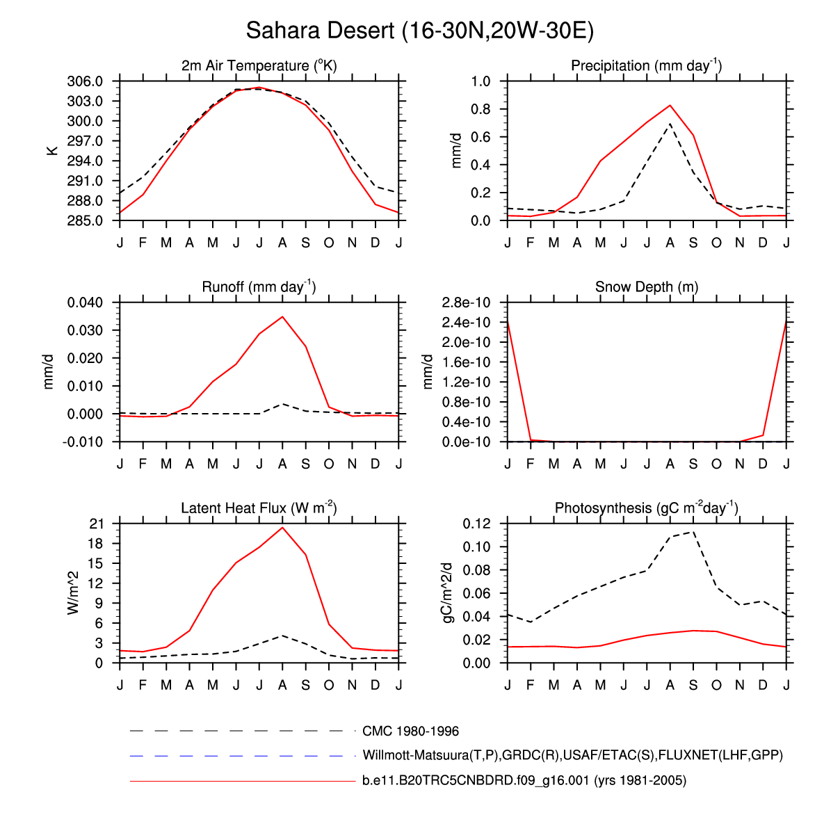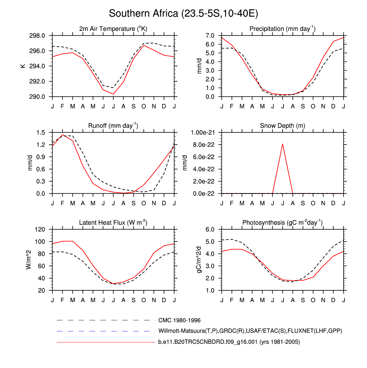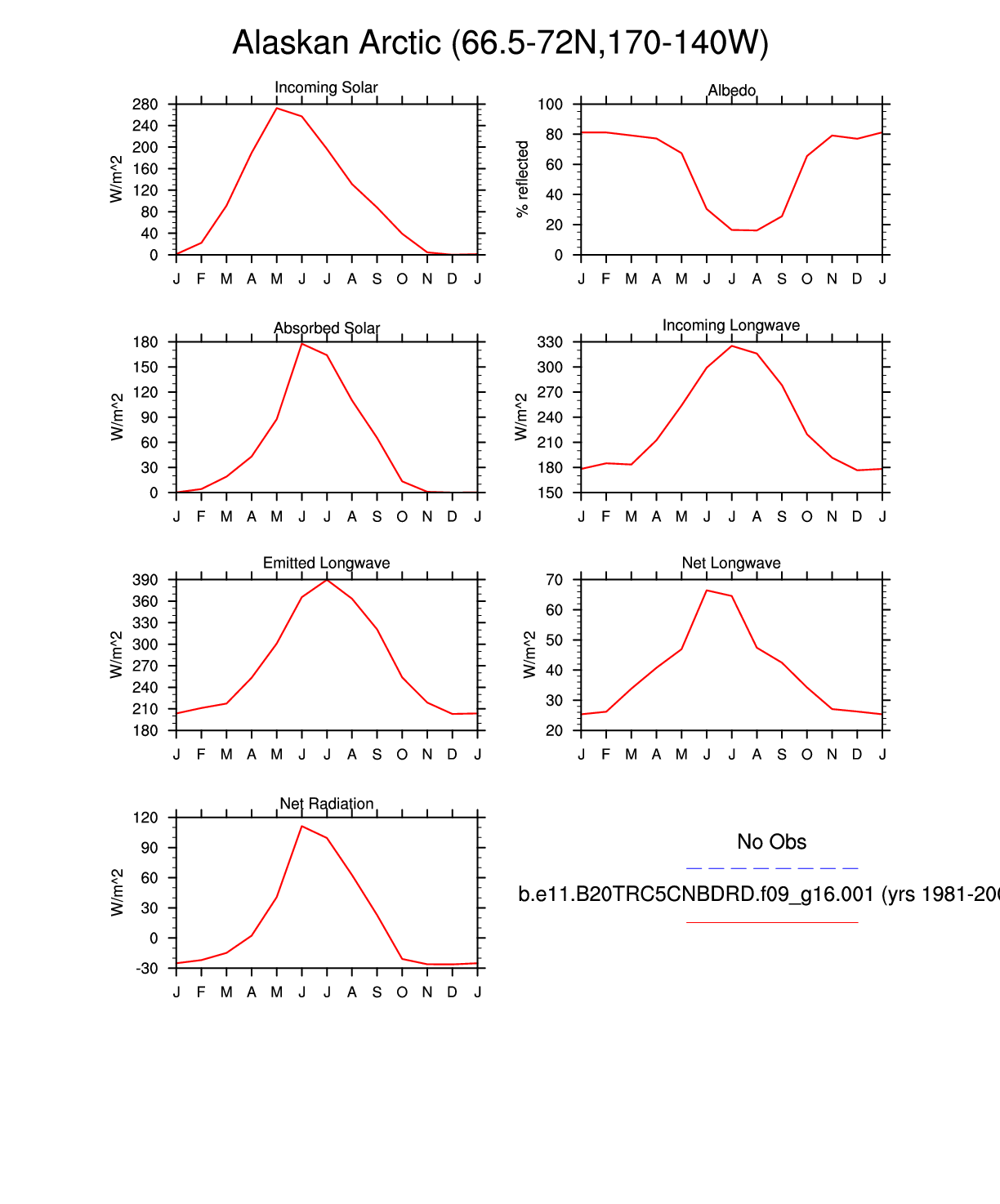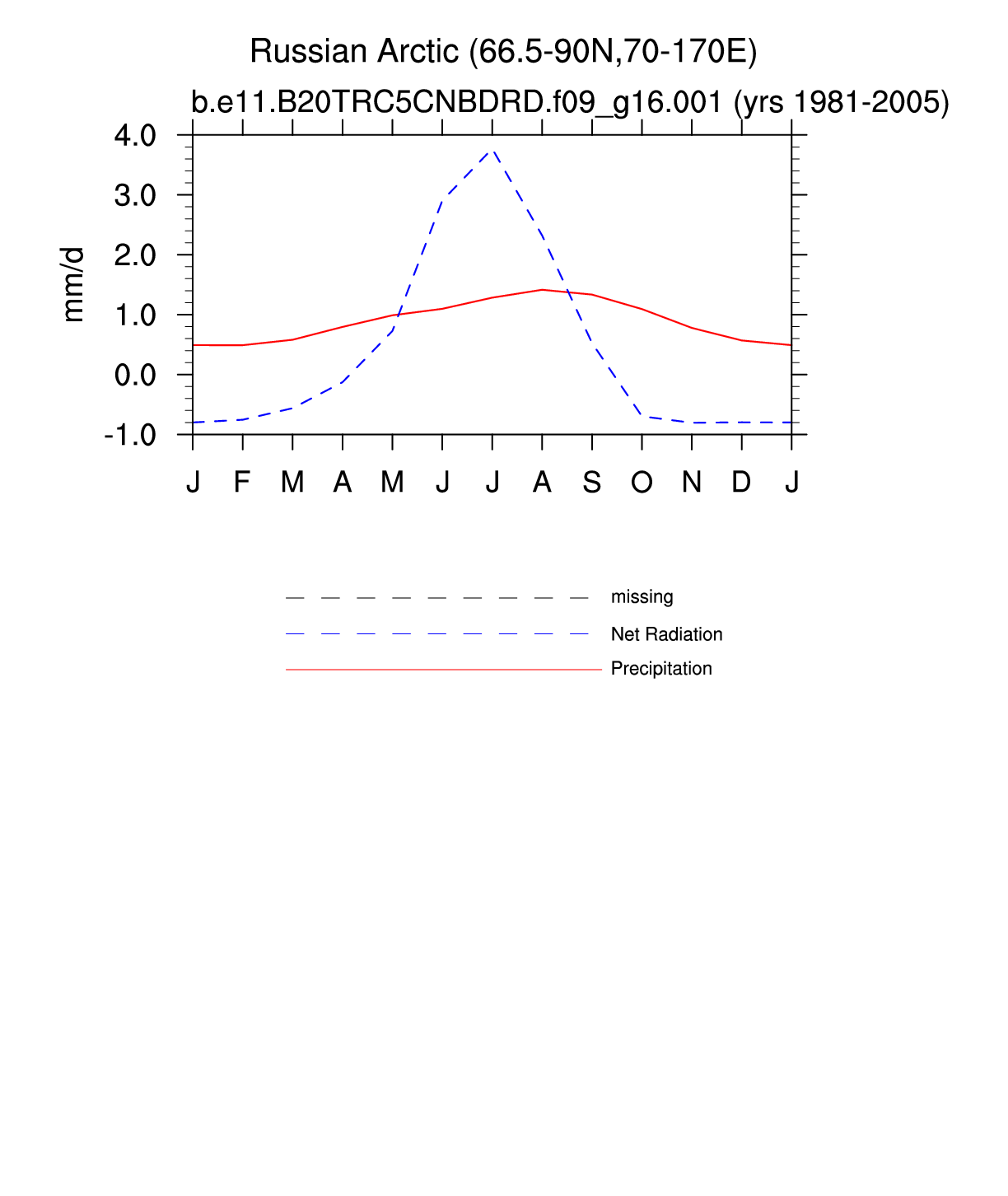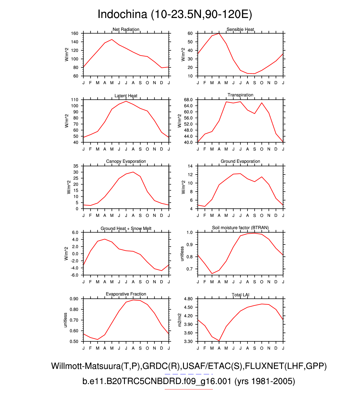 Set 3 Description: Line plots of monthly climatology: regional air temperature, precipitation, runoff, snow depth, radiative fluxes, and turbulent fluxes