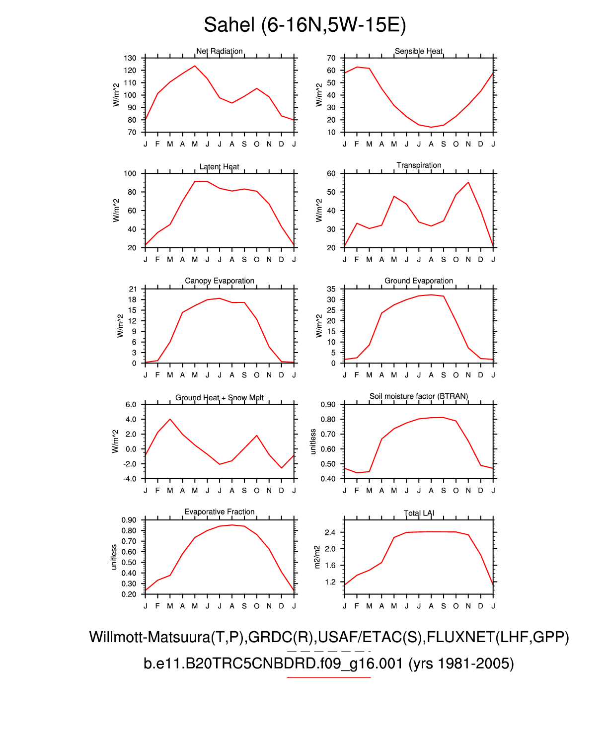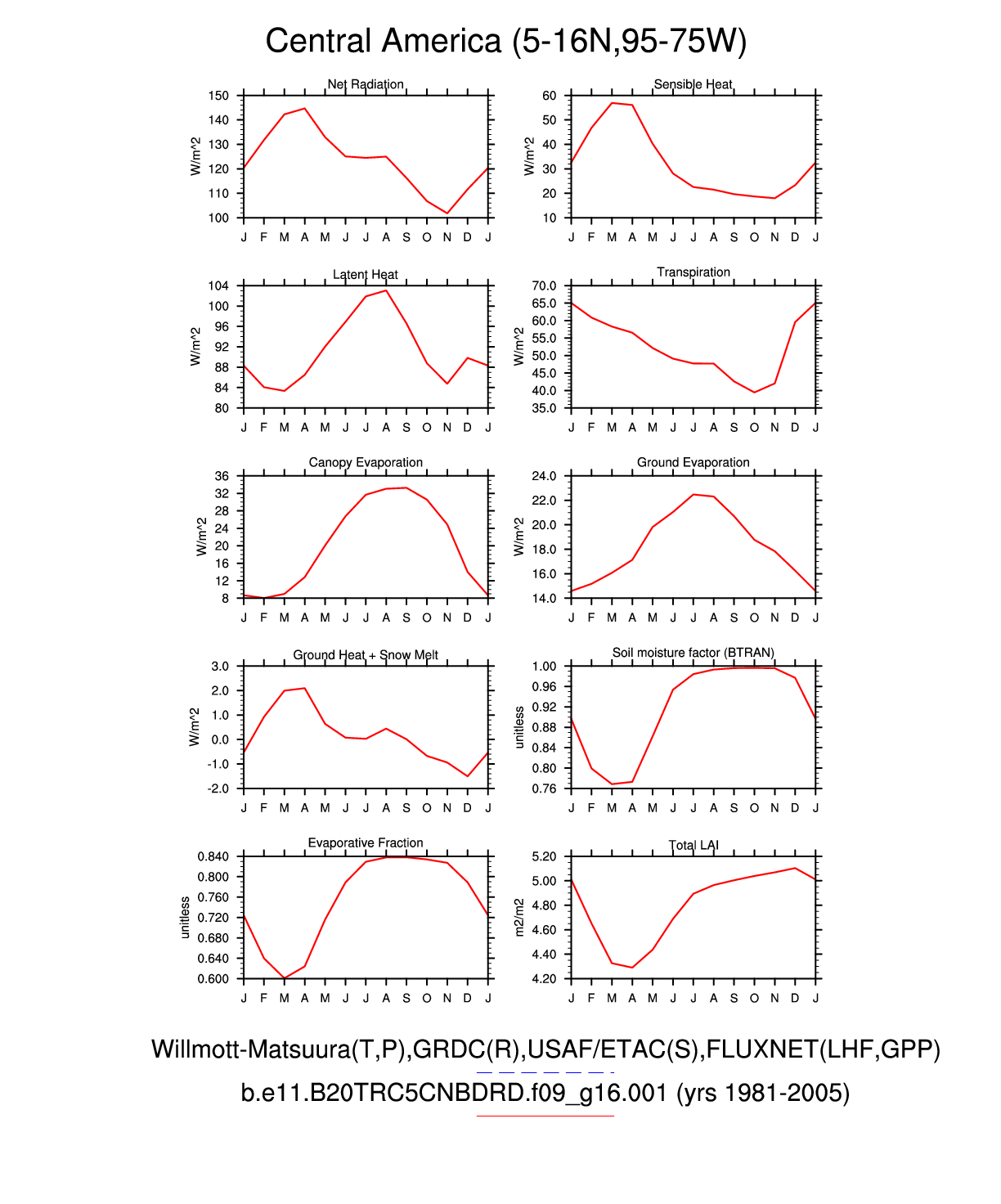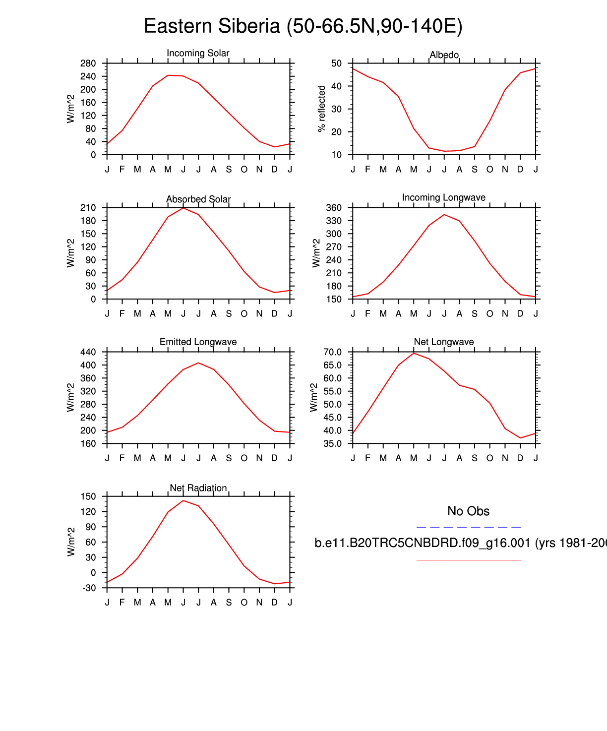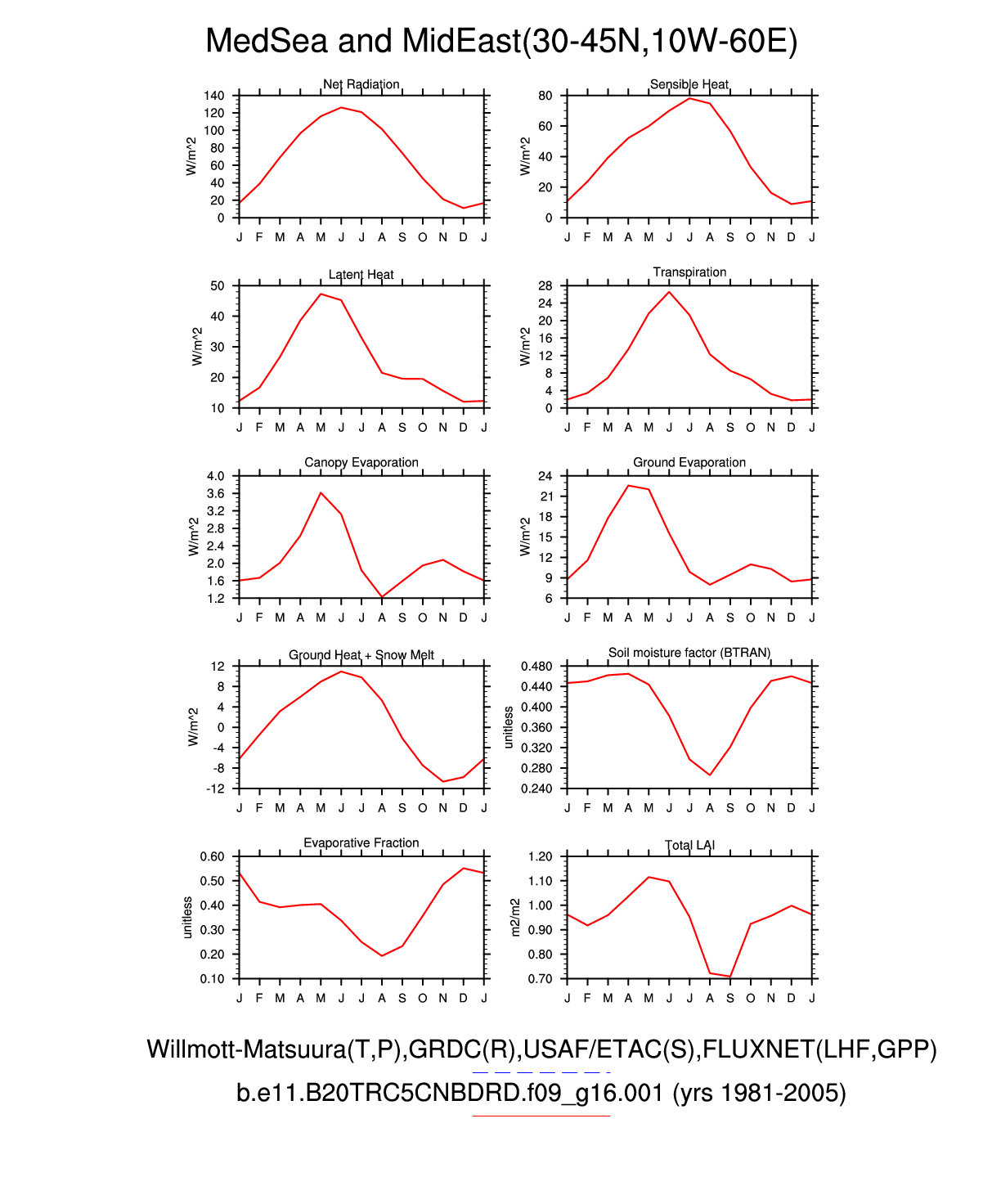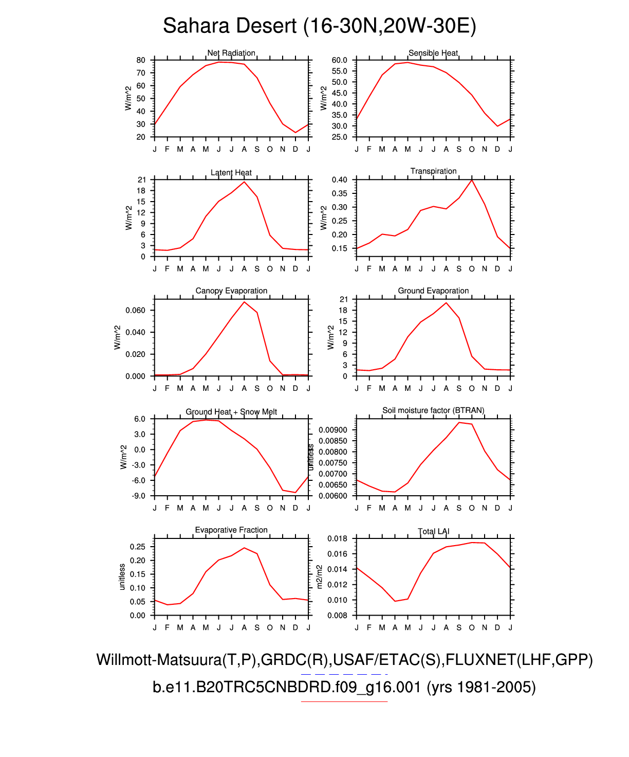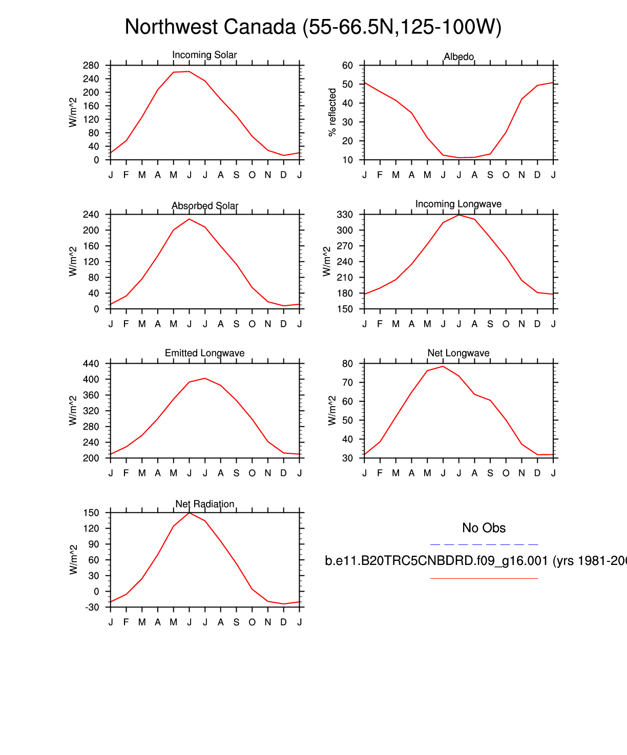 Set 3 Description: Line plots of monthly climatology: regional air temperature, precipitation, runoff, snow depth, radiative fluxes, and turbulent fluxes