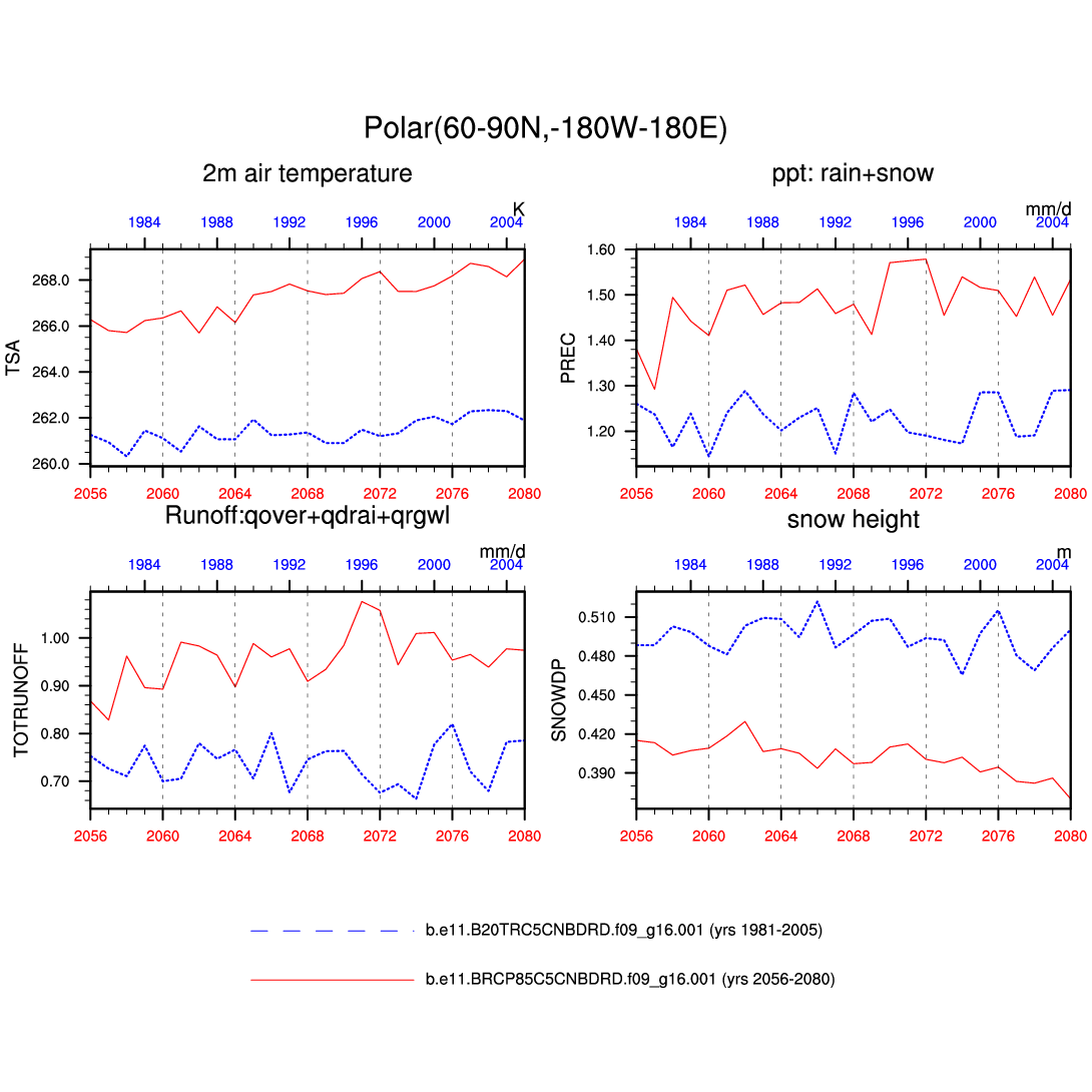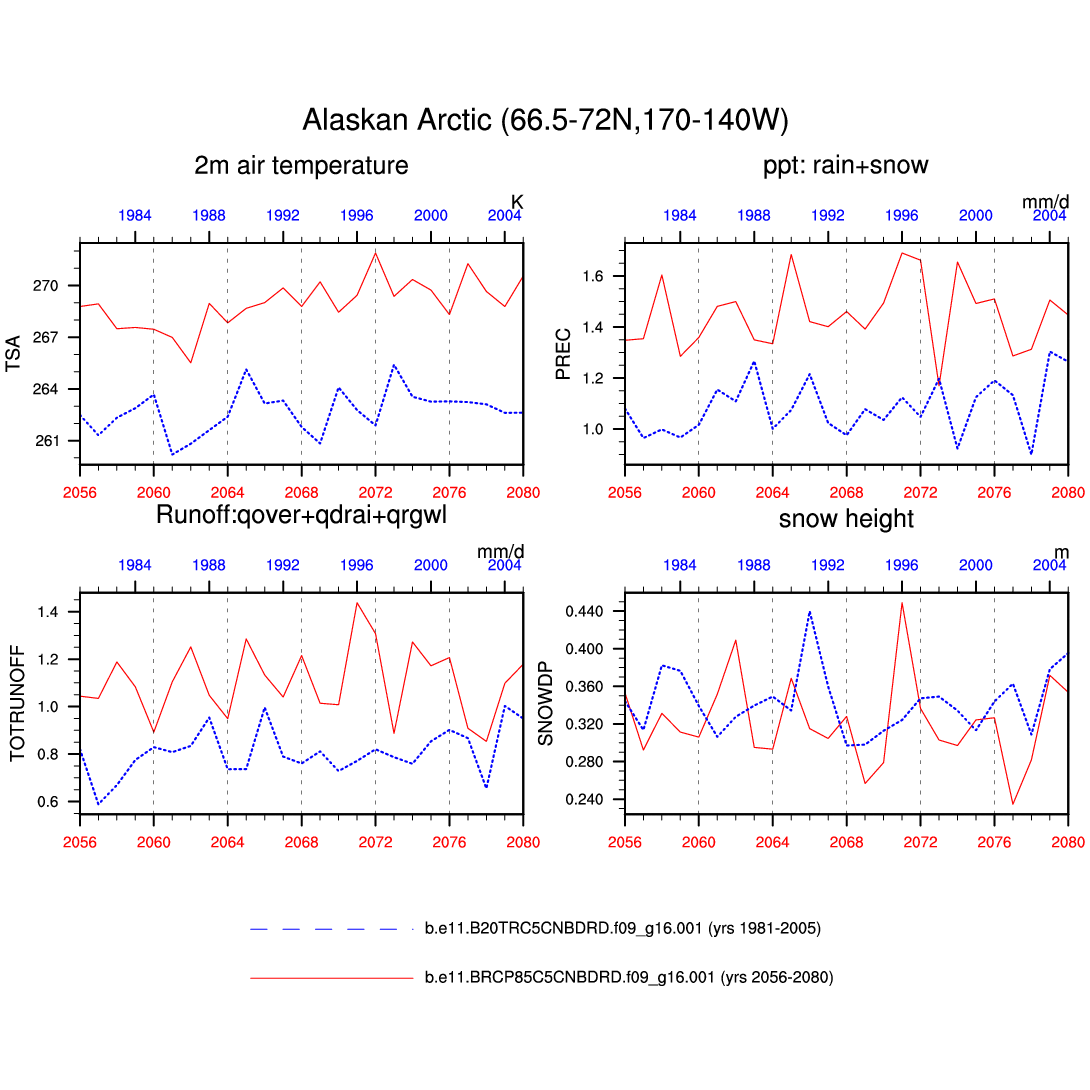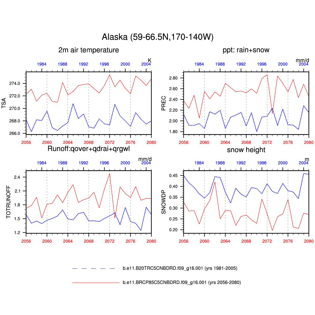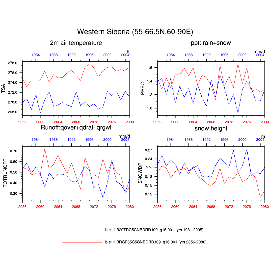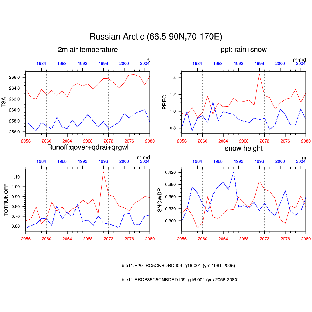 Set 6 Description: Line plots of annual trends in regional soil water/ice and temperature, runoff, snow water/ice, photosynthesis