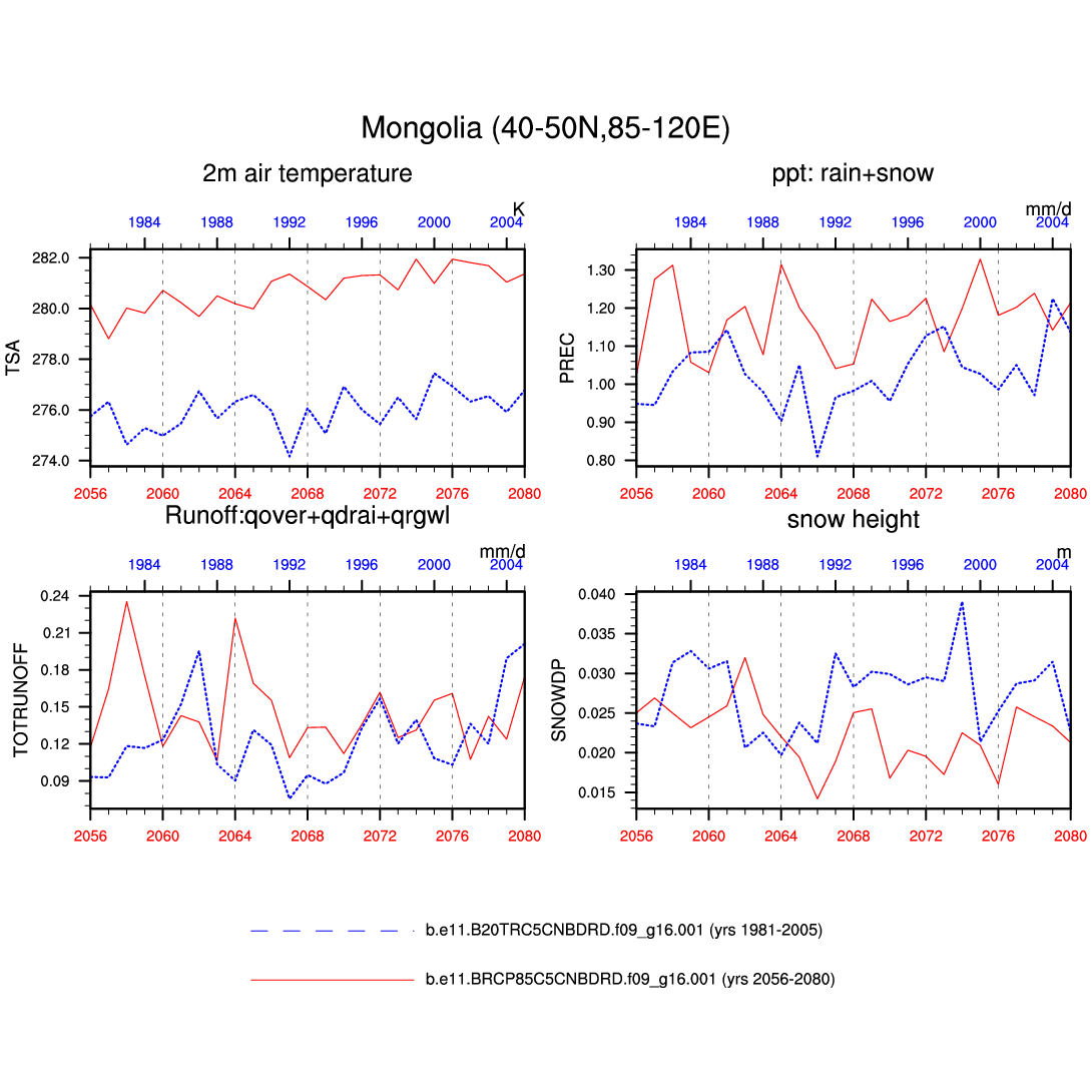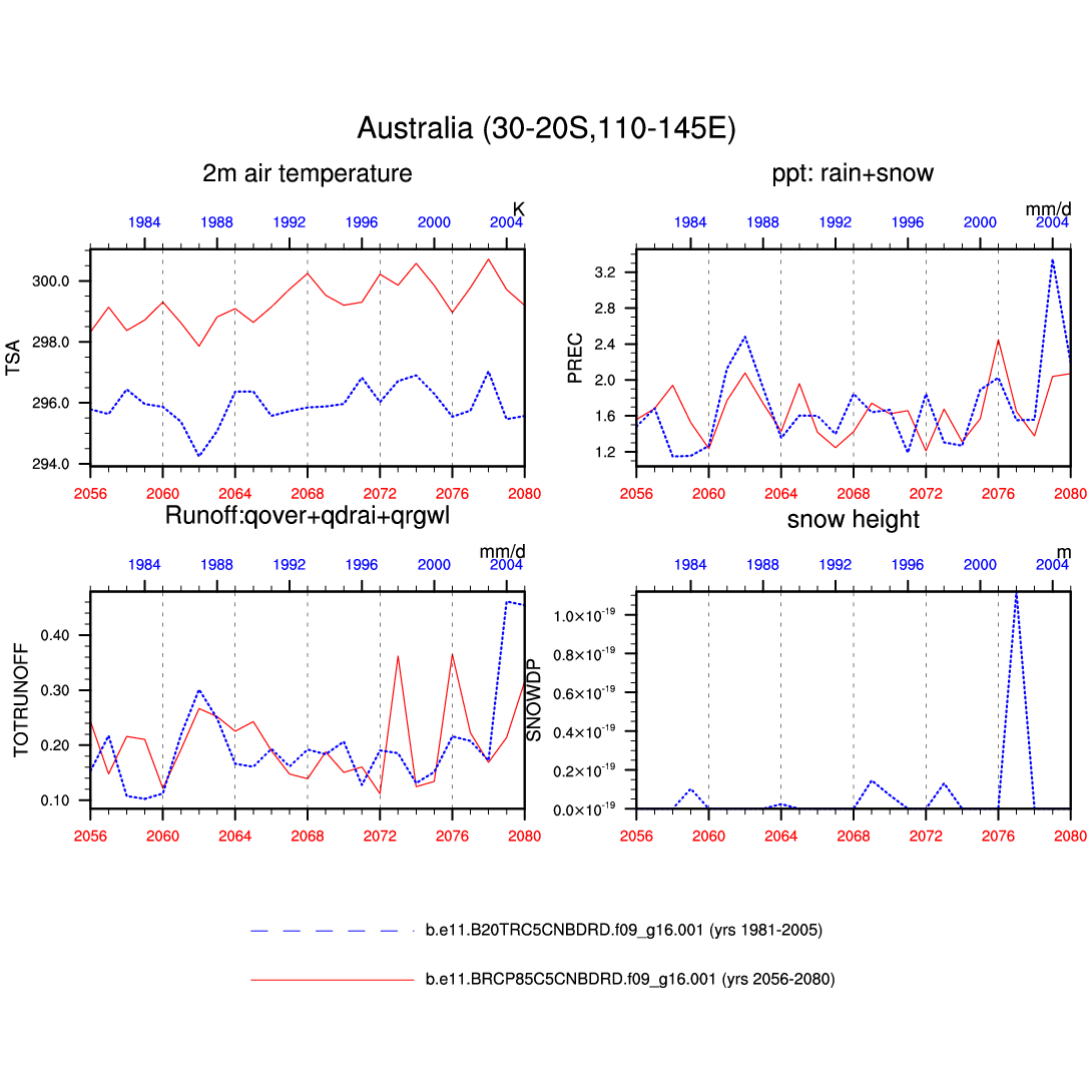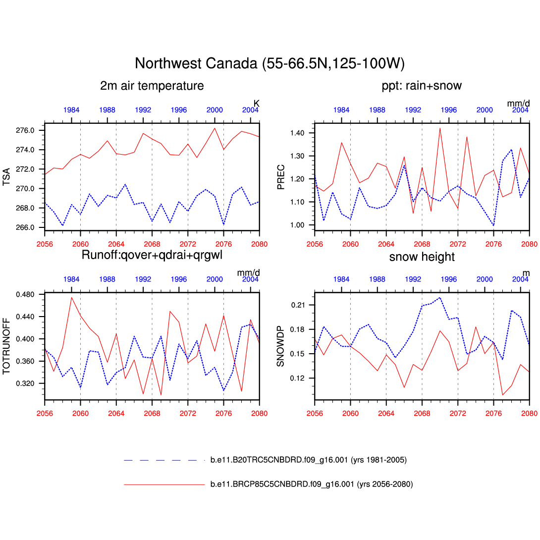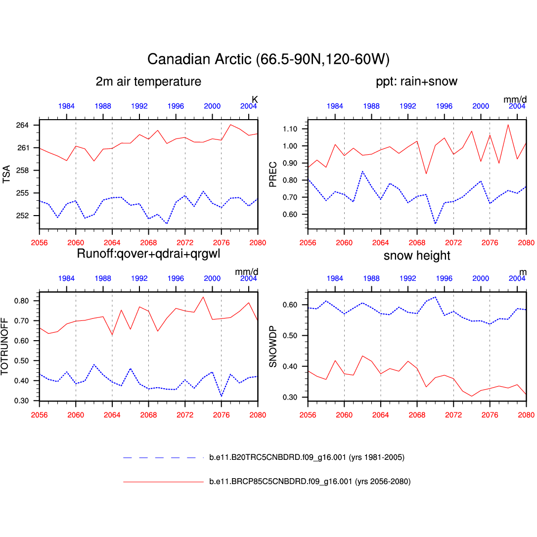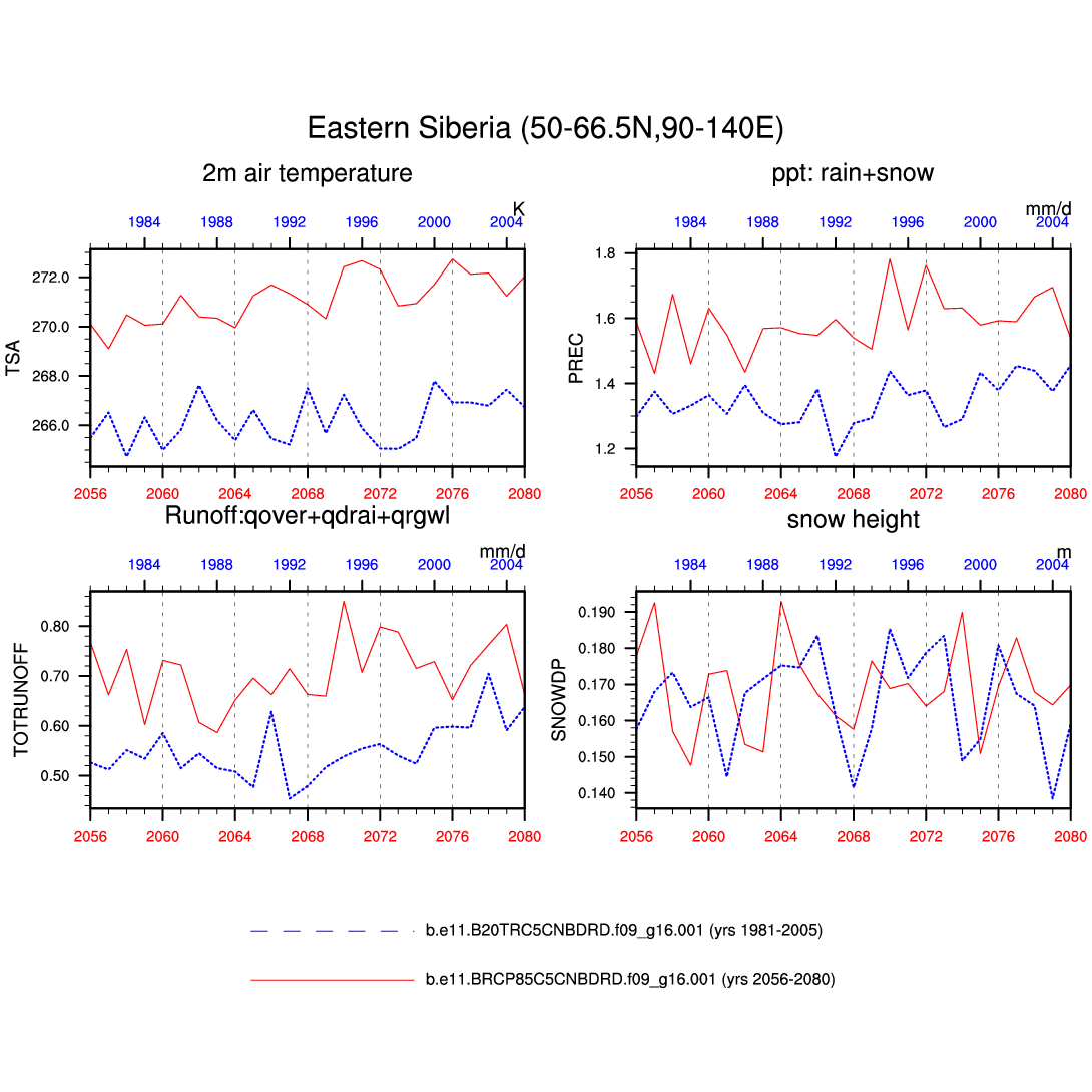 Set 6 Description: Line plots of annual trends in regional soil water/ice and temperature, runoff, snow water/ice, photosynthesis