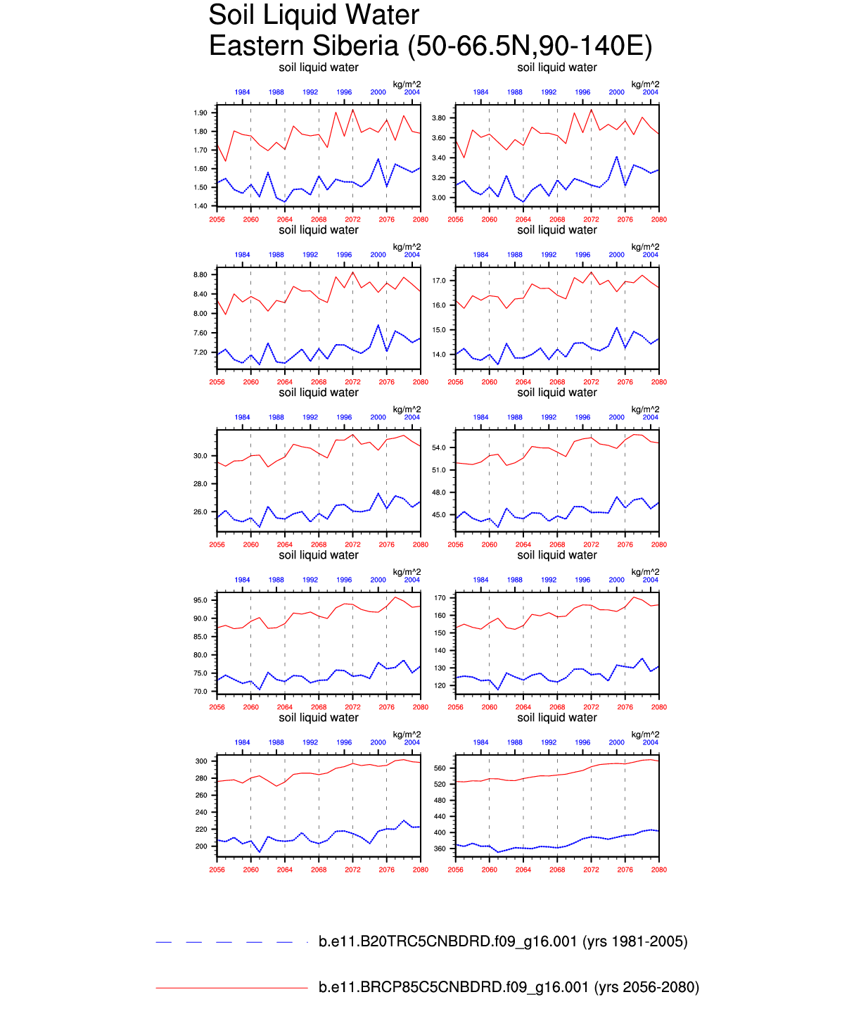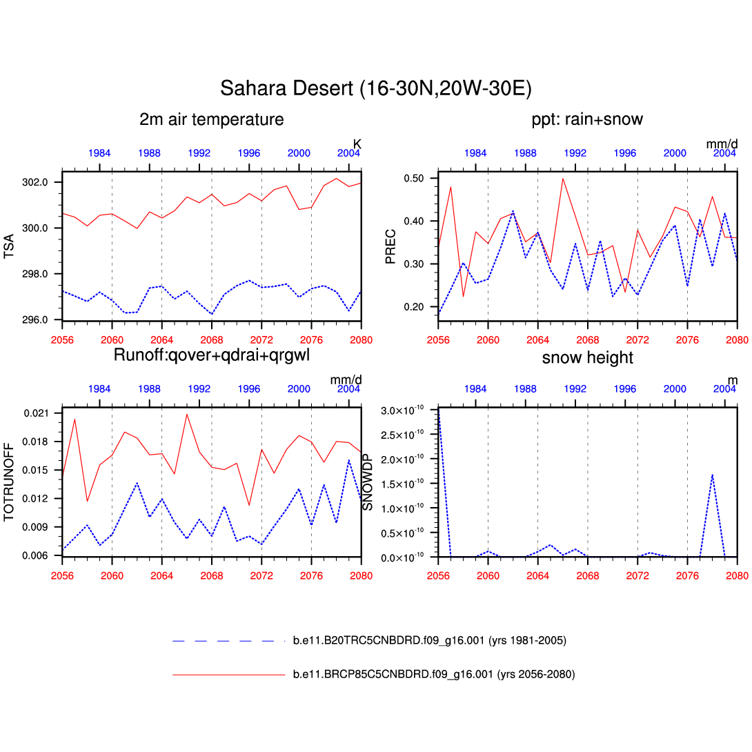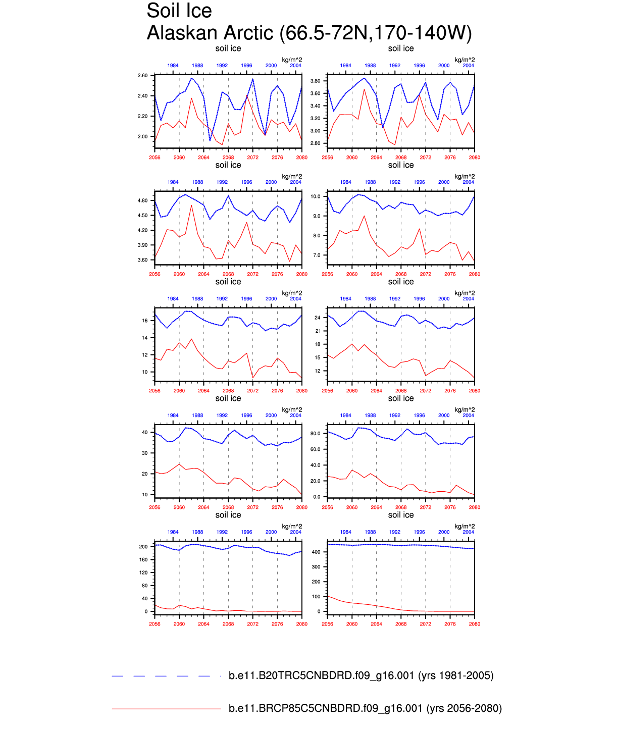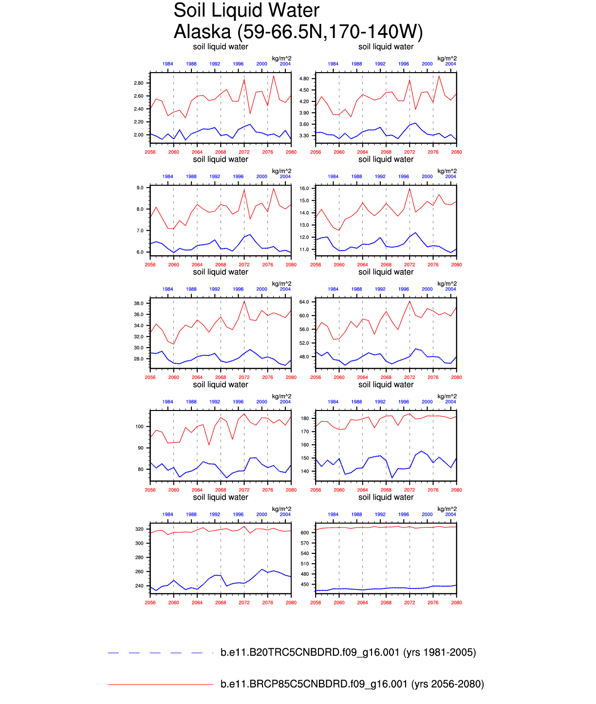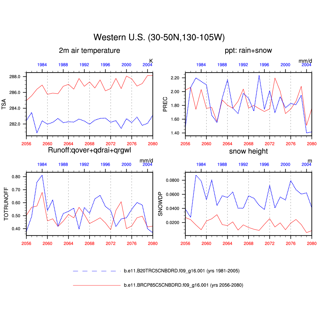 Set 6 Description: Line plots of annual trends in regional soil water/ice and temperature, runoff, snow water/ice, photosynthesis