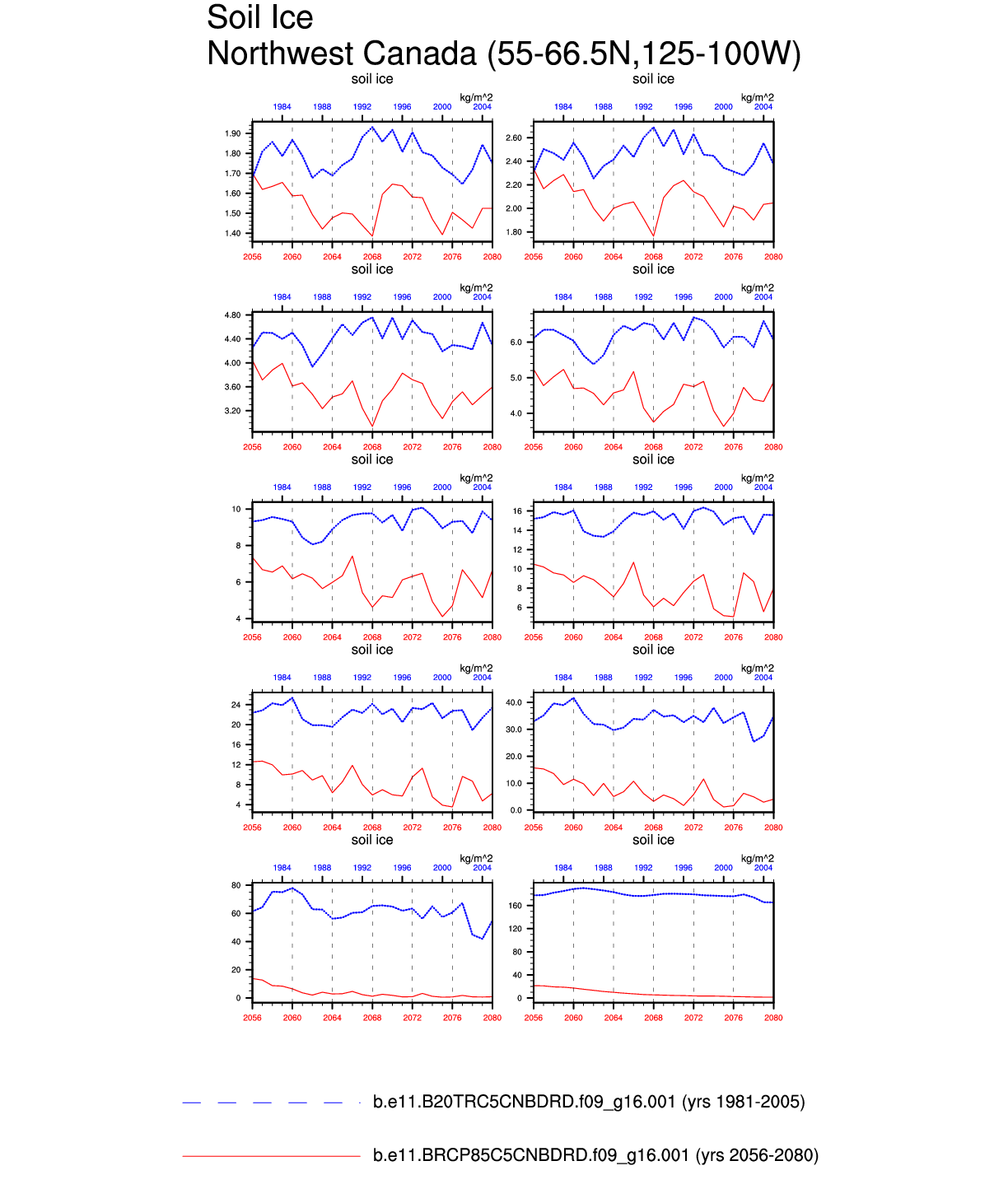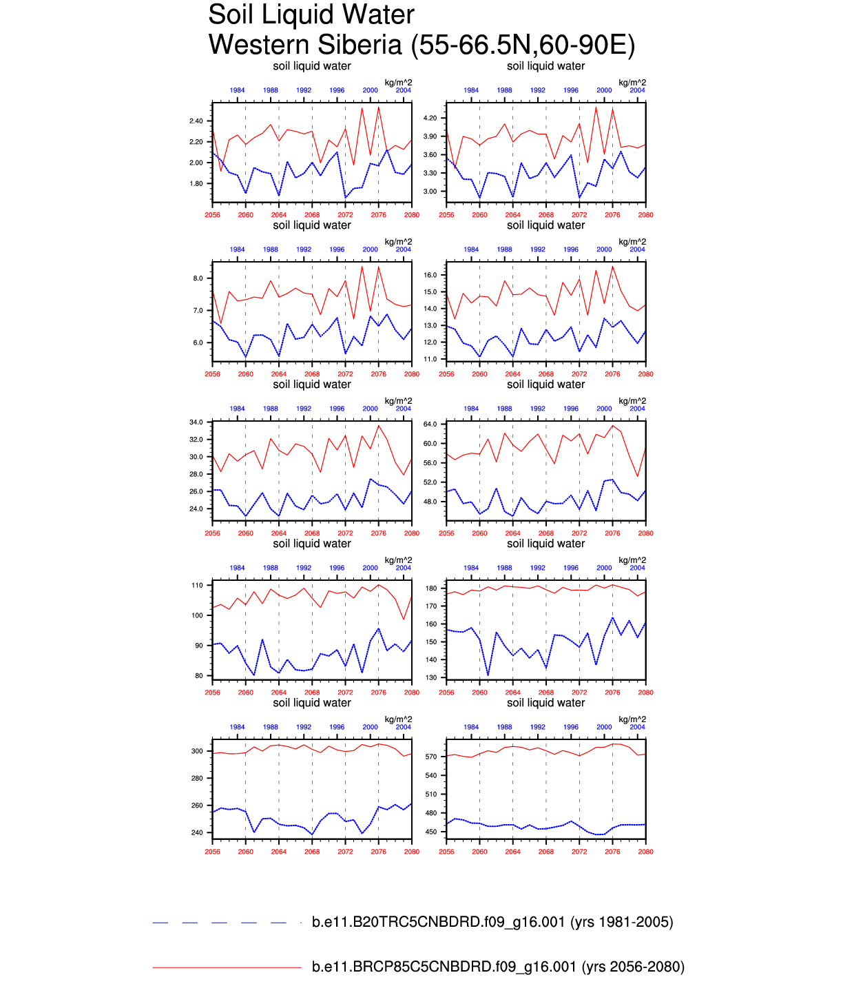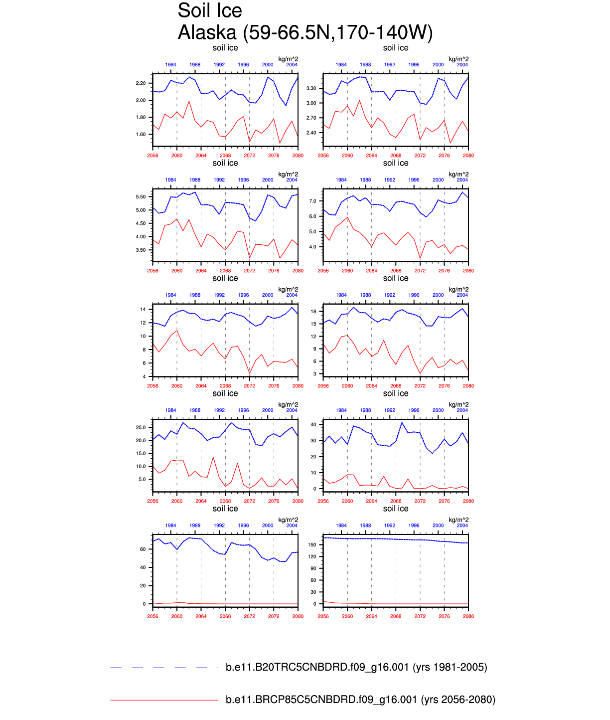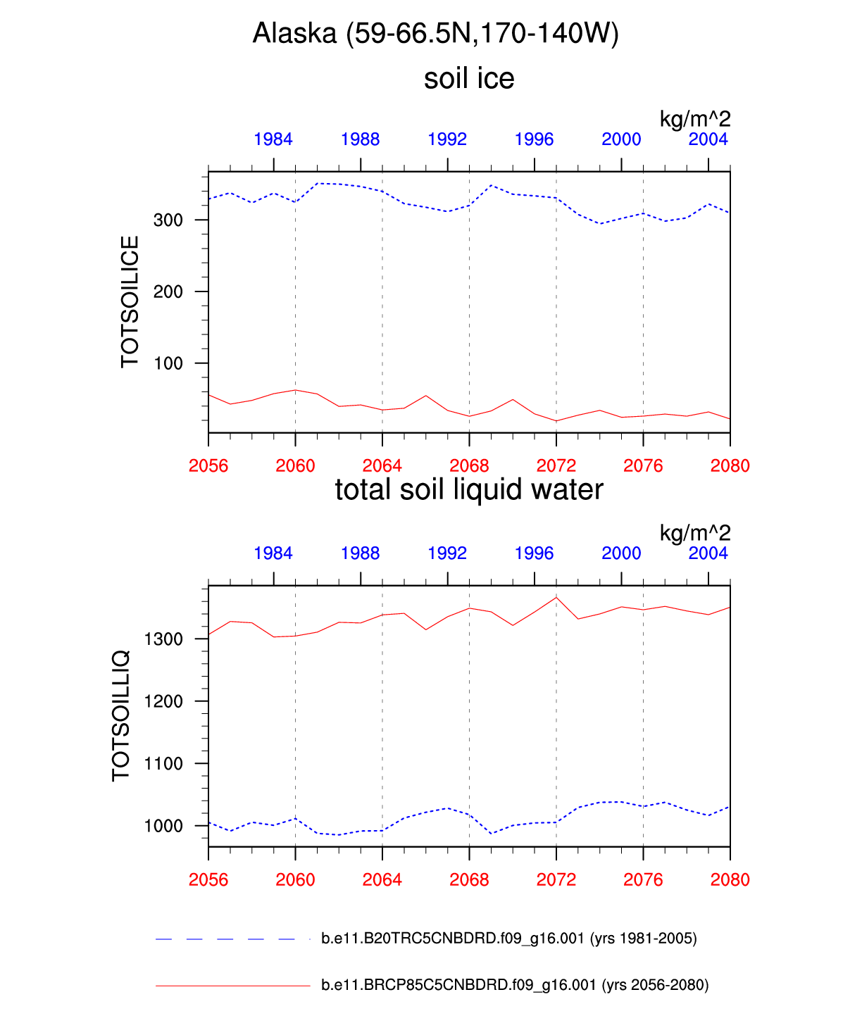 Set 6 Description: Line plots of annual trends in regional soil water/ice and temperature, runoff, snow water/ice, photosynthesis