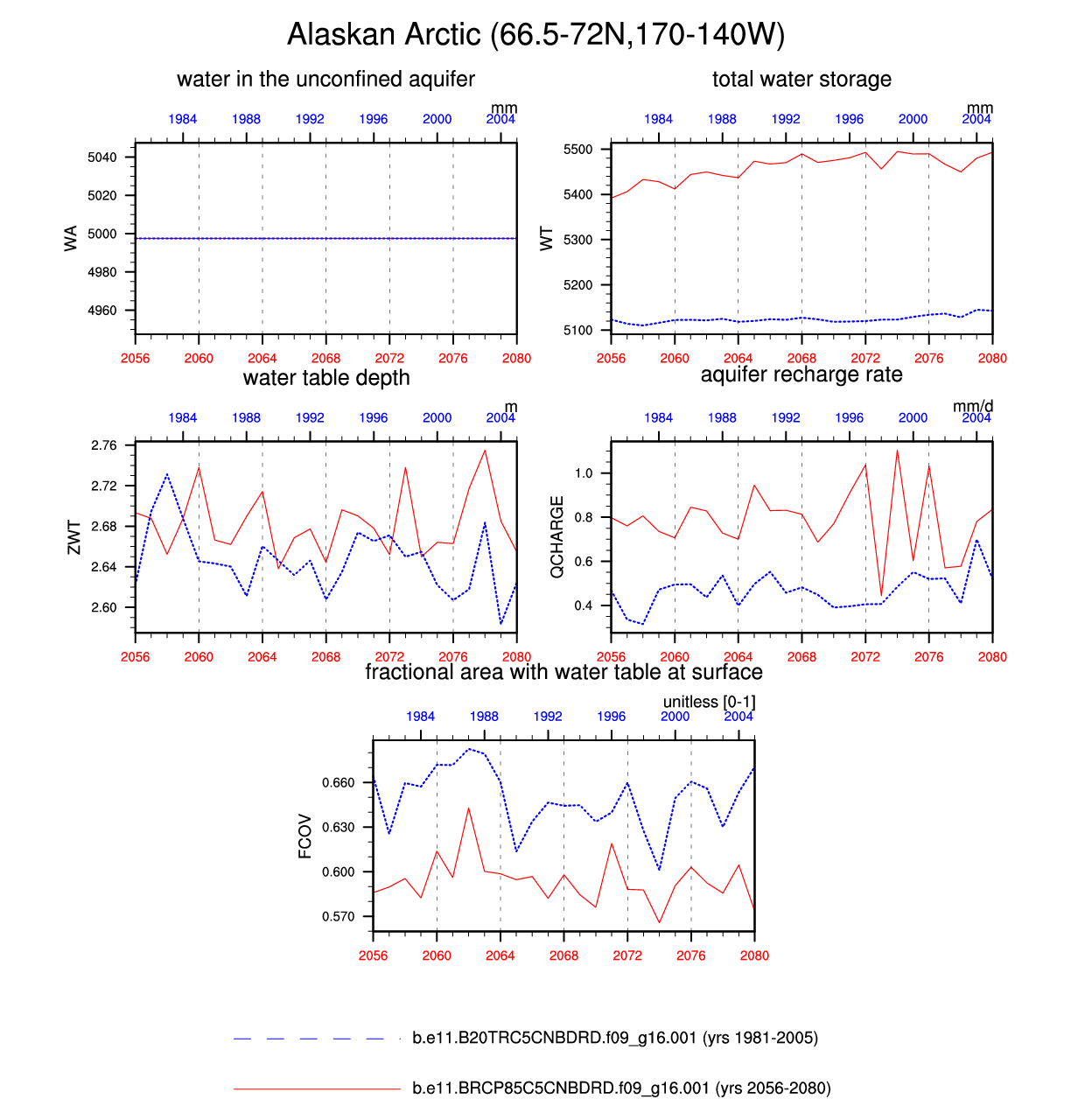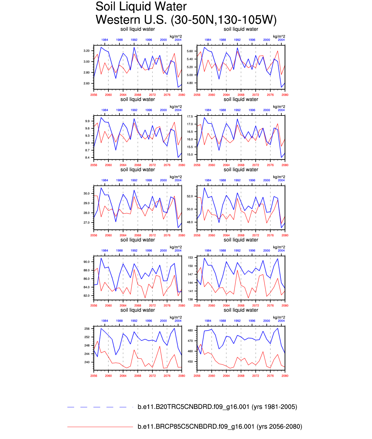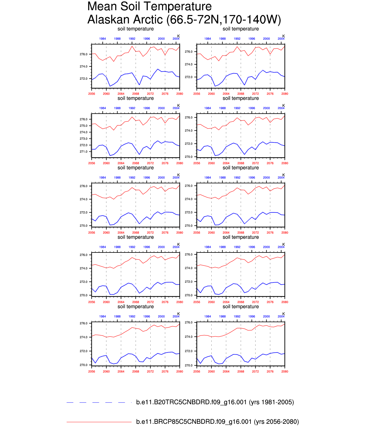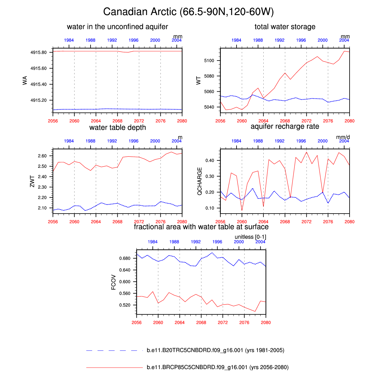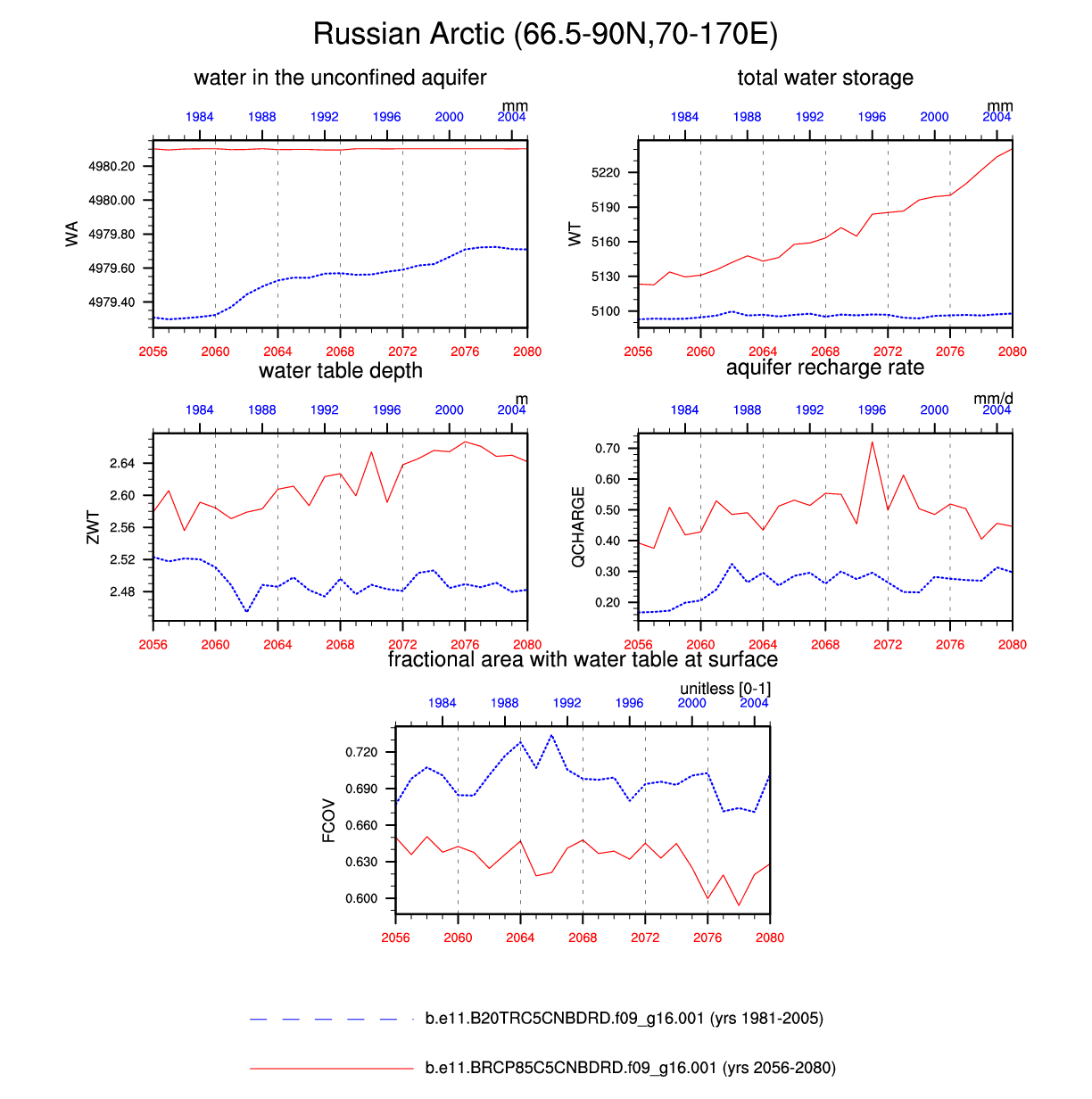 Set 6 Description: Line plots of annual trends in regional soil water/ice and temperature, runoff, snow water/ice, photosynthesis