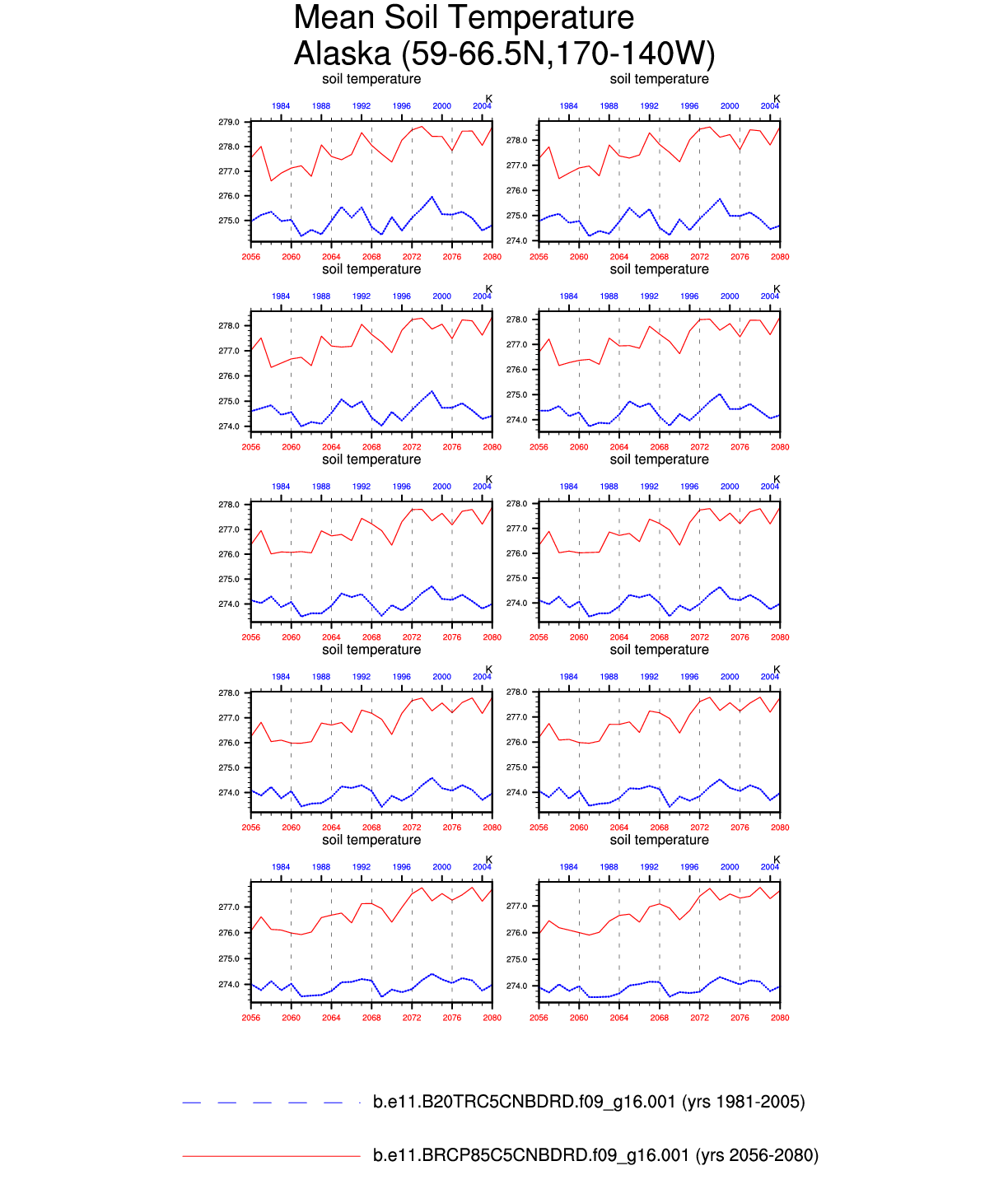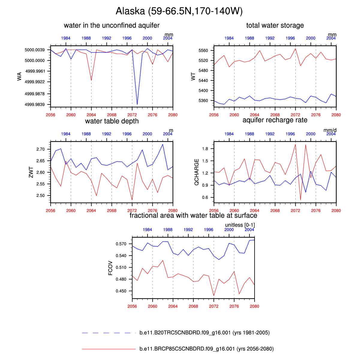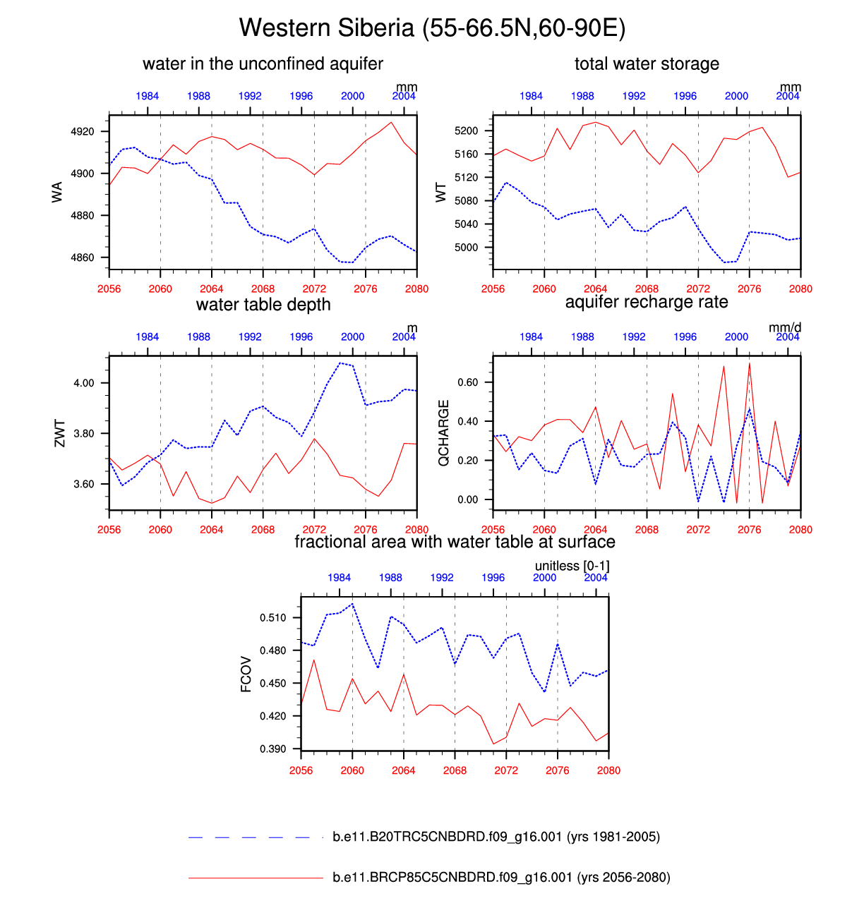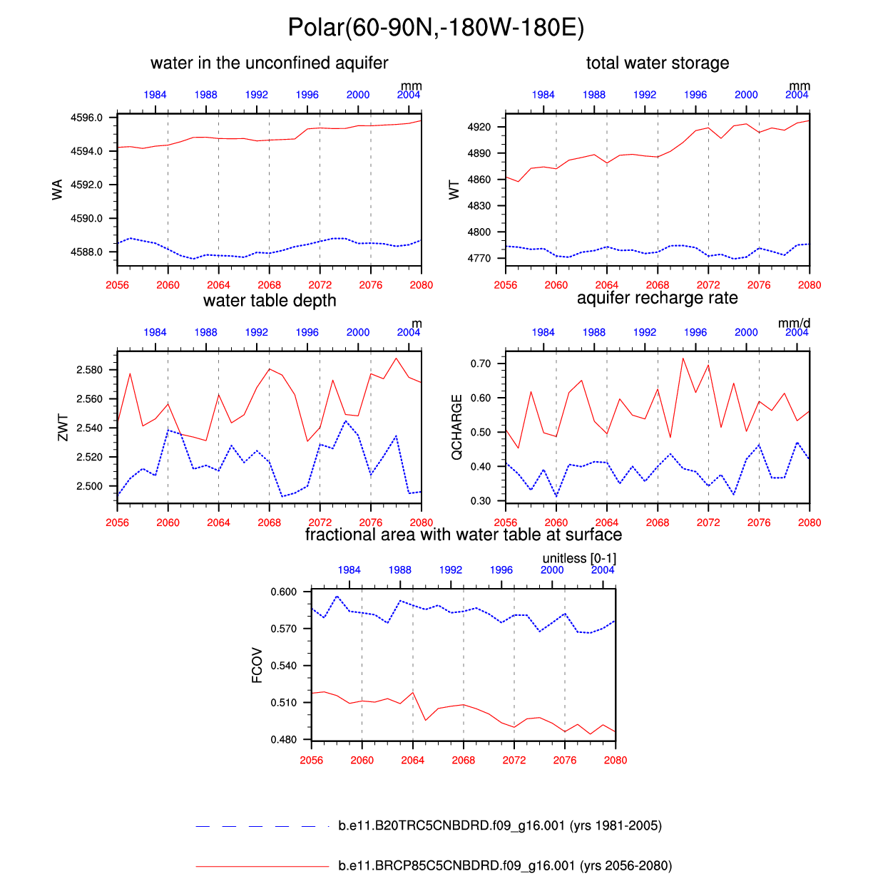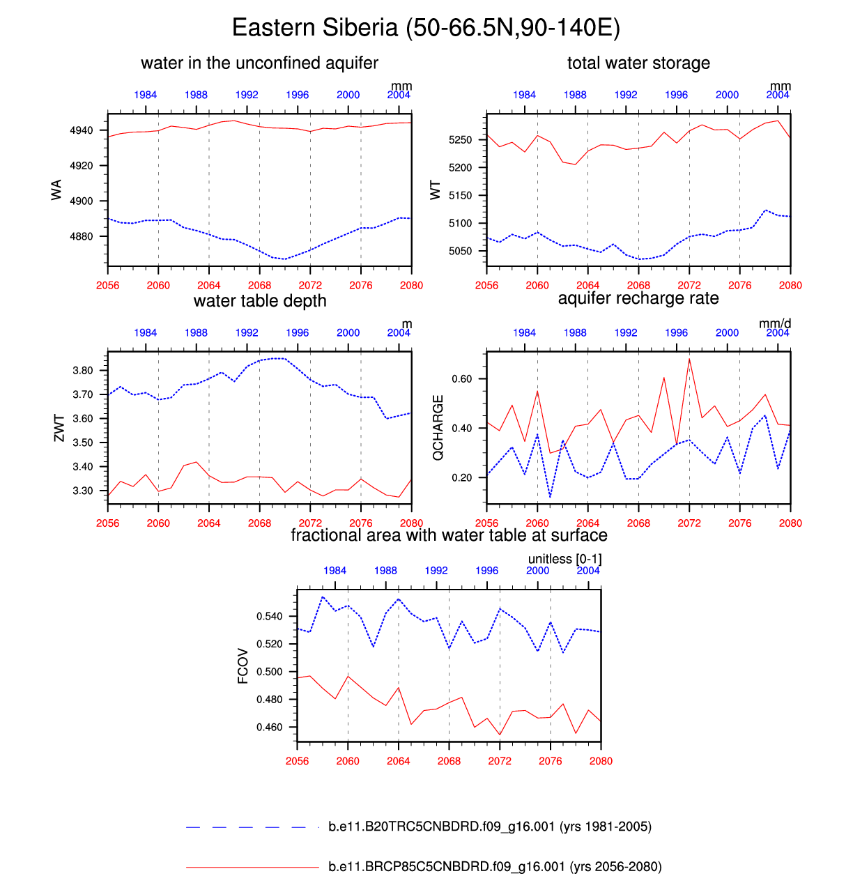 Set 6 Description: Line plots of annual trends in regional soil water/ice and temperature, runoff, snow water/ice, photosynthesis