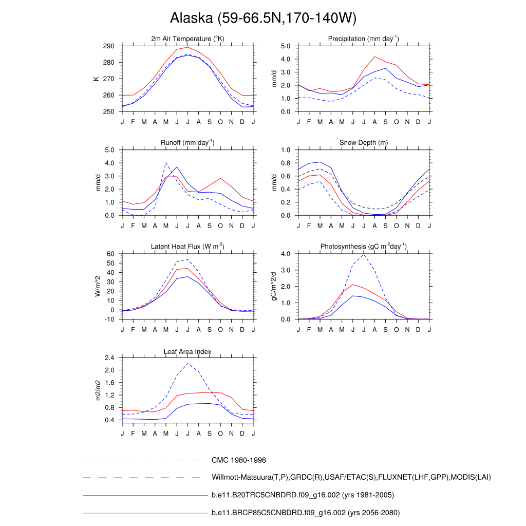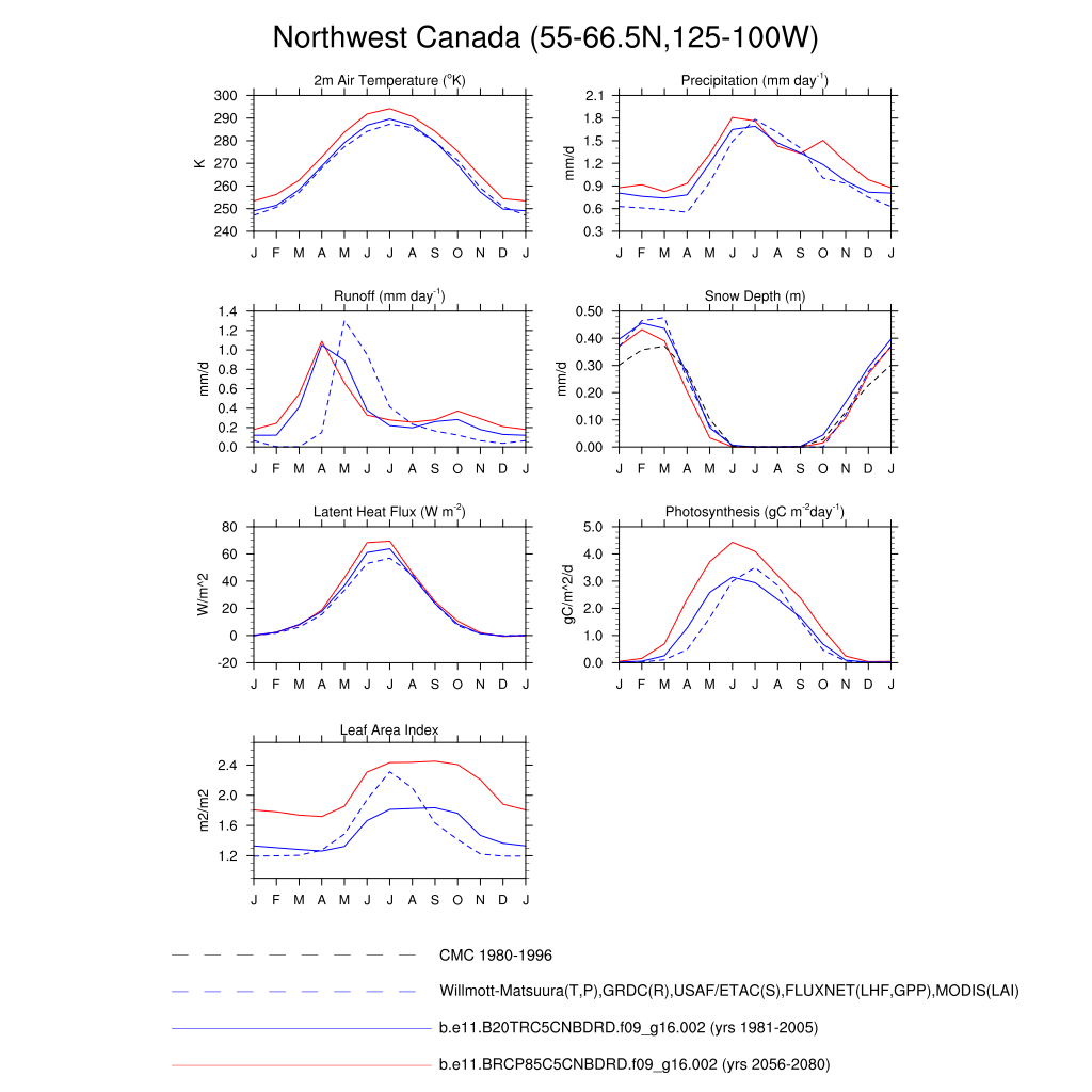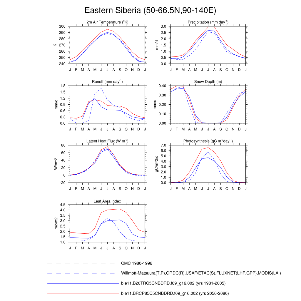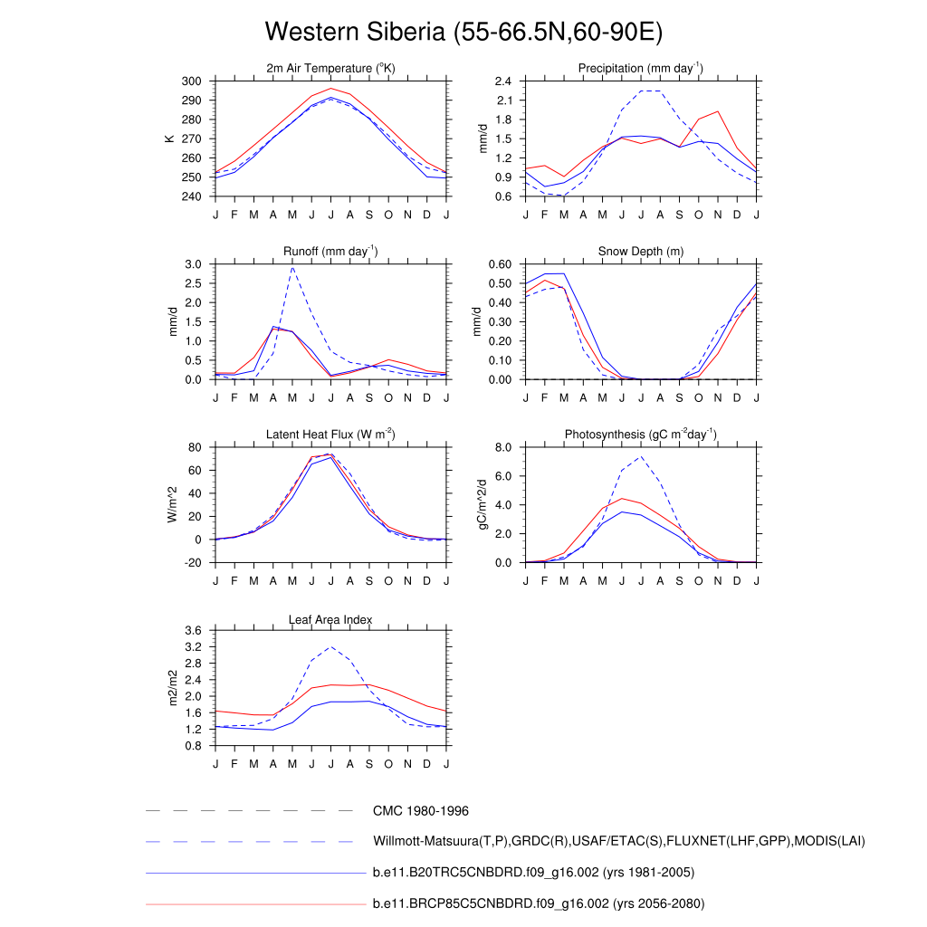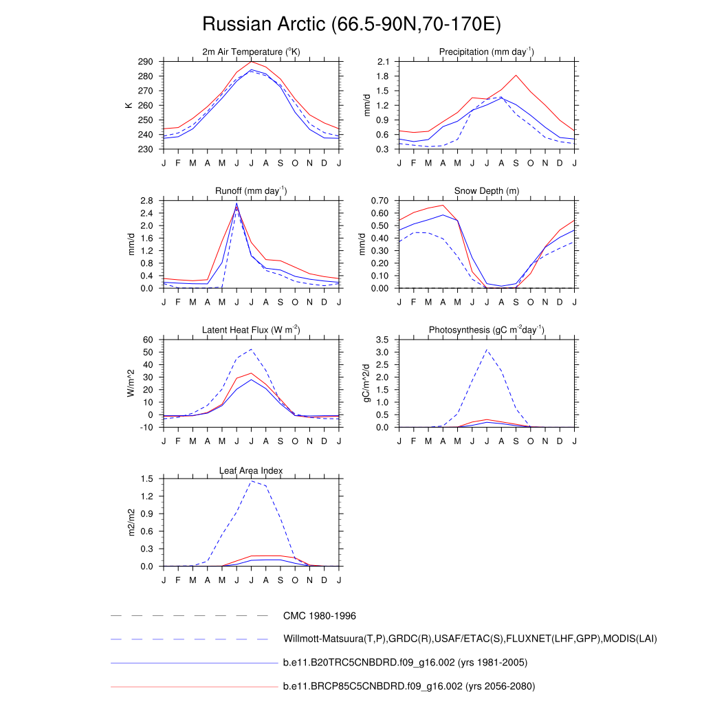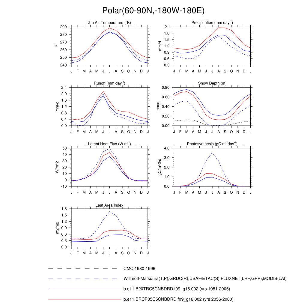 Set 3 Description: Line plots of monthly climatology: regional air temperature, precipitation, runoff, snow depth, radiative fluxes, and turbulent fluxes