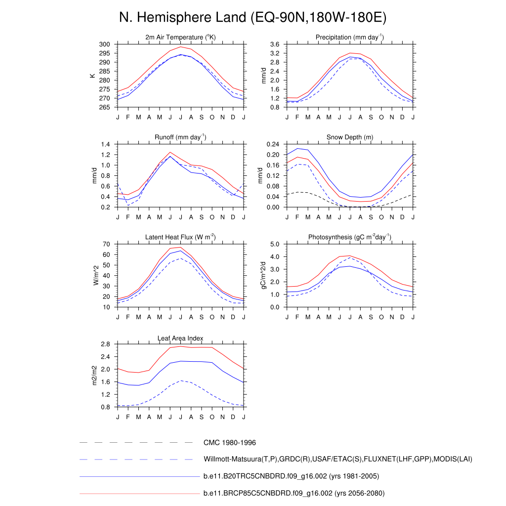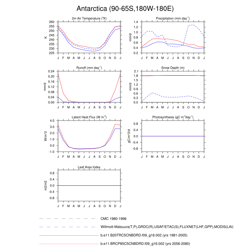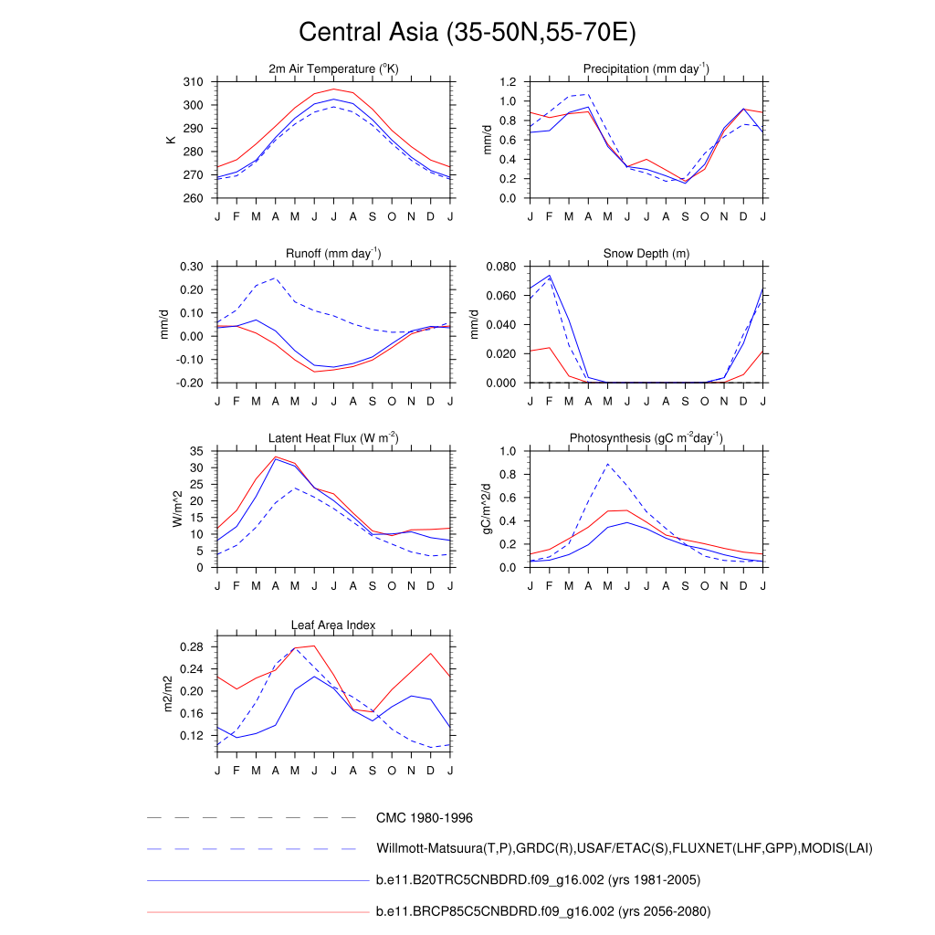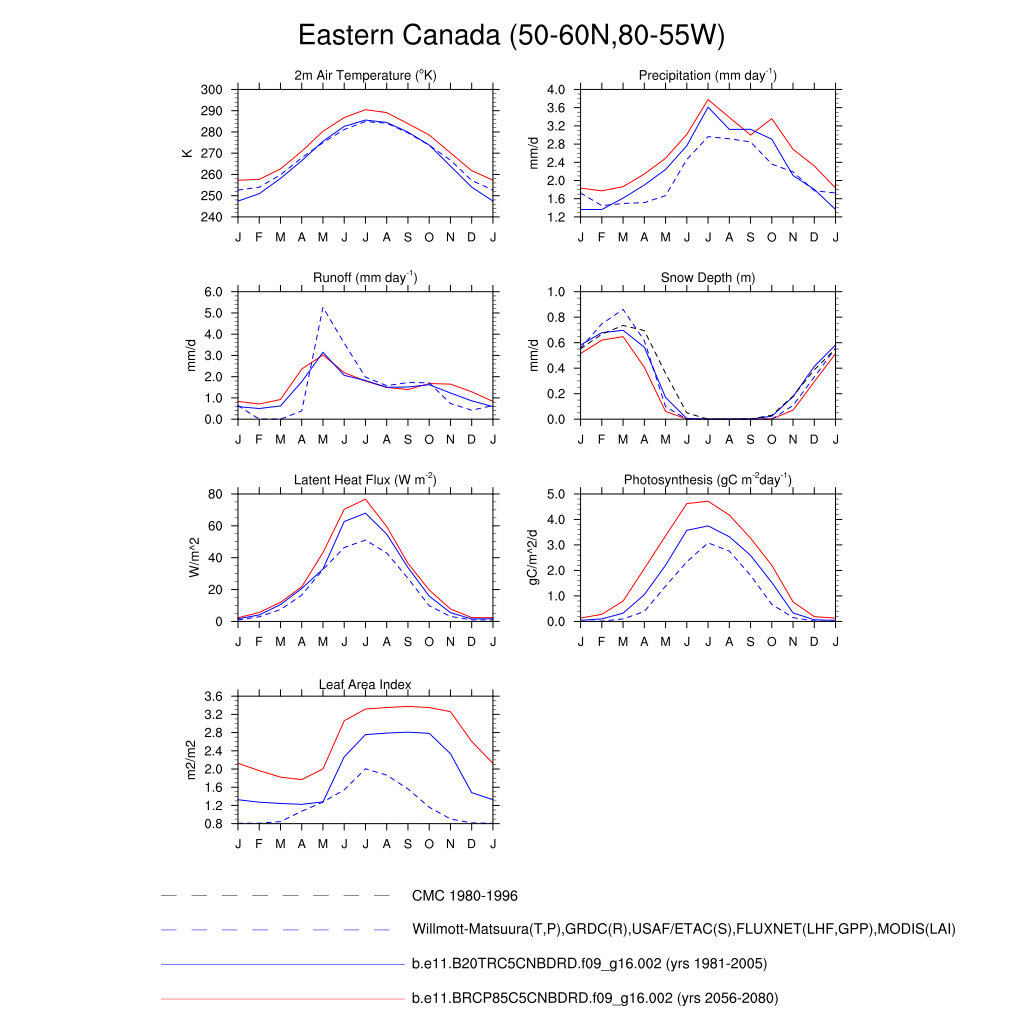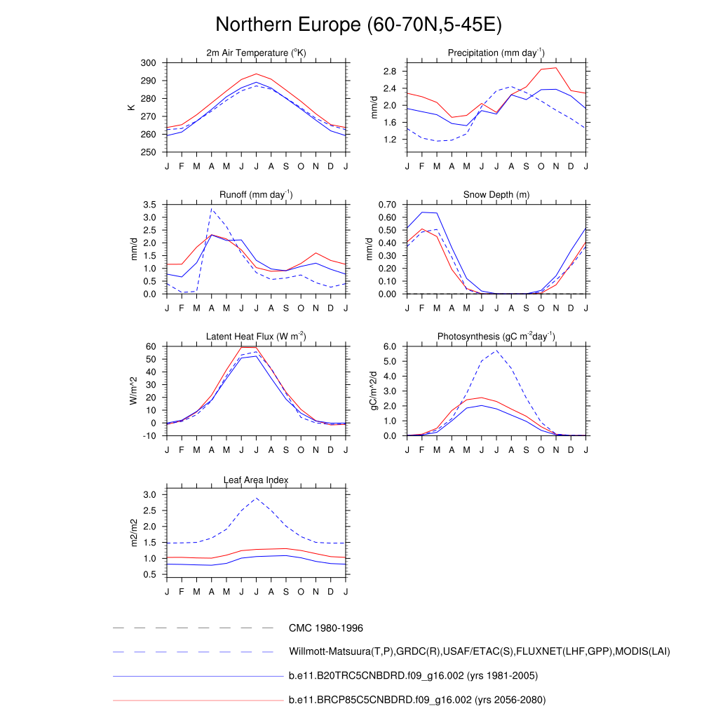 Set 3 Description: Line plots of monthly climatology: regional air temperature, precipitation, runoff, snow depth, radiative fluxes, and turbulent fluxes