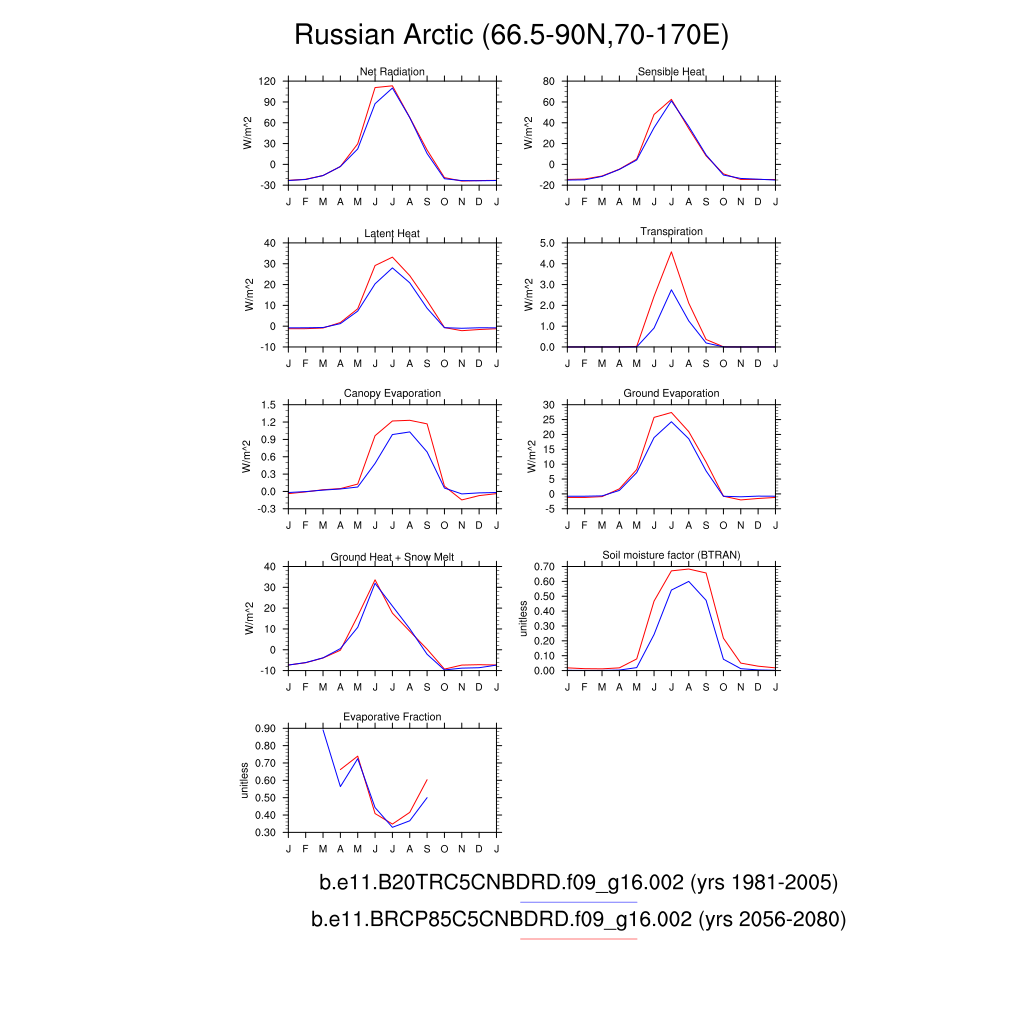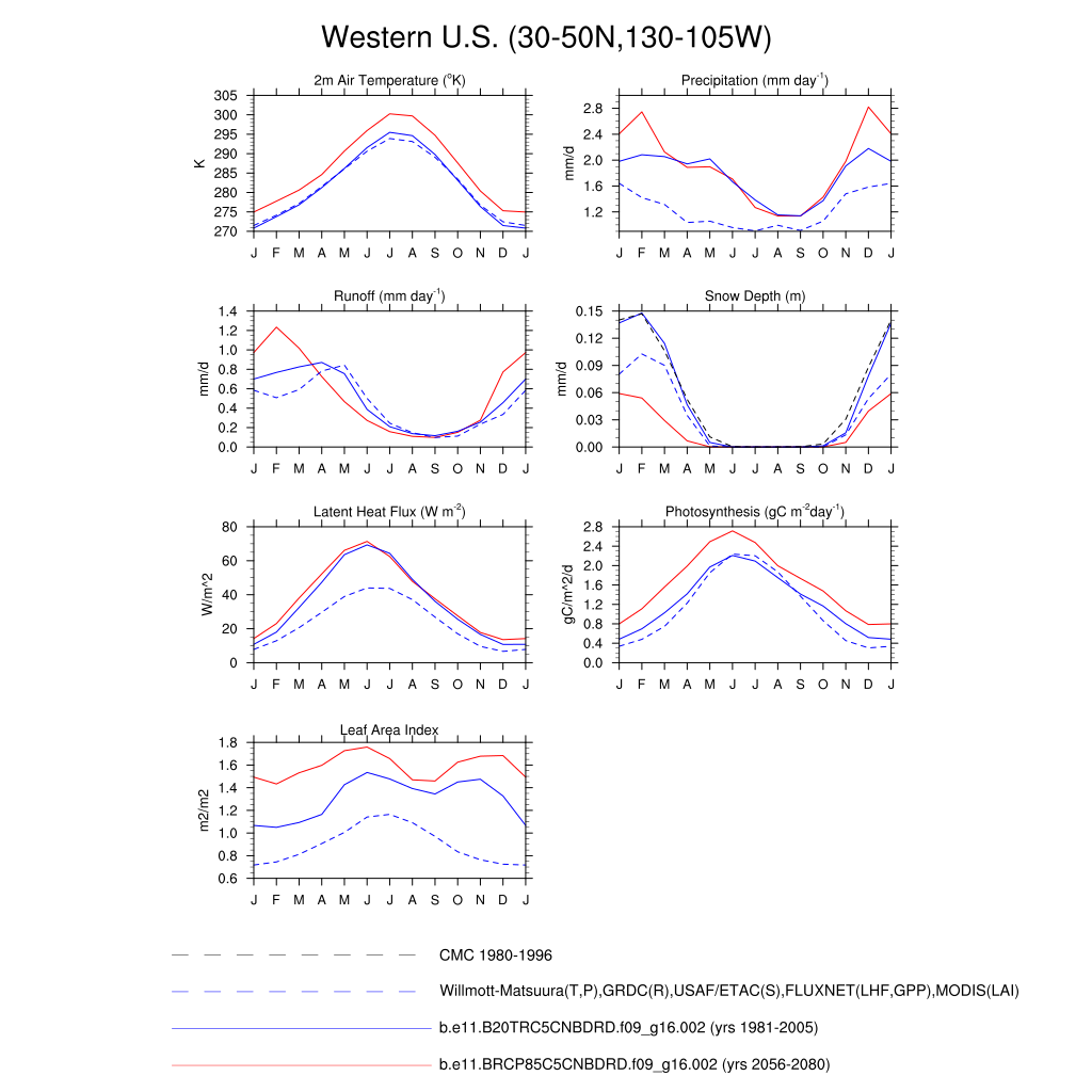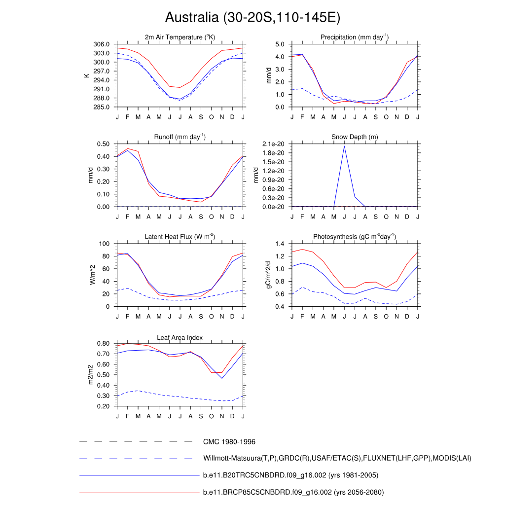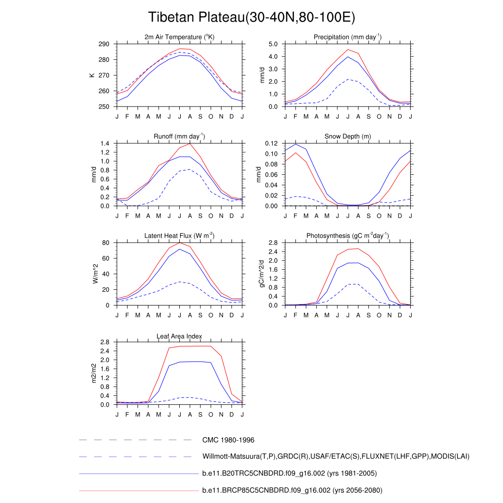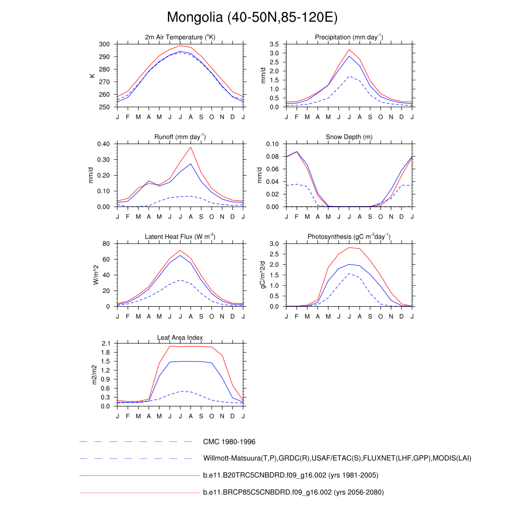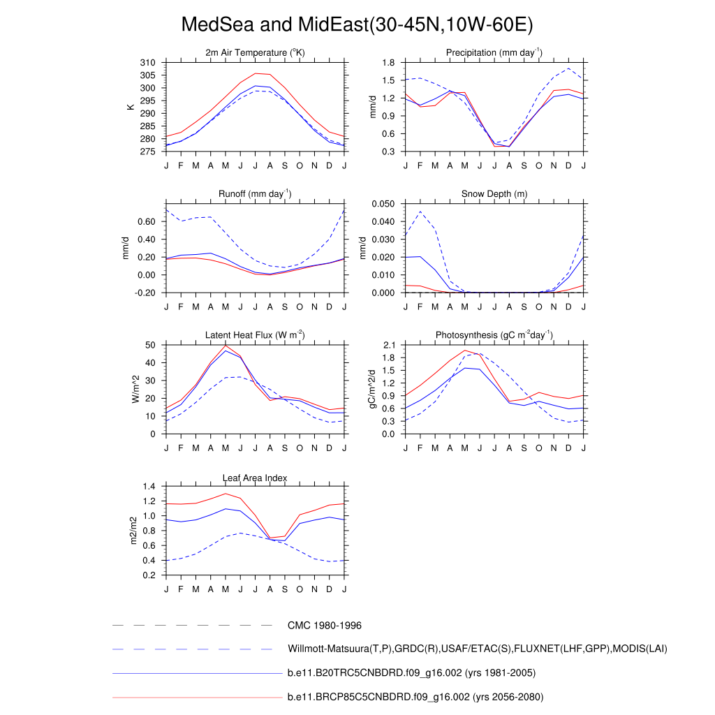 Set 3 Description: Line plots of monthly climatology: regional air temperature, precipitation, runoff, snow depth, radiative fluxes, and turbulent fluxes