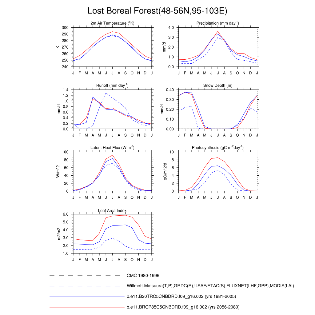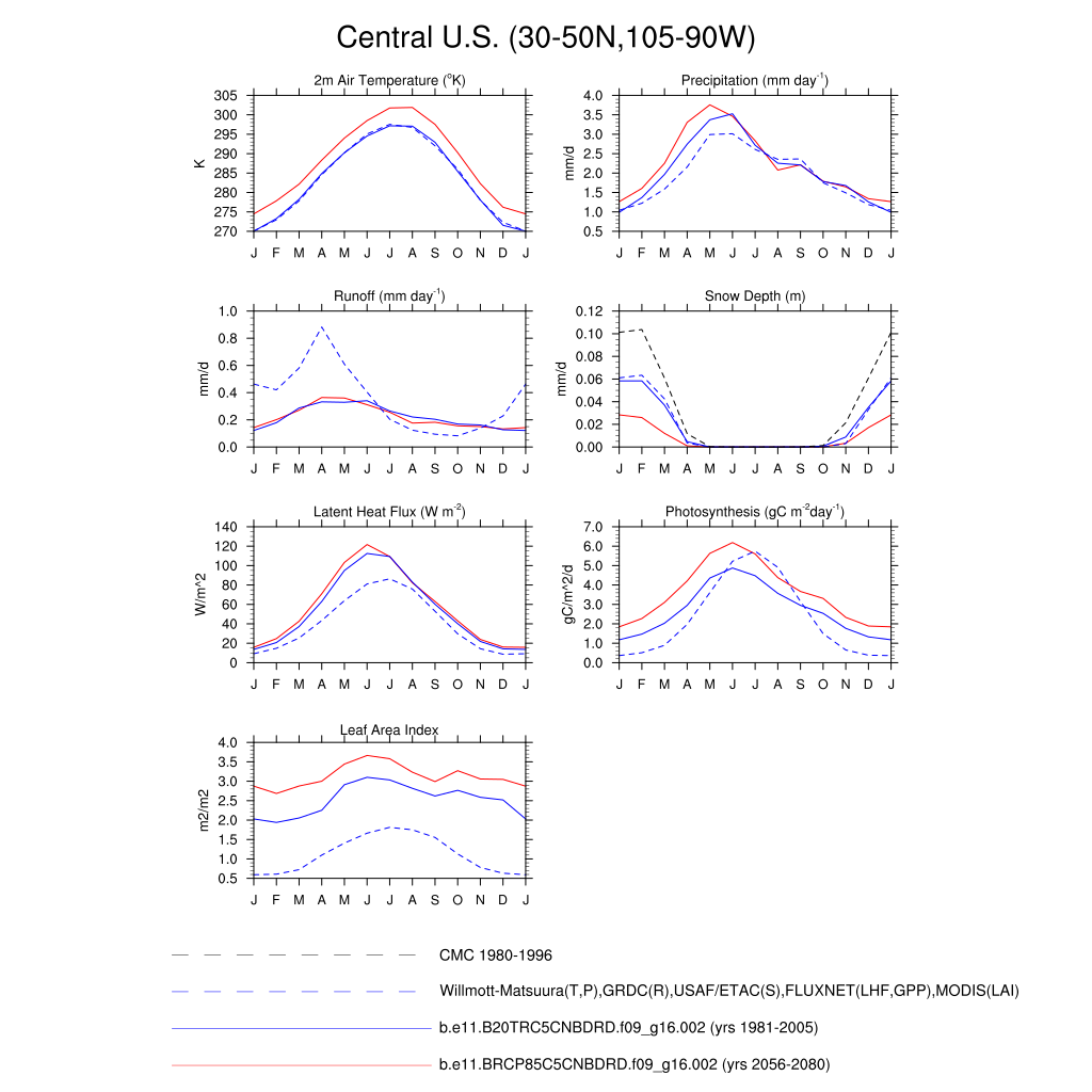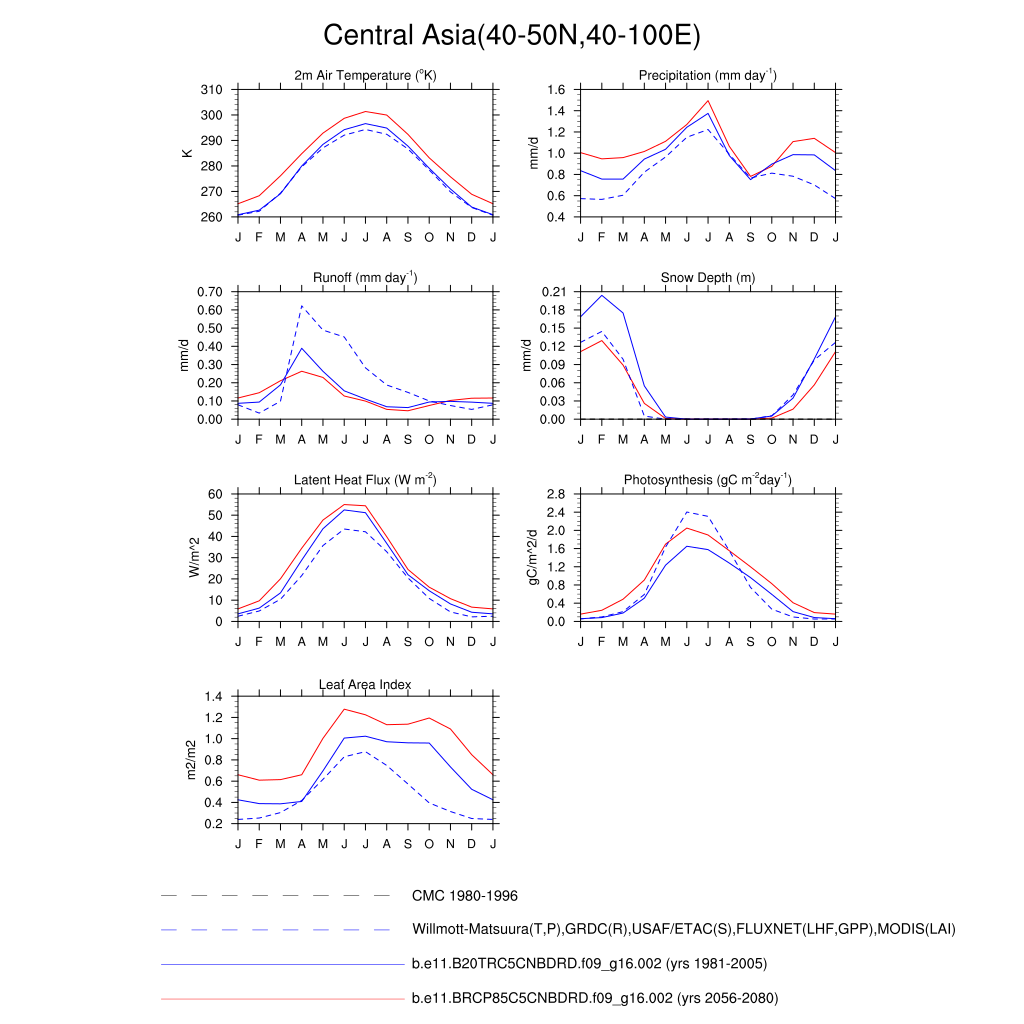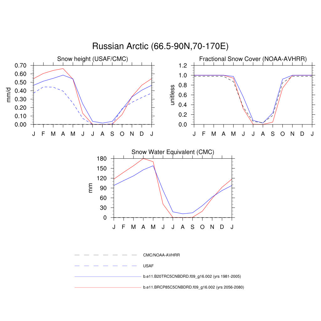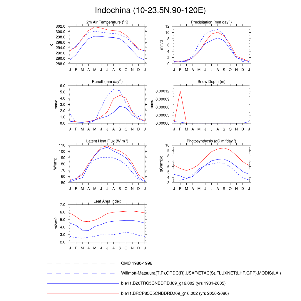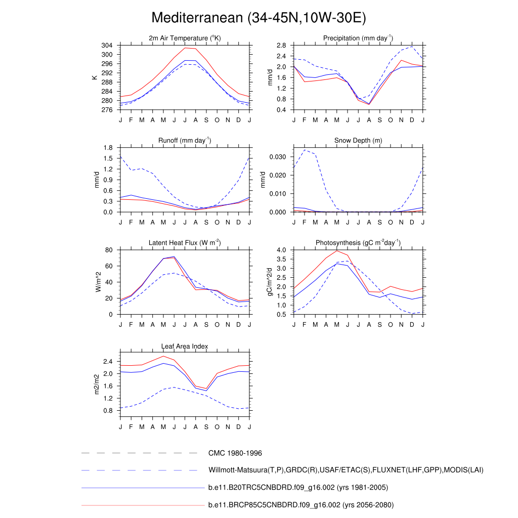 Set 3 Description: Line plots of monthly climatology: regional air temperature, precipitation, runoff, snow depth, radiative fluxes, and turbulent fluxes