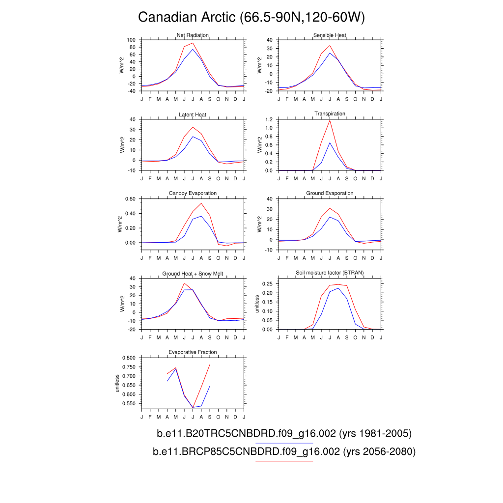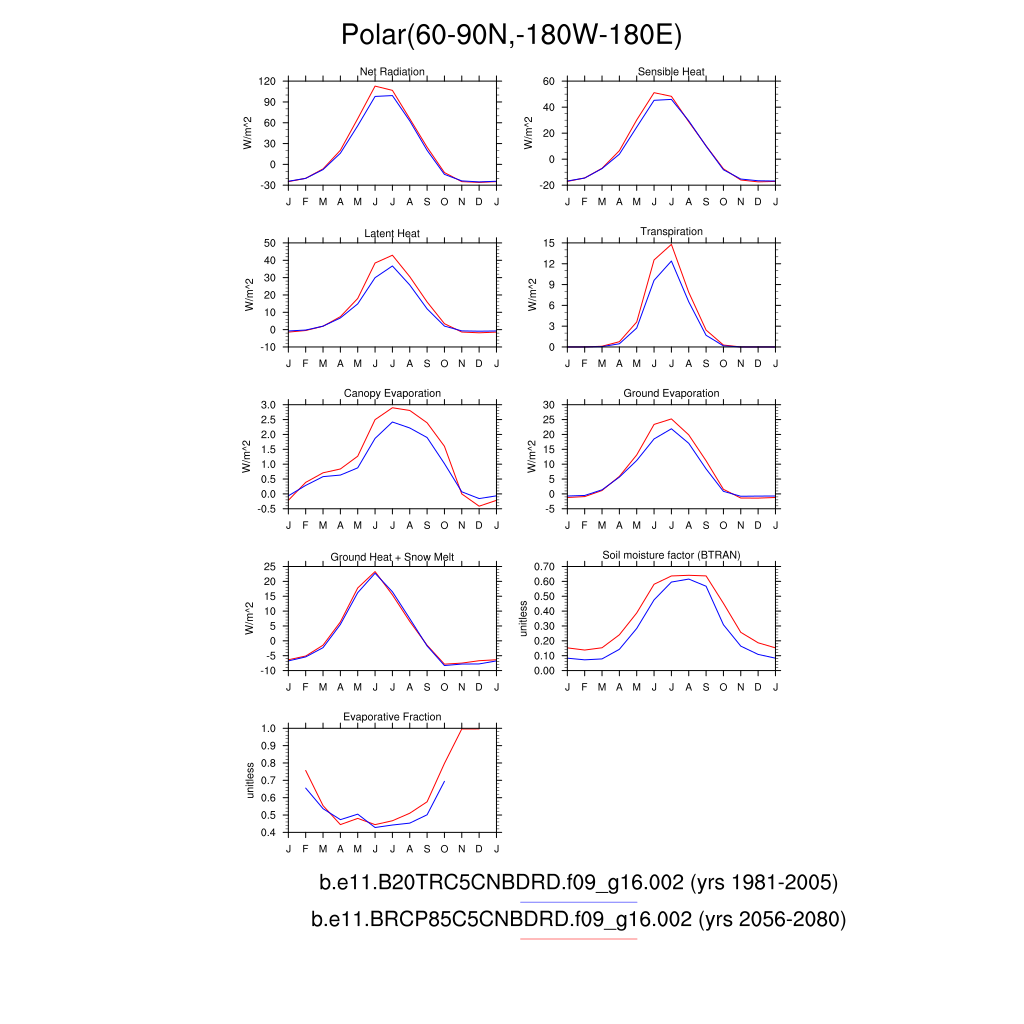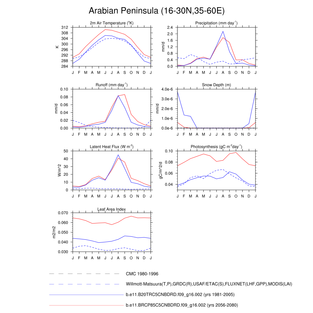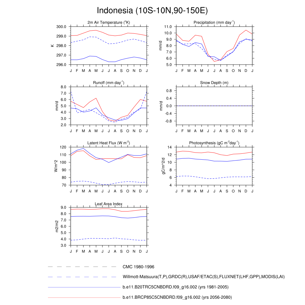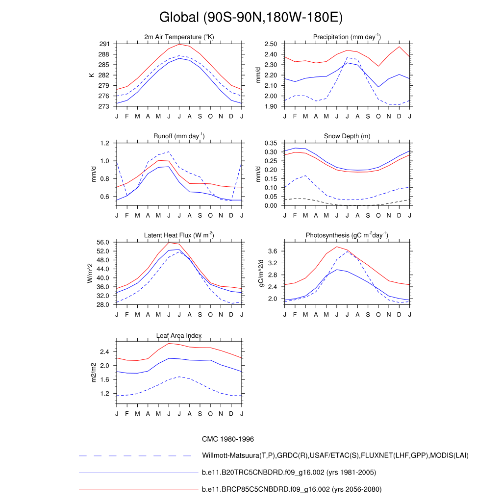 Set 3 Description: Line plots of monthly climatology: regional air temperature, precipitation, runoff, snow depth, radiative fluxes, and turbulent fluxes