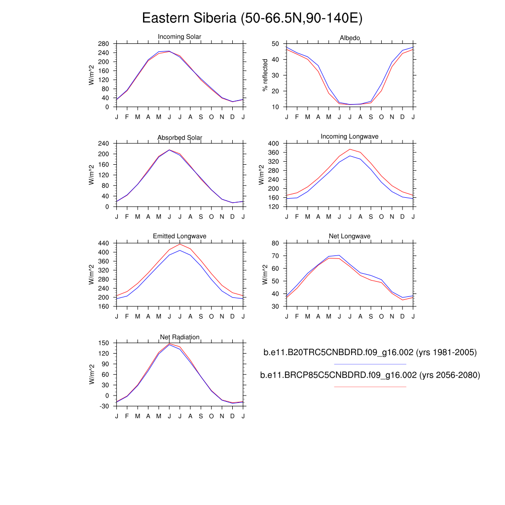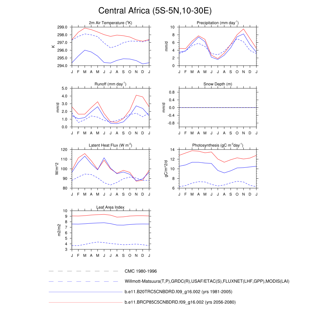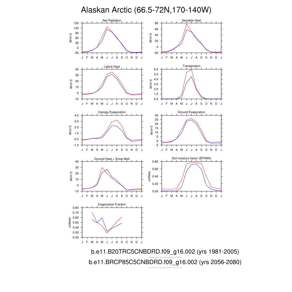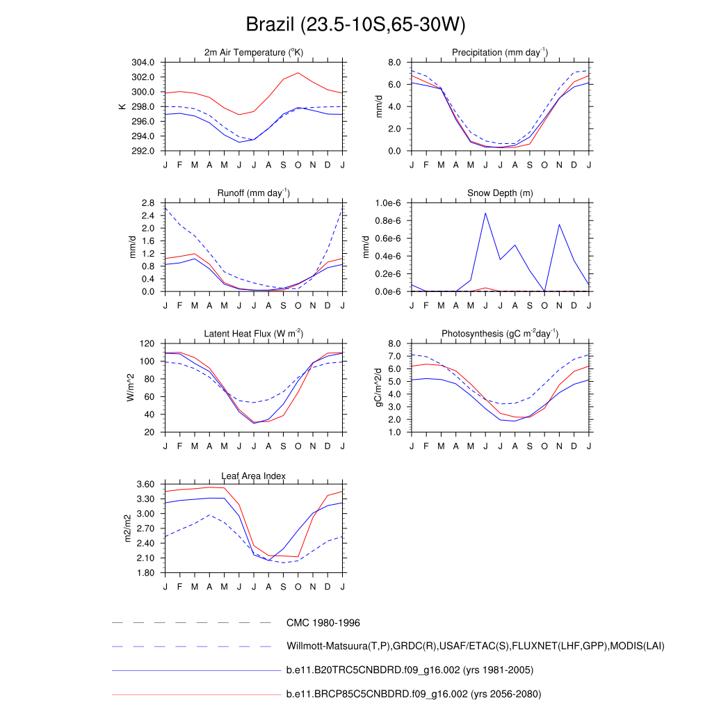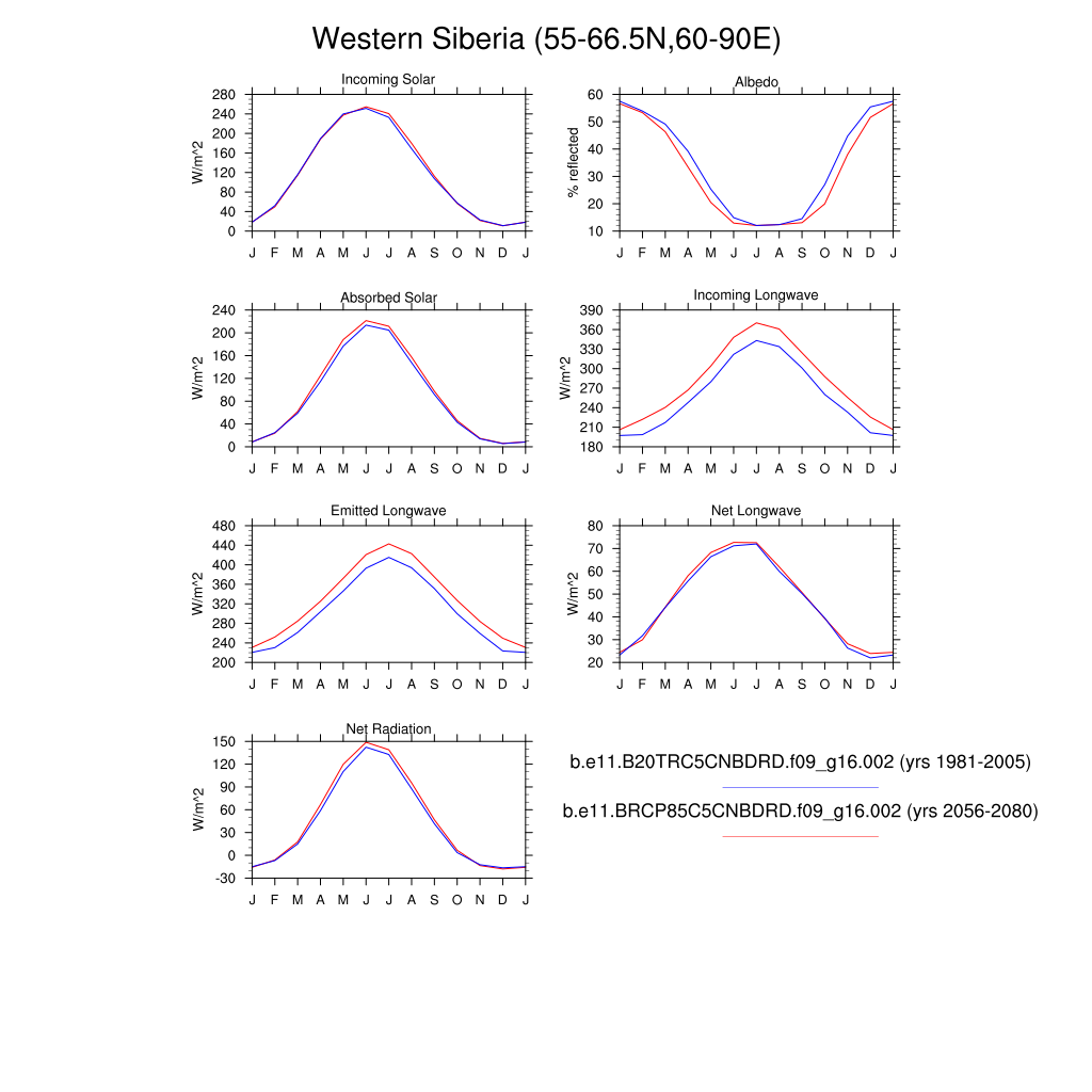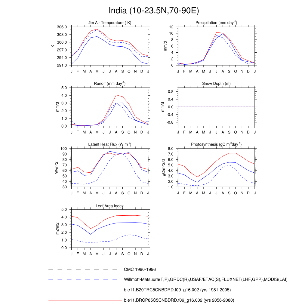Set 3 Description: Line plots of monthly climatology: regional air temperature, precipitation, runoff, snow depth, radiative fluxes, and turbulent fluxes