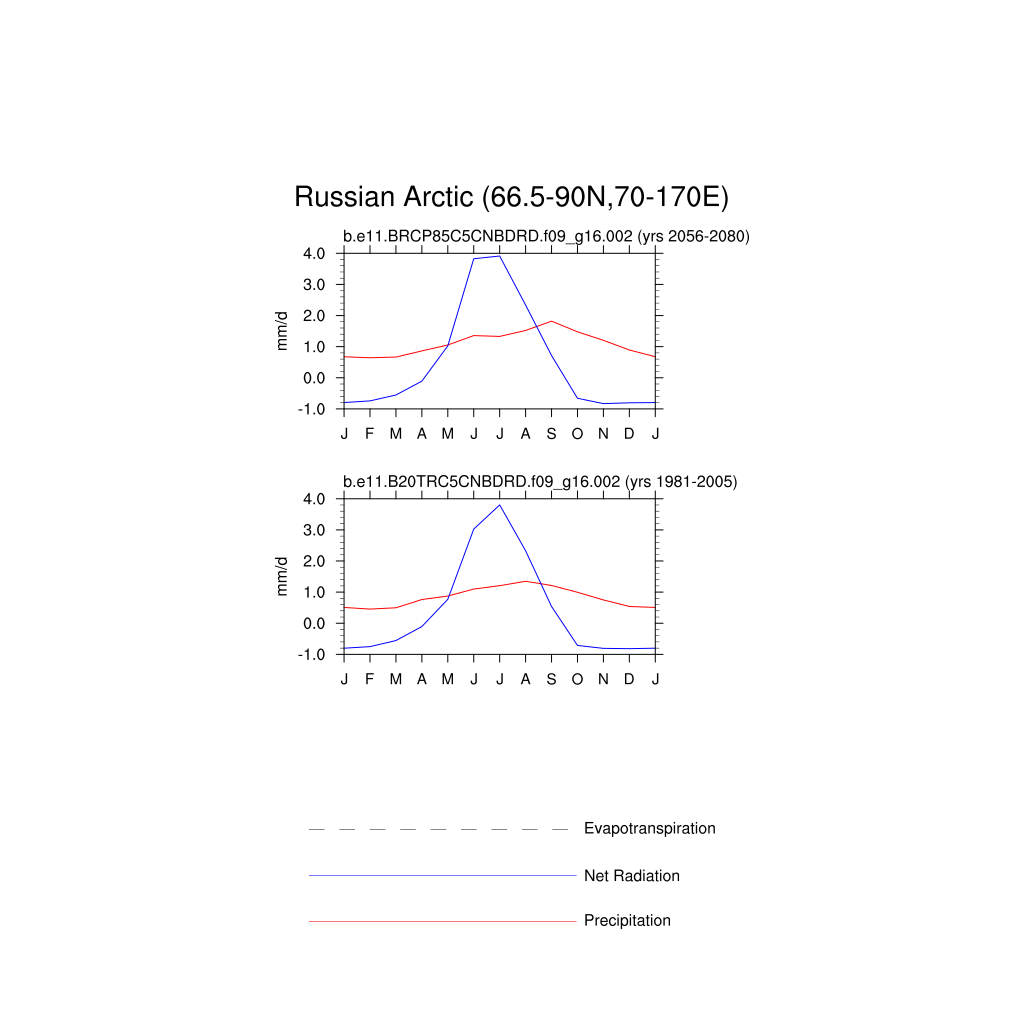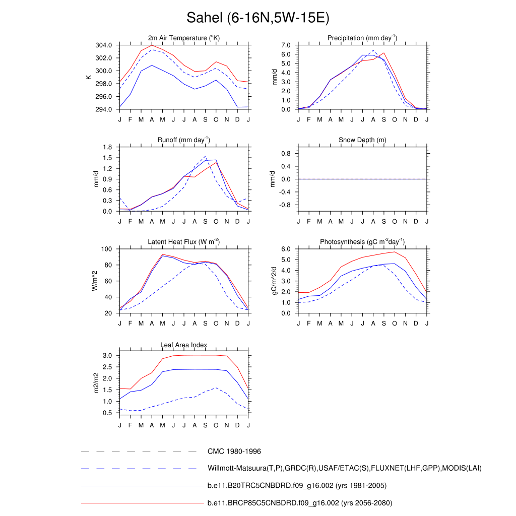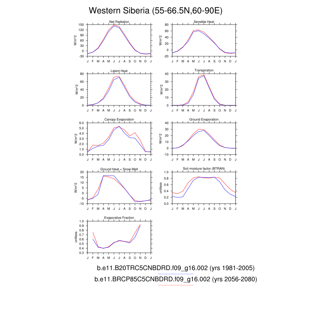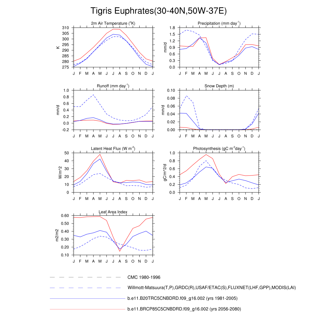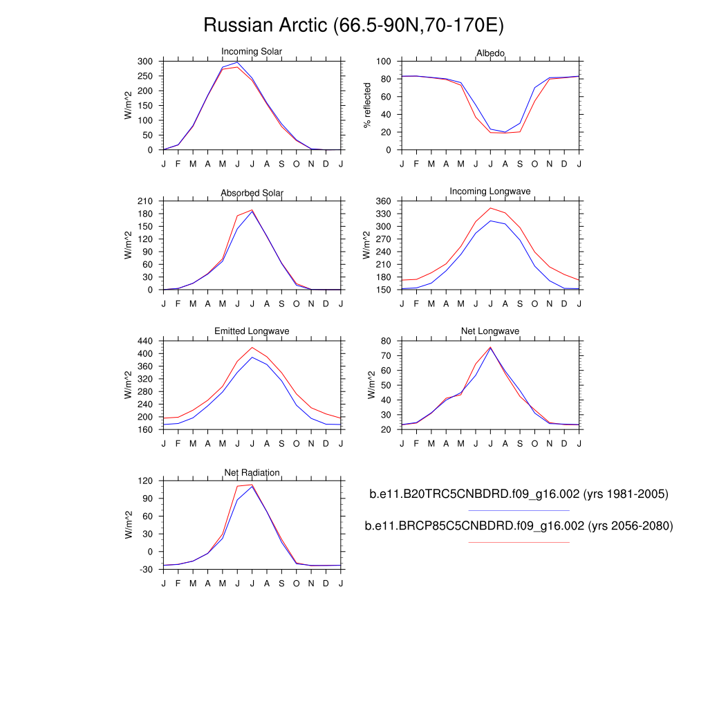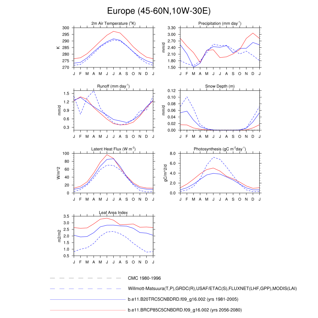 Set 3 Description: Line plots of monthly climatology: regional air temperature, precipitation, runoff, snow depth, radiative fluxes, and turbulent fluxes