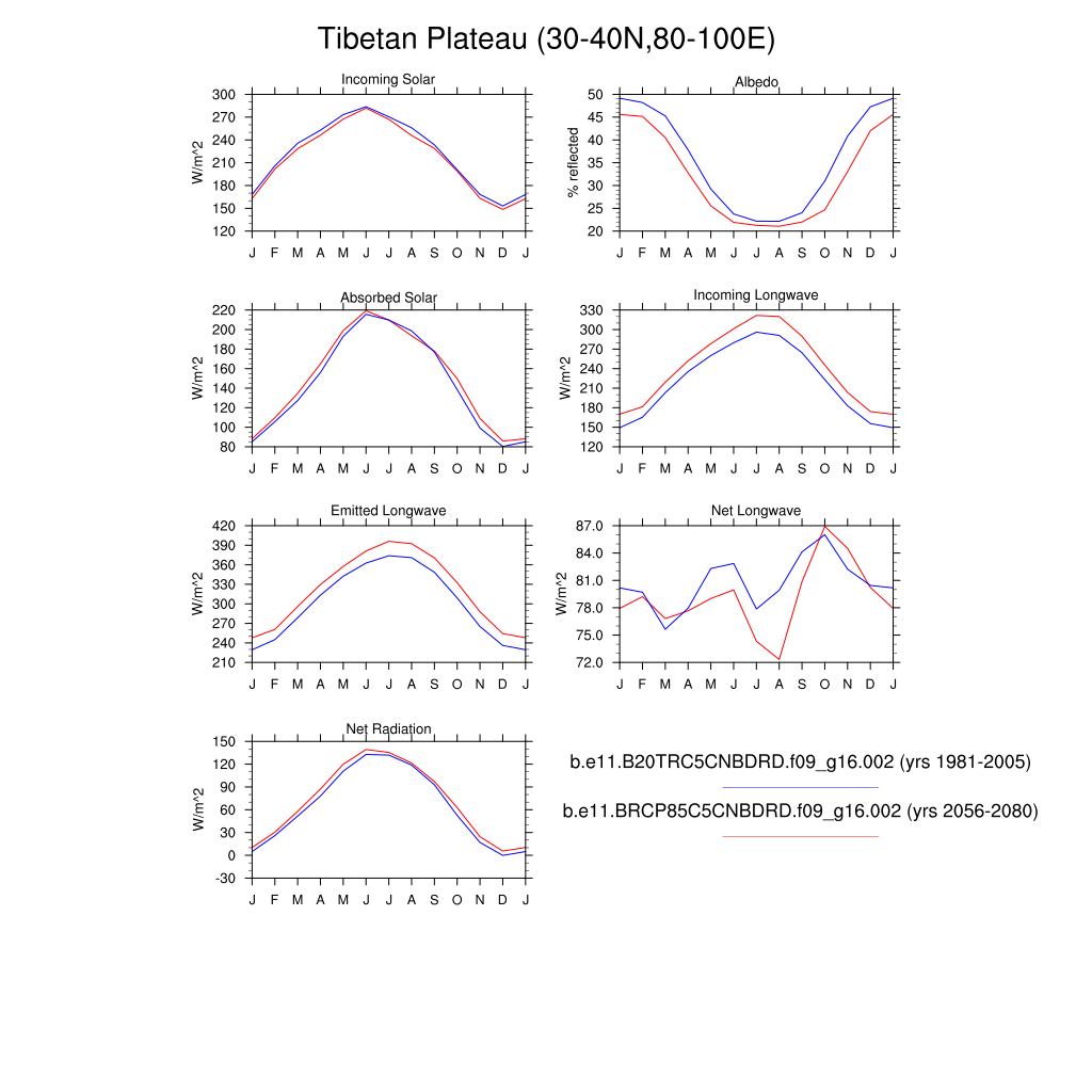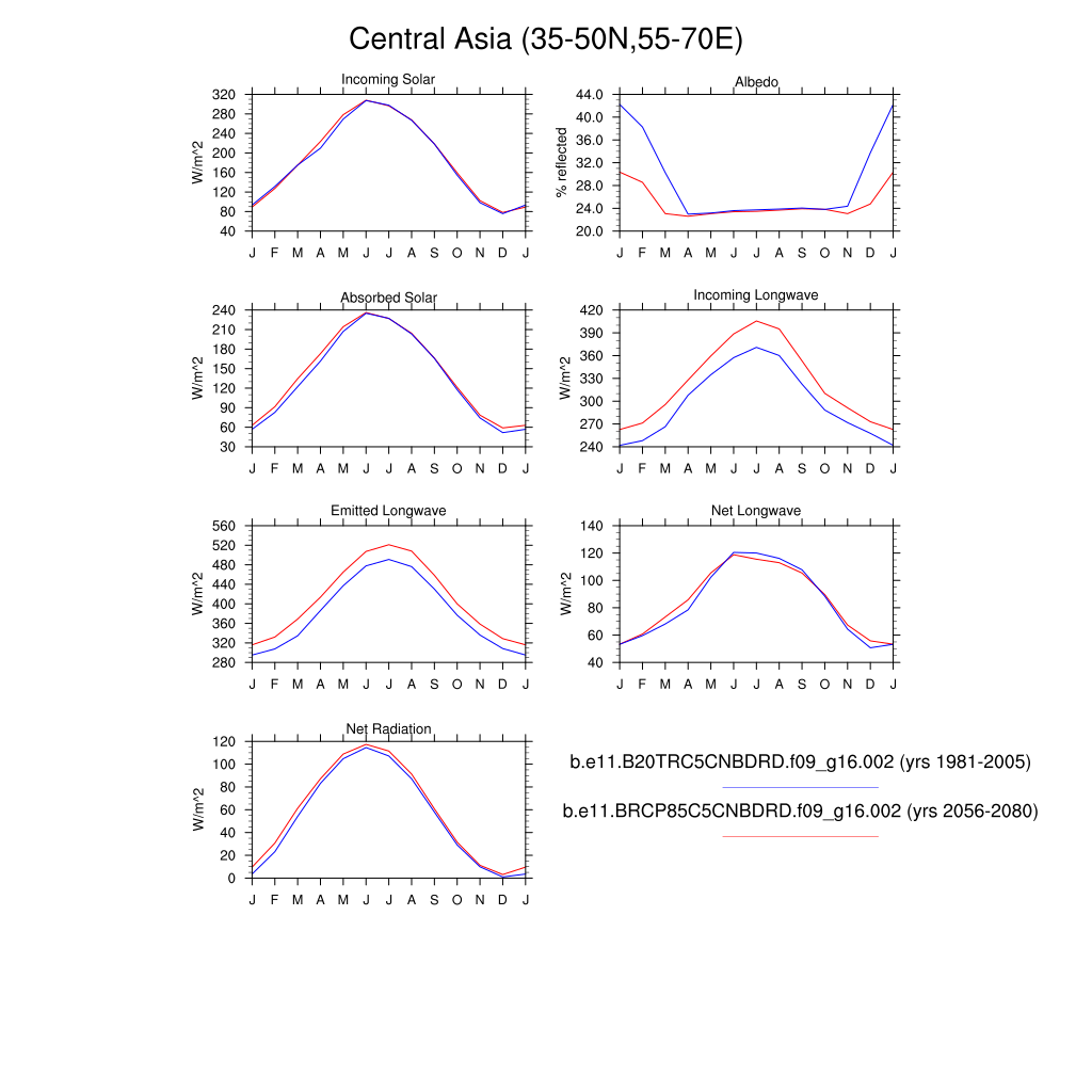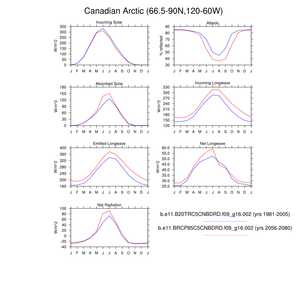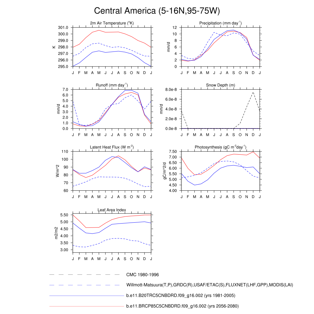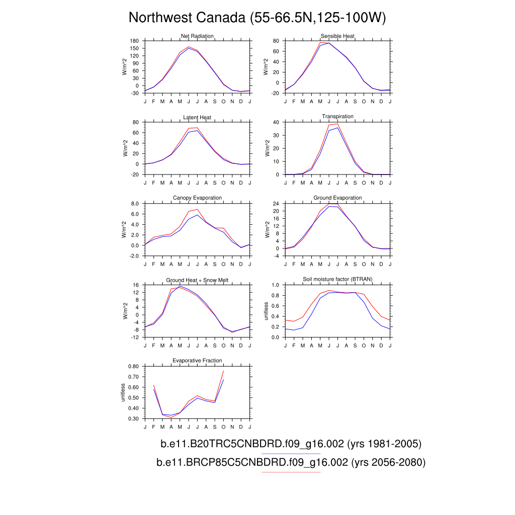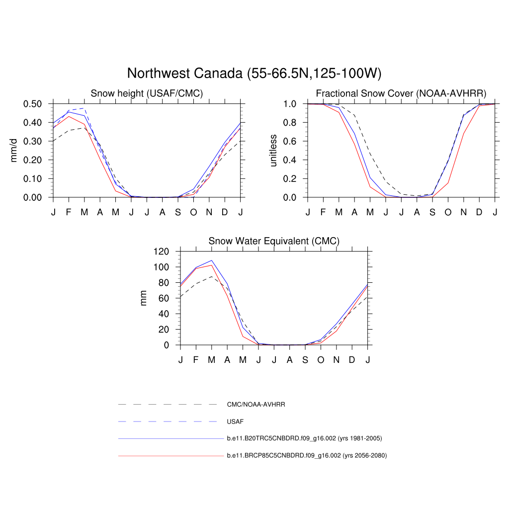 Set 3 Description: Line plots of monthly climatology: regional air temperature, precipitation, runoff, snow depth, radiative fluxes, and turbulent fluxes
