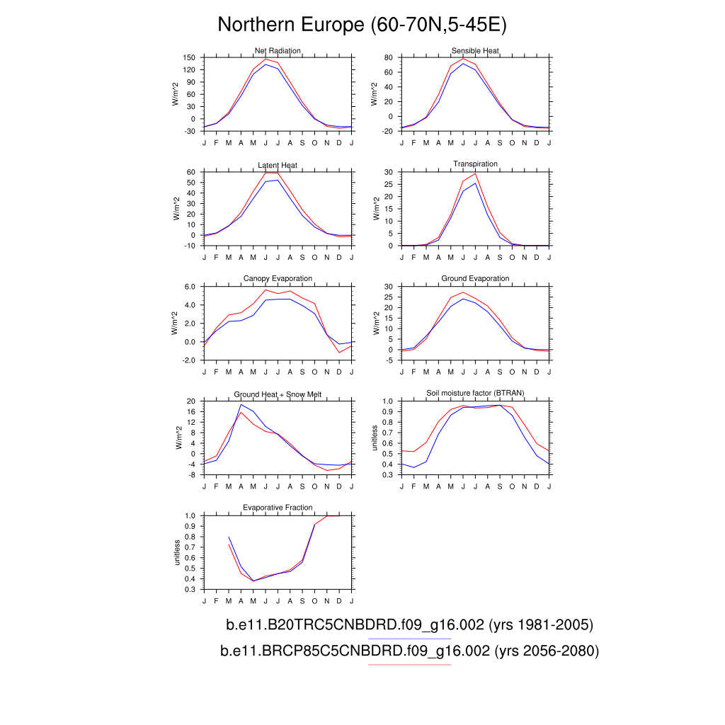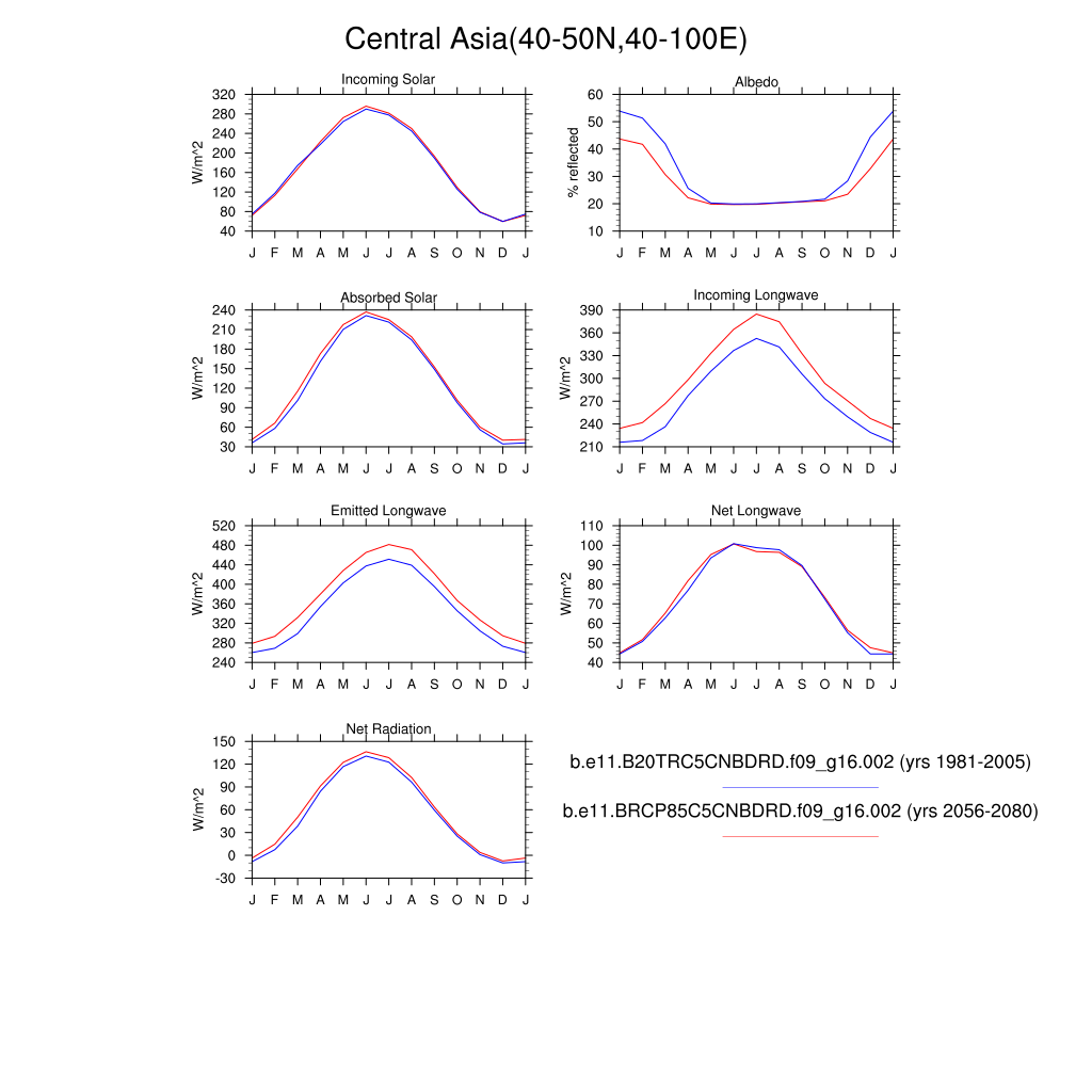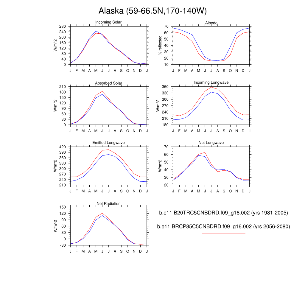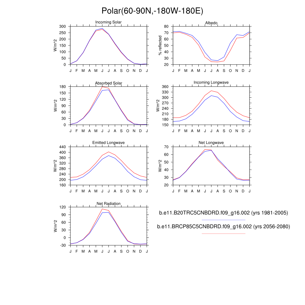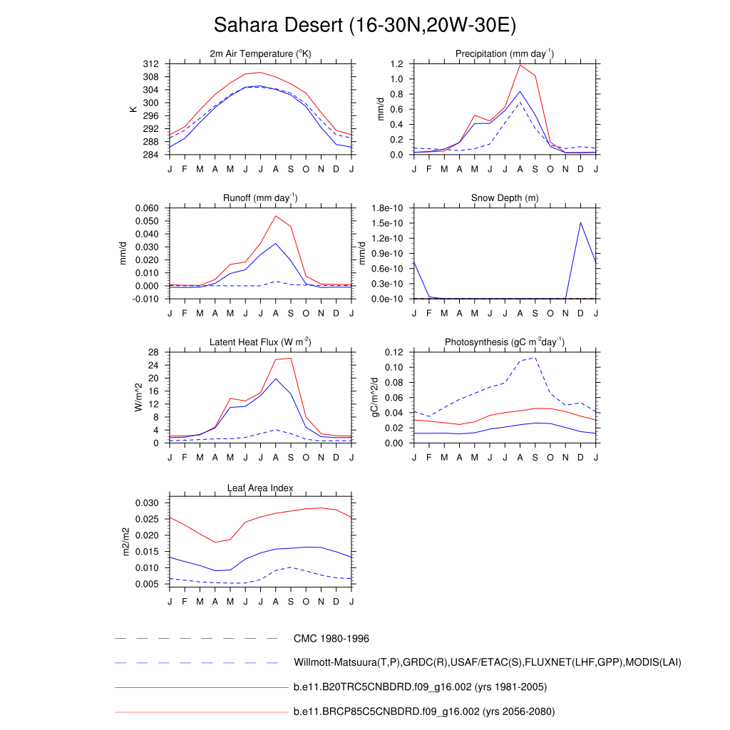 Set 3 Description: Line plots of monthly climatology: regional air temperature, precipitation, runoff, snow depth, radiative fluxes, and turbulent fluxes