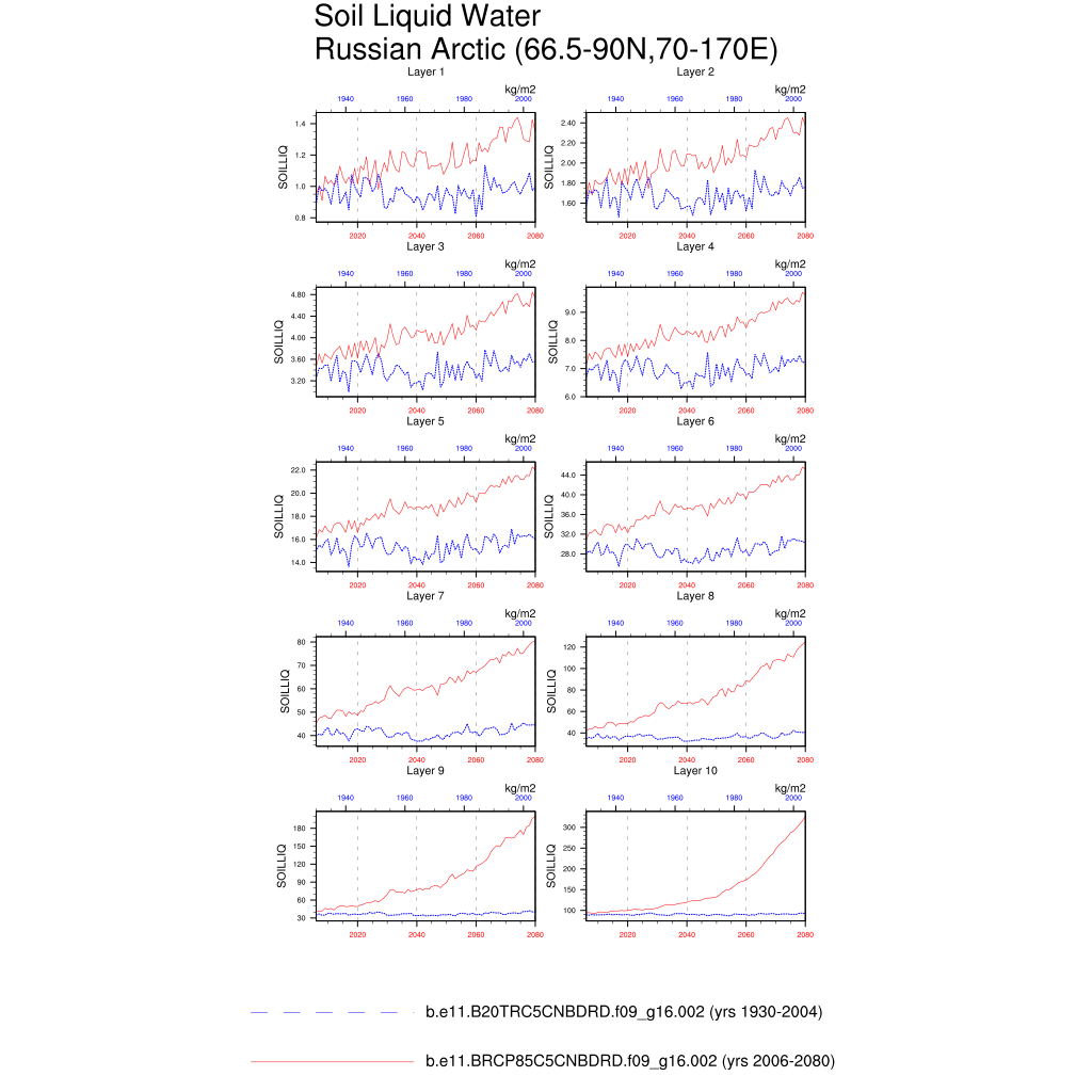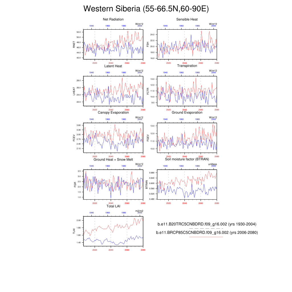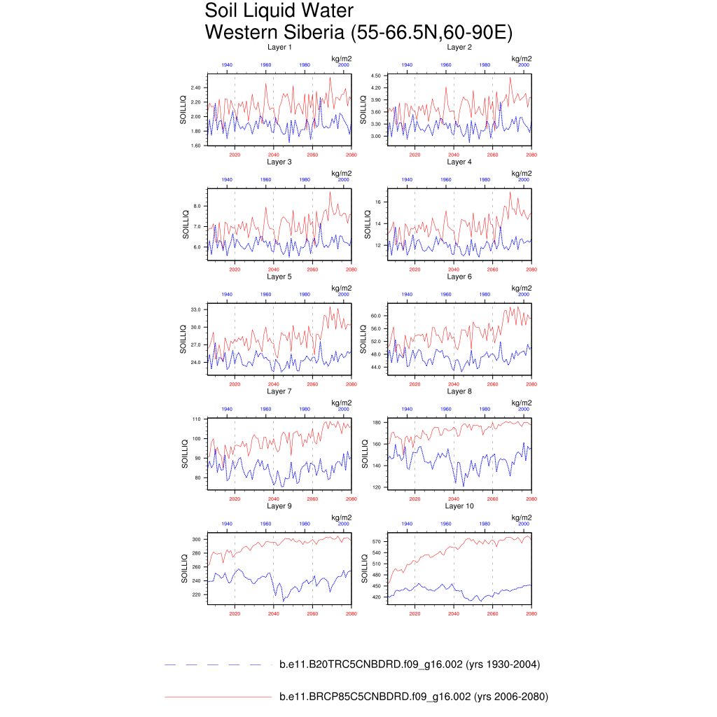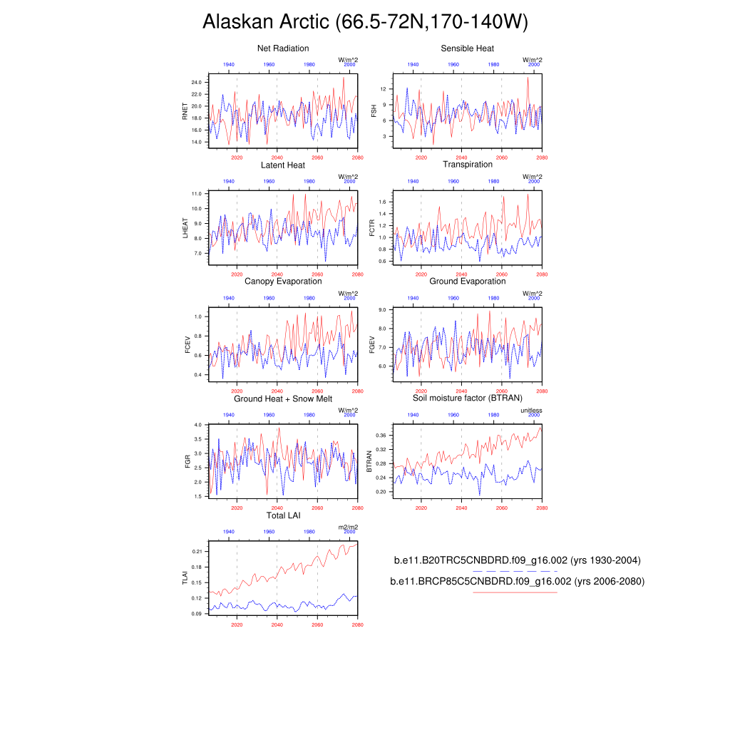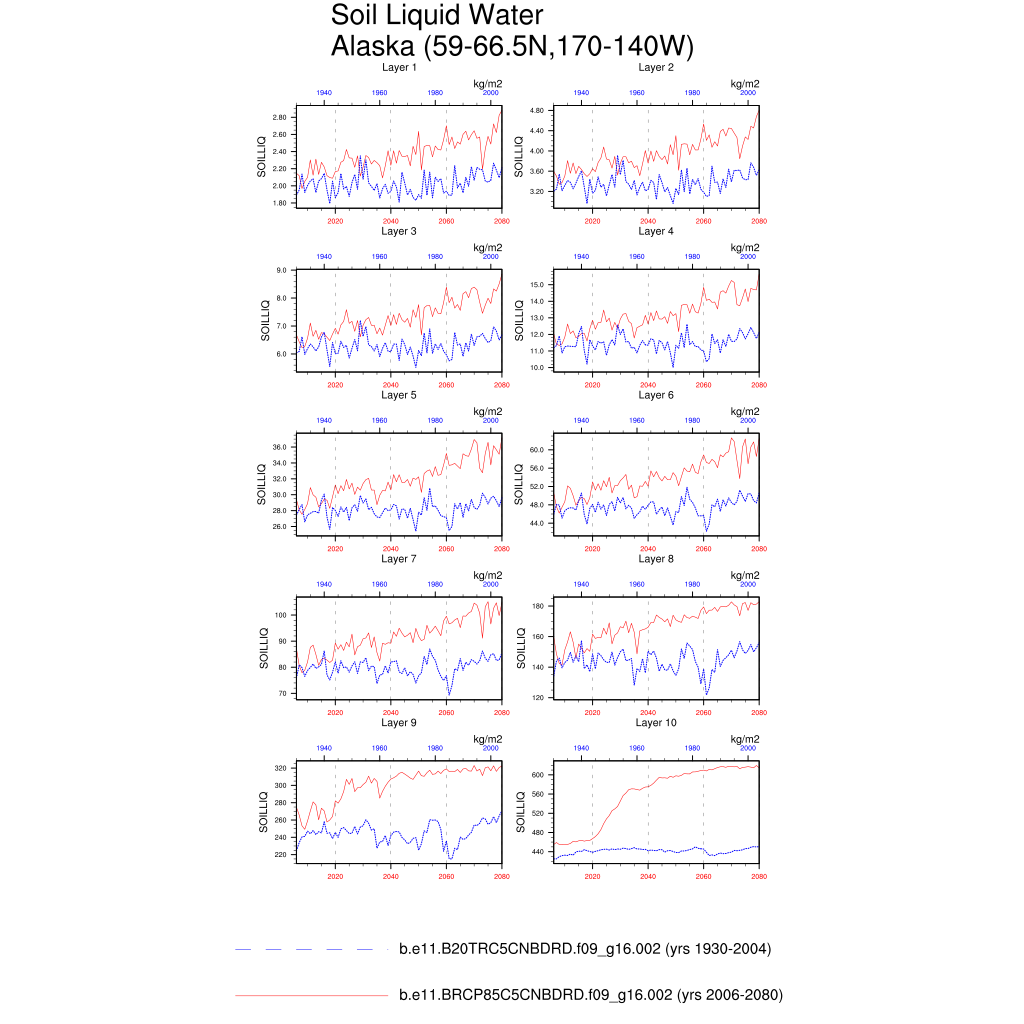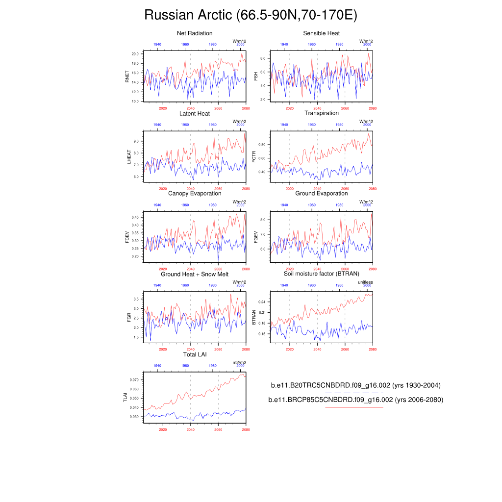 Set 6 Description: Line plots of annual trends in regional soil water/ice and temperature, runoff, snow water/ice, photosynthesis