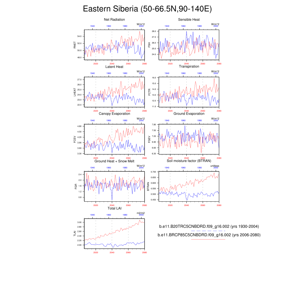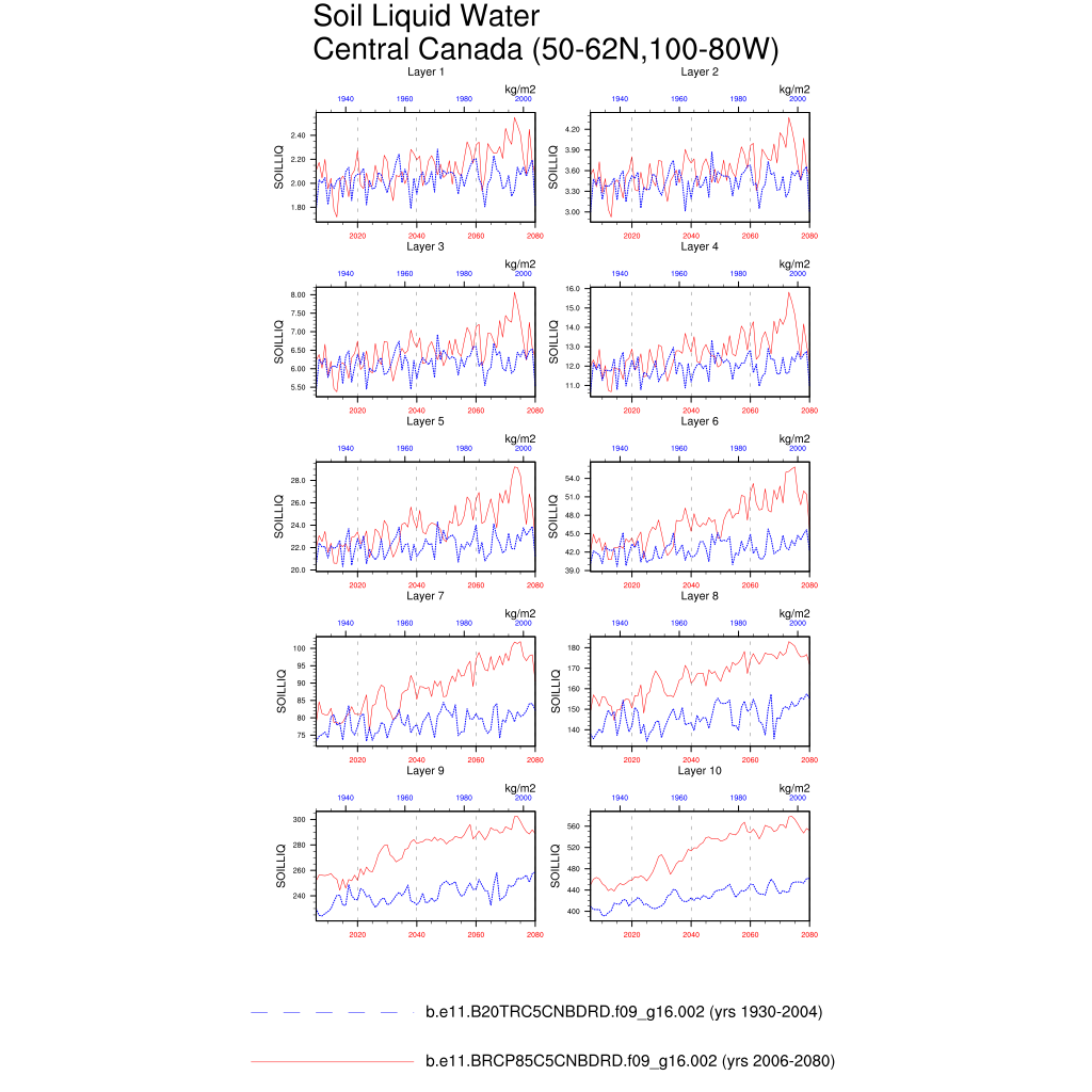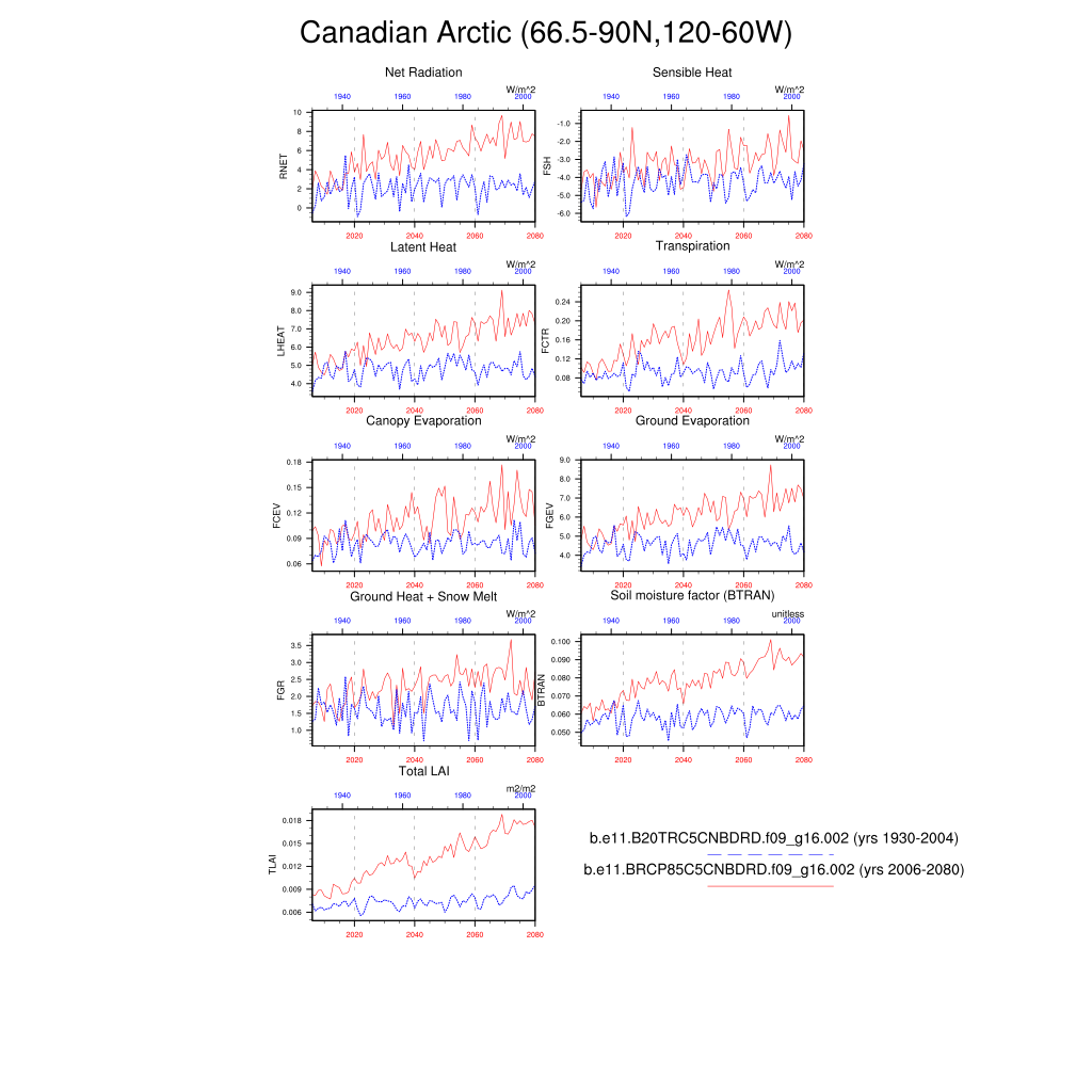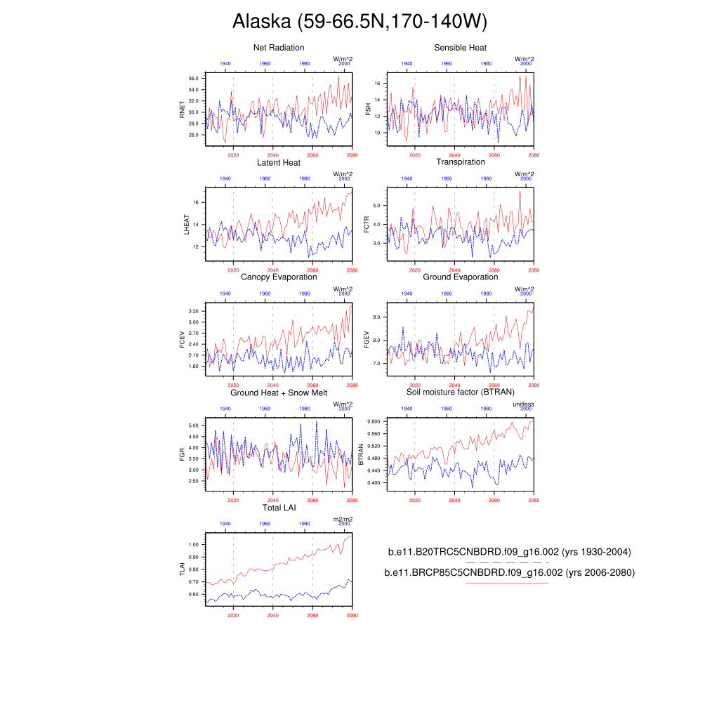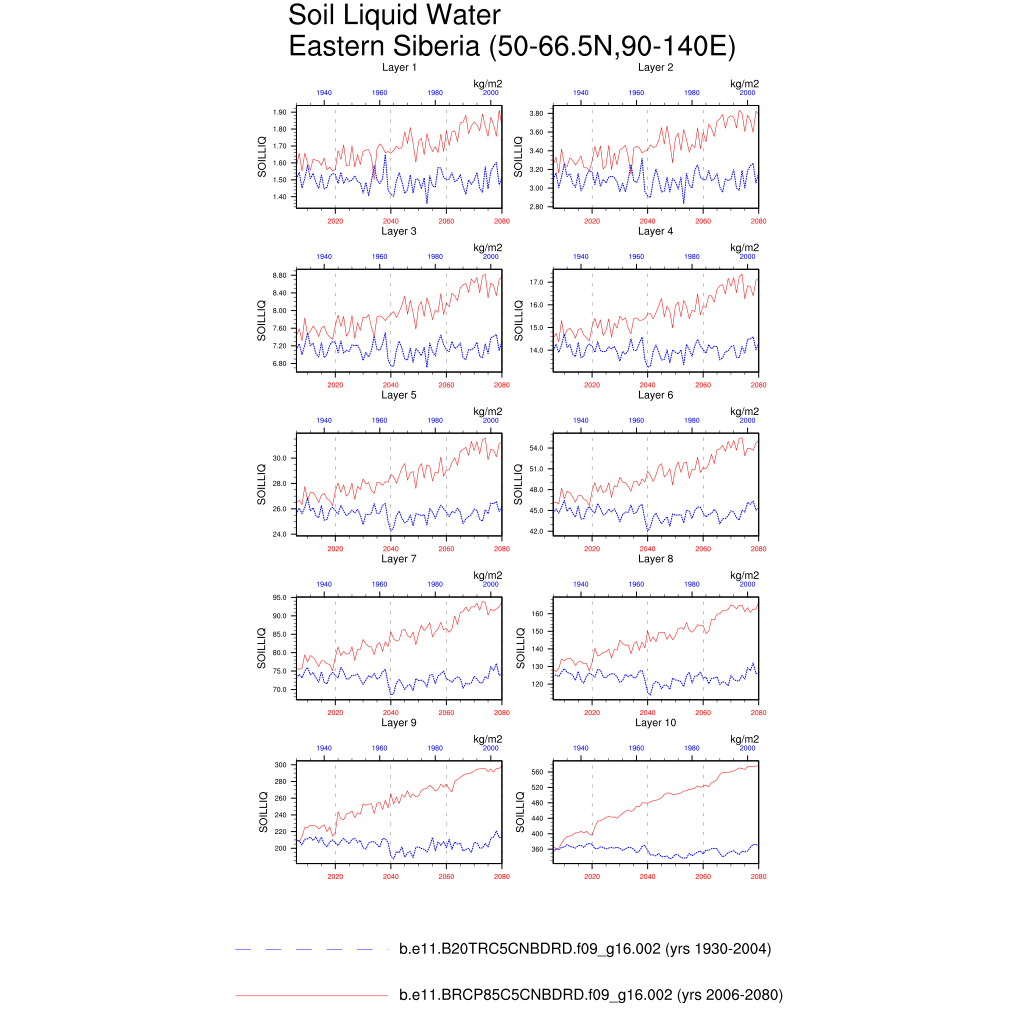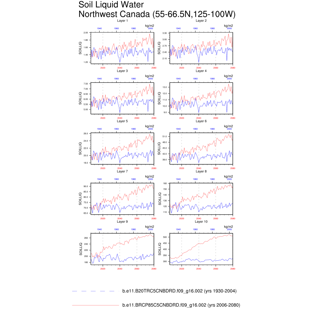 Set 6 Description: Line plots of annual trends in regional soil water/ice and temperature, runoff, snow water/ice, photosynthesis