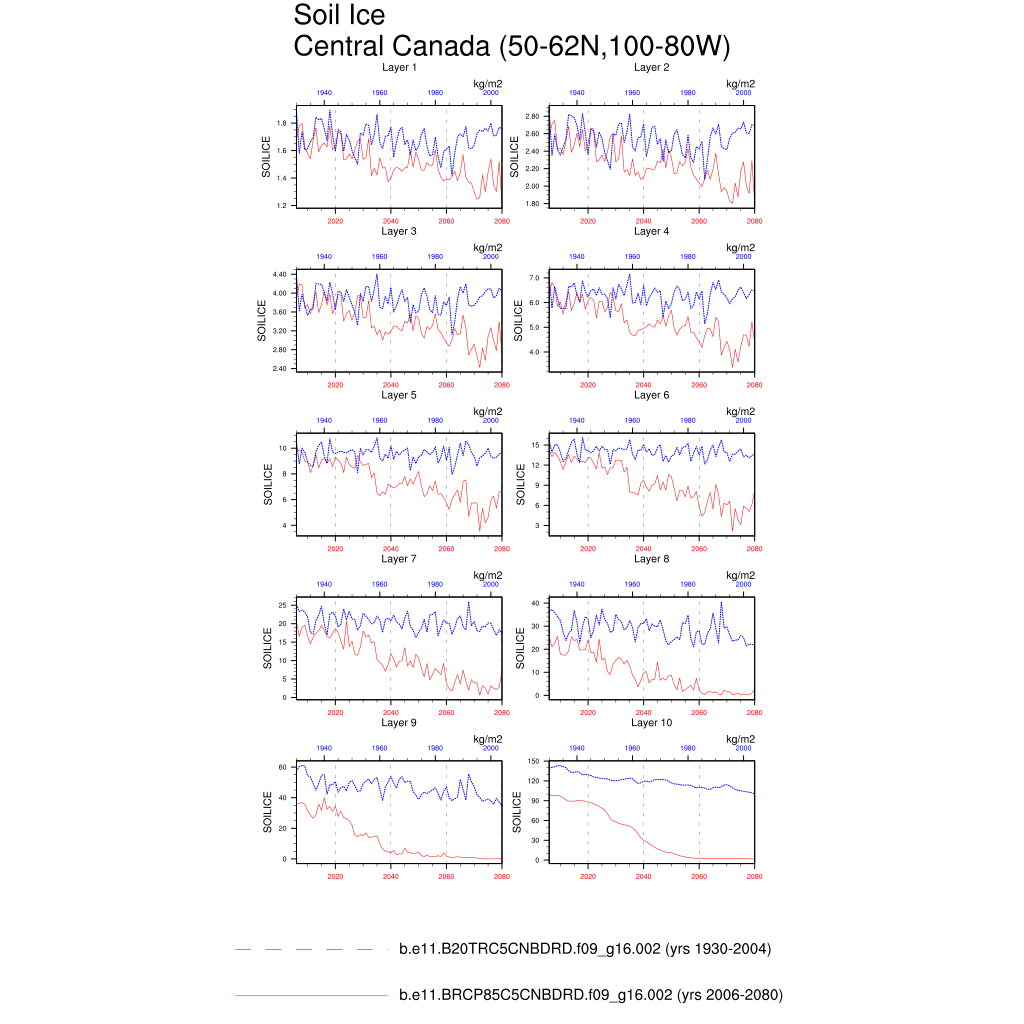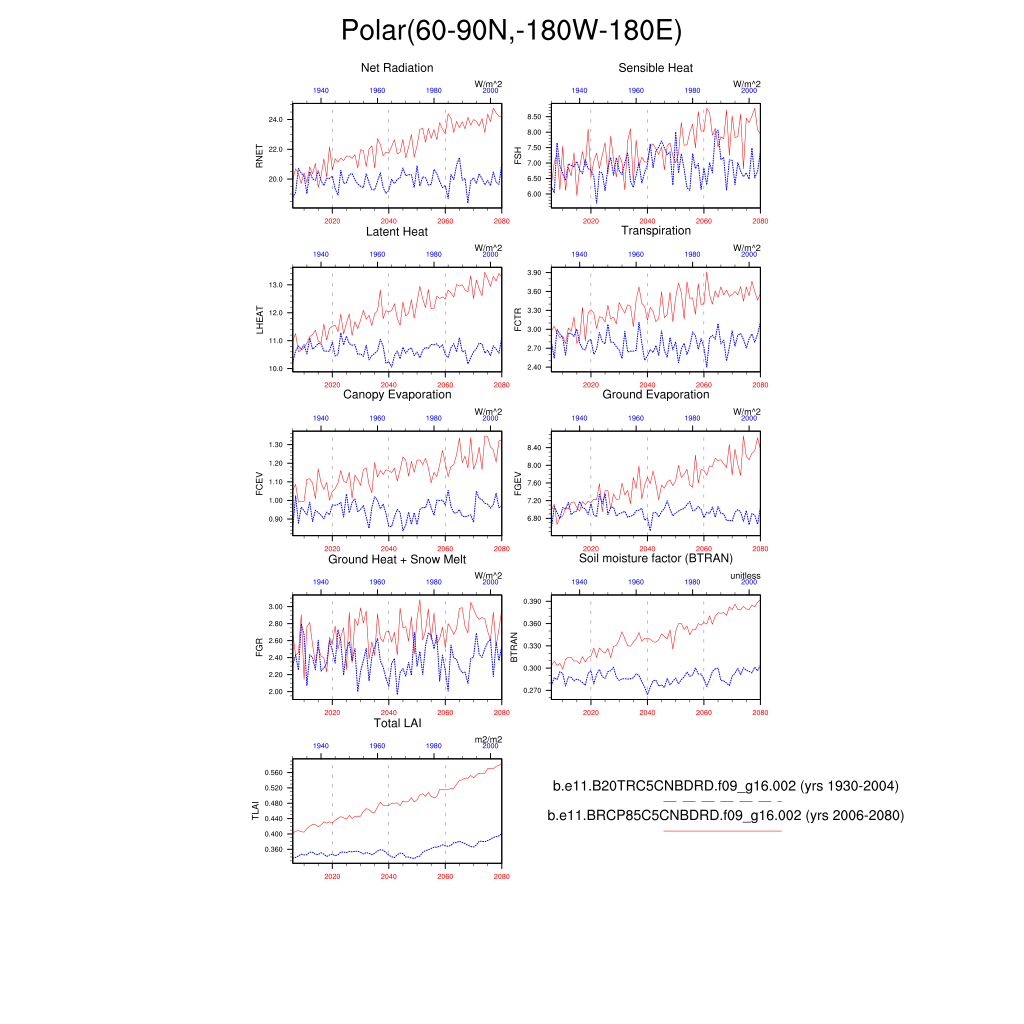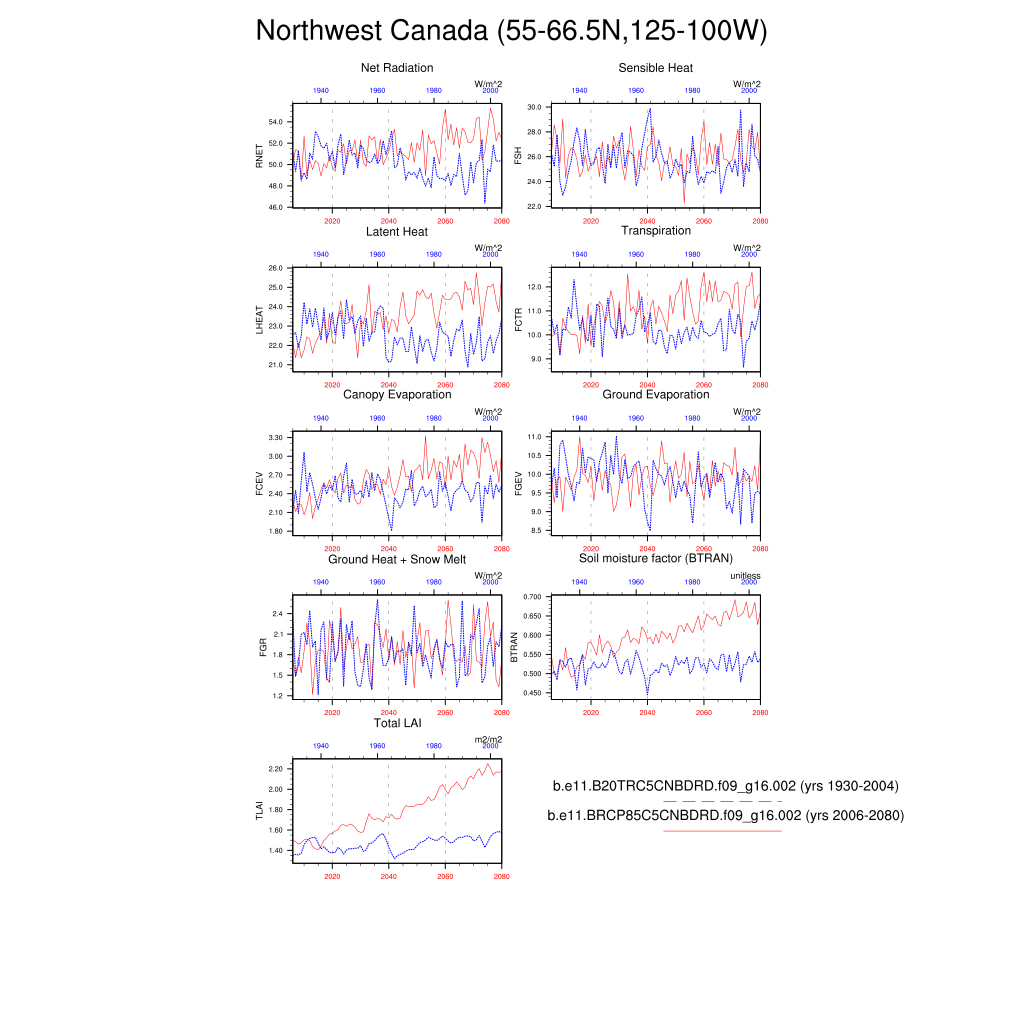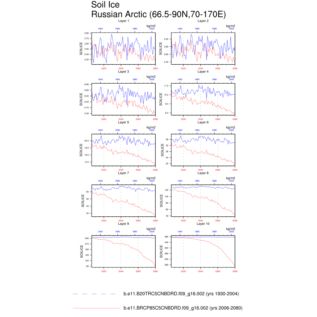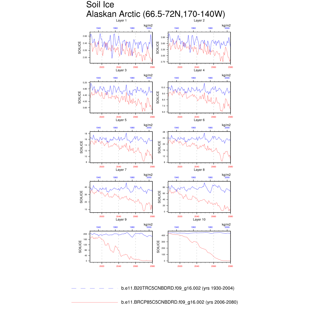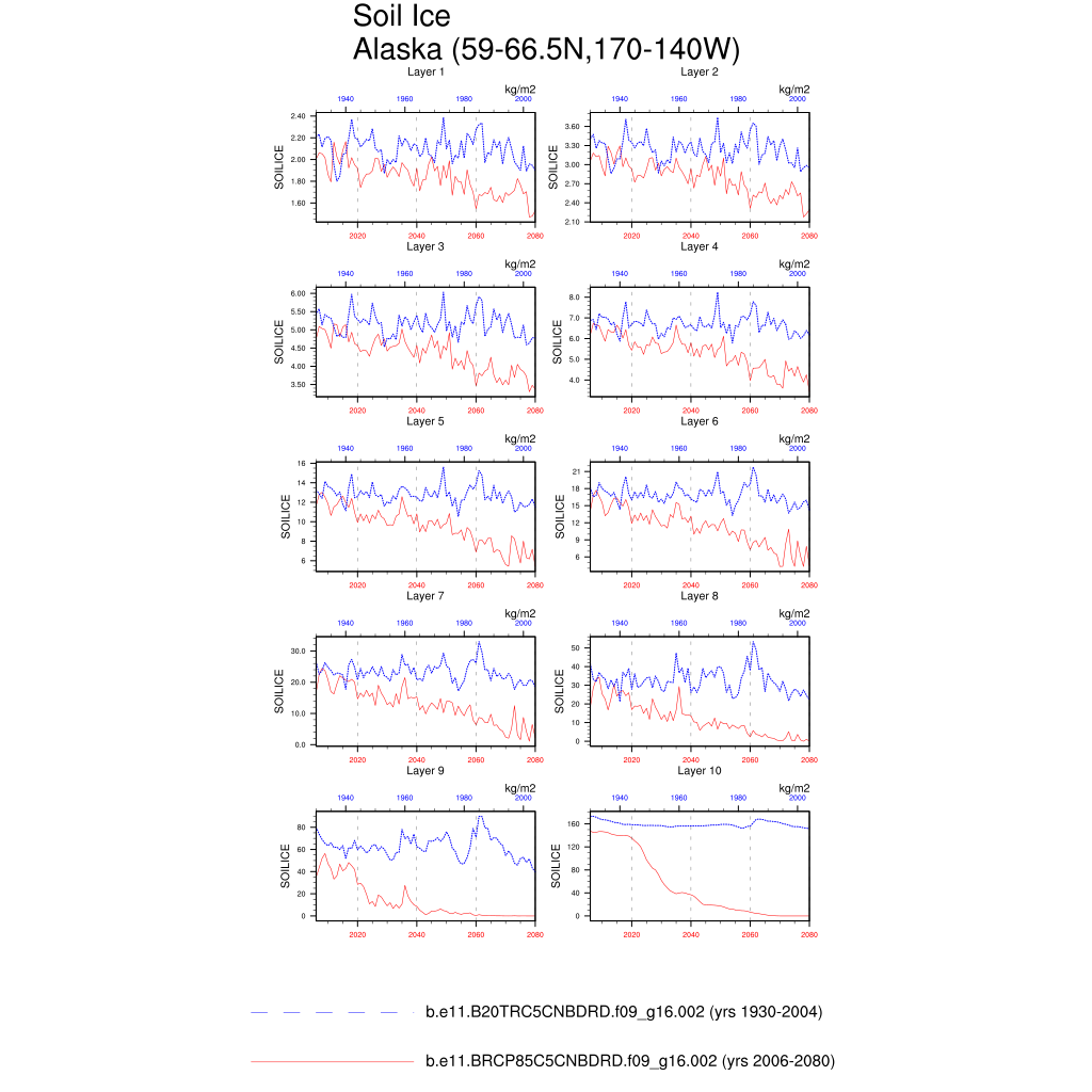 Set 6 Description: Line plots of annual trends in regional soil water/ice and temperature, runoff, snow water/ice, photosynthesis
