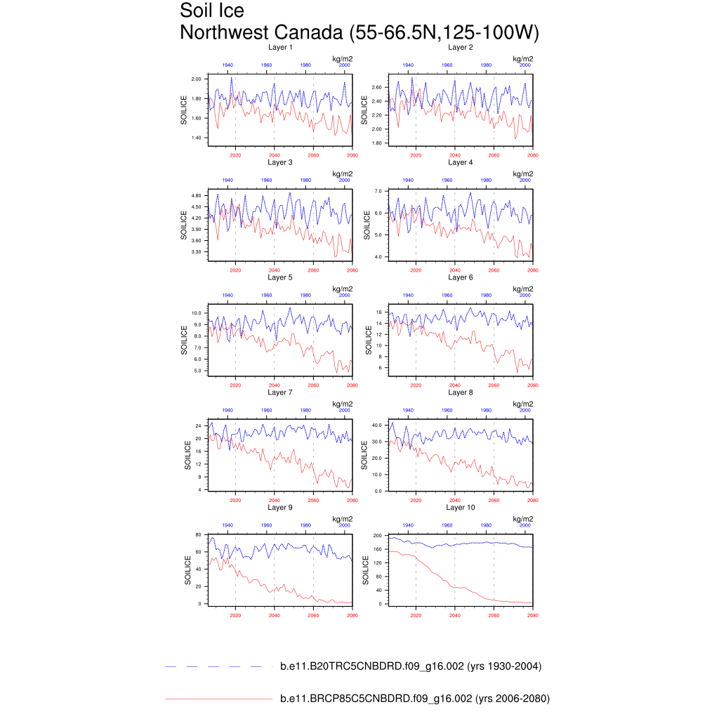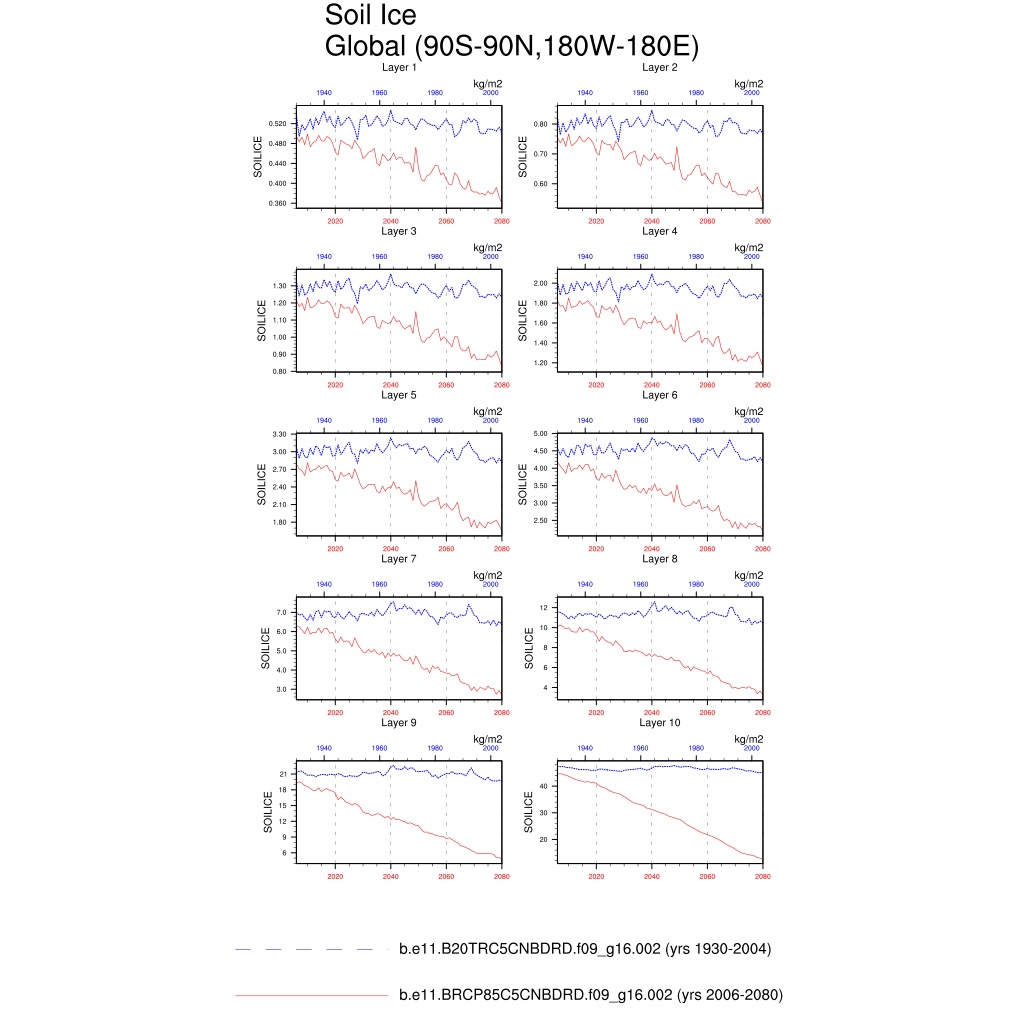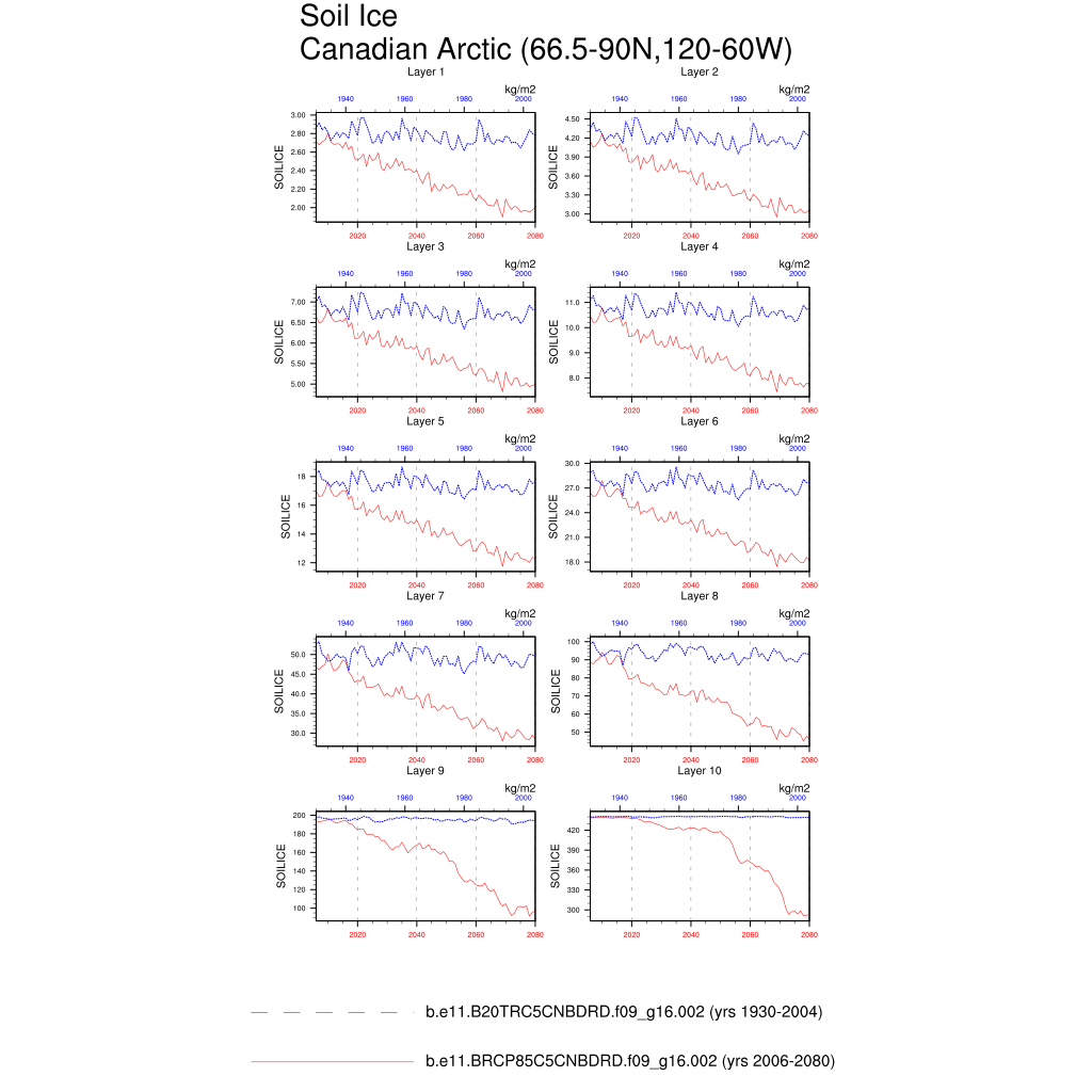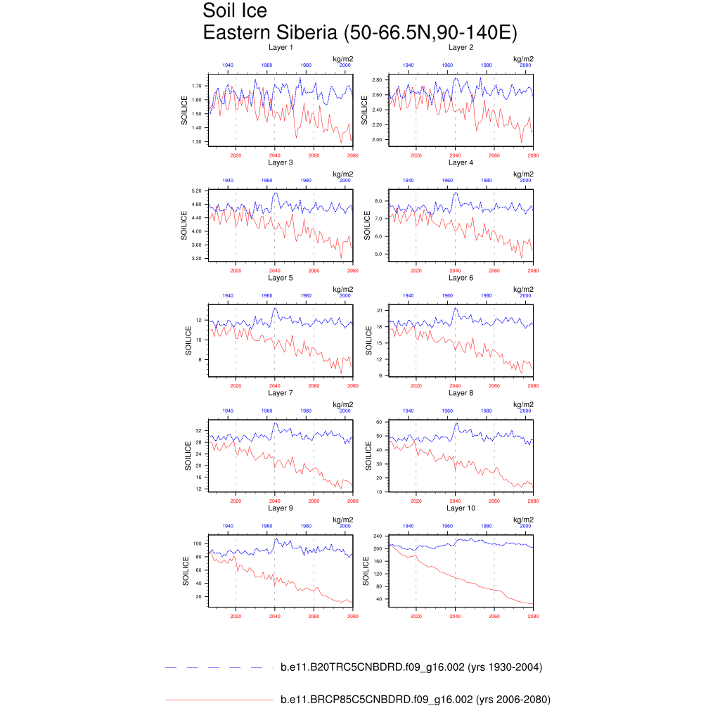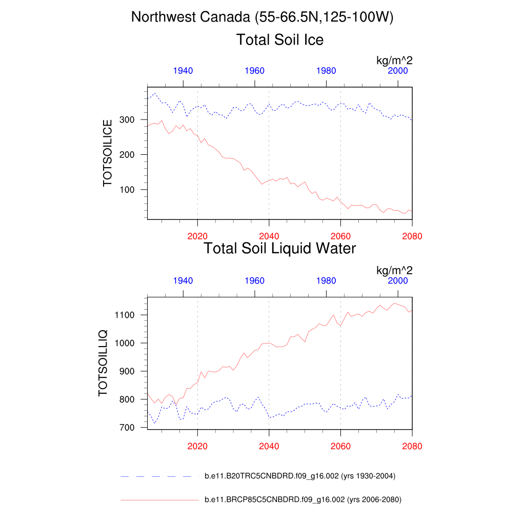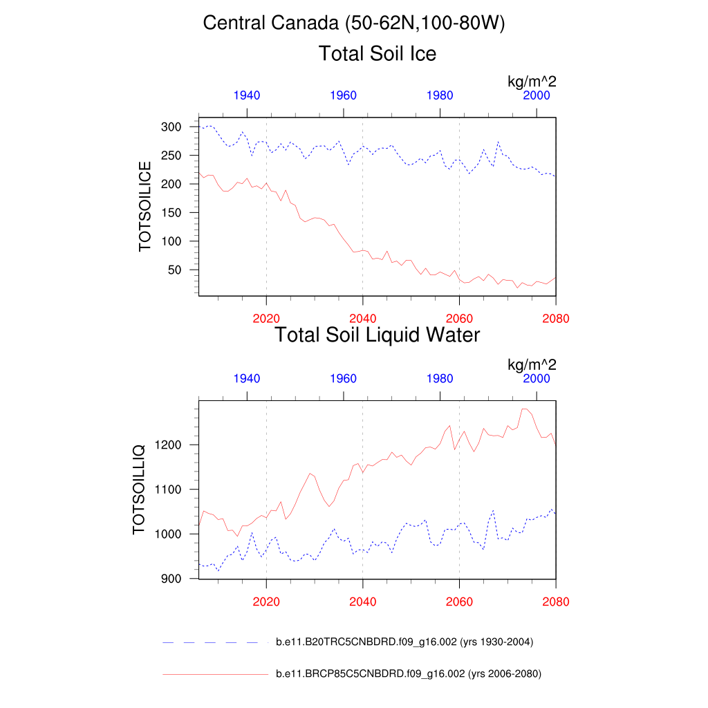Set 6 Description: Line plots of annual trends in regional soil water/ice and temperature, runoff, snow water/ice, photosynthesis