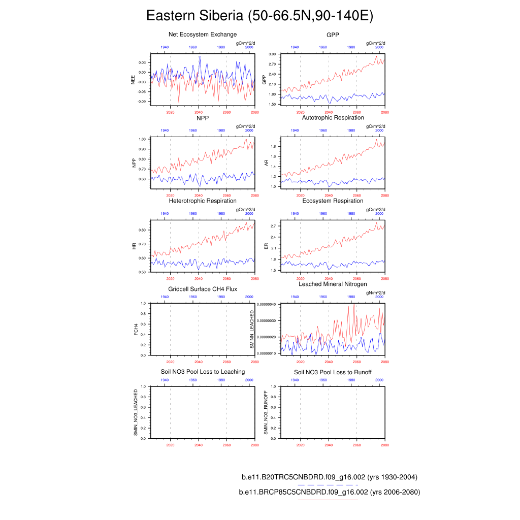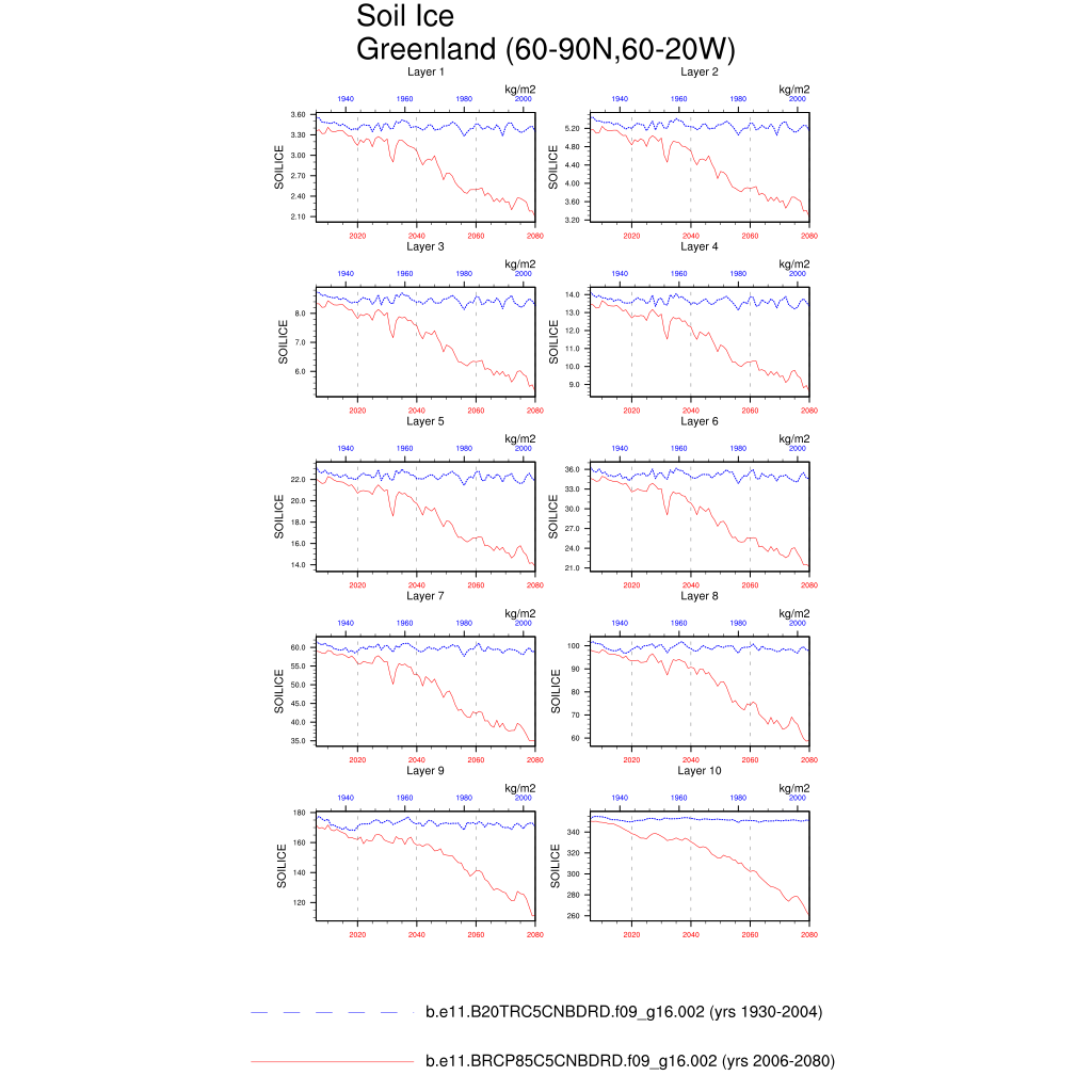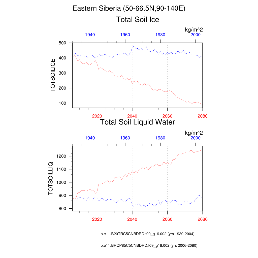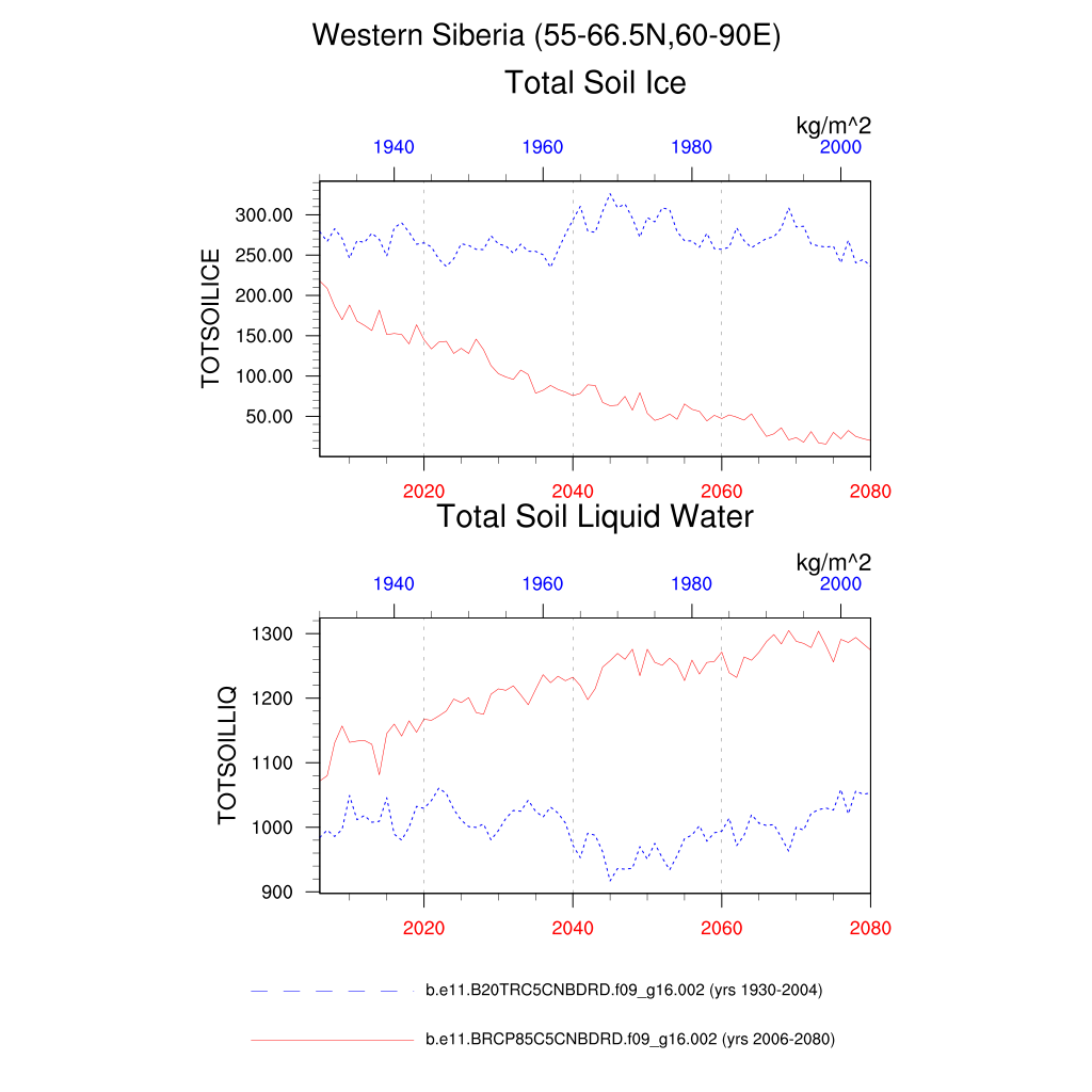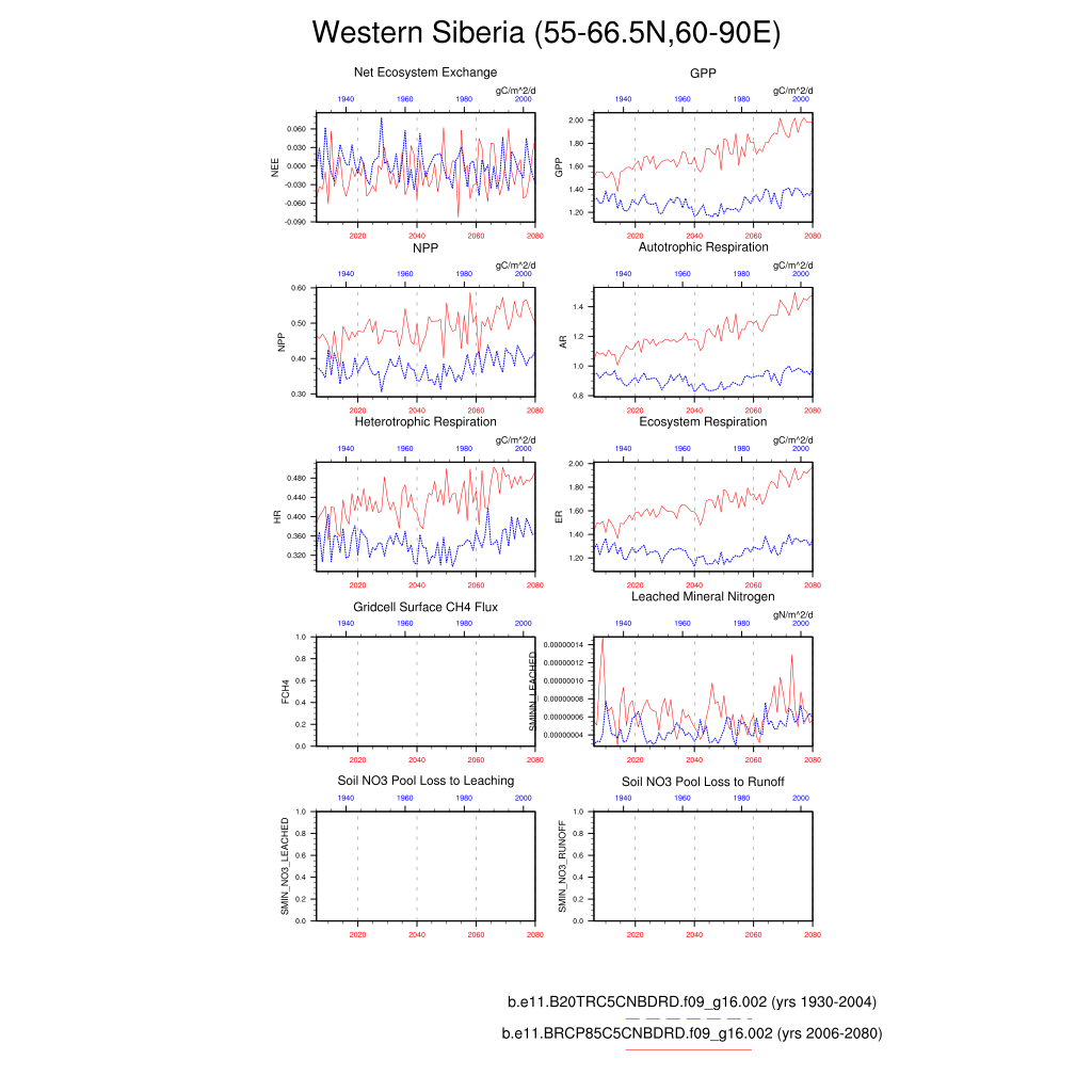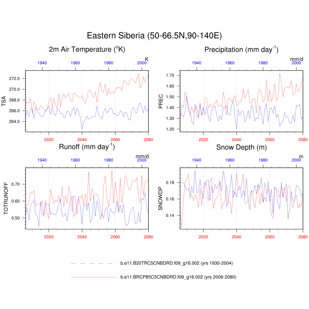 Set 6 Description: Line plots of annual trends in regional soil water/ice and temperature, runoff, snow water/ice, photosynthesis
