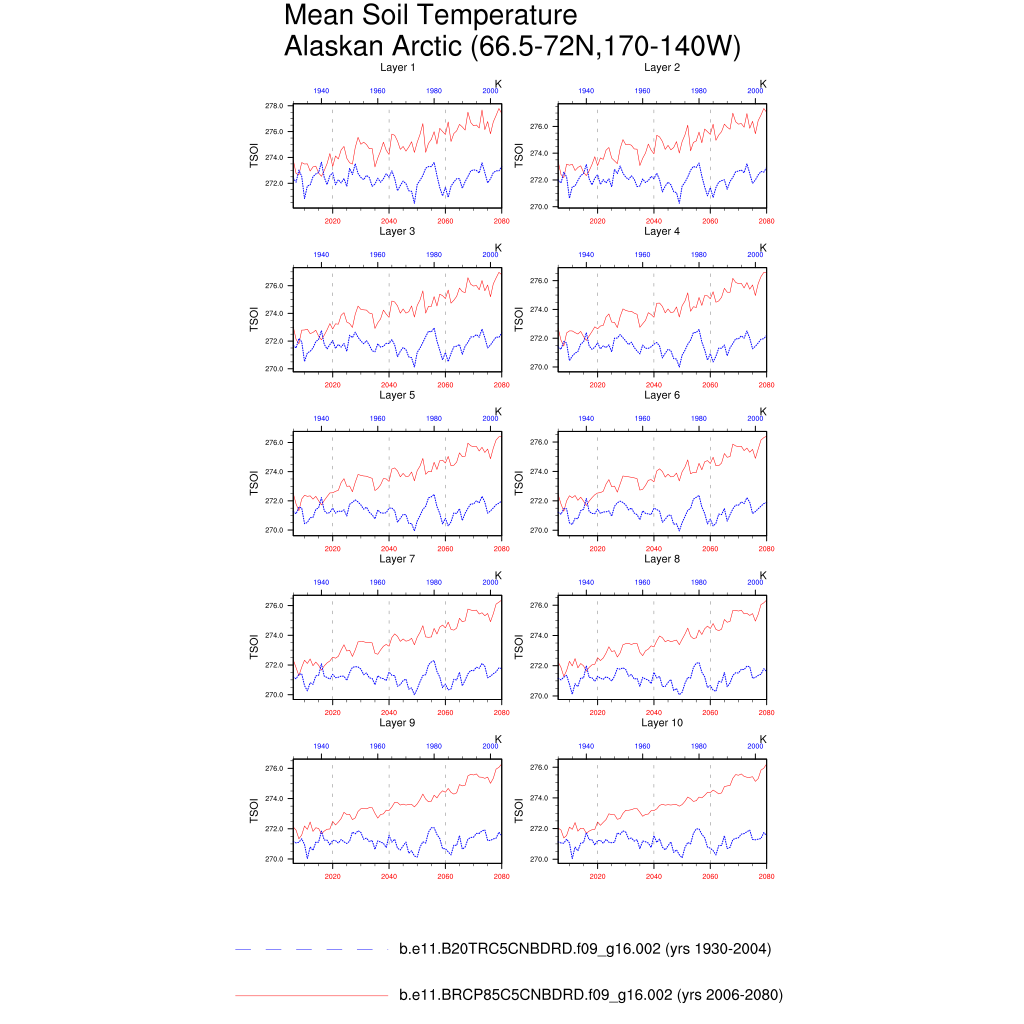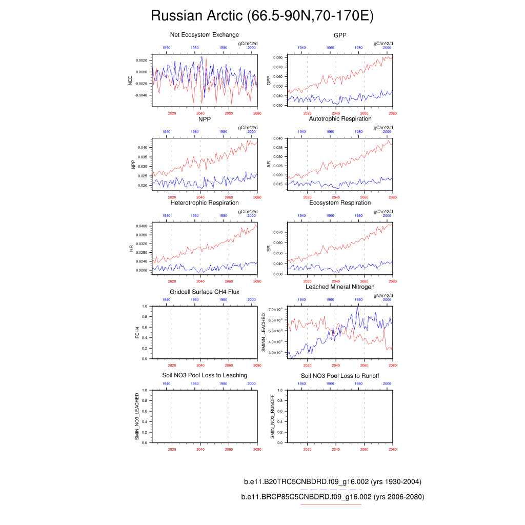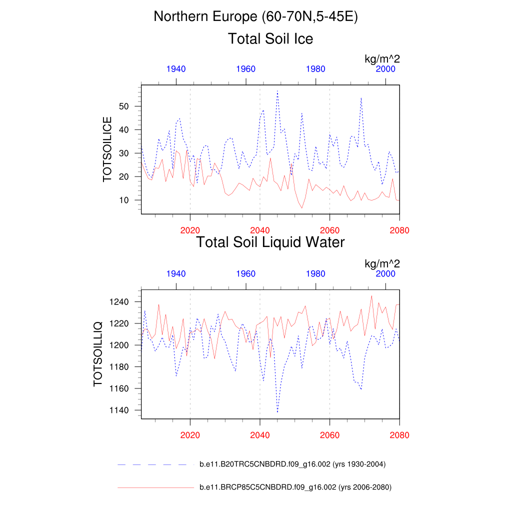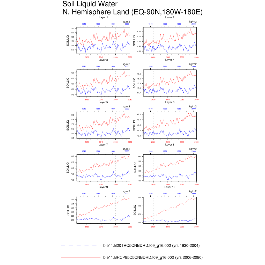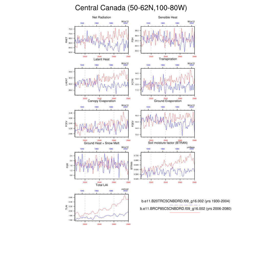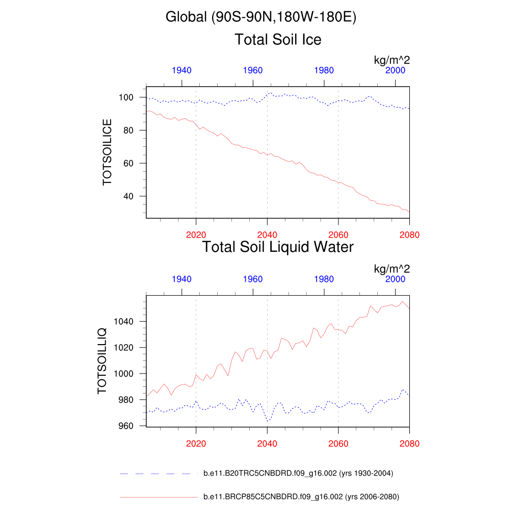 Set 6 Description: Line plots of annual trends in regional soil water/ice and temperature, runoff, snow water/ice, photosynthesis