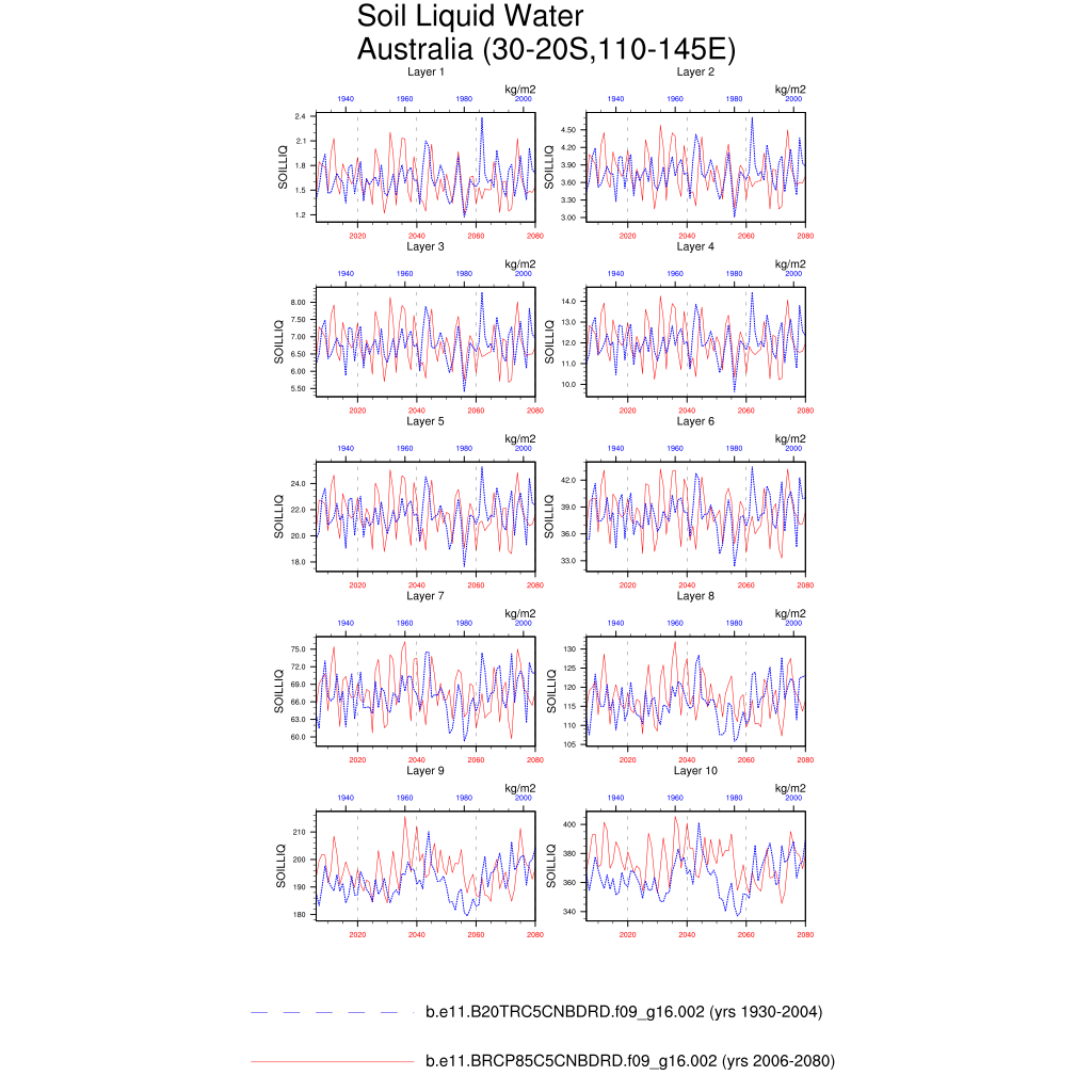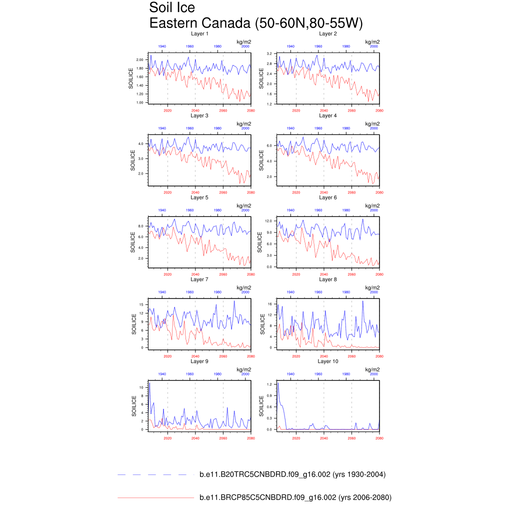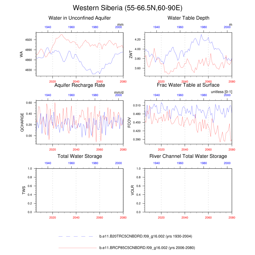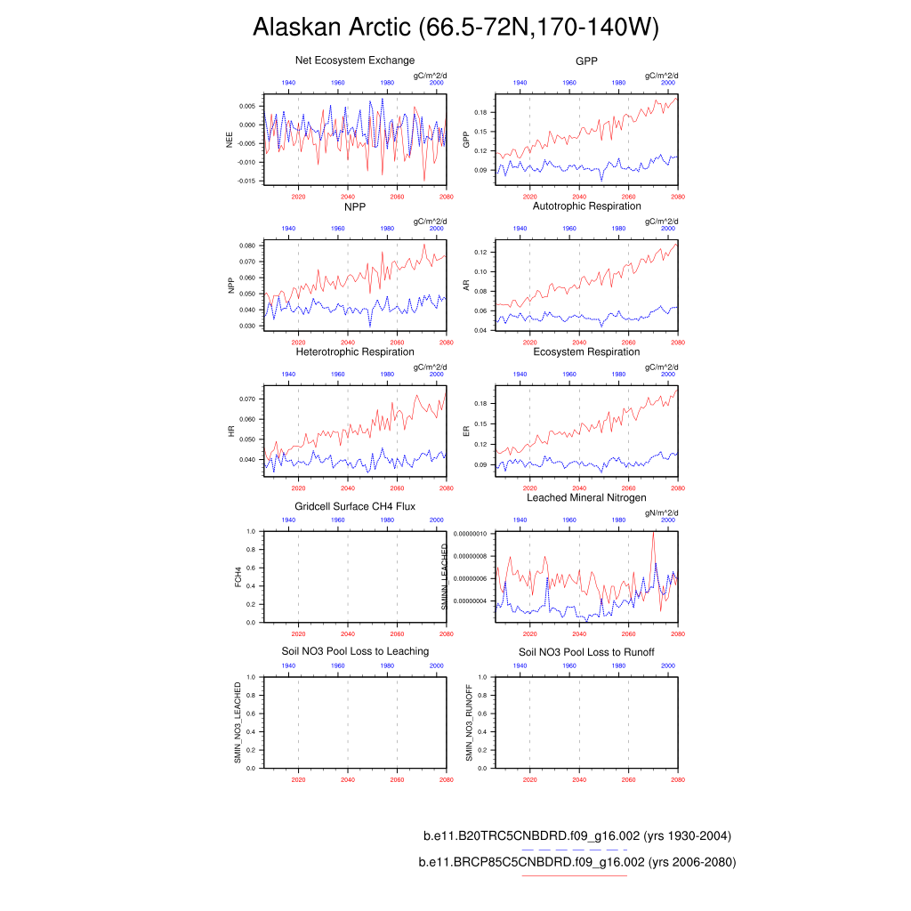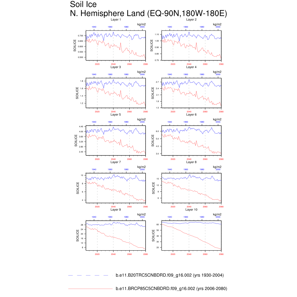 Set 6 Description: Line plots of annual trends in regional soil water/ice and temperature, runoff, snow water/ice, photosynthesis