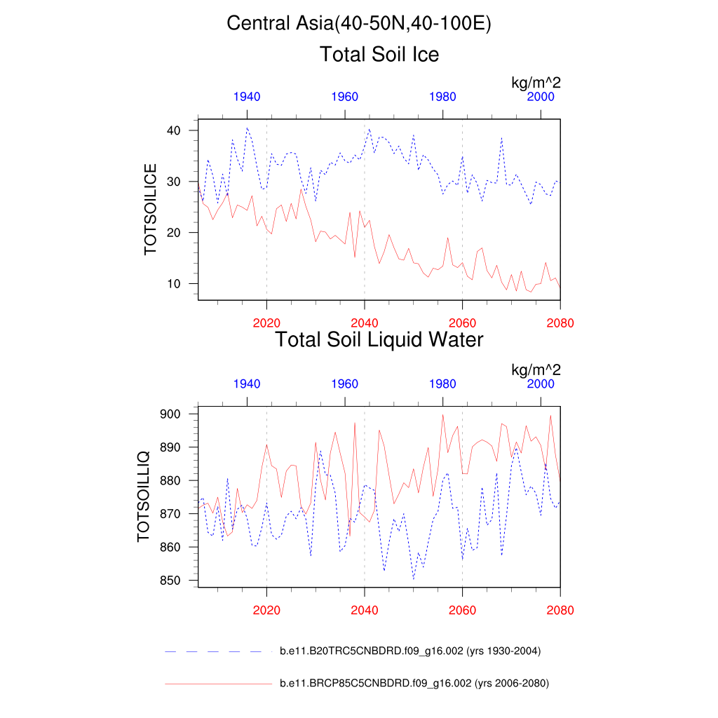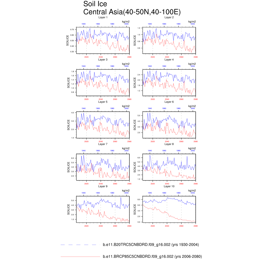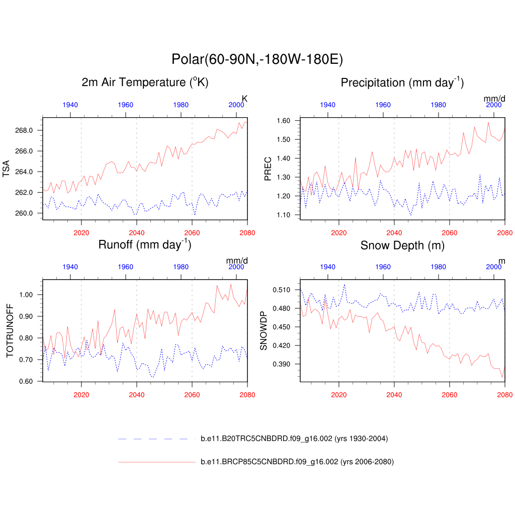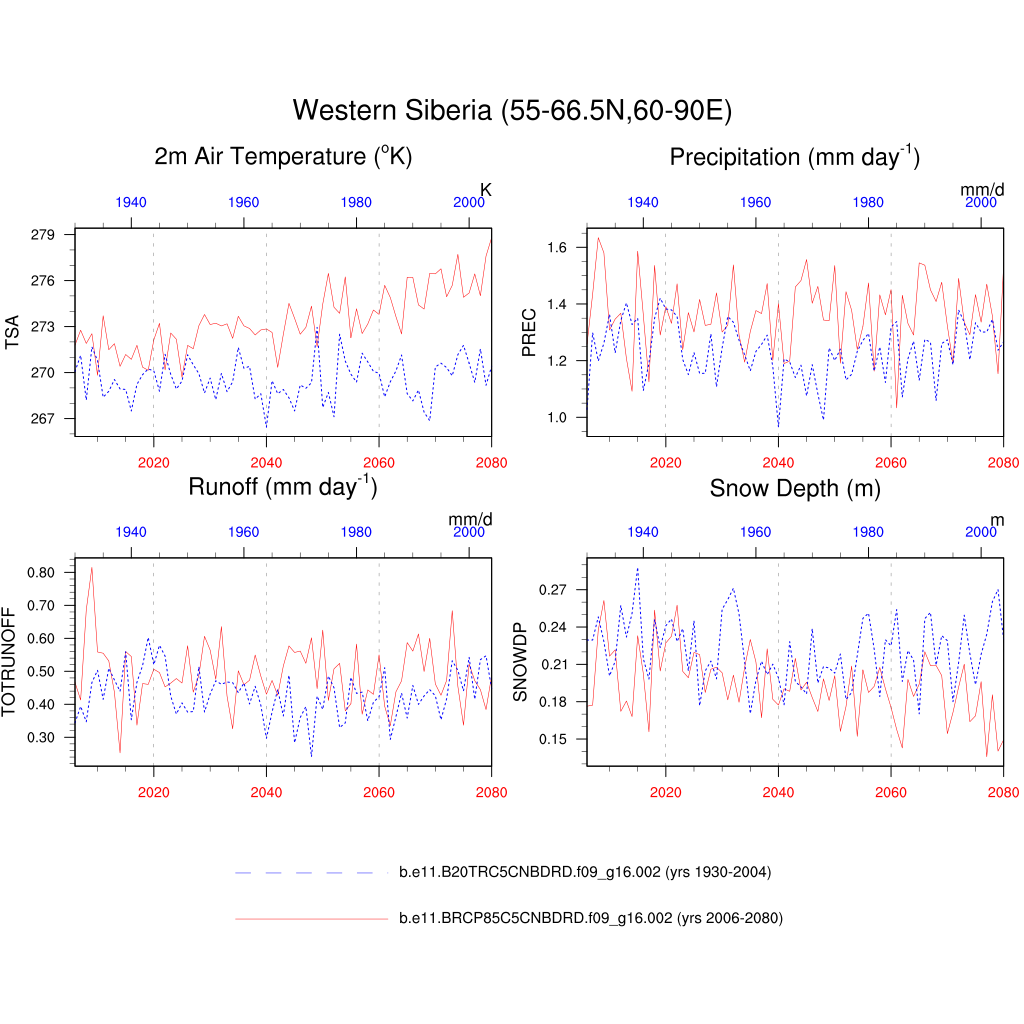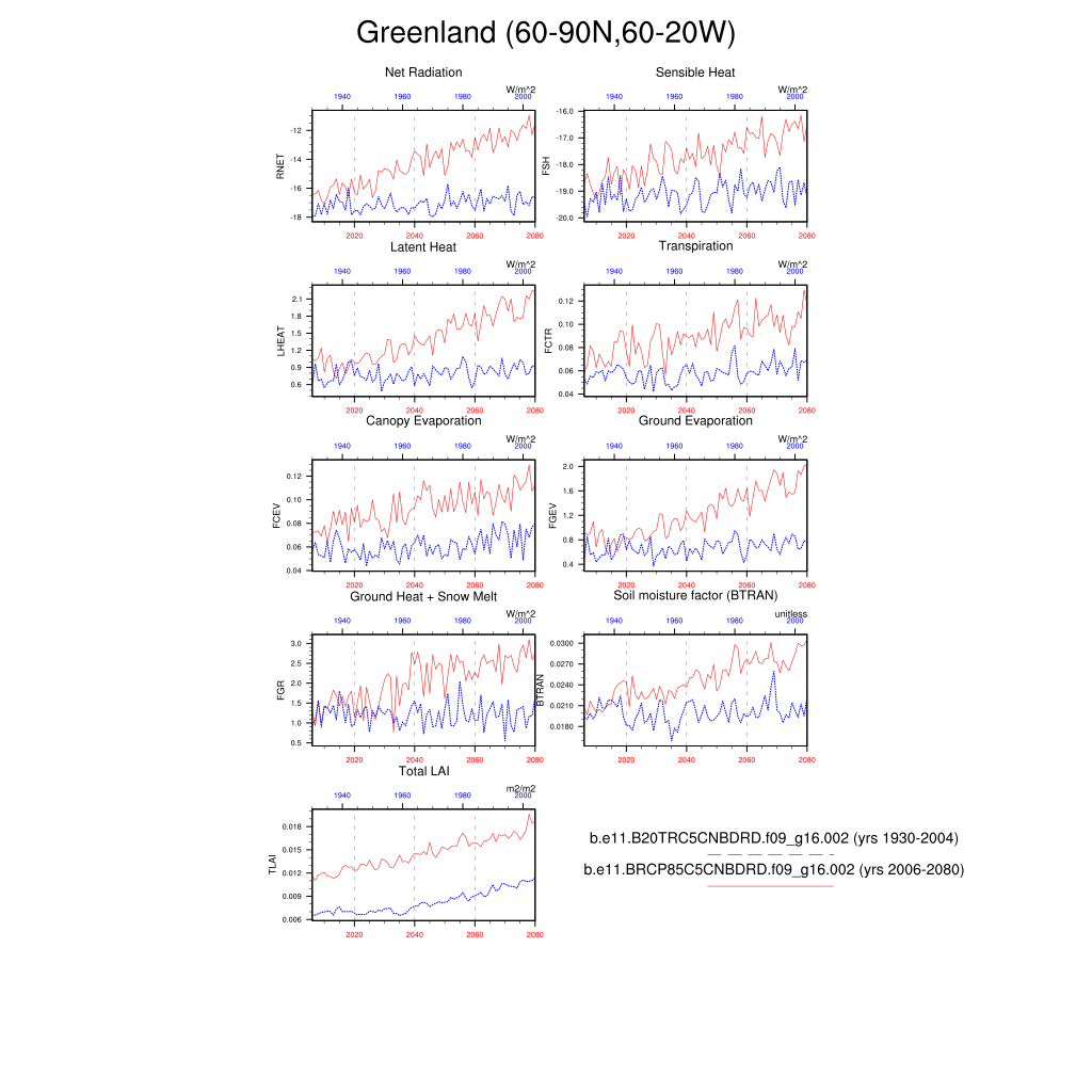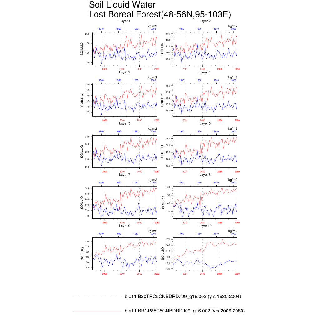 Set 6 Description: Line plots of annual trends in regional soil water/ice and temperature, runoff, snow water/ice, photosynthesis