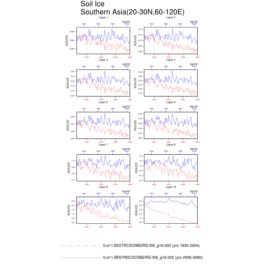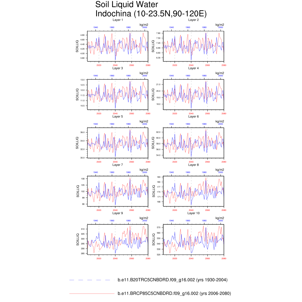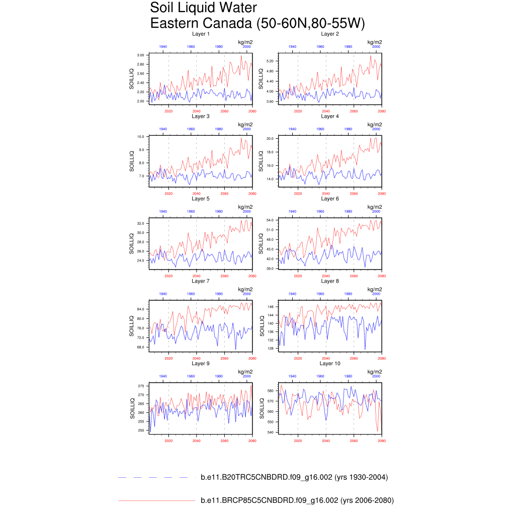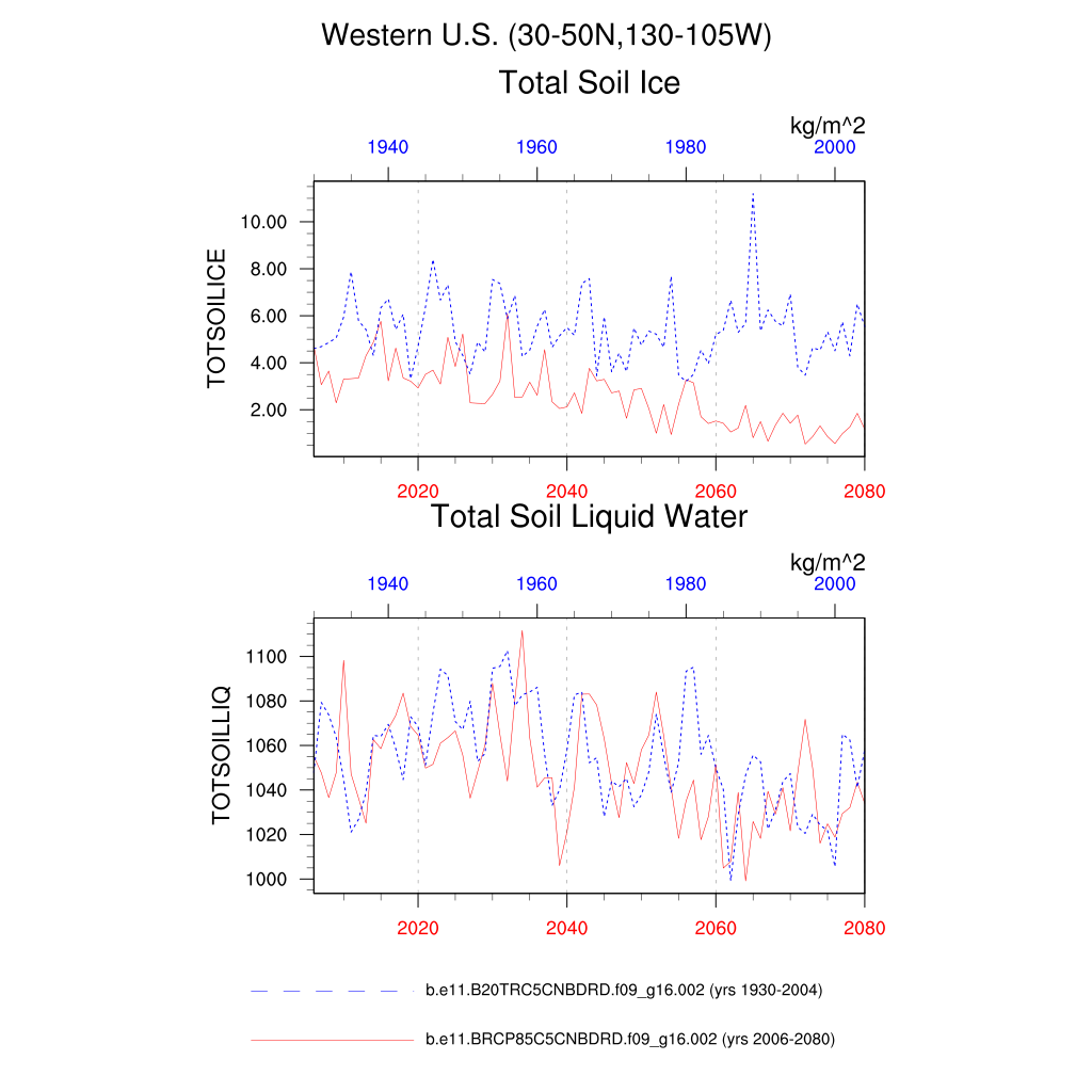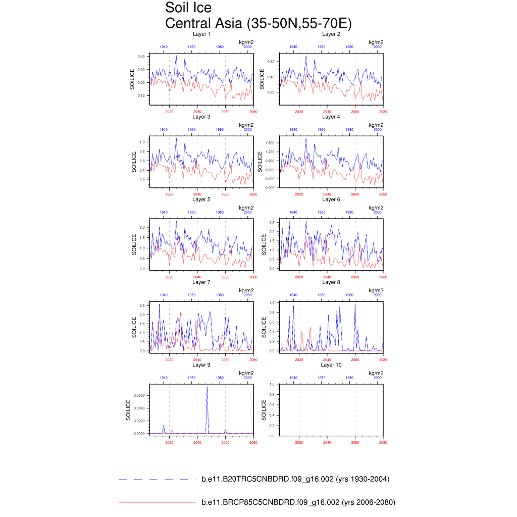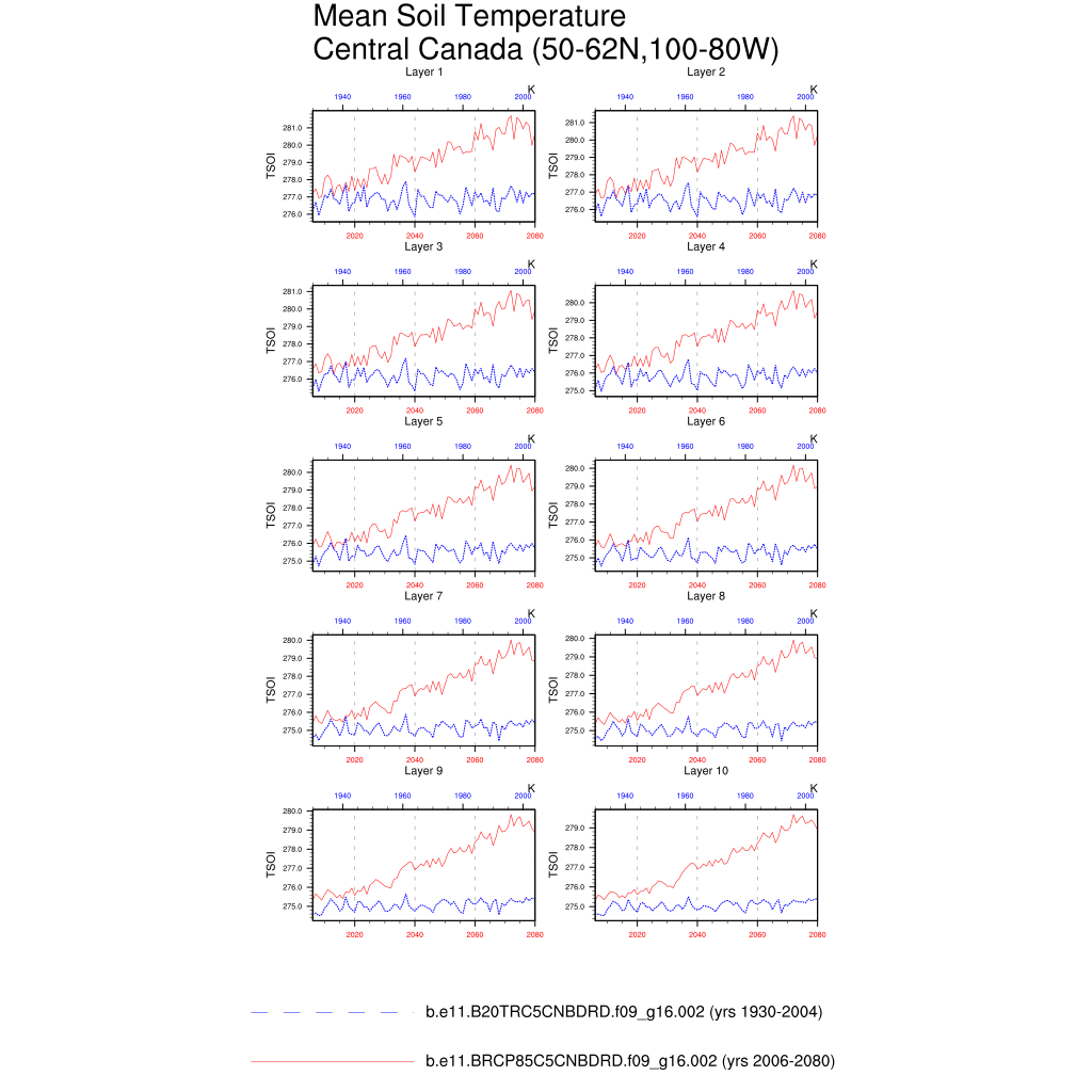 Set 6 Description: Line plots of annual trends in regional soil water/ice and temperature, runoff, snow water/ice, photosynthesis