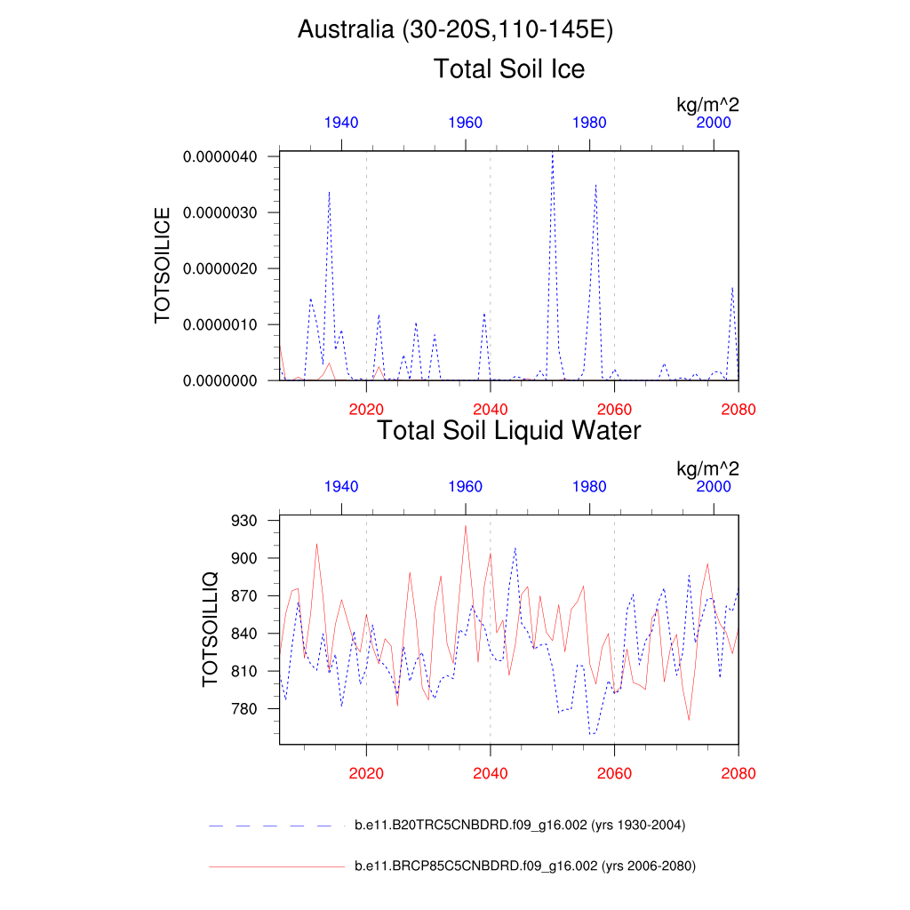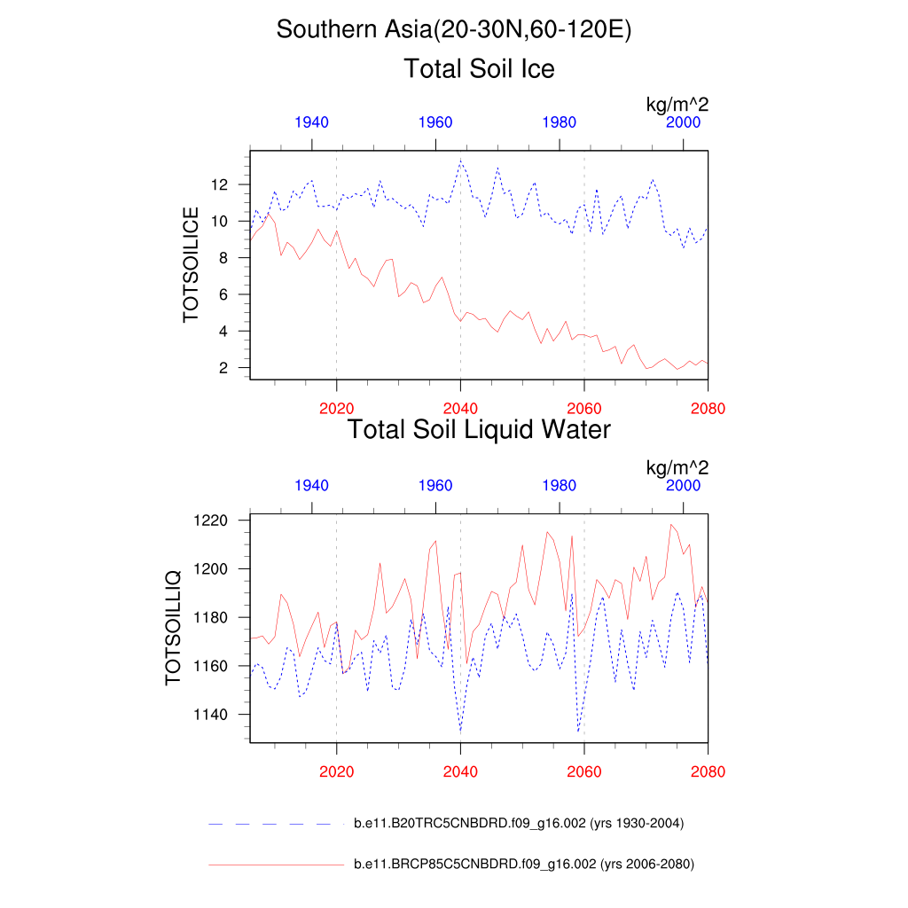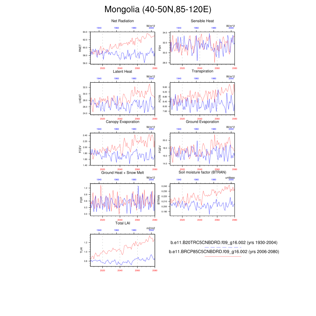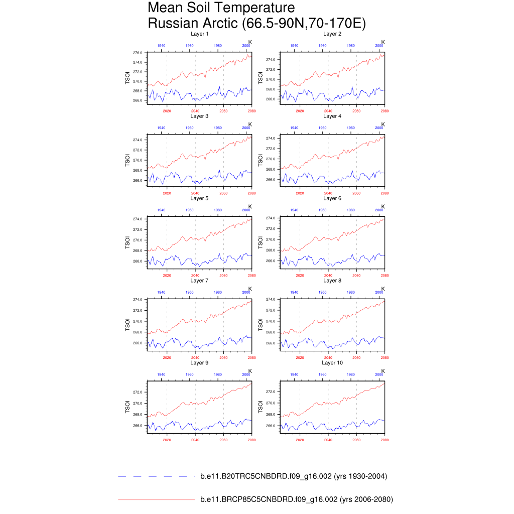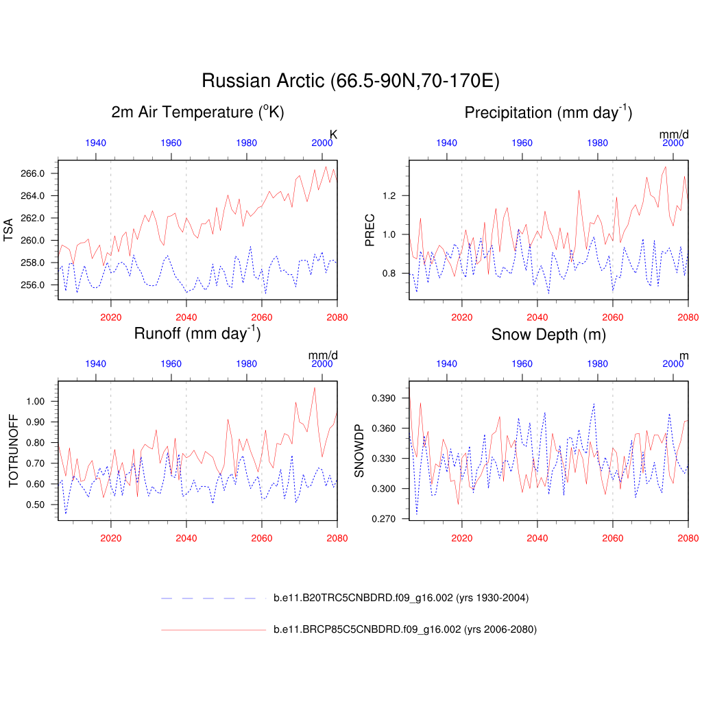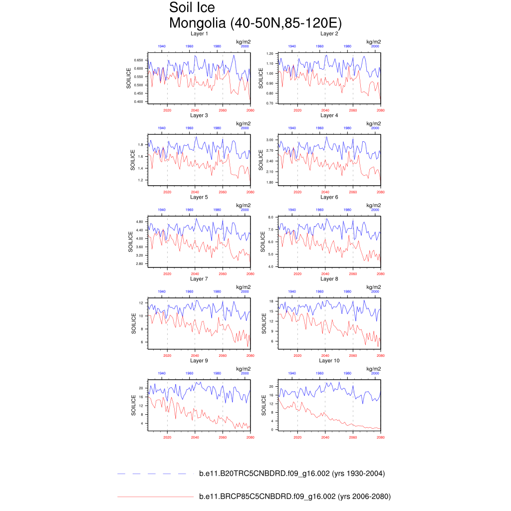 Set 6 Description: Line plots of annual trends in regional soil water/ice and temperature, runoff, snow water/ice, photosynthesis
