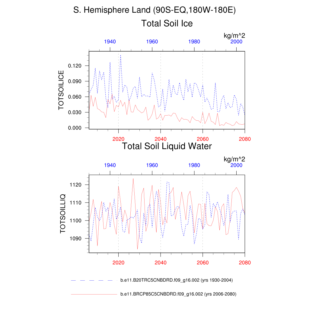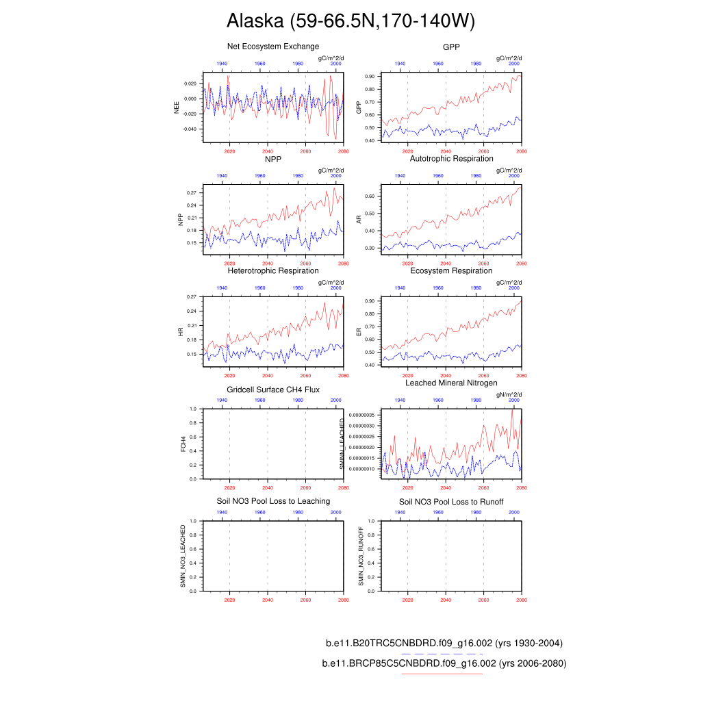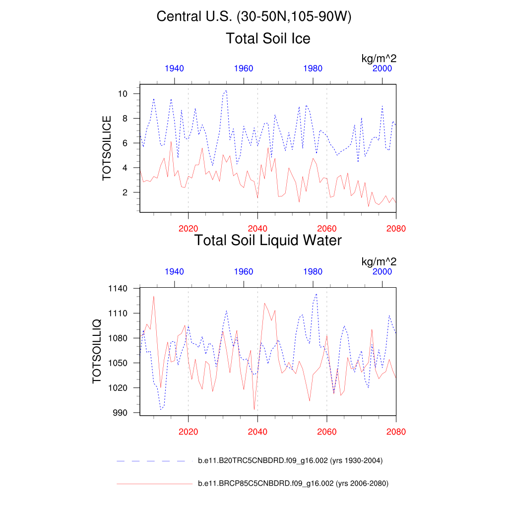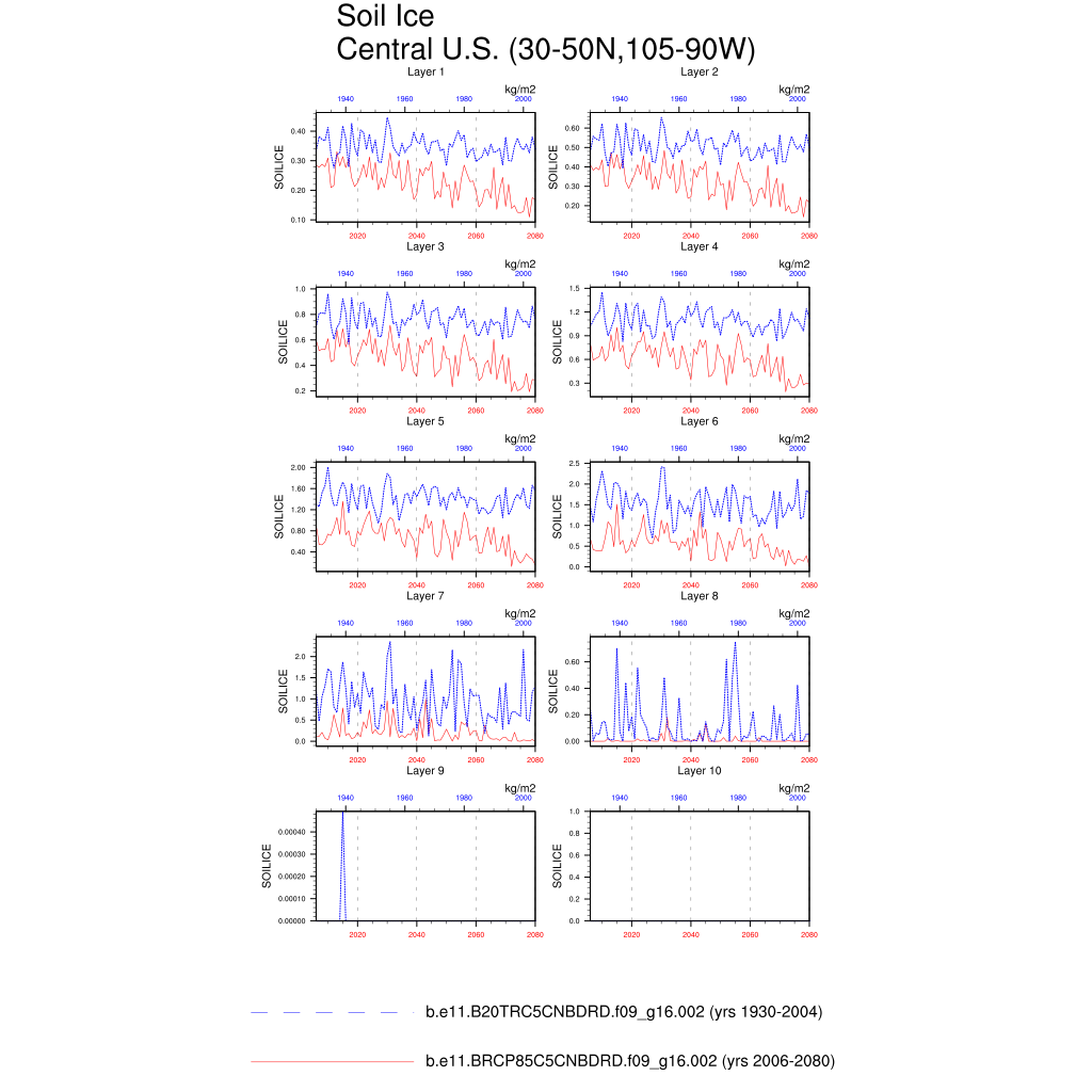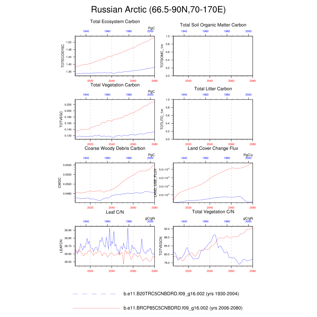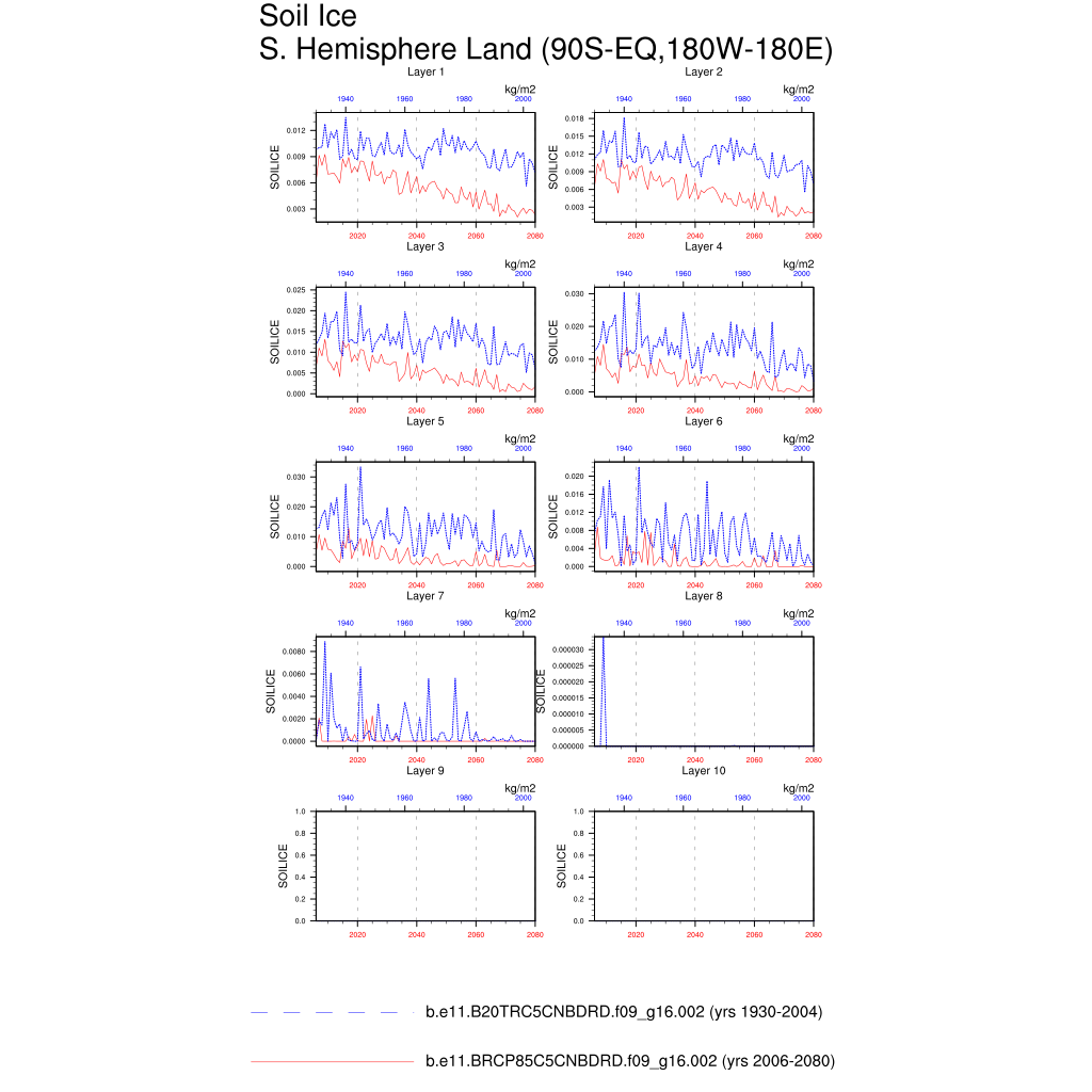 Set 6 Description: Line plots of annual trends in regional soil water/ice and temperature, runoff, snow water/ice, photosynthesis