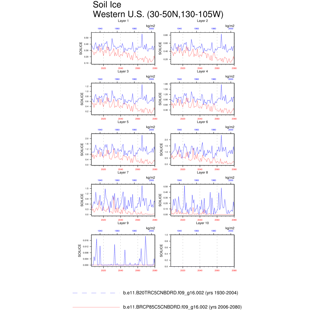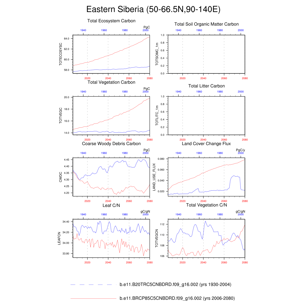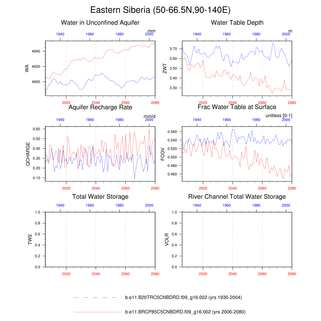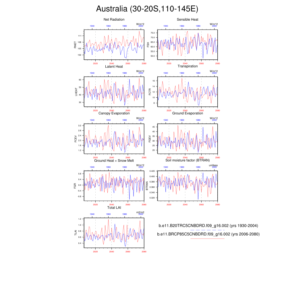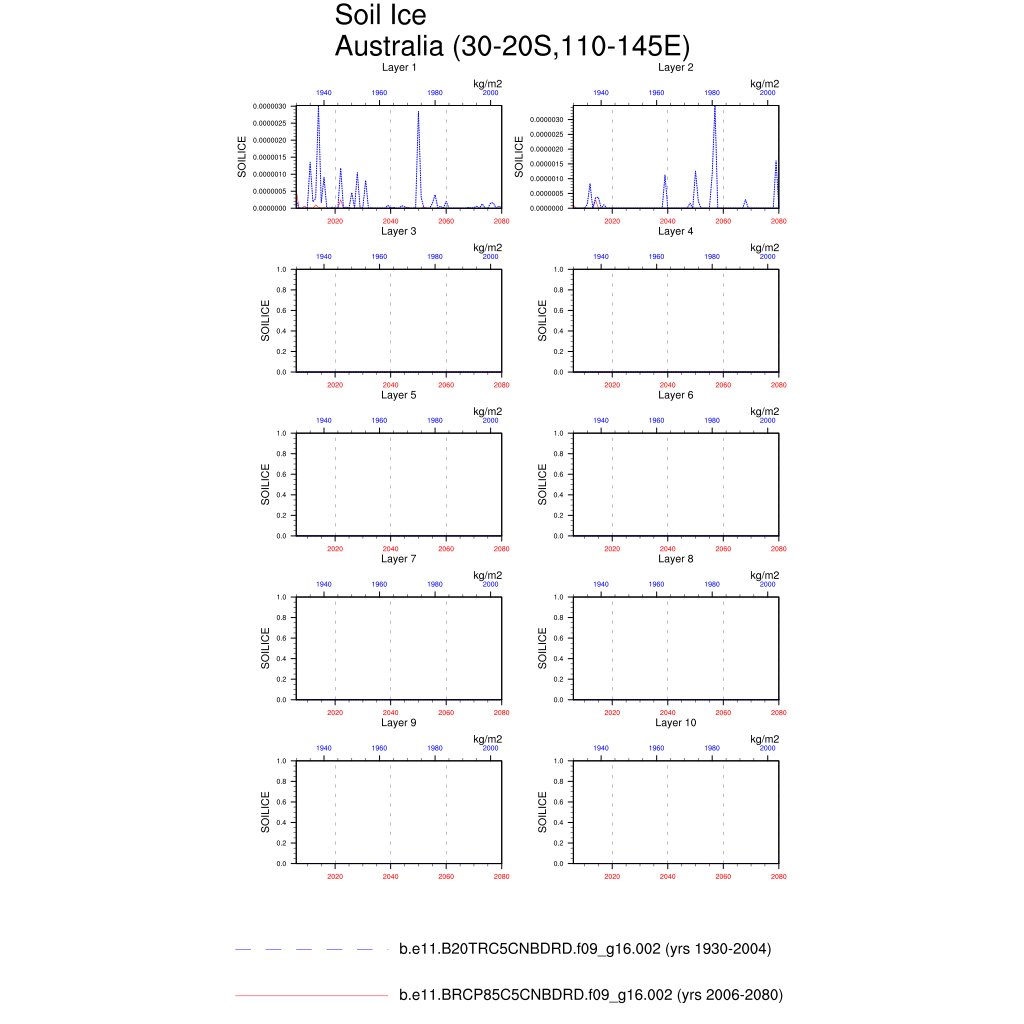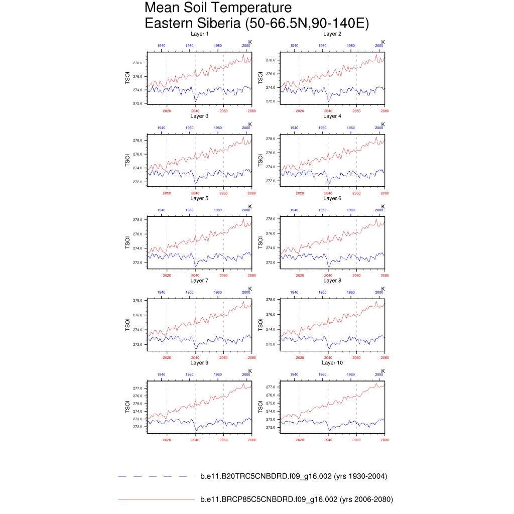 Set 6 Description: Line plots of annual trends in regional soil water/ice and temperature, runoff, snow water/ice, photosynthesis