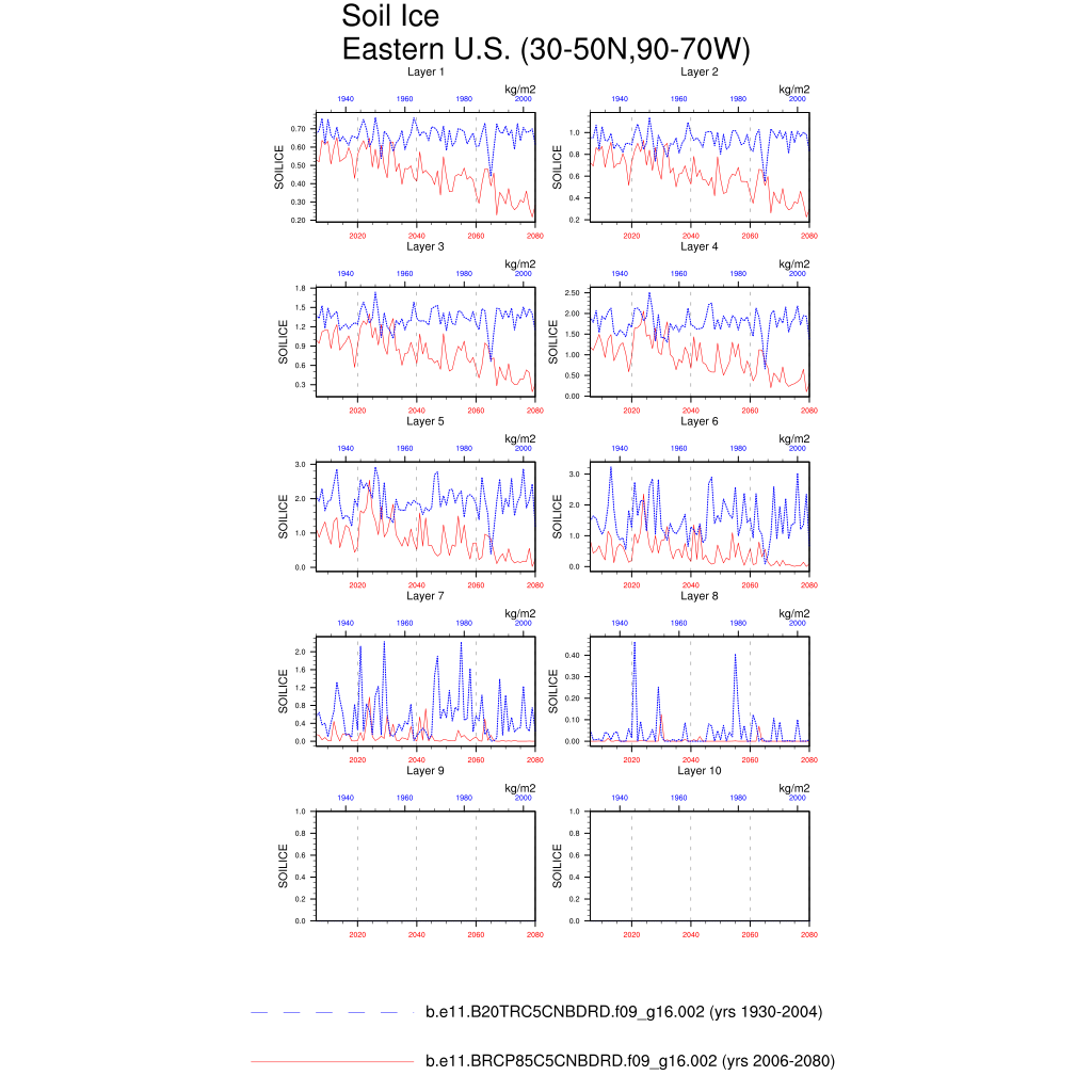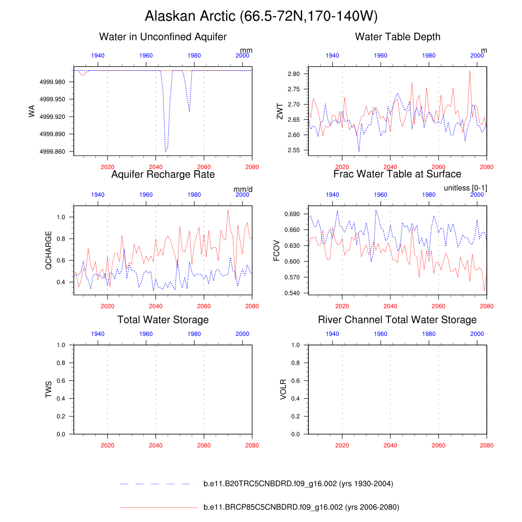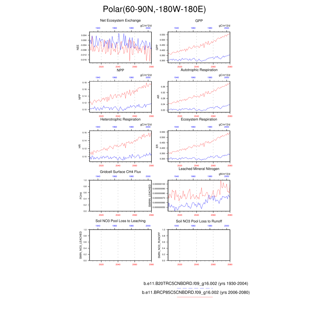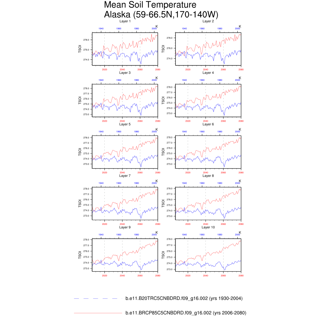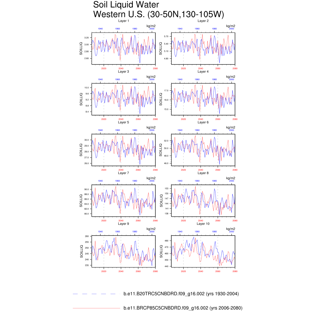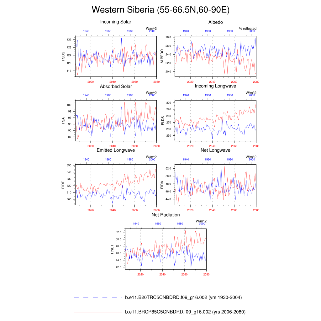Set 6 Description: Line plots of annual trends in regional soil water/ice and temperature, runoff, snow water/ice, photosynthesis