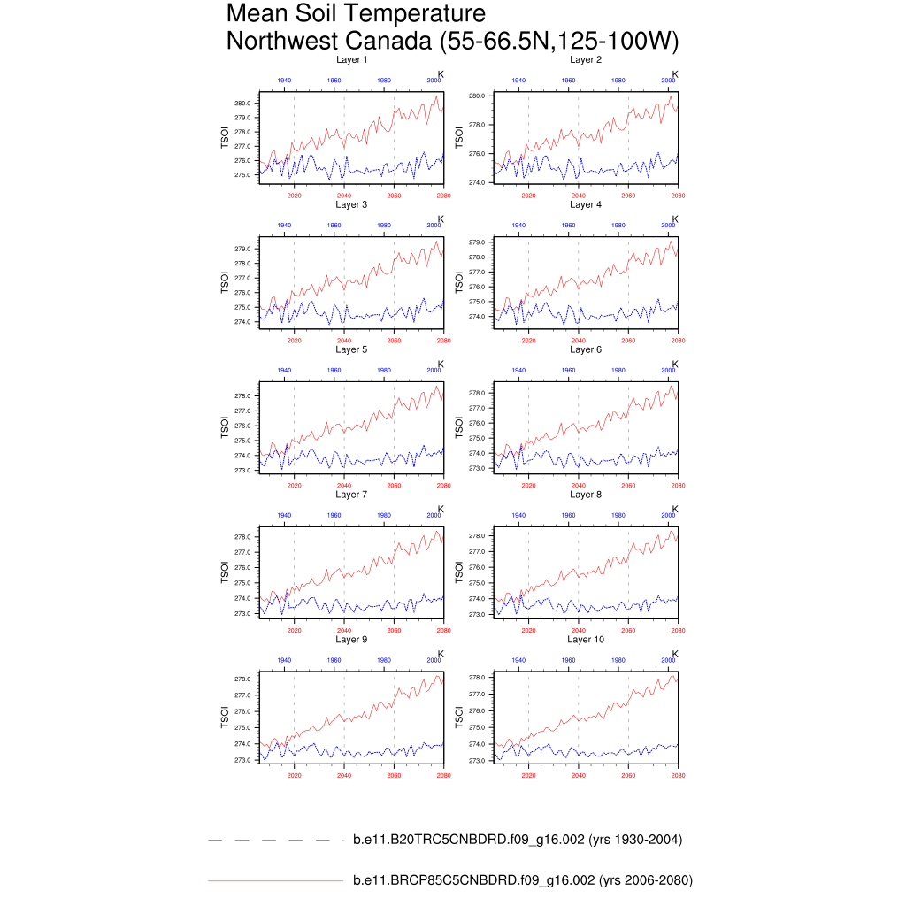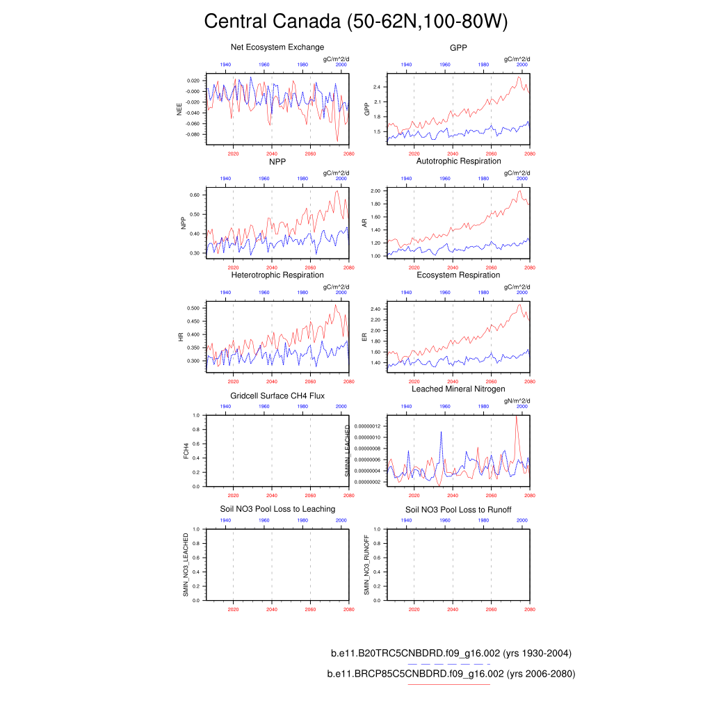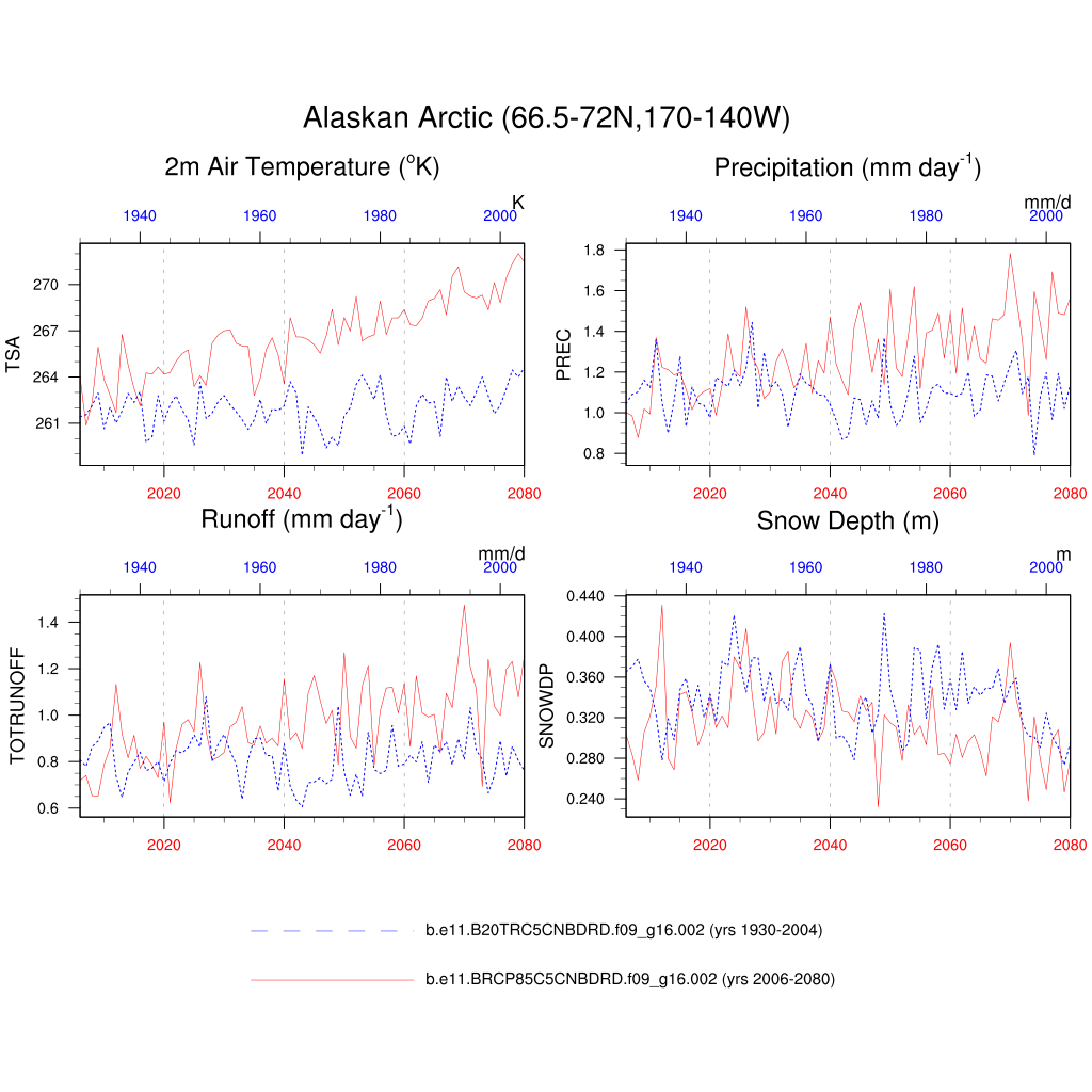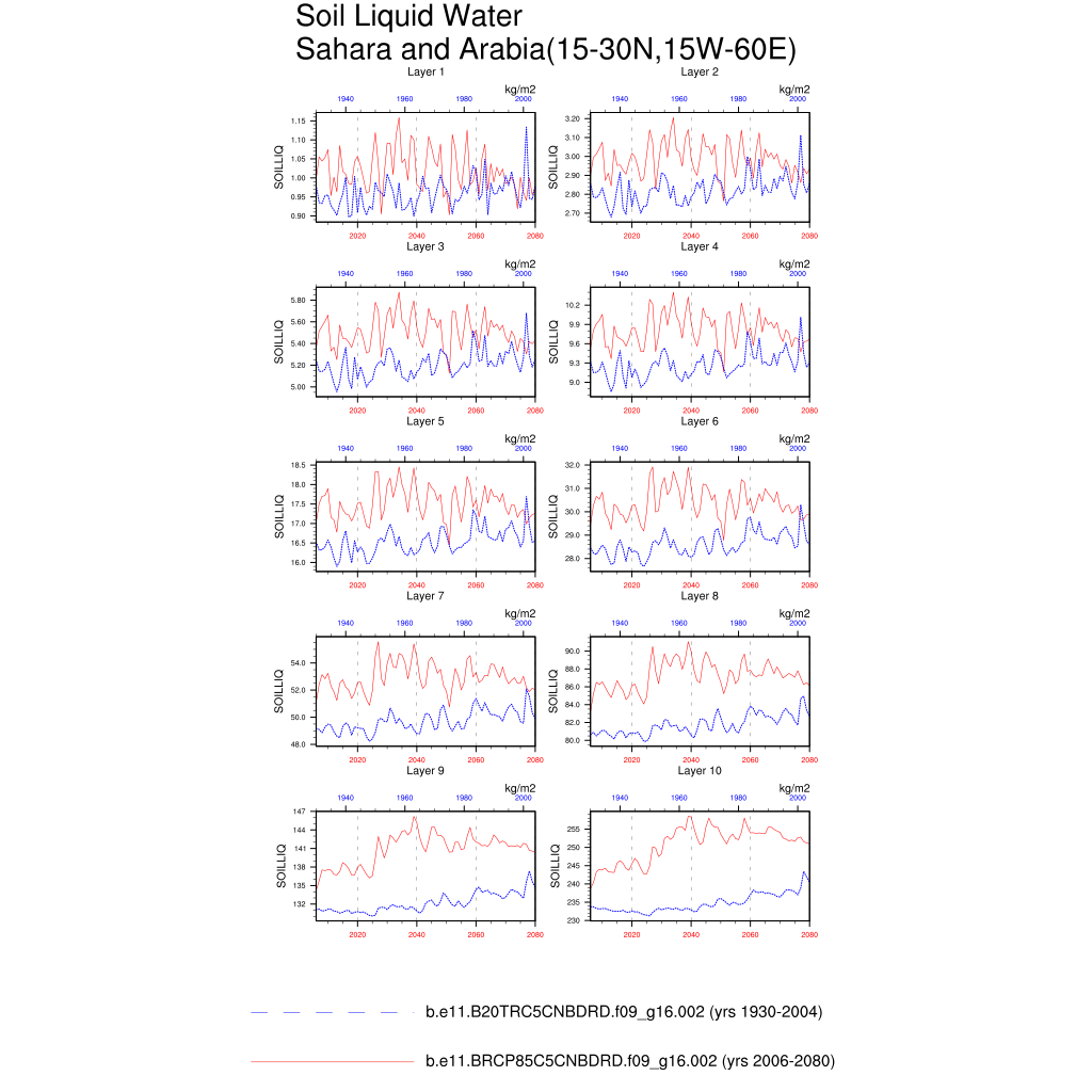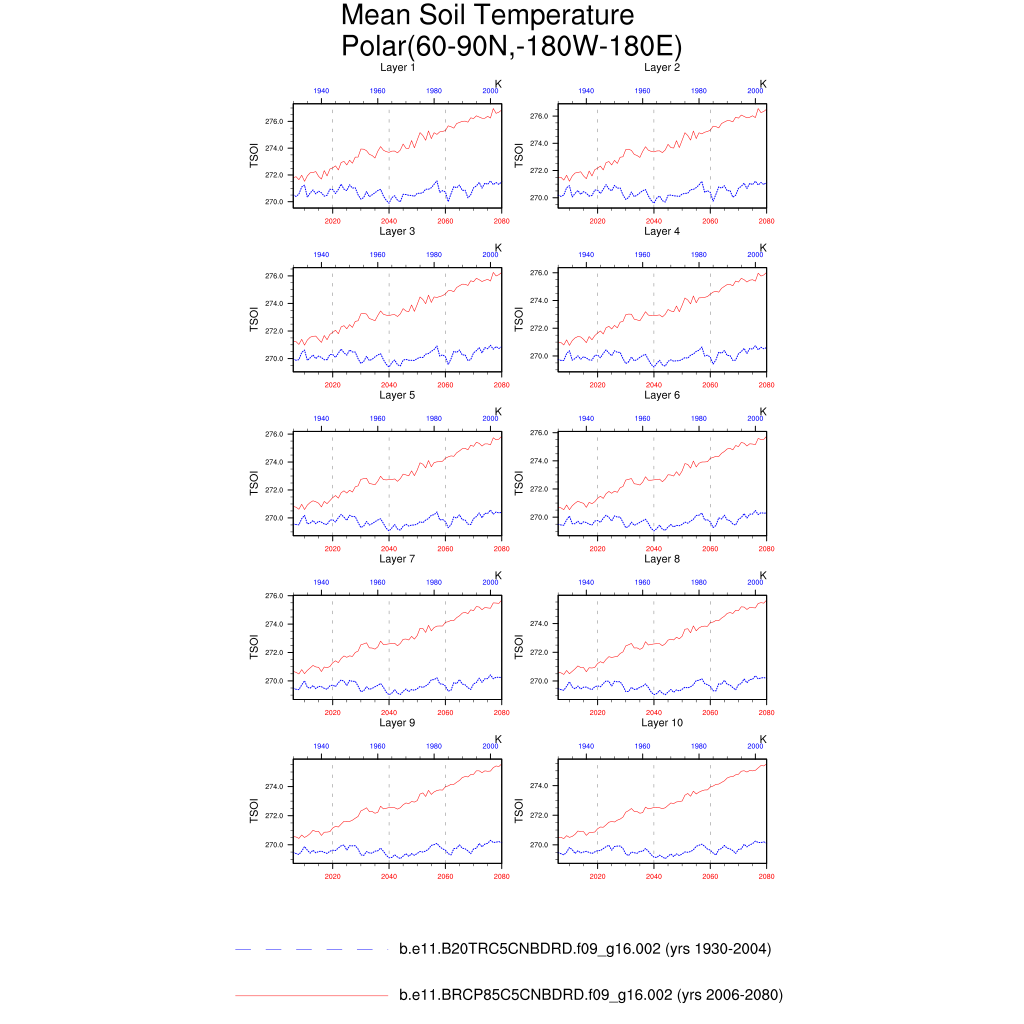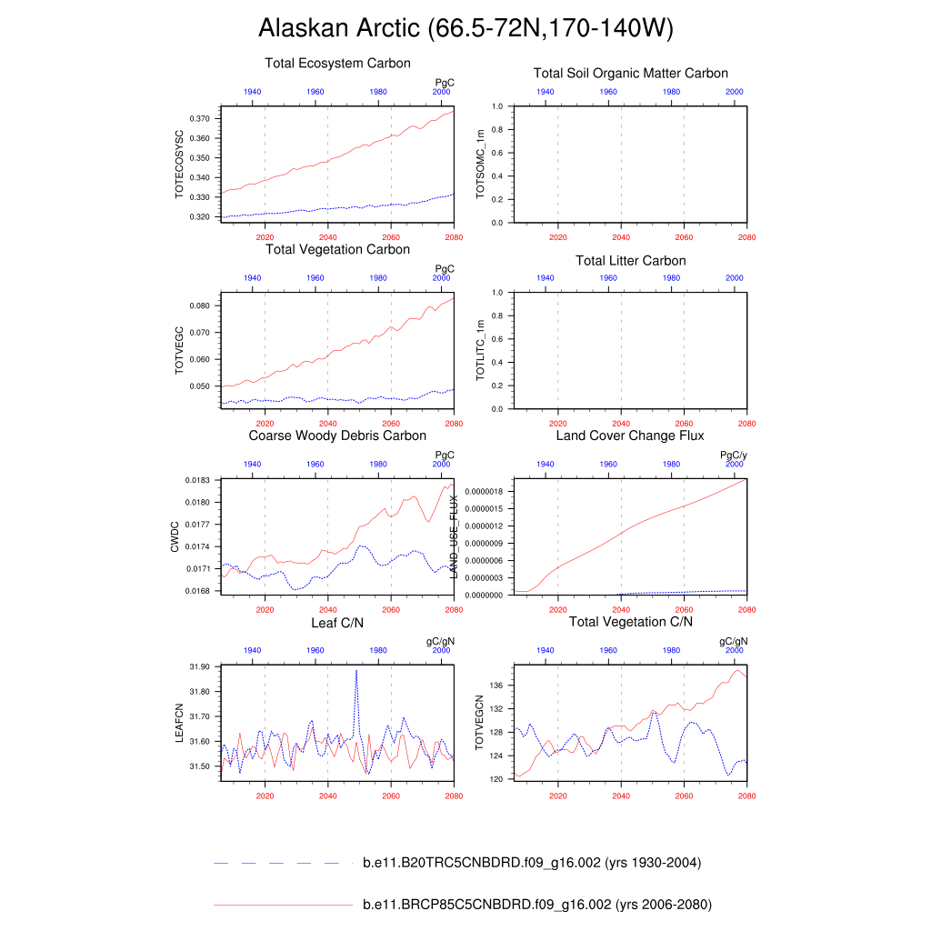 Set 6 Description: Line plots of annual trends in regional soil water/ice and temperature, runoff, snow water/ice, photosynthesis