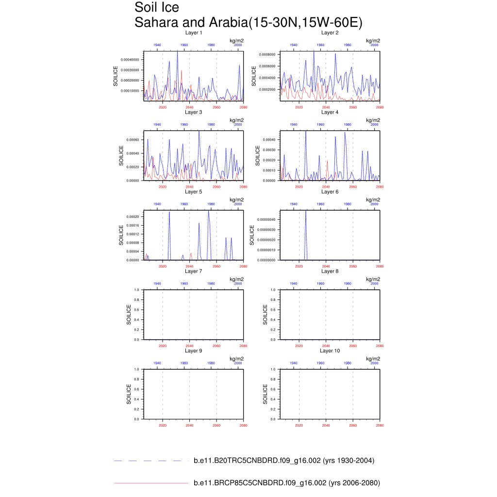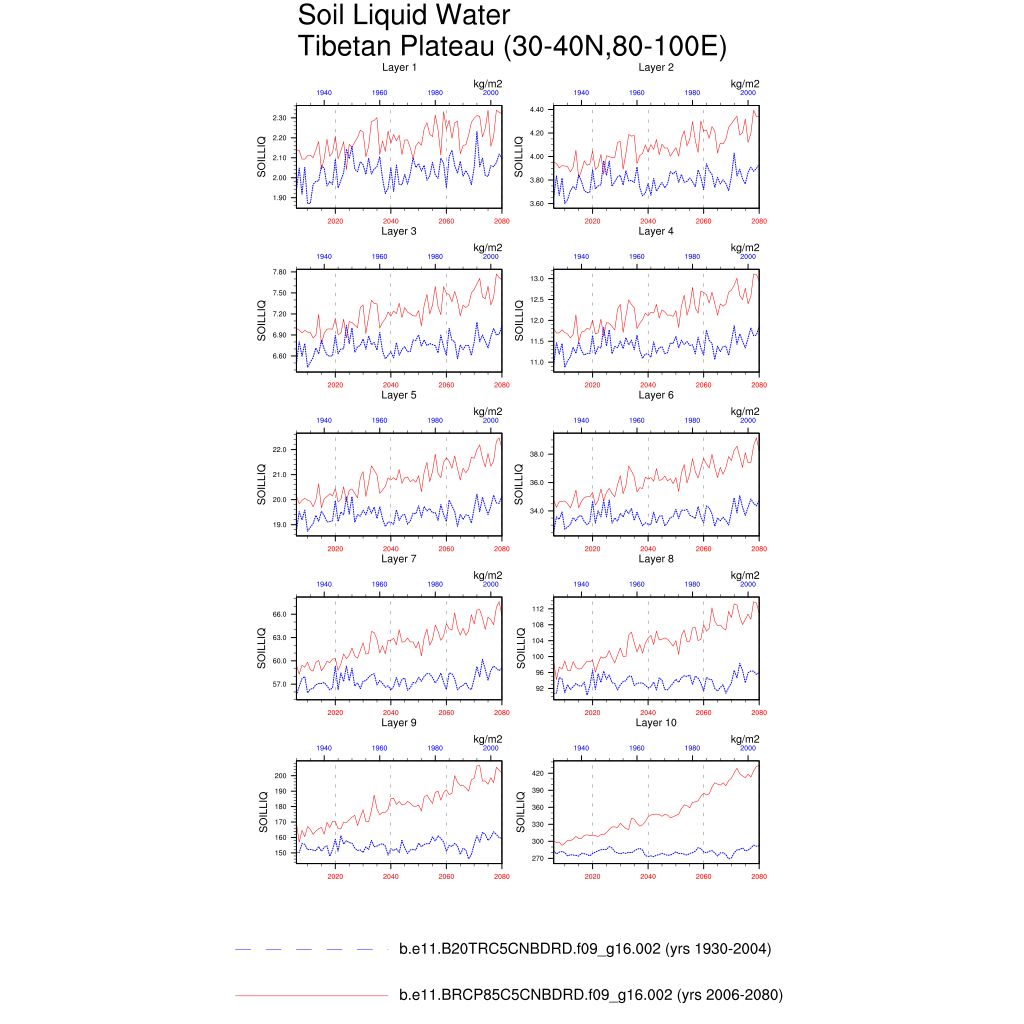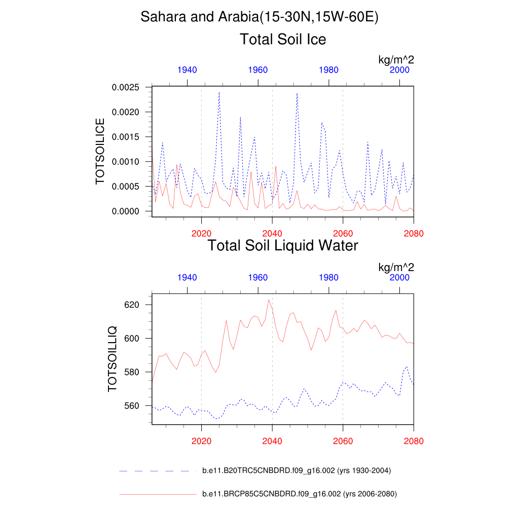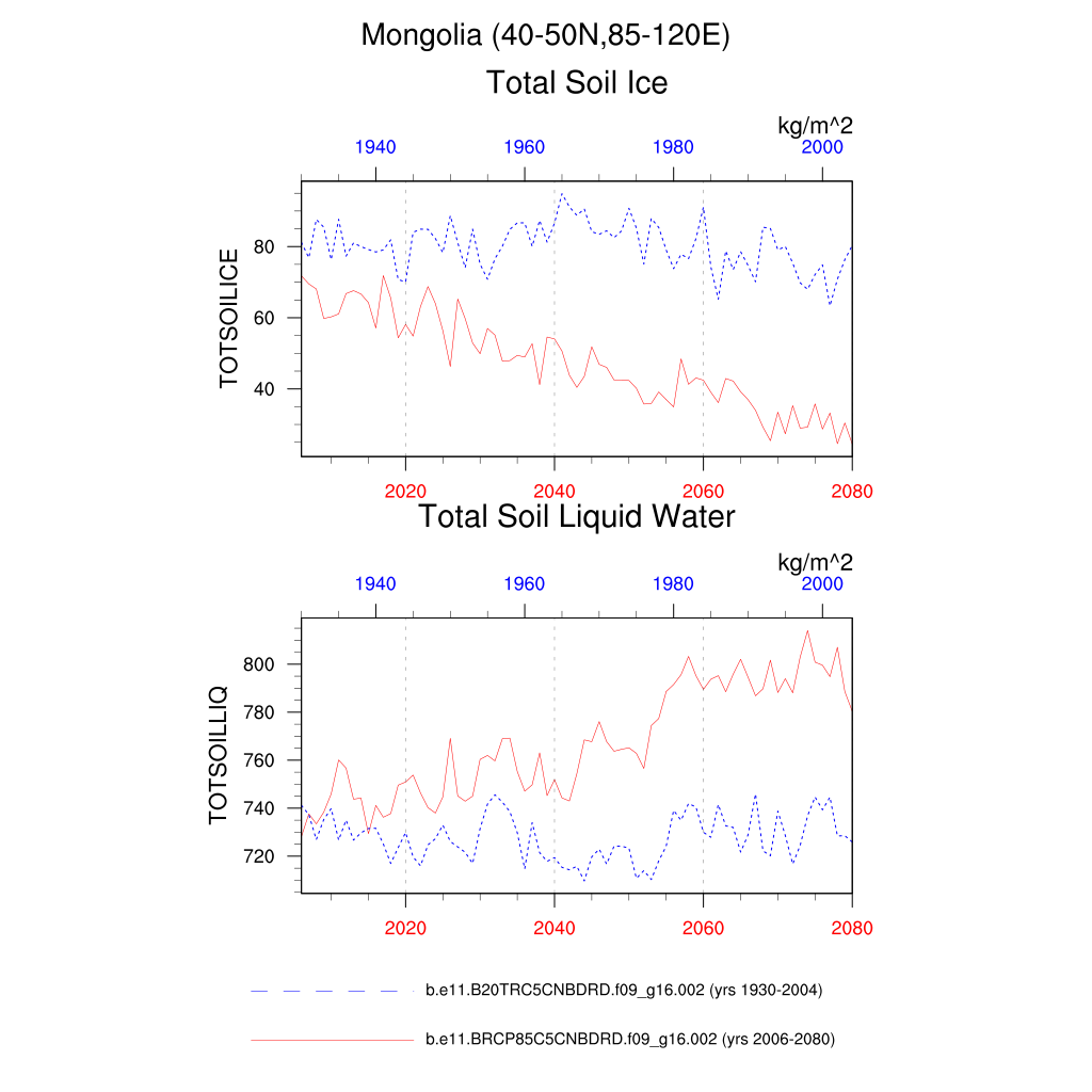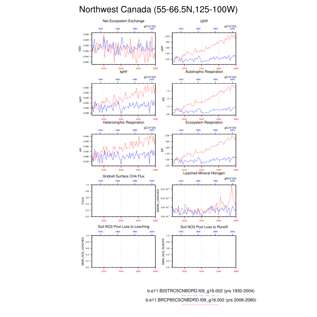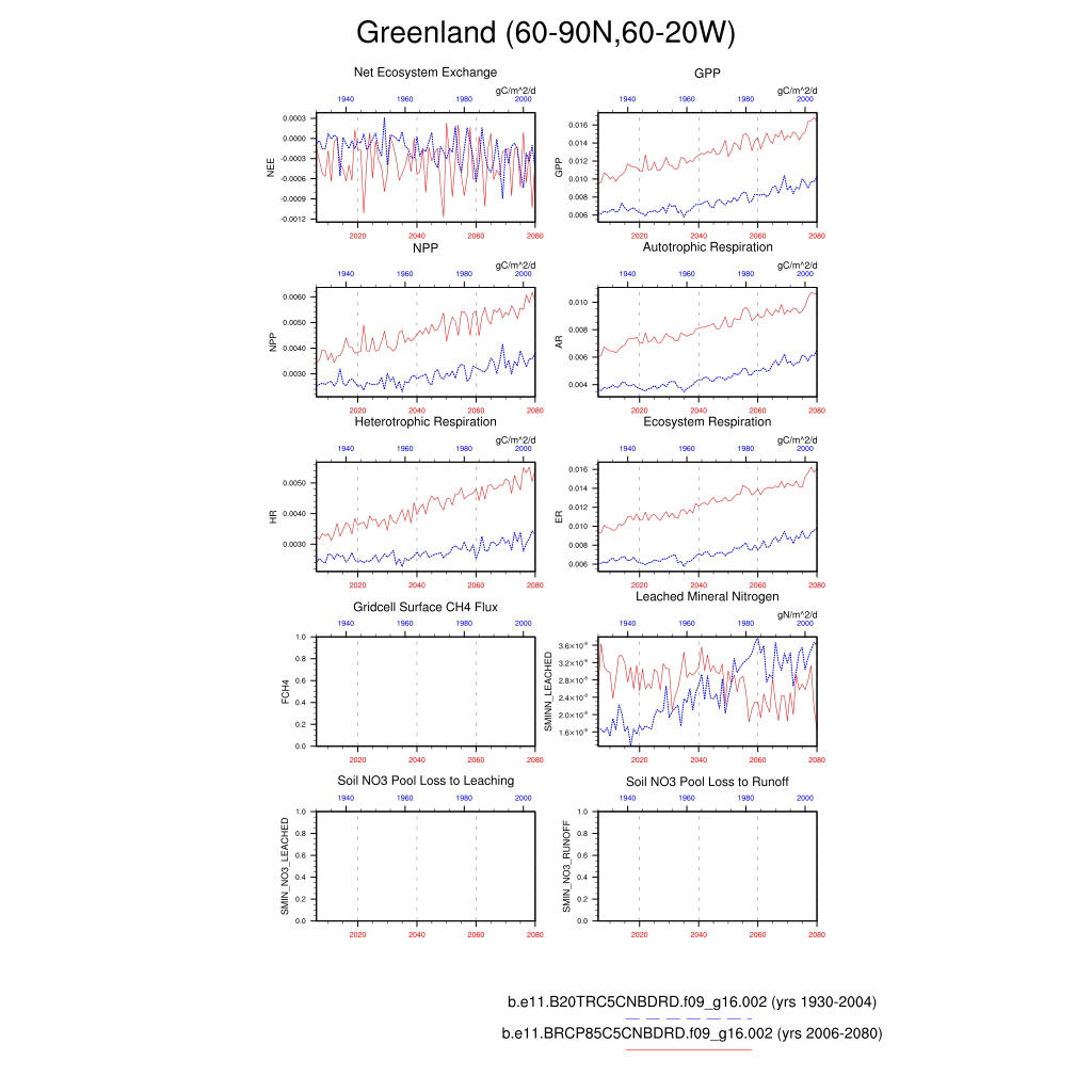 Set 6 Description: Line plots of annual trends in regional soil water/ice and temperature, runoff, snow water/ice, photosynthesis