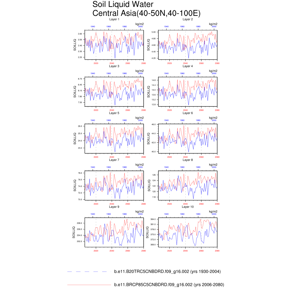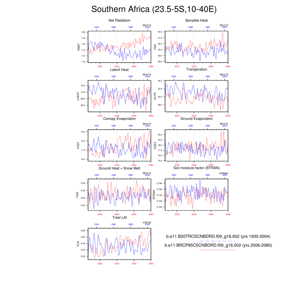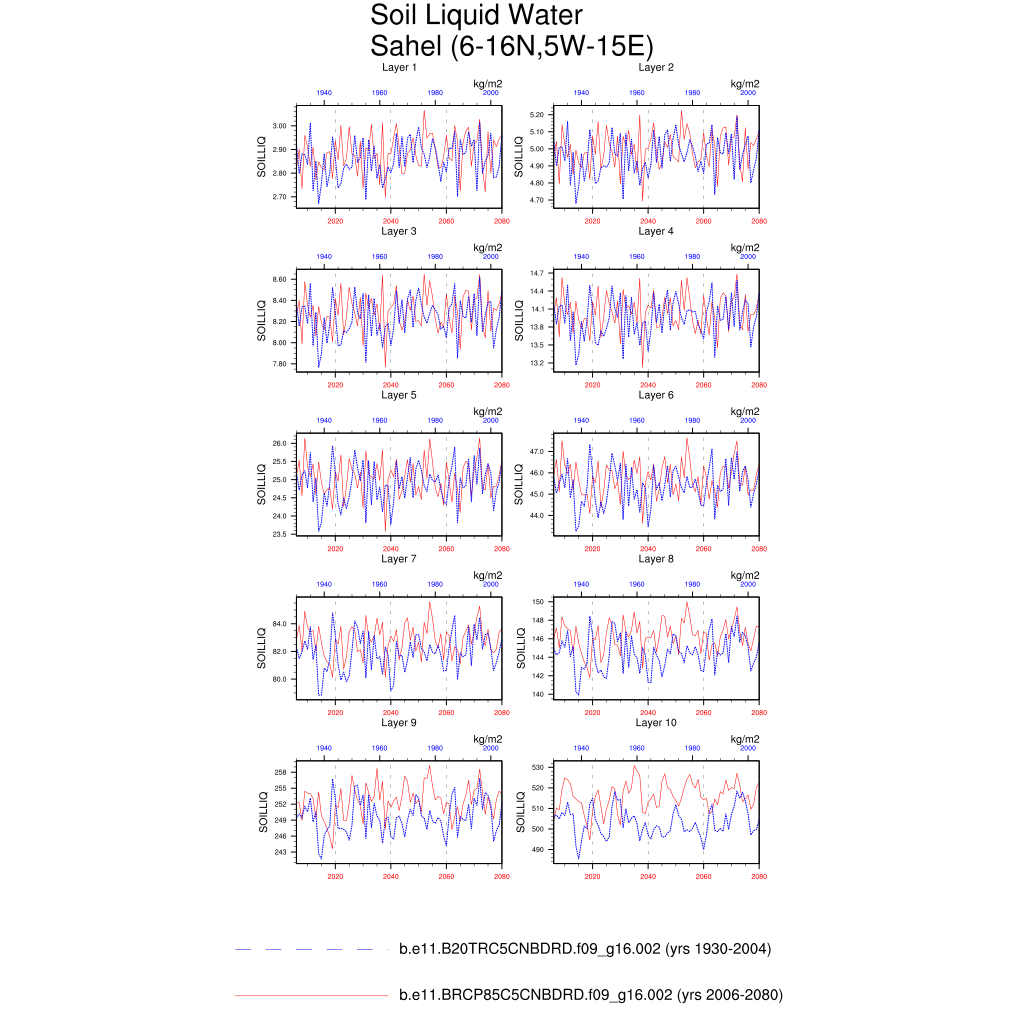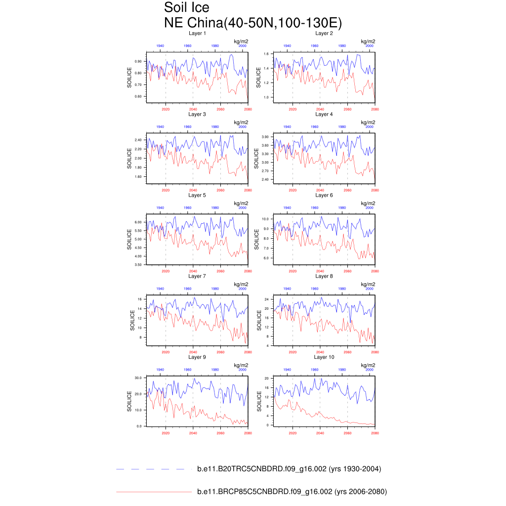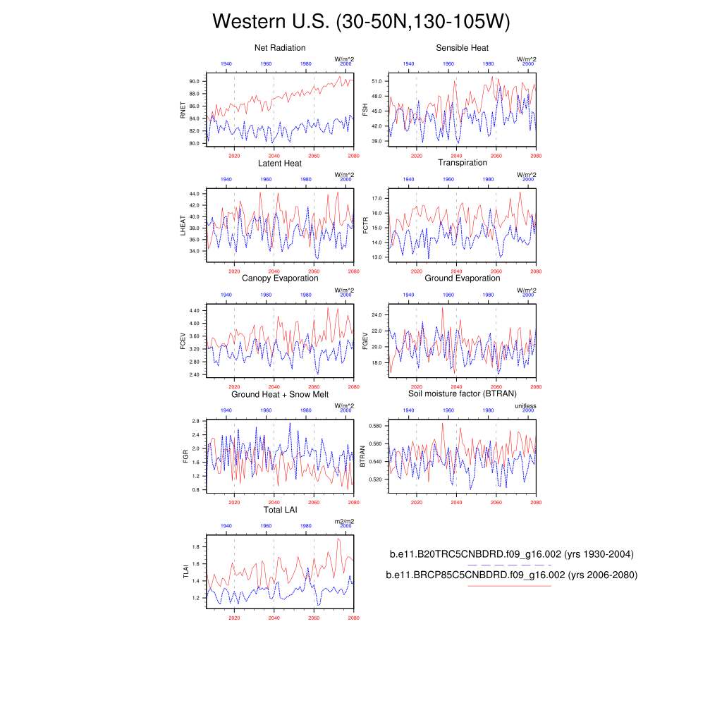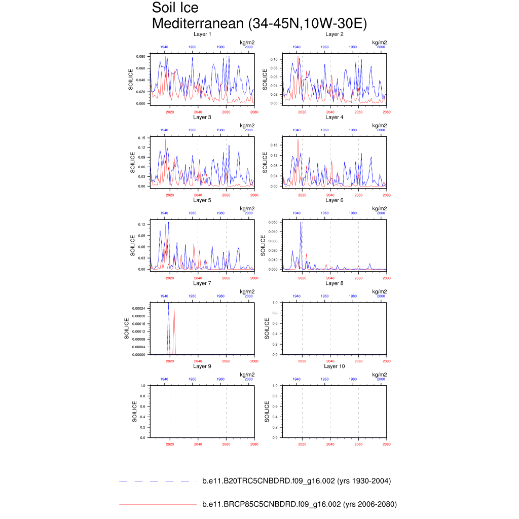 Set 6 Description: Line plots of annual trends in regional soil water/ice and temperature, runoff, snow water/ice, photosynthesis