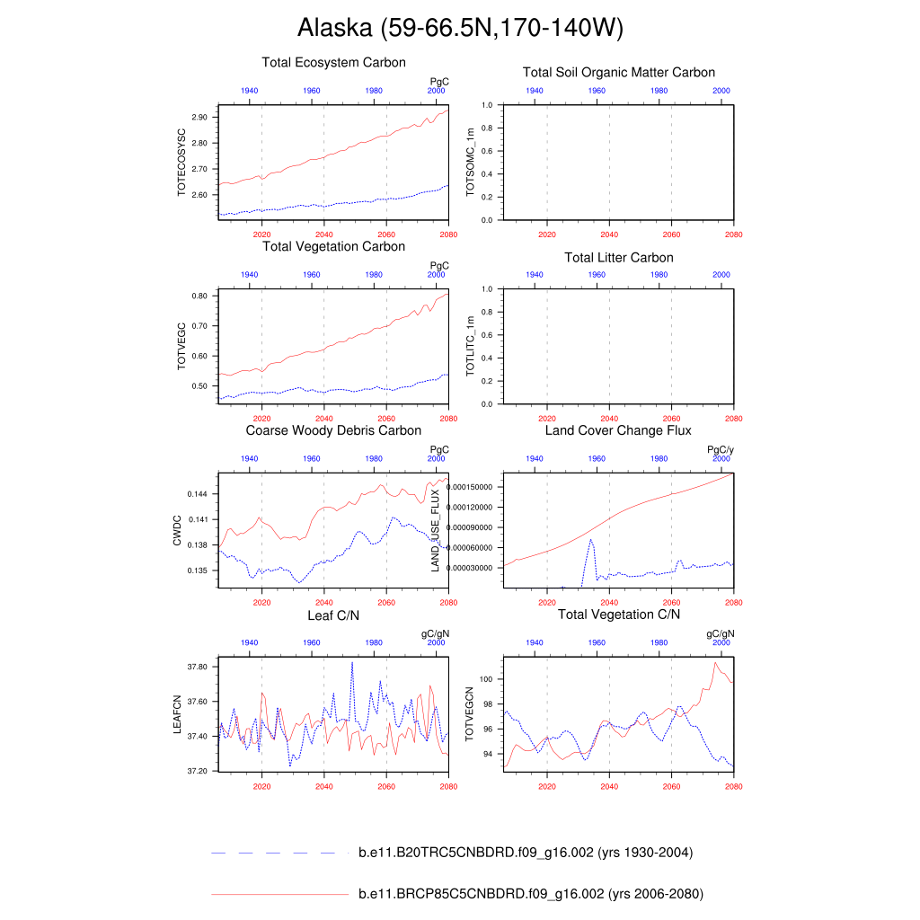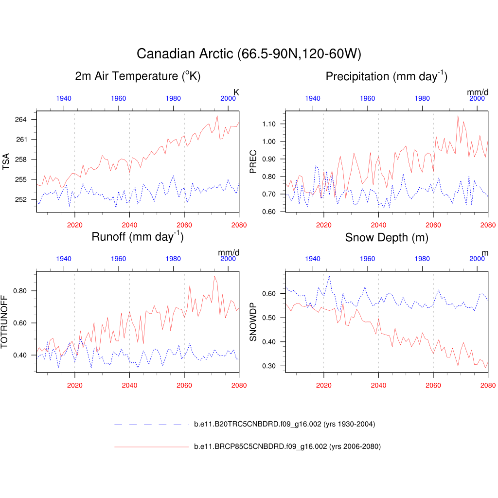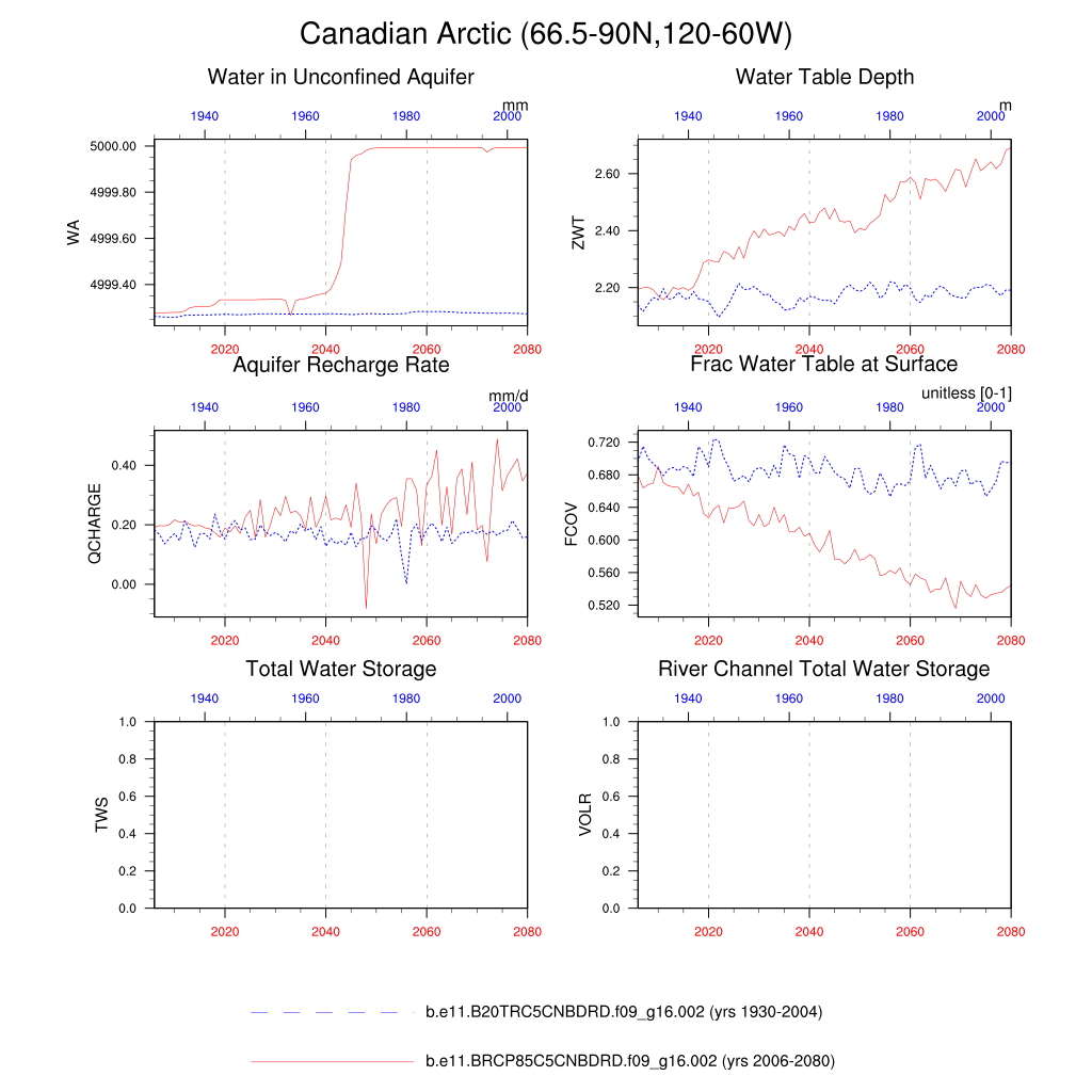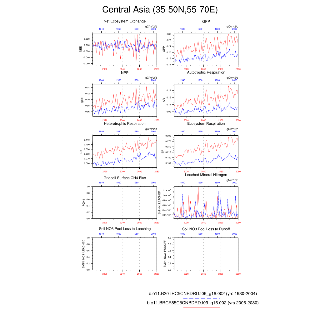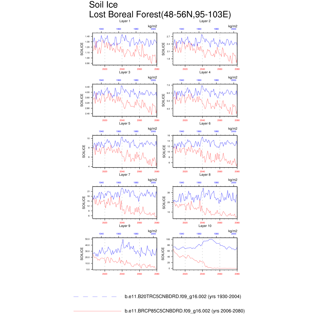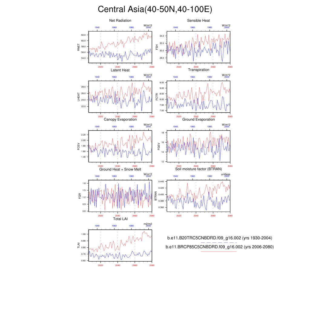Set 6 Description: Line plots of annual trends in regional soil water/ice and temperature, runoff, snow water/ice, photosynthesis