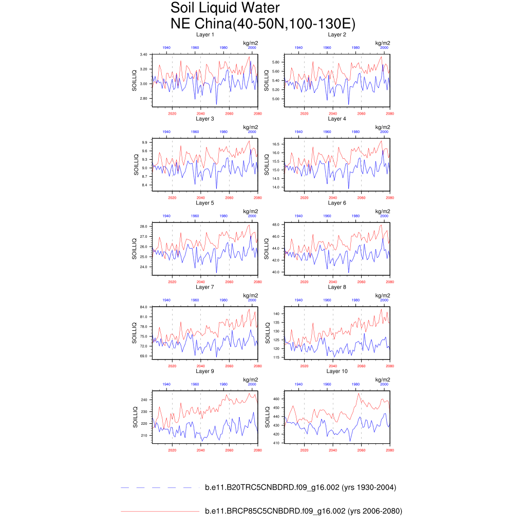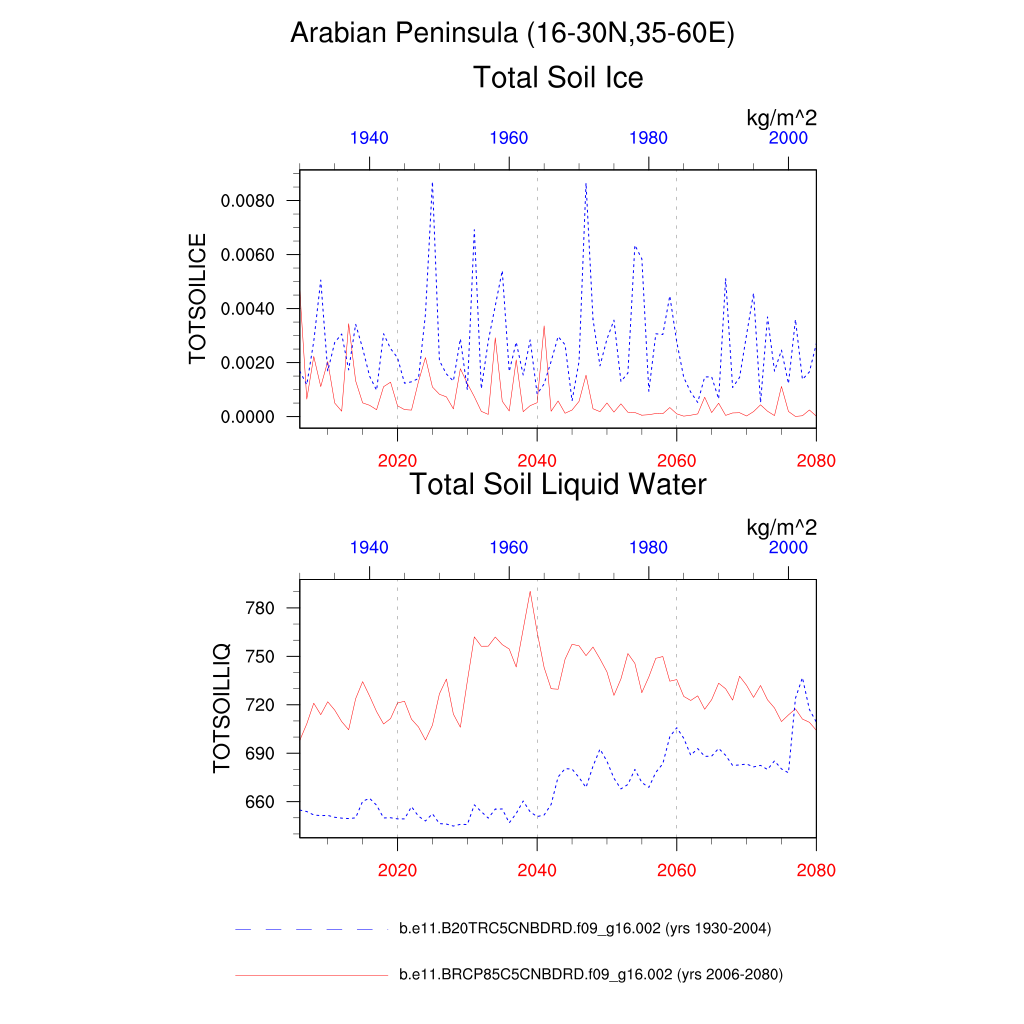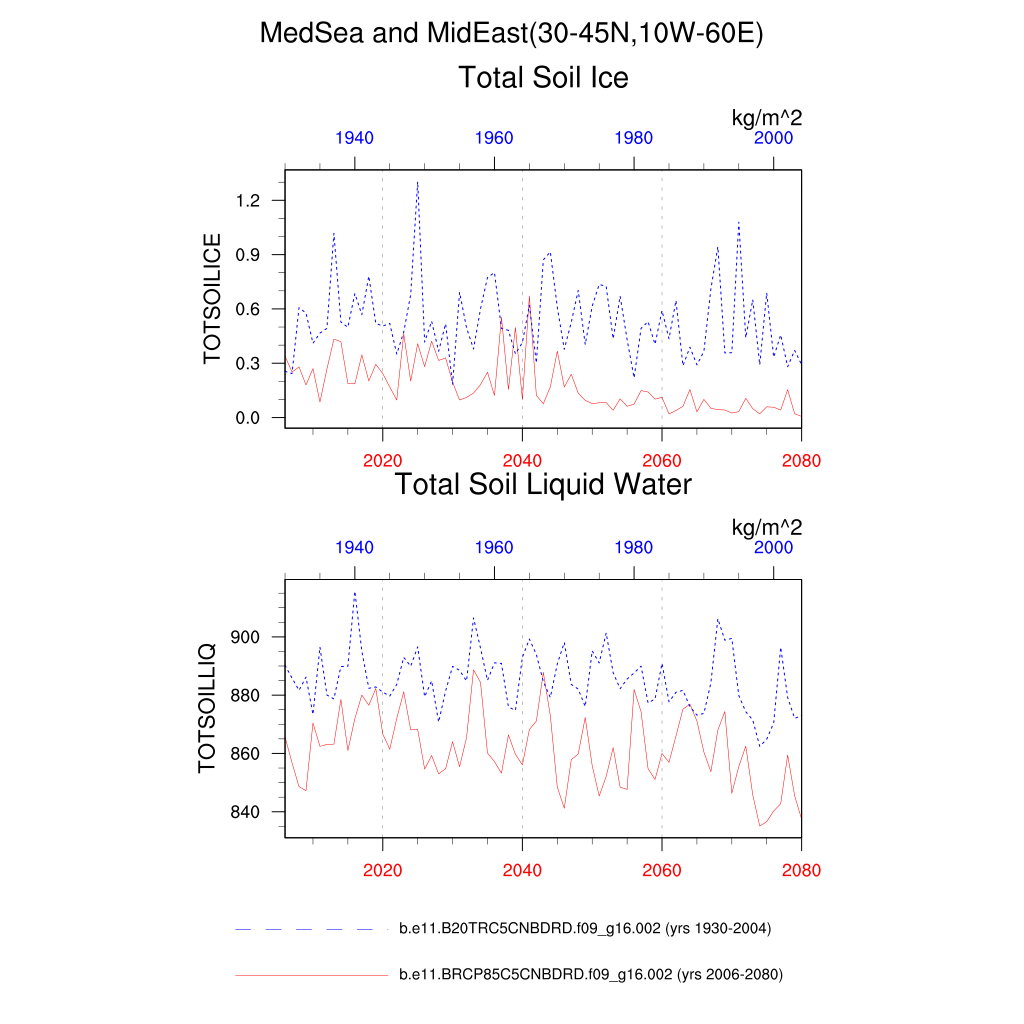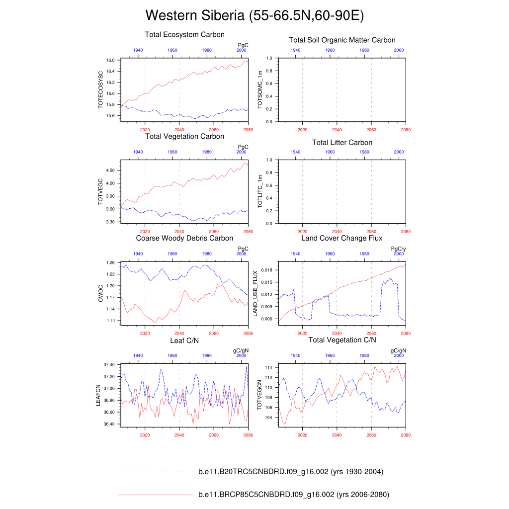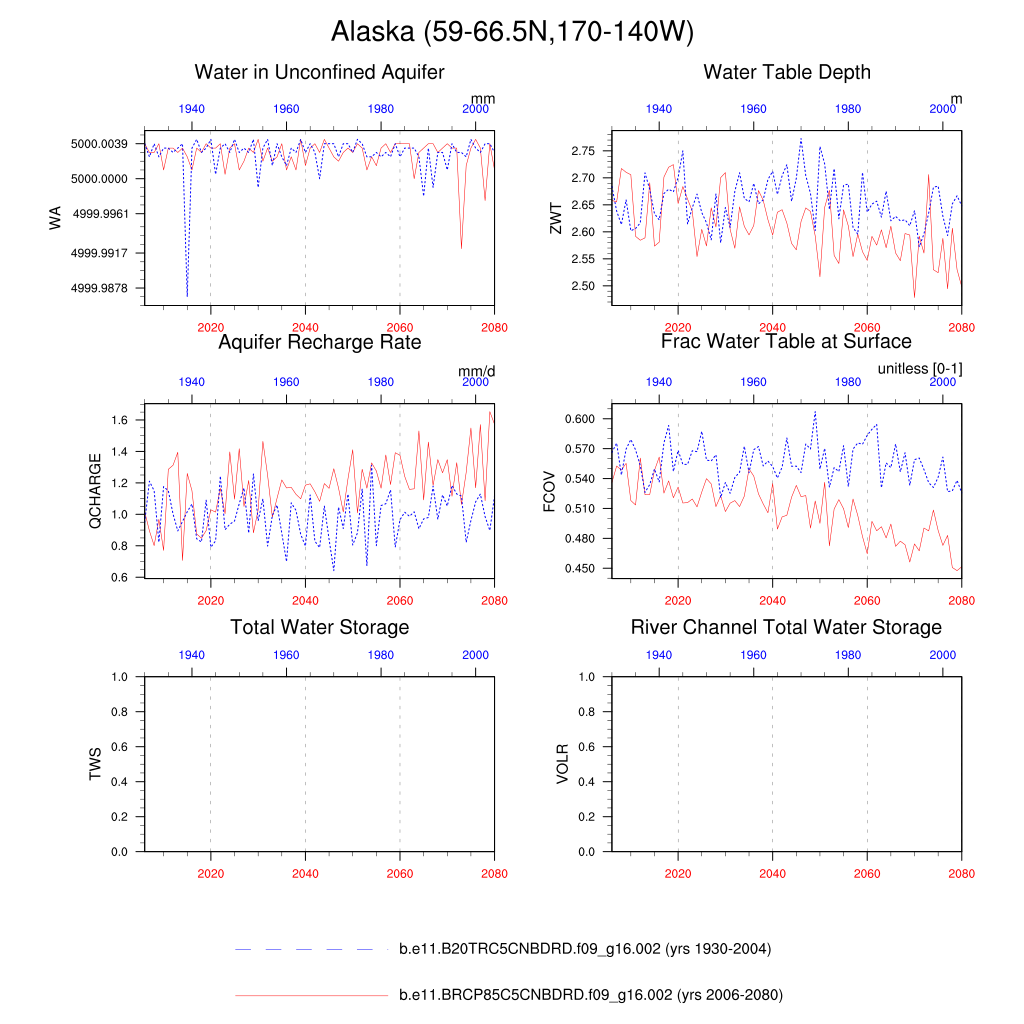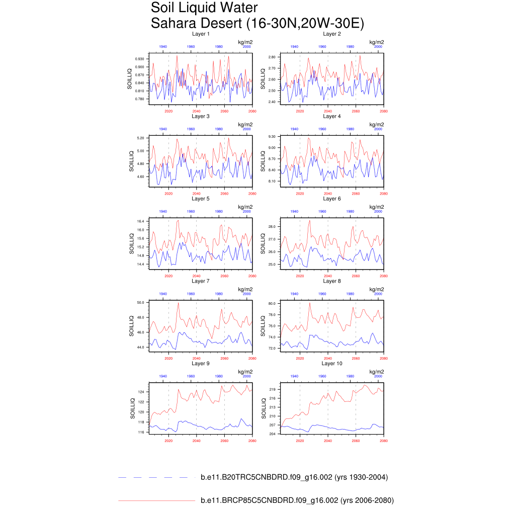 Set 6 Description: Line plots of annual trends in regional soil water/ice and temperature, runoff, snow water/ice, photosynthesis