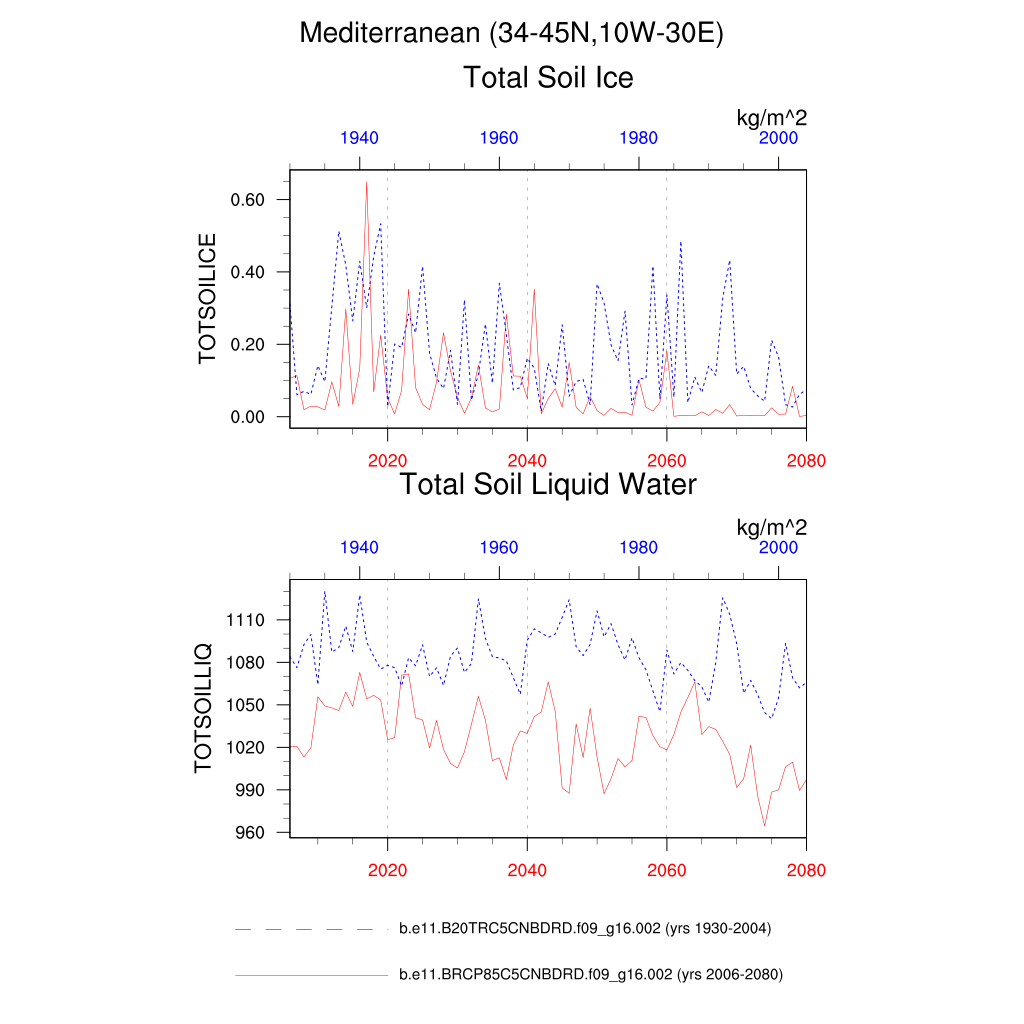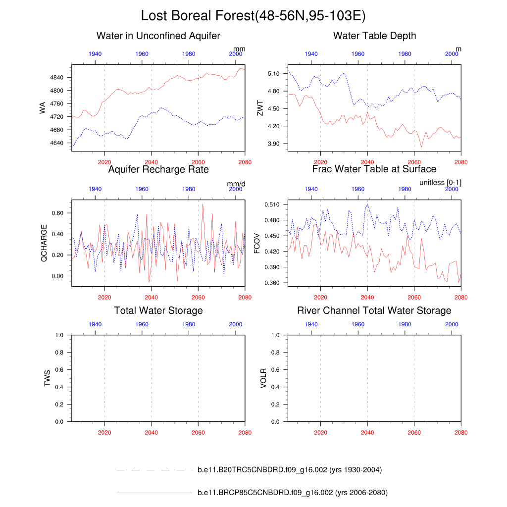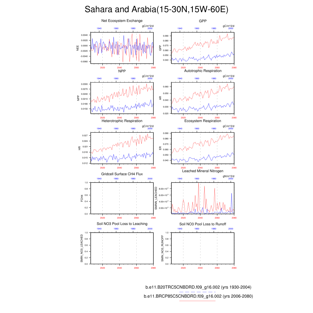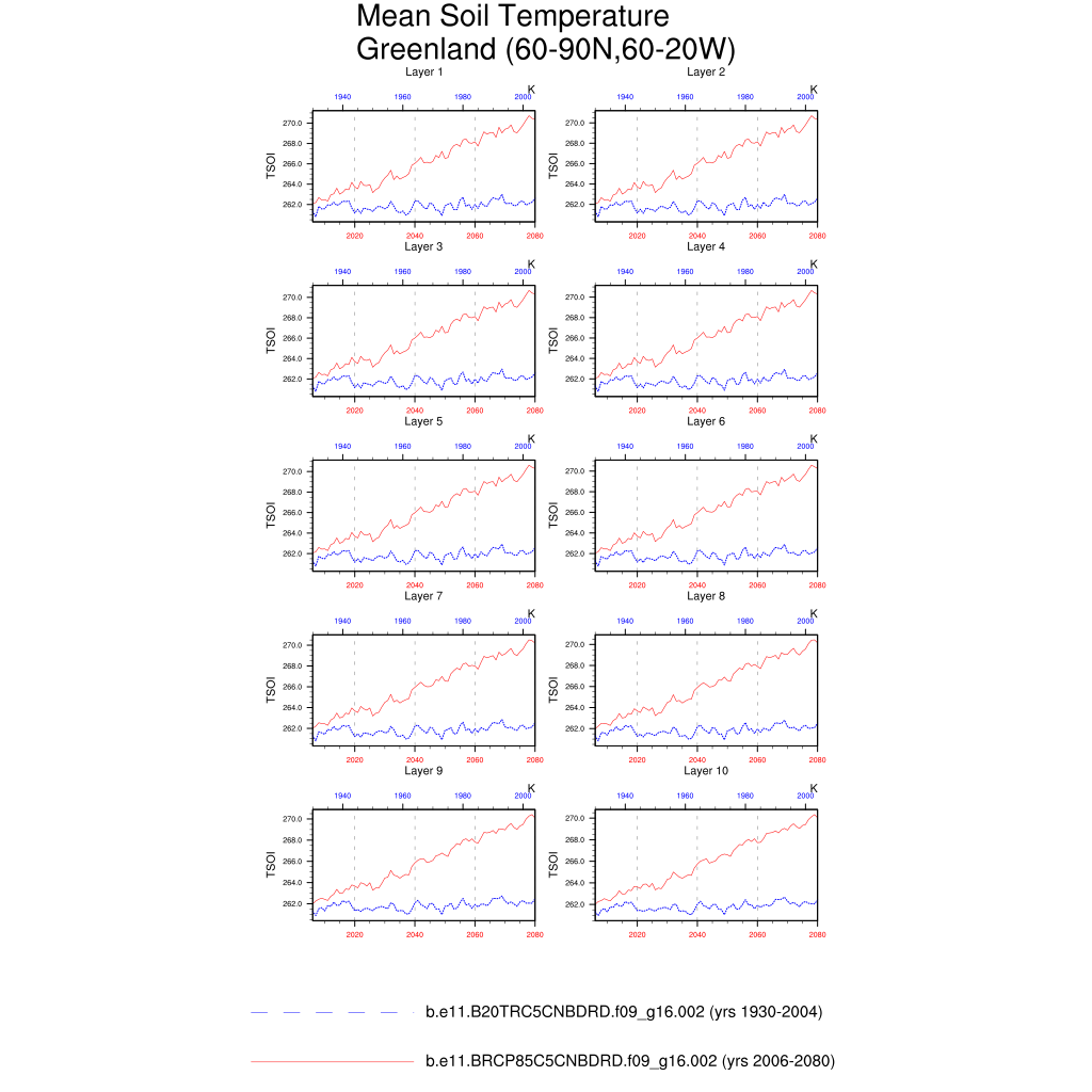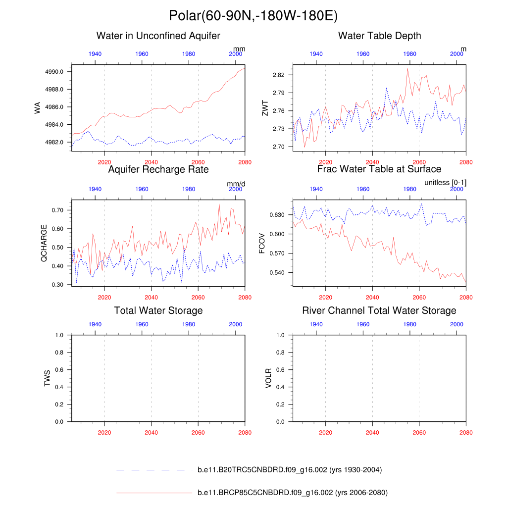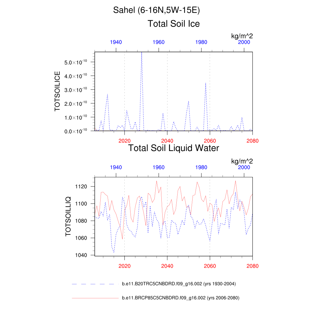 Set 6 Description: Line plots of annual trends in regional soil water/ice and temperature, runoff, snow water/ice, photosynthesis