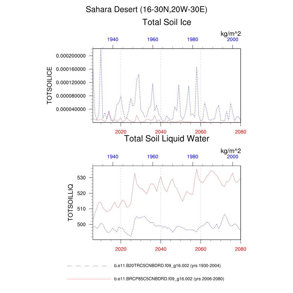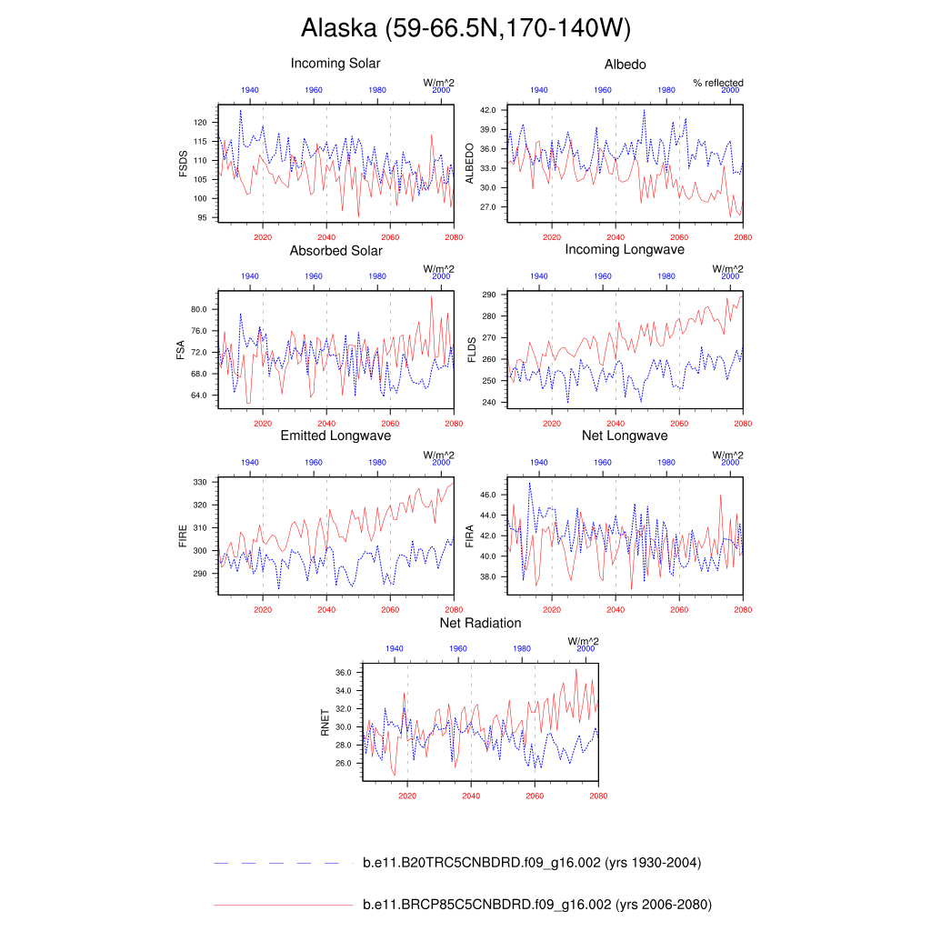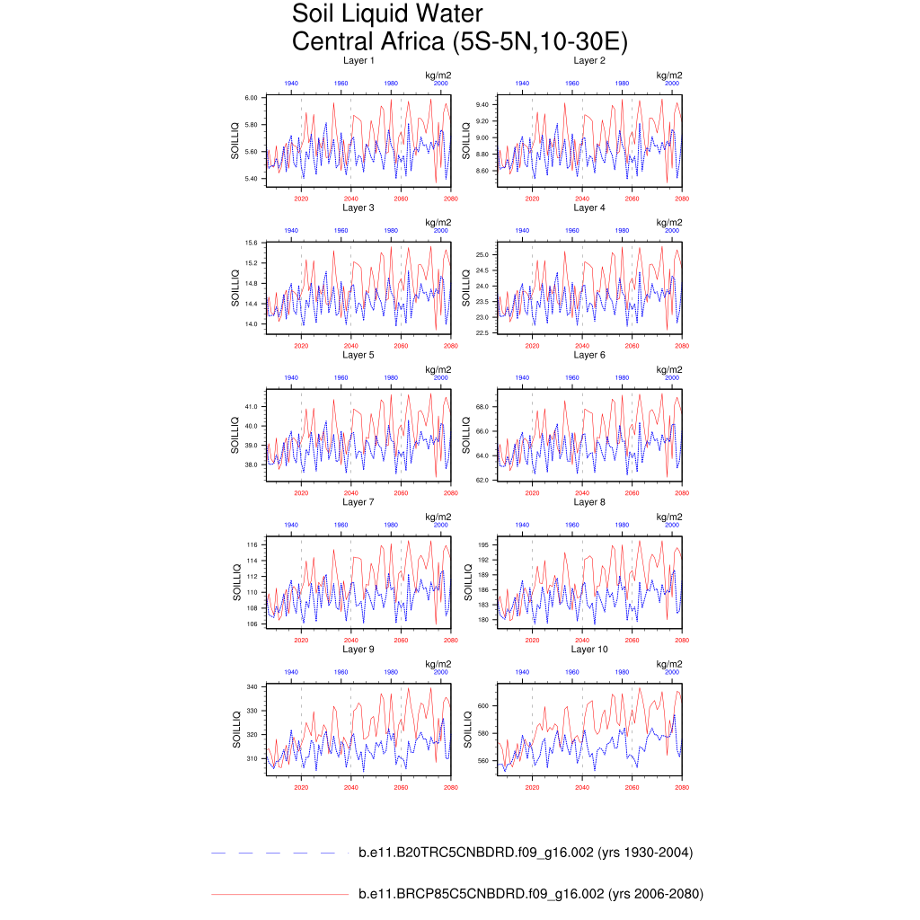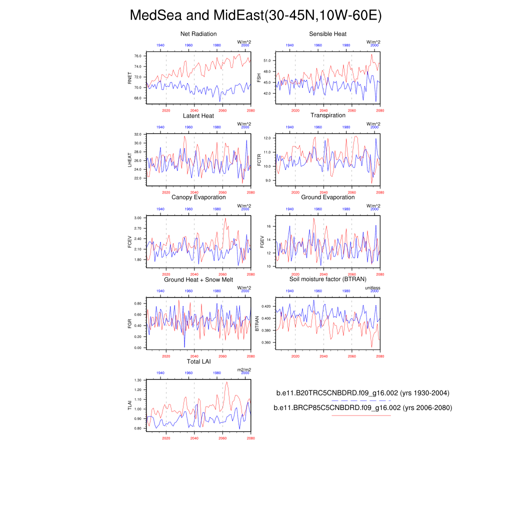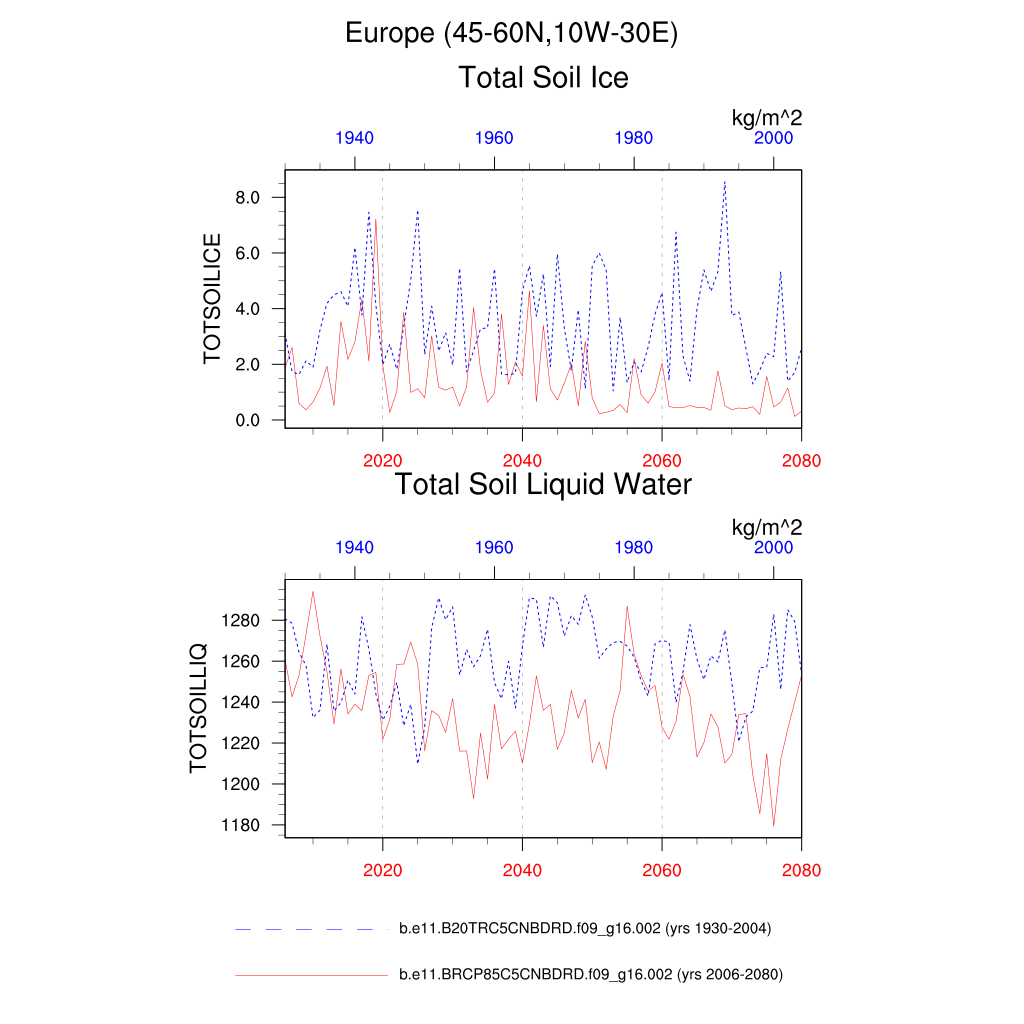 Set 6 Description: Line plots of annual trends in regional soil water/ice and temperature, runoff, snow water/ice, photosynthesis