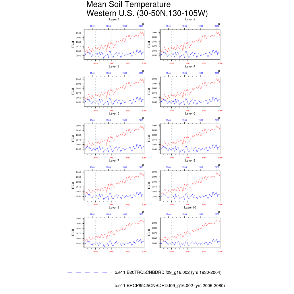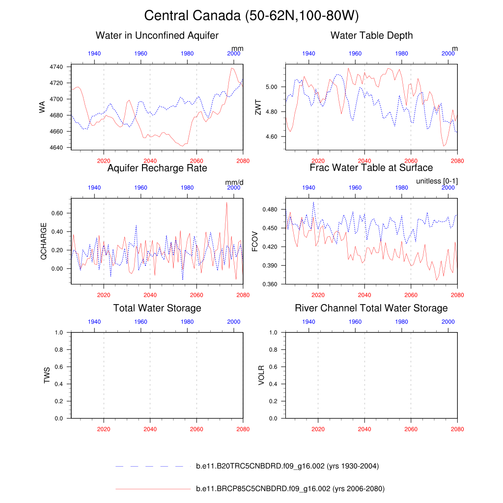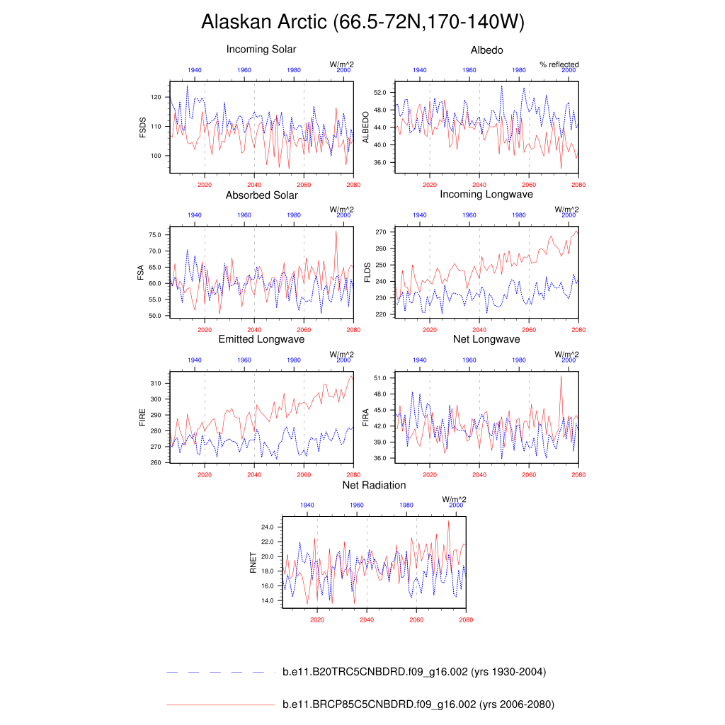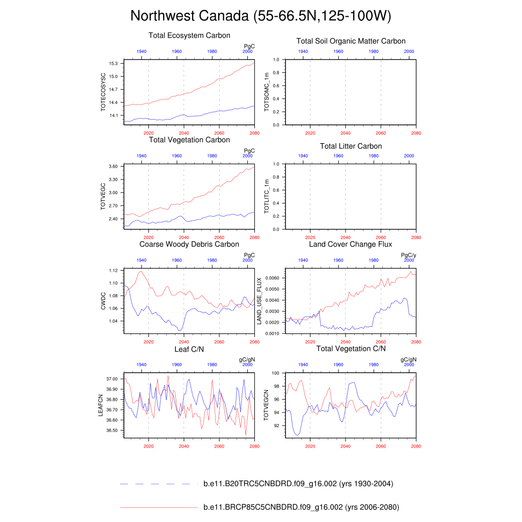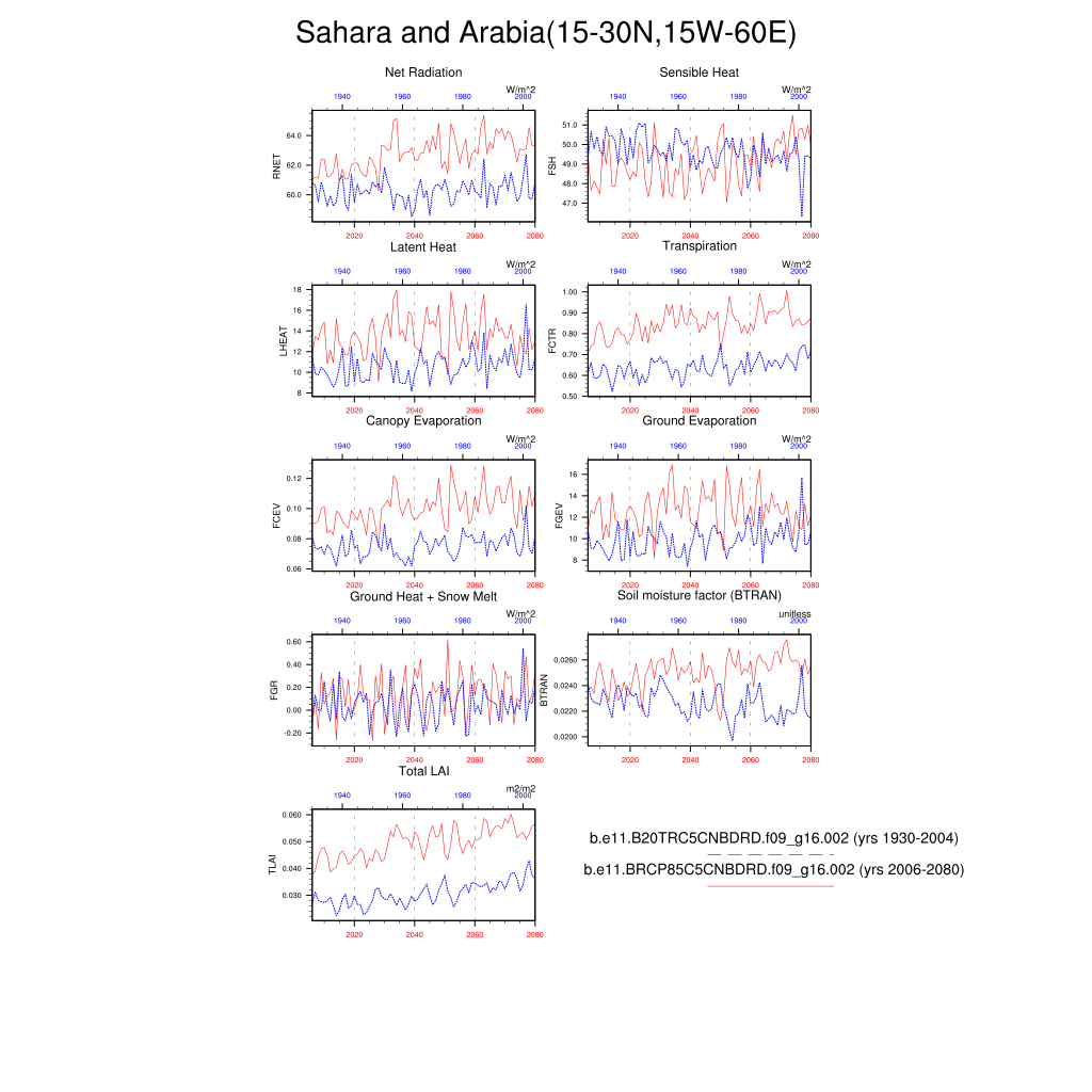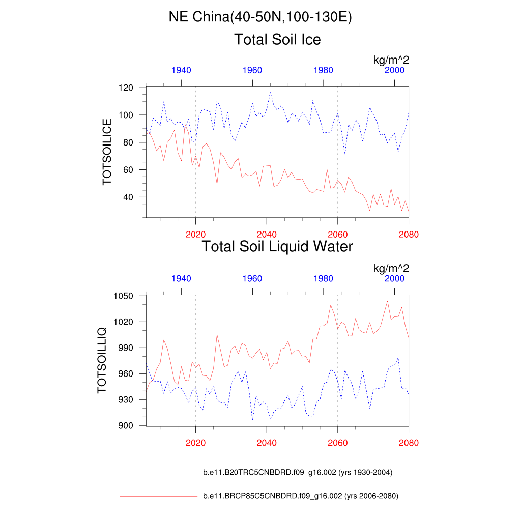 Set 6 Description: Line plots of annual trends in regional soil water/ice and temperature, runoff, snow water/ice, photosynthesis
