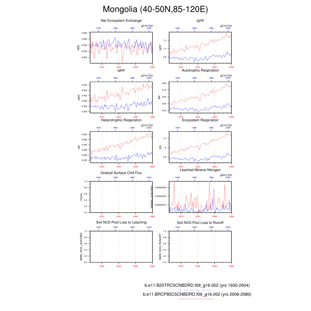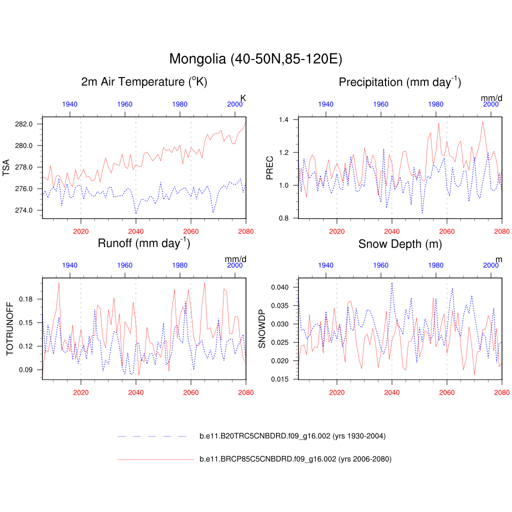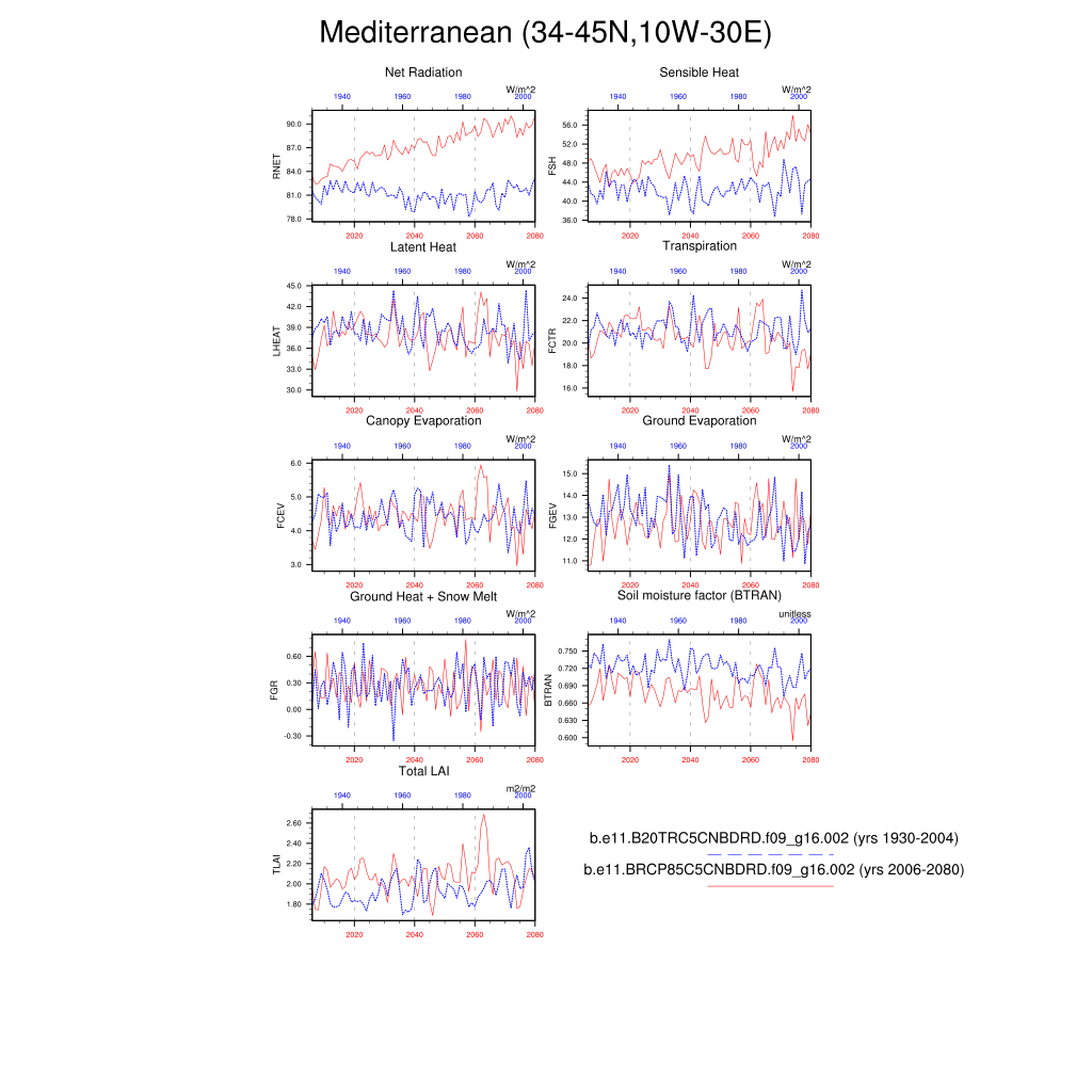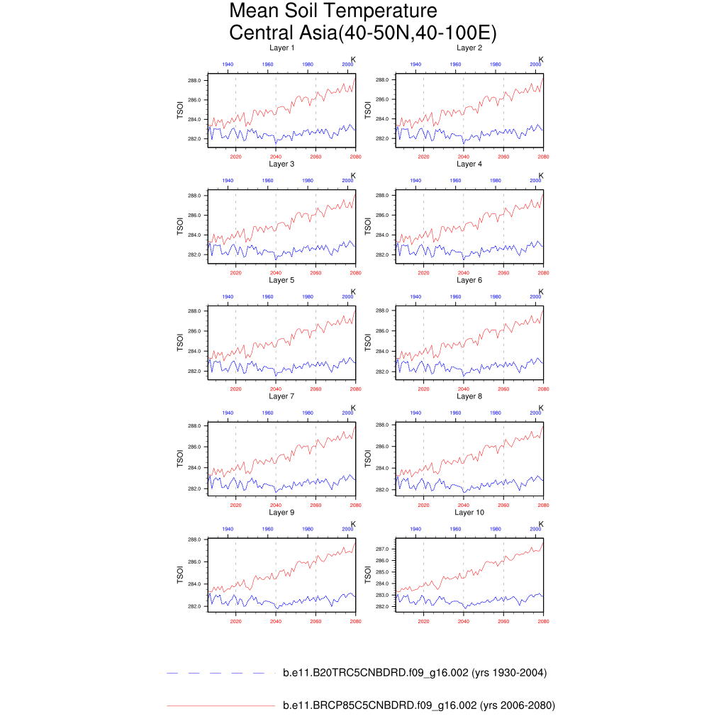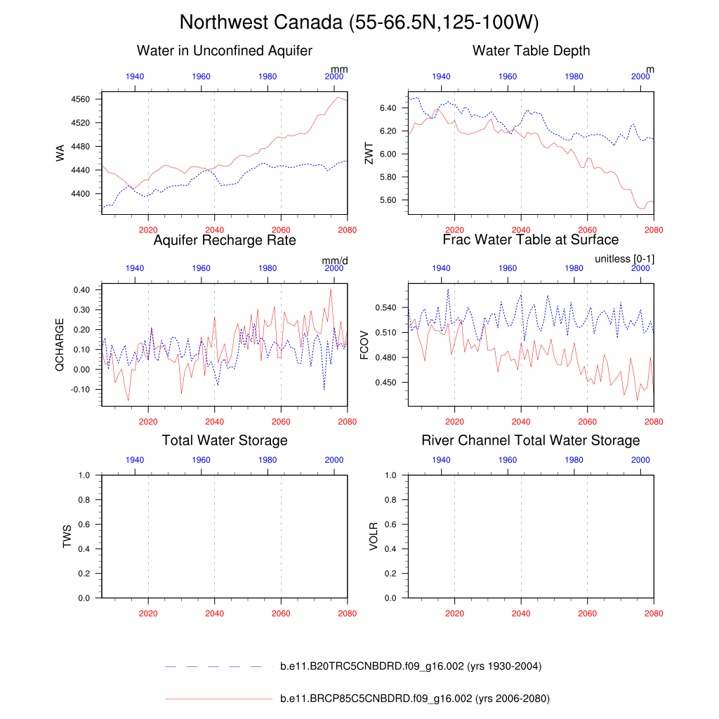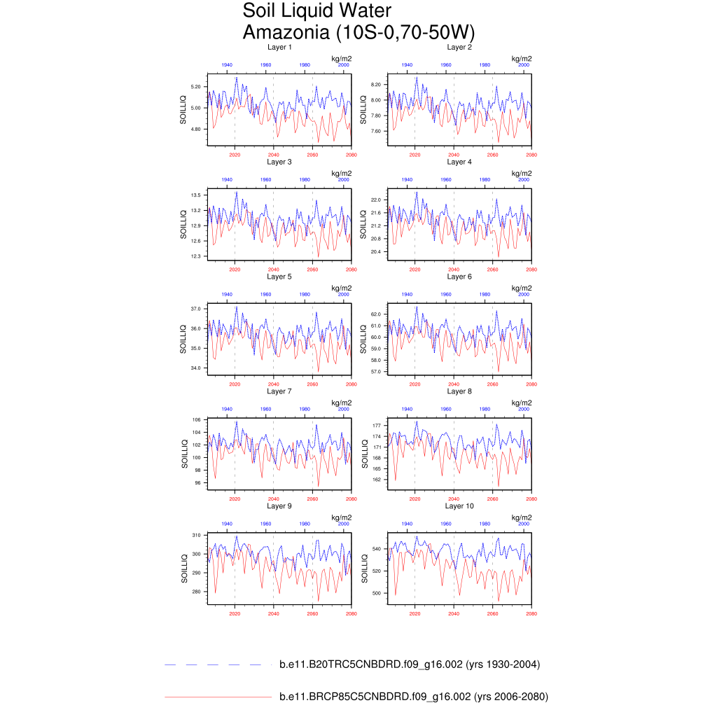 Set 6 Description: Line plots of annual trends in regional soil water/ice and temperature, runoff, snow water/ice, photosynthesis